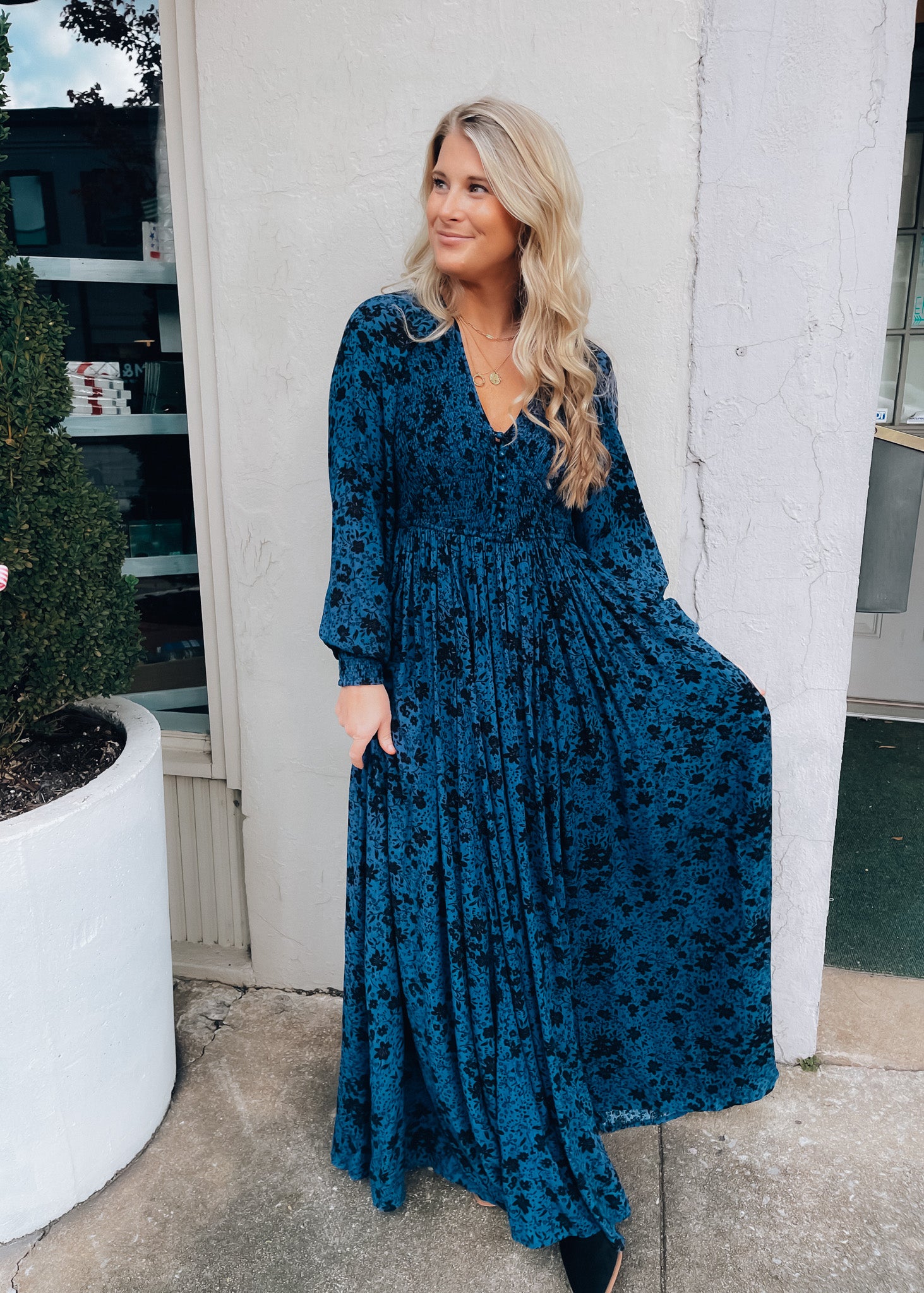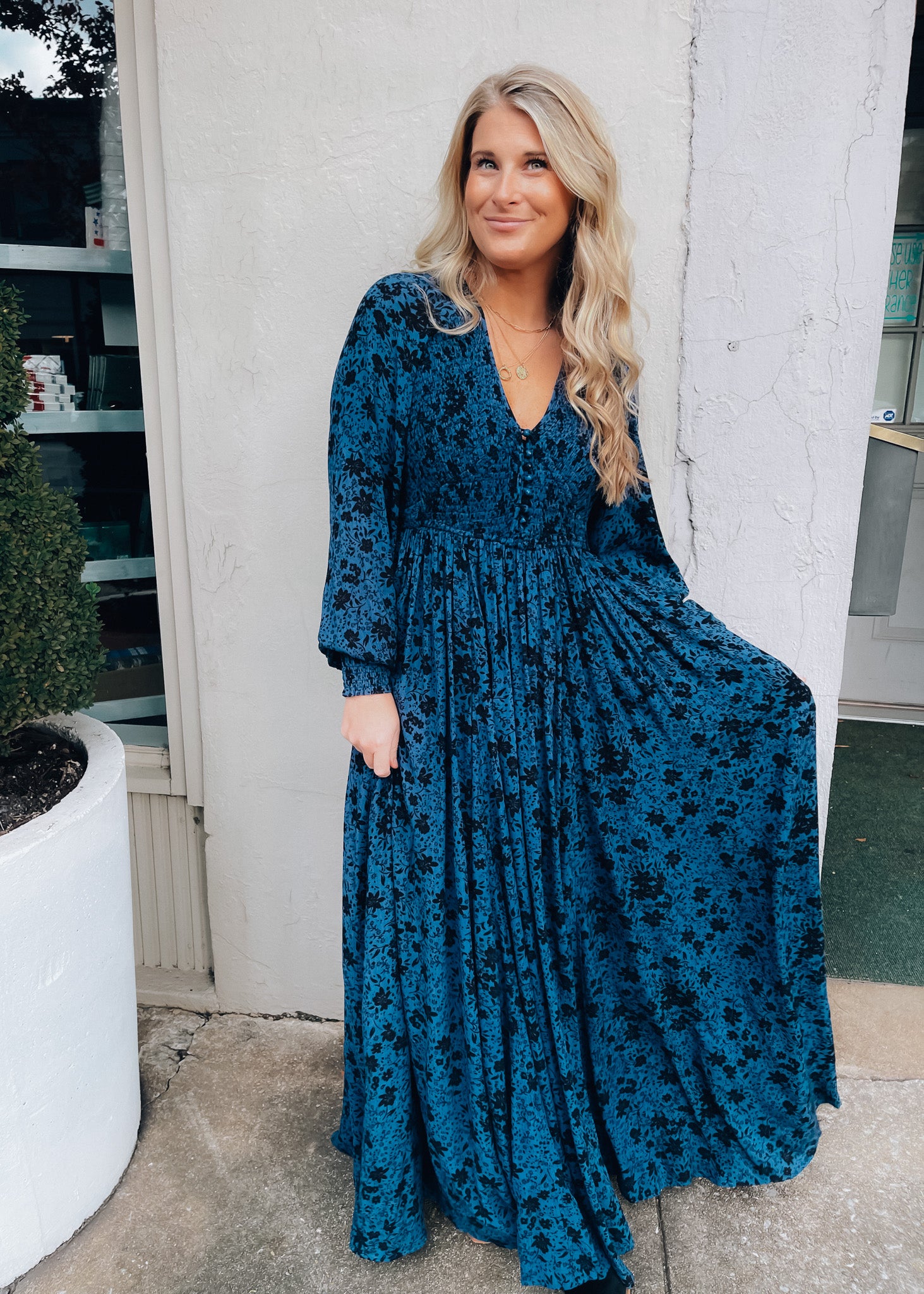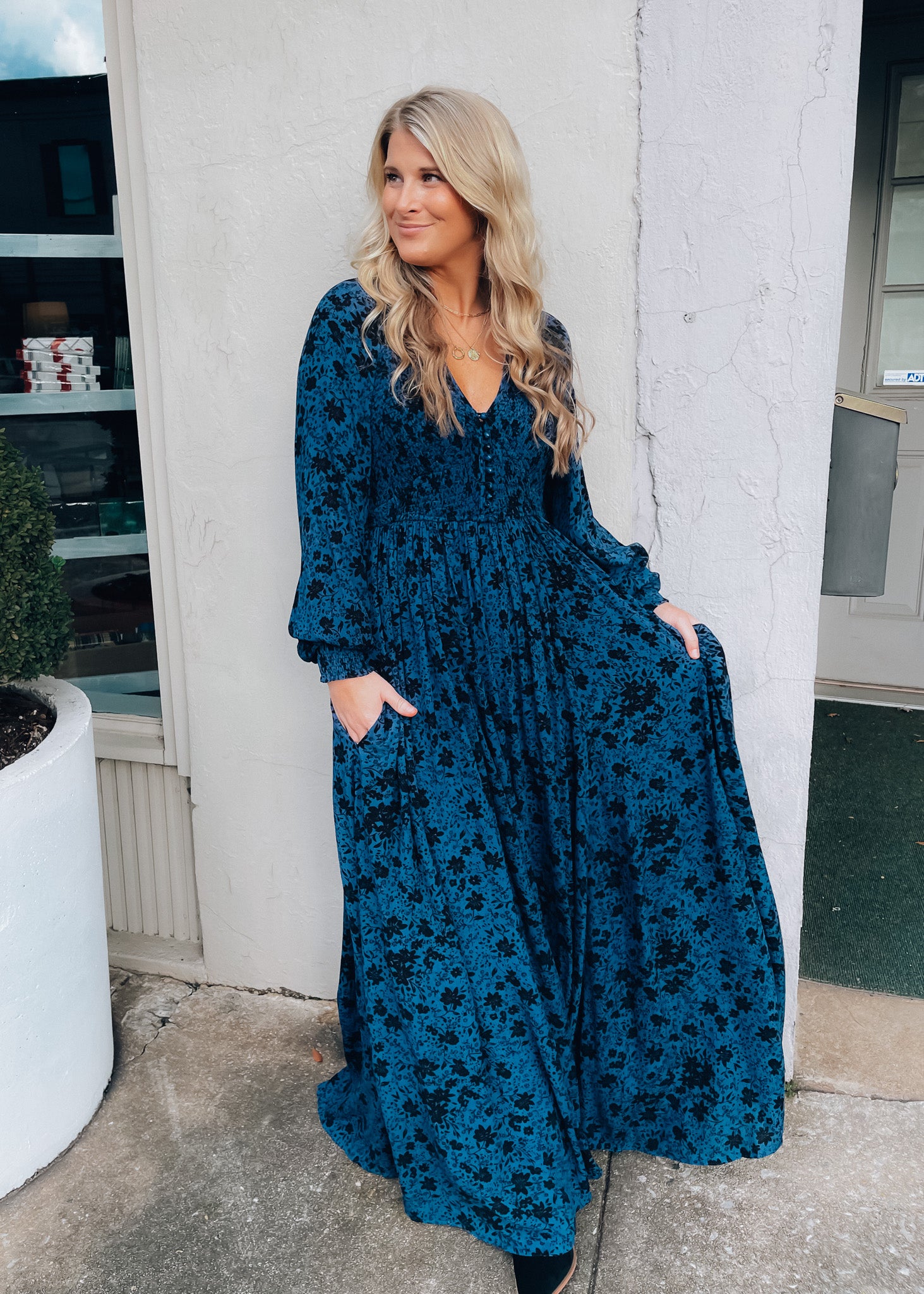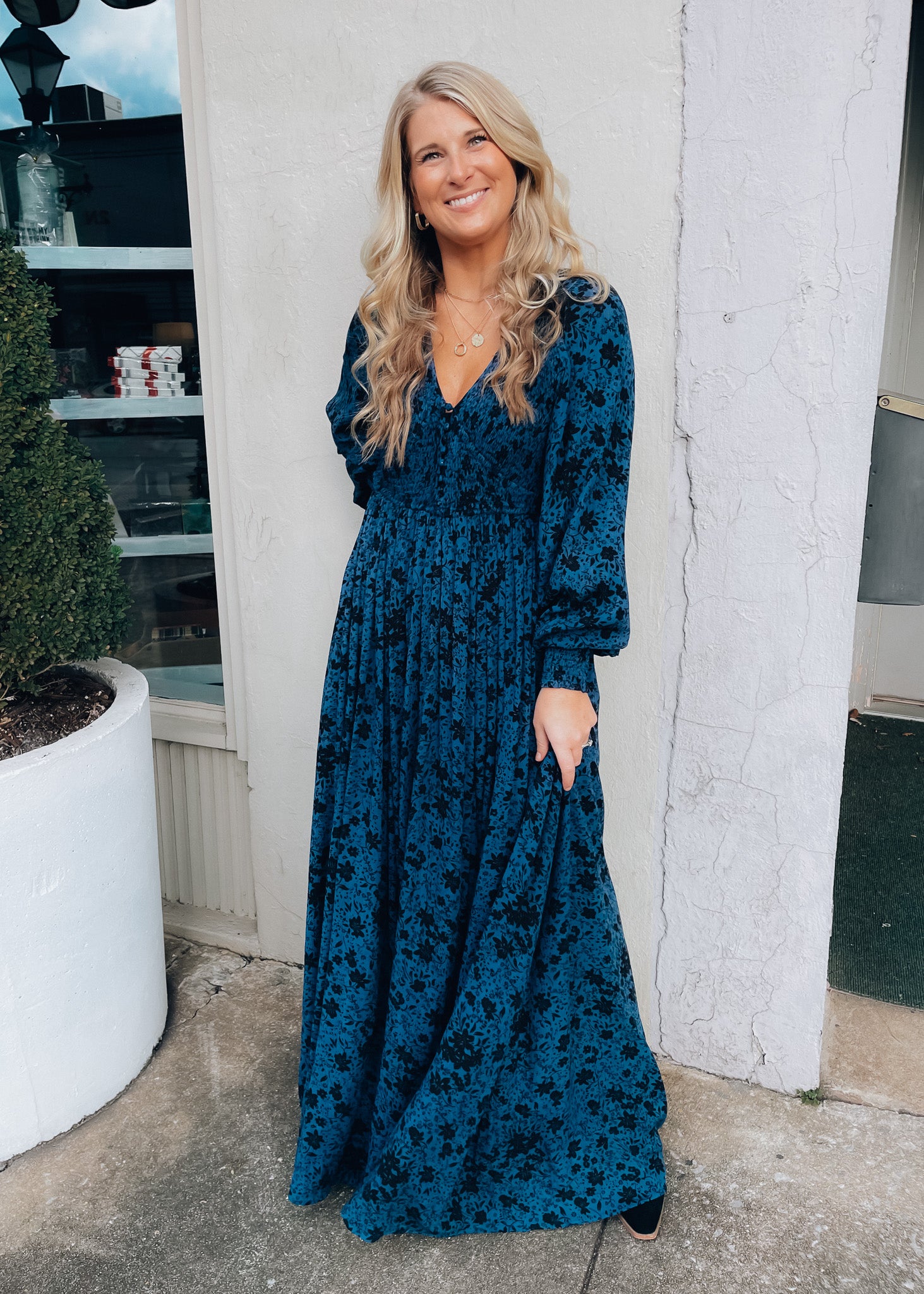 Indulge in the enchanting Midnight Magic Maxi Dress. This dark blue dress is smocked for a flattering fit, while the black floral pattern adds a touch of elegance. Button cuffed long sleeves complete the look, making it perfect for any occasion. Embrace effortless style and beauty with this must-have dress!