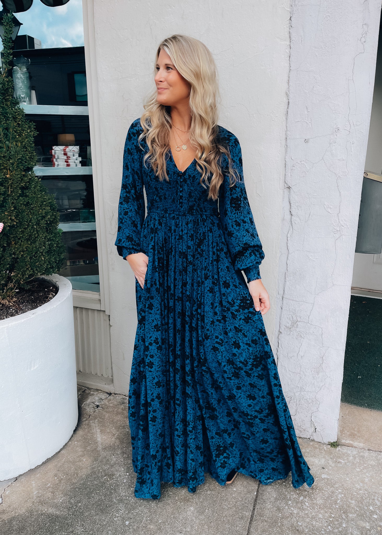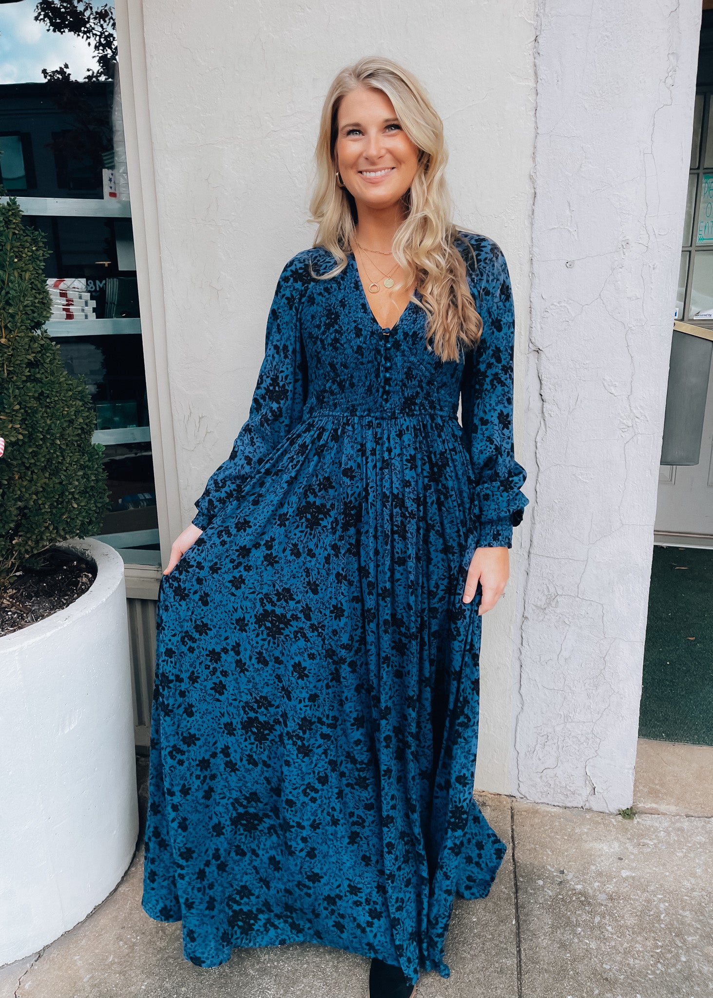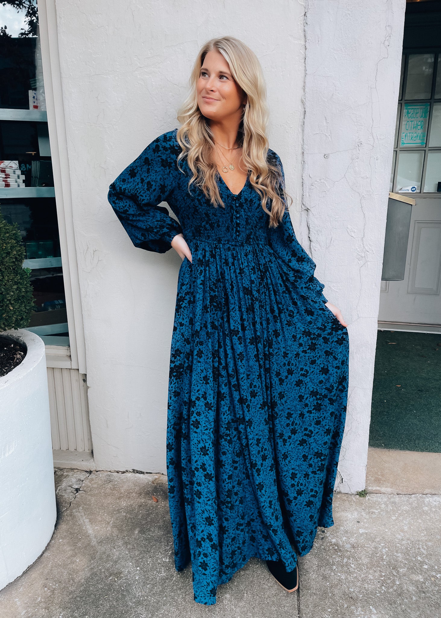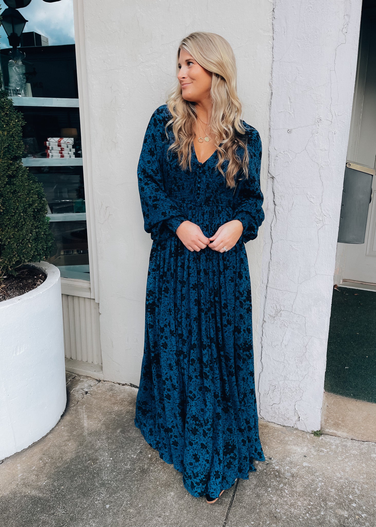 Indulge in the enchanting Midnight Magic Maxi Dress. This dark blue dress is smocked for a flattering fit, while the black floral pattern adds a touch of elegance. Button cuffed long sleeves complete the look, making it perfect for any occasion. Embrace effortless style and beauty with this must-have dress!