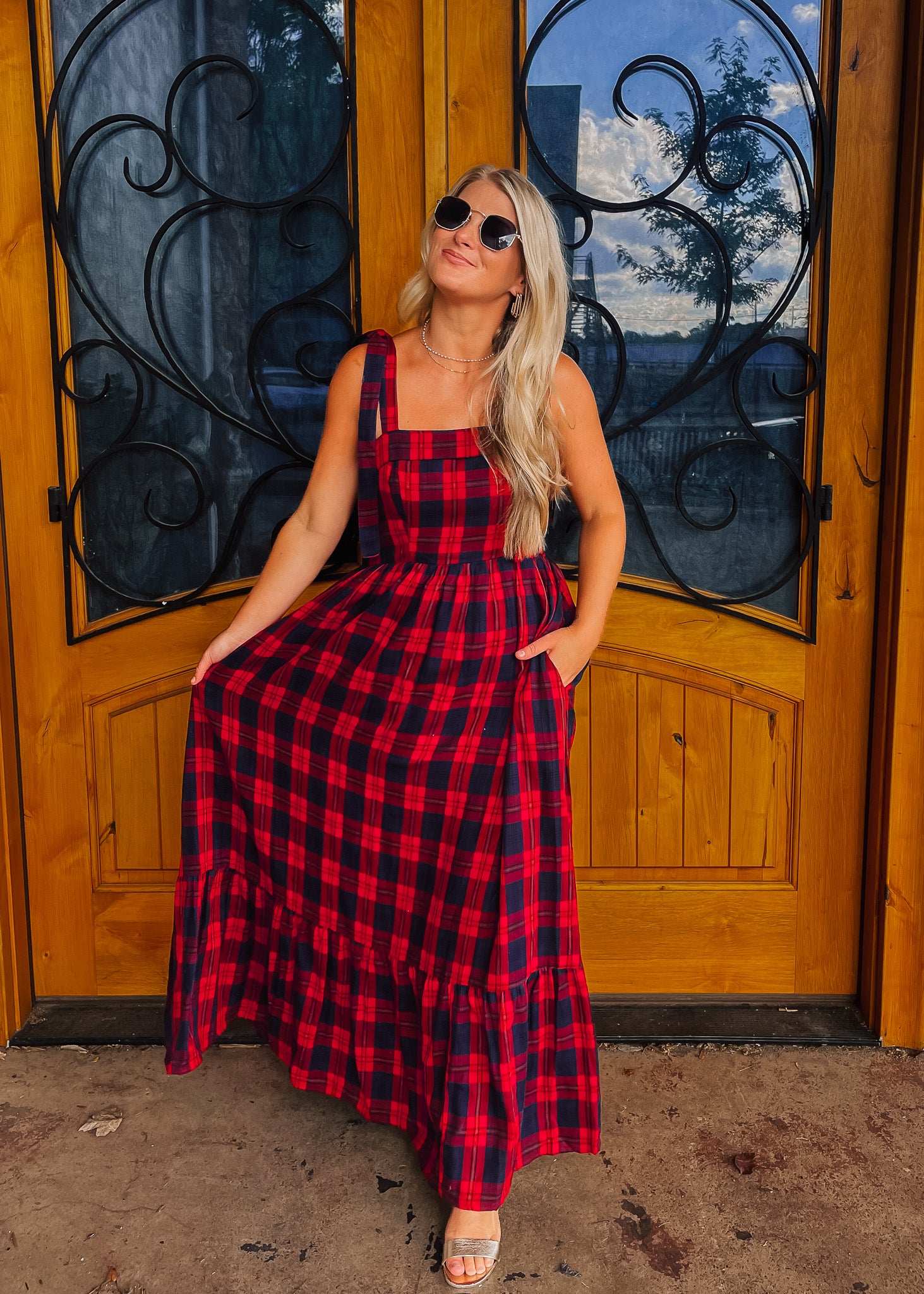 Embrace effortless style with the More to Give Maxi Dress, featuring a striking red and blue plaid tartan pattern. Crafted from soft cotton, it offers adjustable tie sleeves for a customized fit and smocked back detailing that enhances comfort and shape. A convenient side zipper ensures easy wear, making this dress perfect for any occasion where you want to stand out with flair. It also feature convenient pockets and if lined!