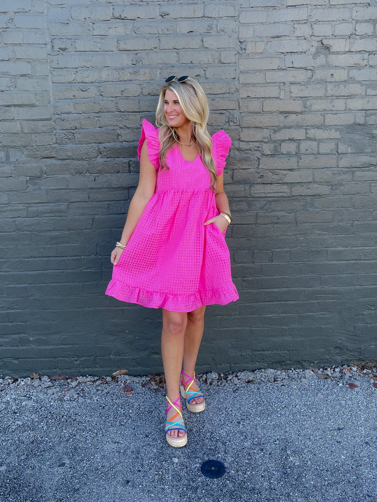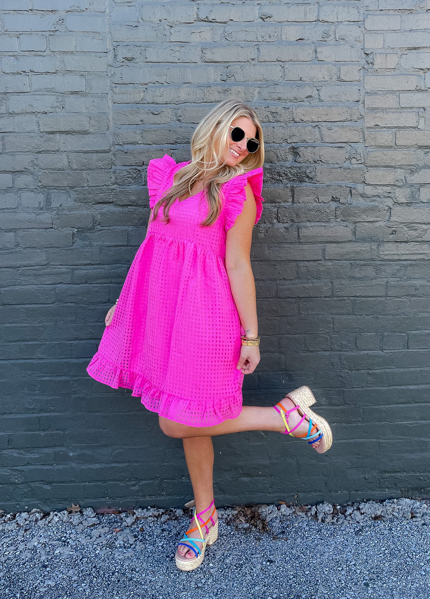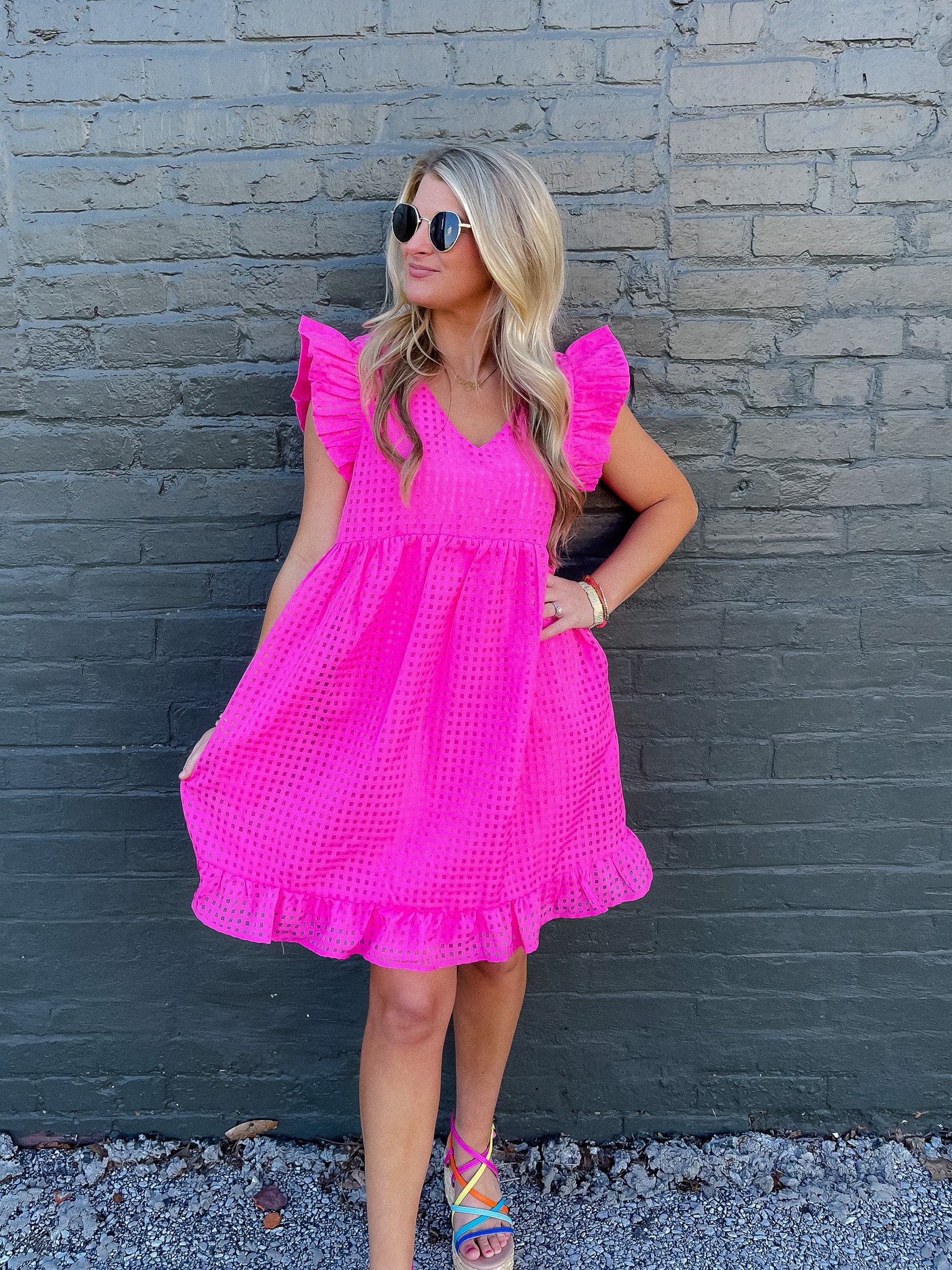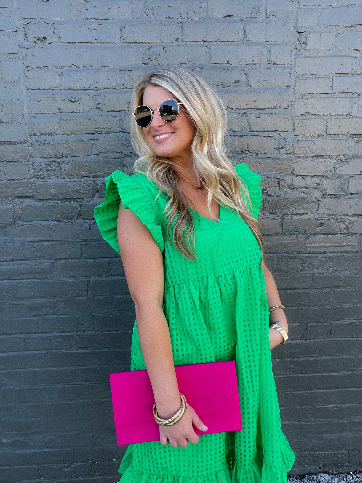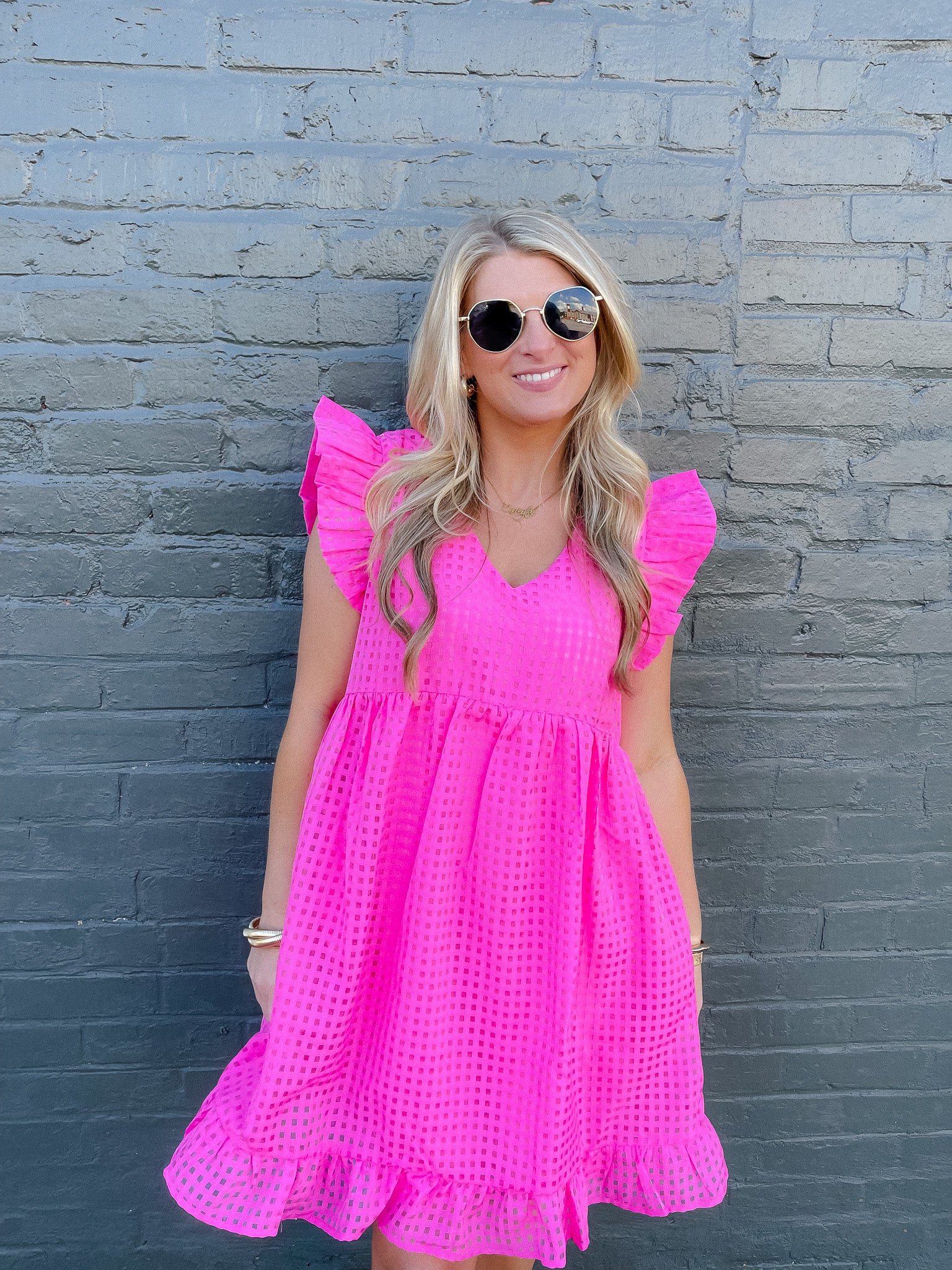 Introducing the No Greater Feeling Dress - a must-have for fashion lovers! This dress features a textured-check design with a v-neck back, frilled cap sleeves, and a ruffled hemline. It also comes with convenient pockets and is lined for a comfortable fit. Available in black, hot pink, and kelly green, this lightweight dress is perfect for any occasion. Experience the joy of wearing this versatile and stylish piece.