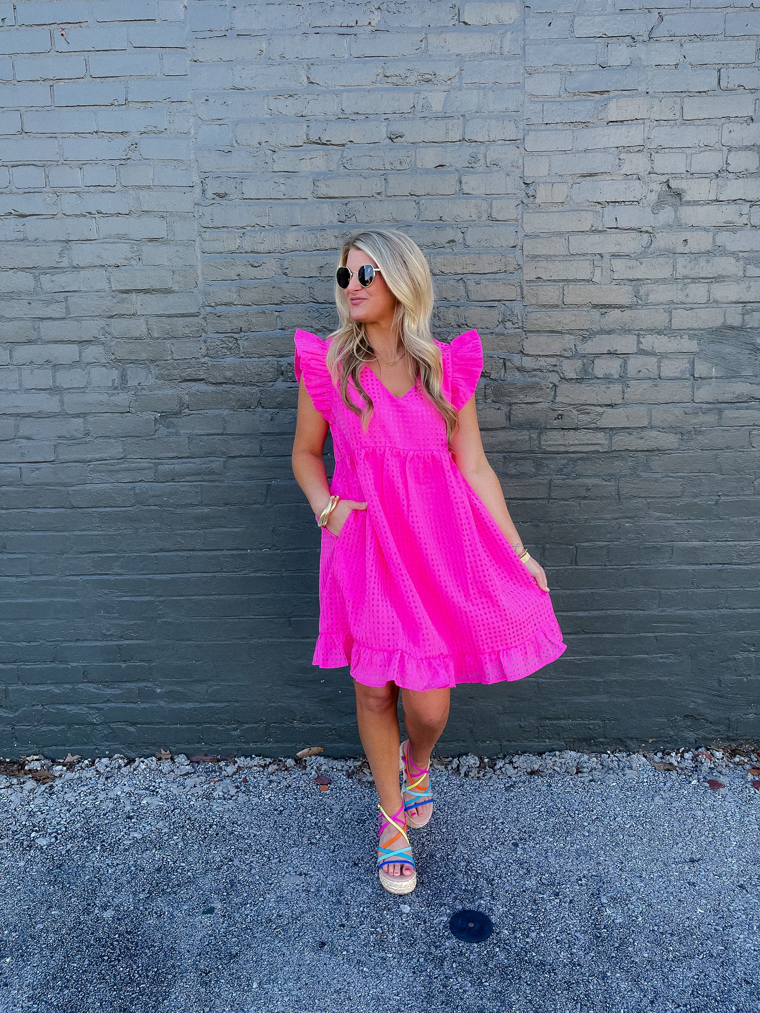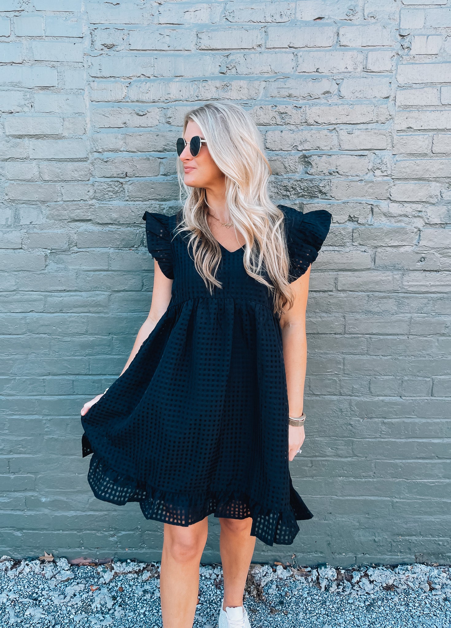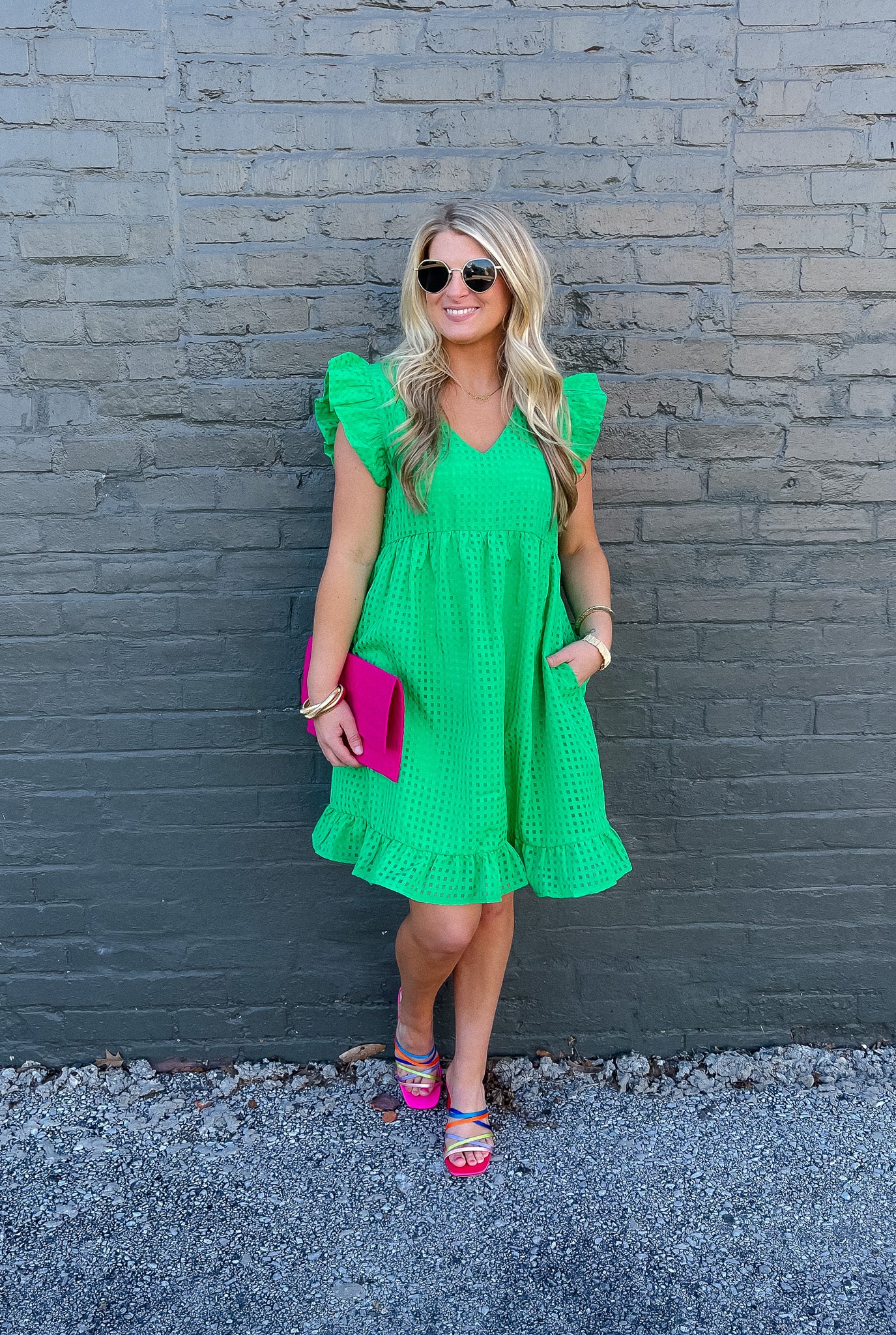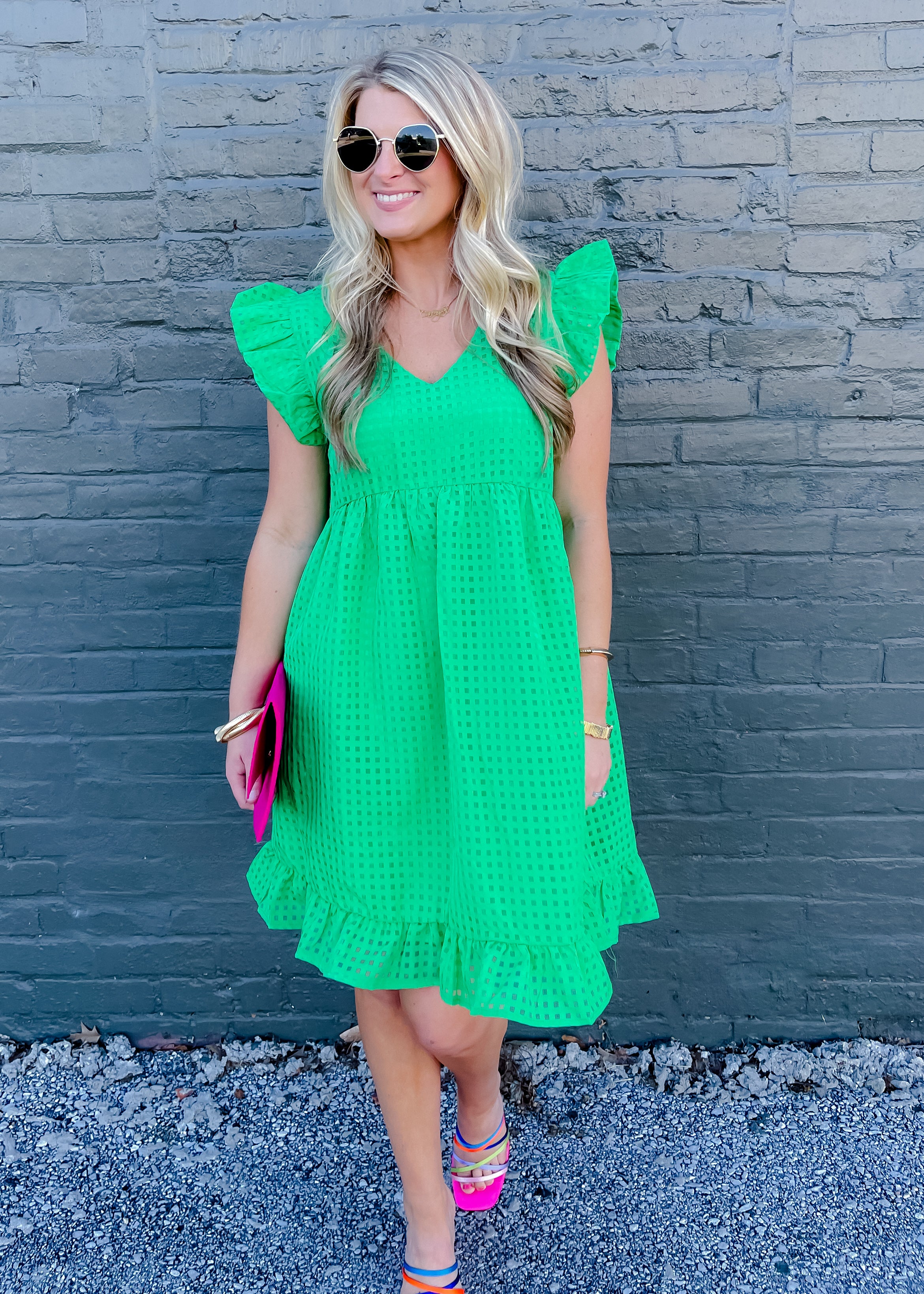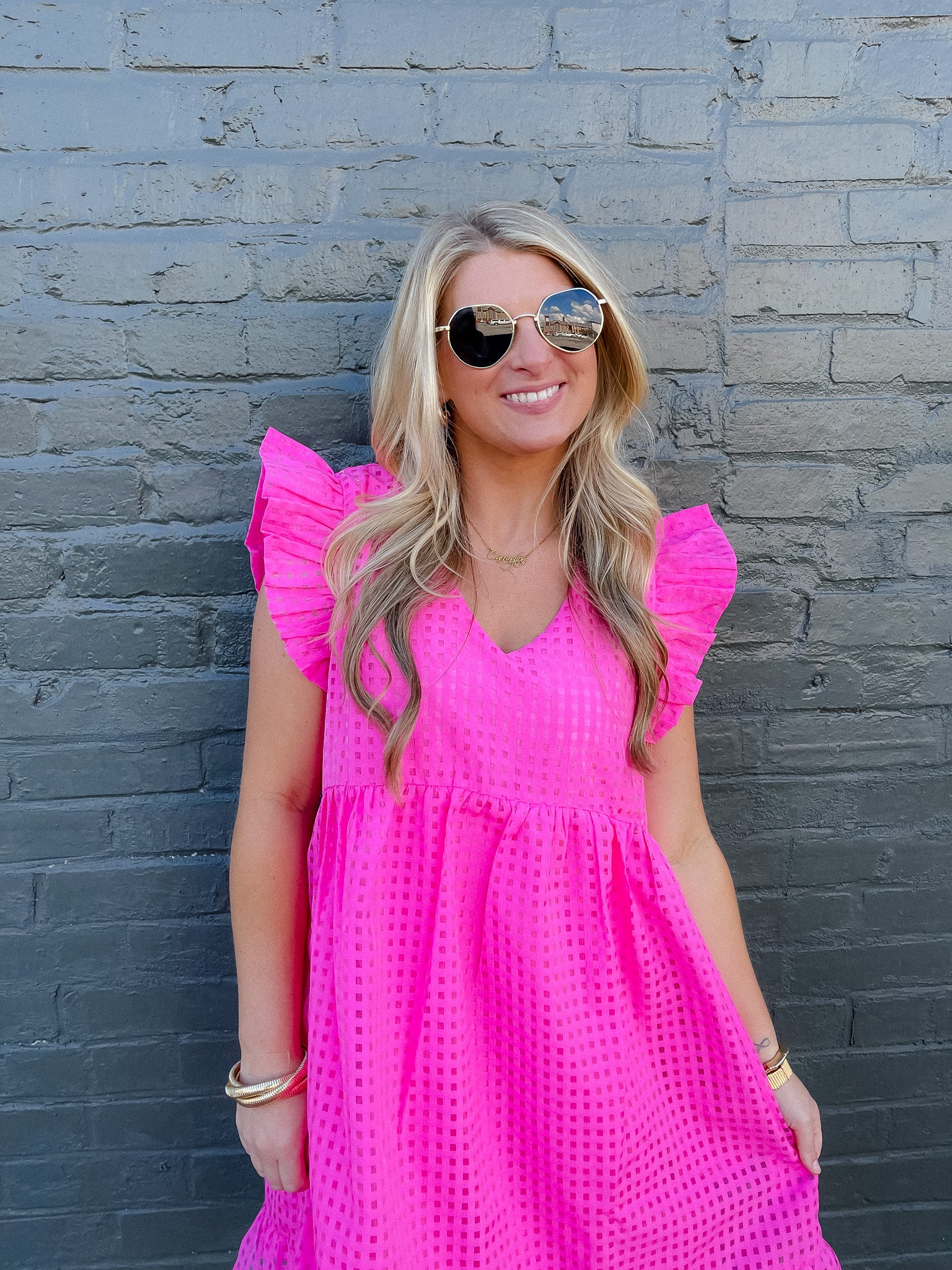 Introducing the No Greater Feeling Dress - a must-have for fashion lovers! This dress features a textured-check design with a v-neck back, frilled cap sleeves, and a ruffled hemline. It also comes with convenient pockets and is lined for a comfortable fit. Available in black, hot pink, and kelly green, this lightweight dress is perfect for any occasion. Experience the joy of wearing this versatile and stylish piece.