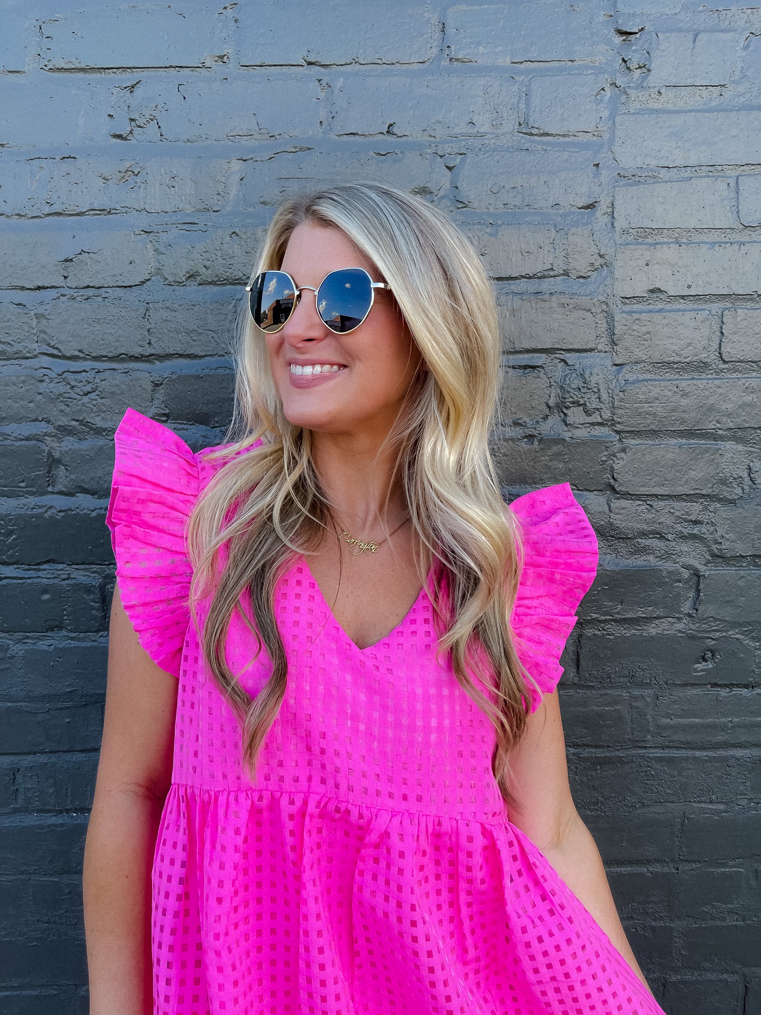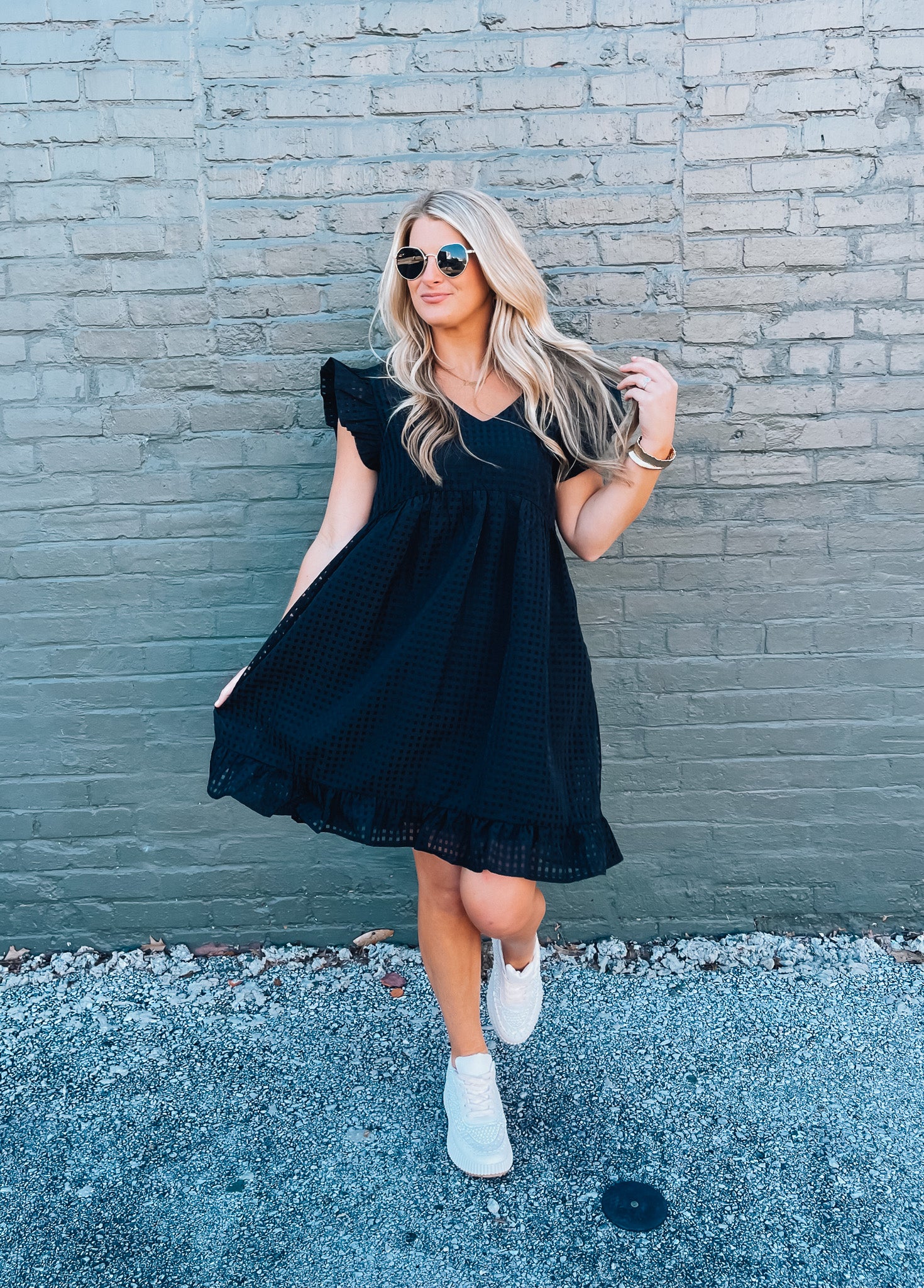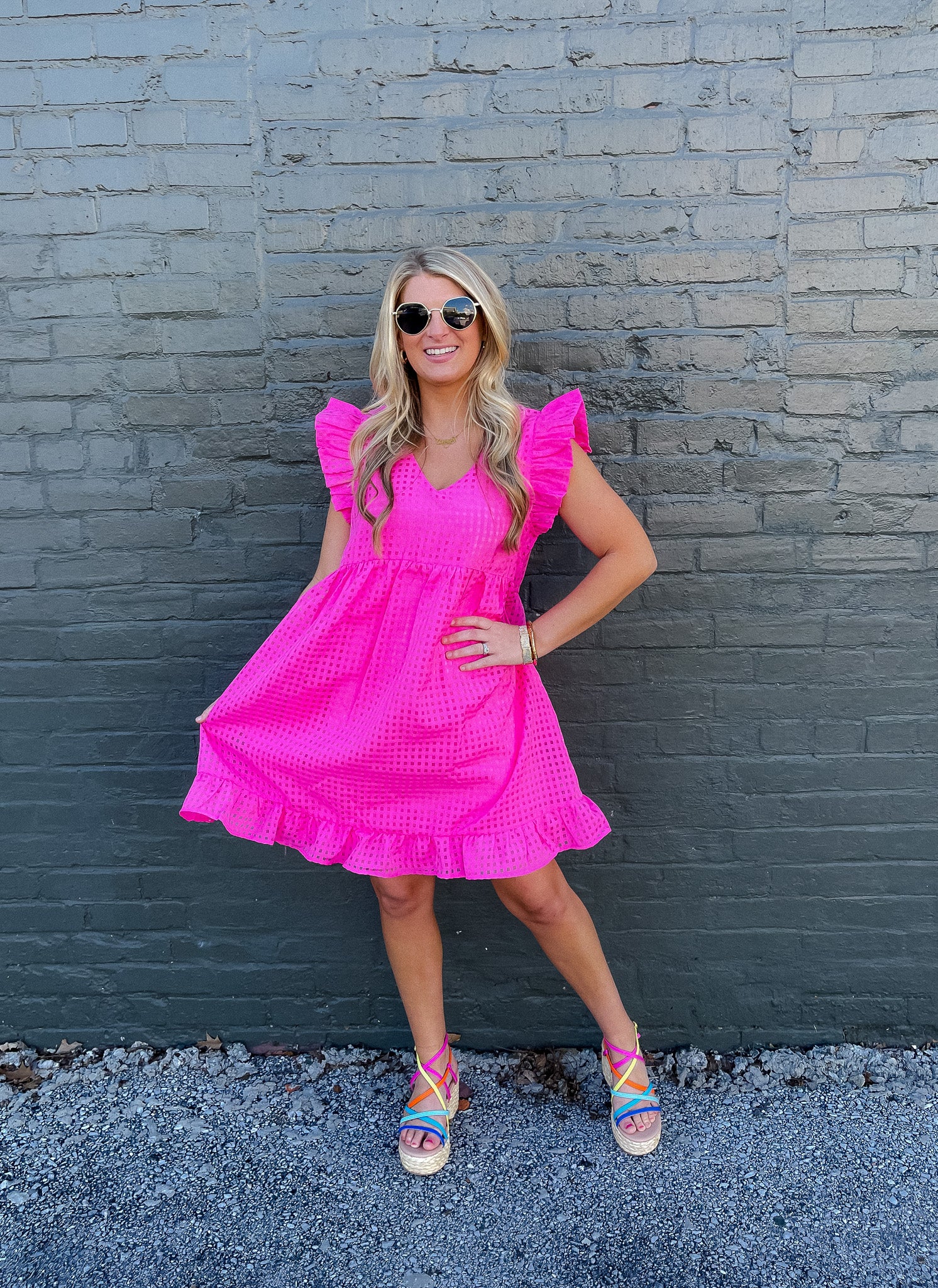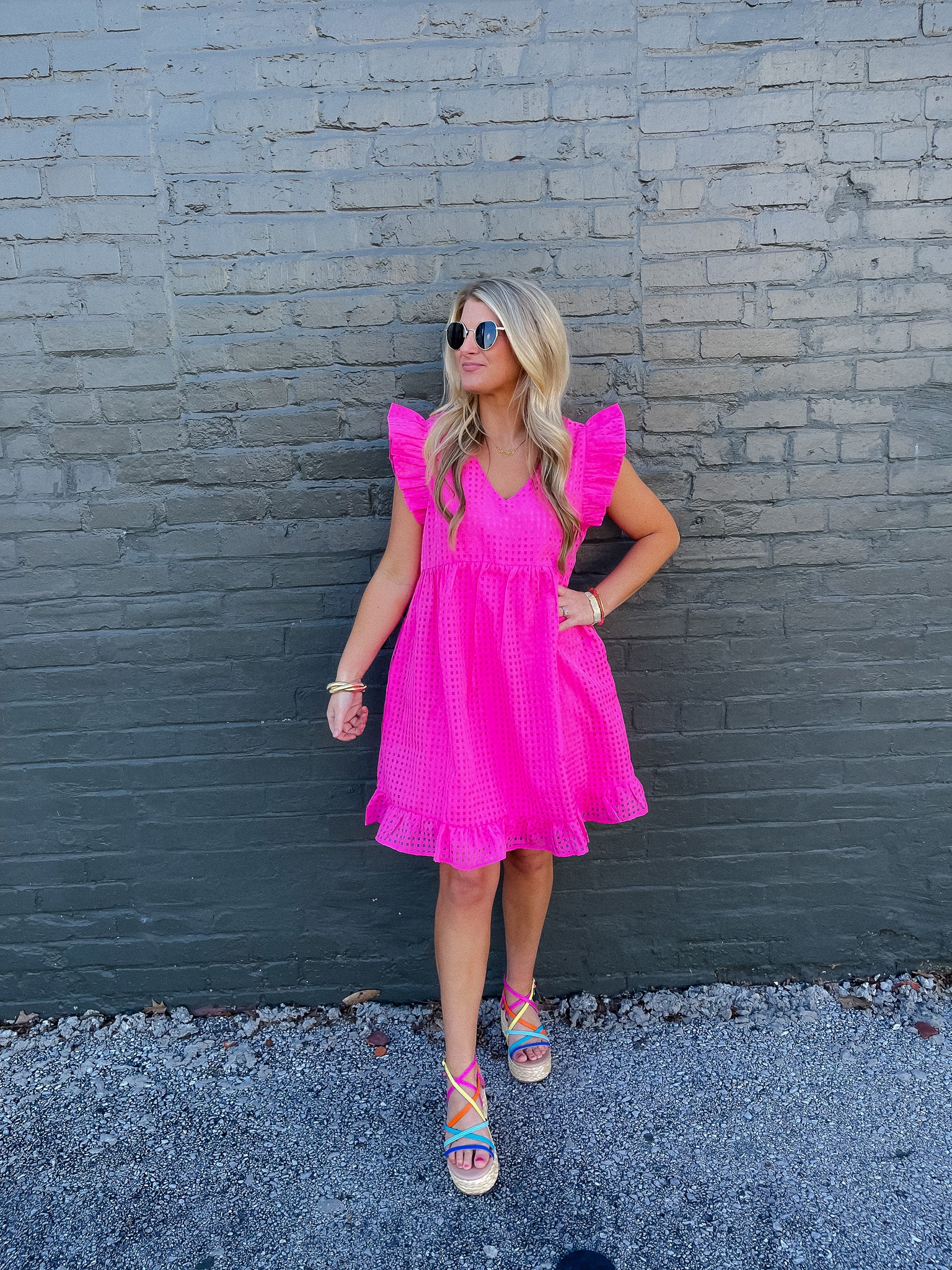 Introducing the No Greater Feeling Dress - a must-have for fashion lovers! This dress features a textured-check design with a v-neck back, frilled cap sleeves, and a ruffled hemline. It also comes with convenient pockets and is lined for a comfortable fit. Available in black, hot pink, and kelly green, this lightweight dress is perfect for any occasion. Experience the joy of wearing this versatile and stylish piece.
