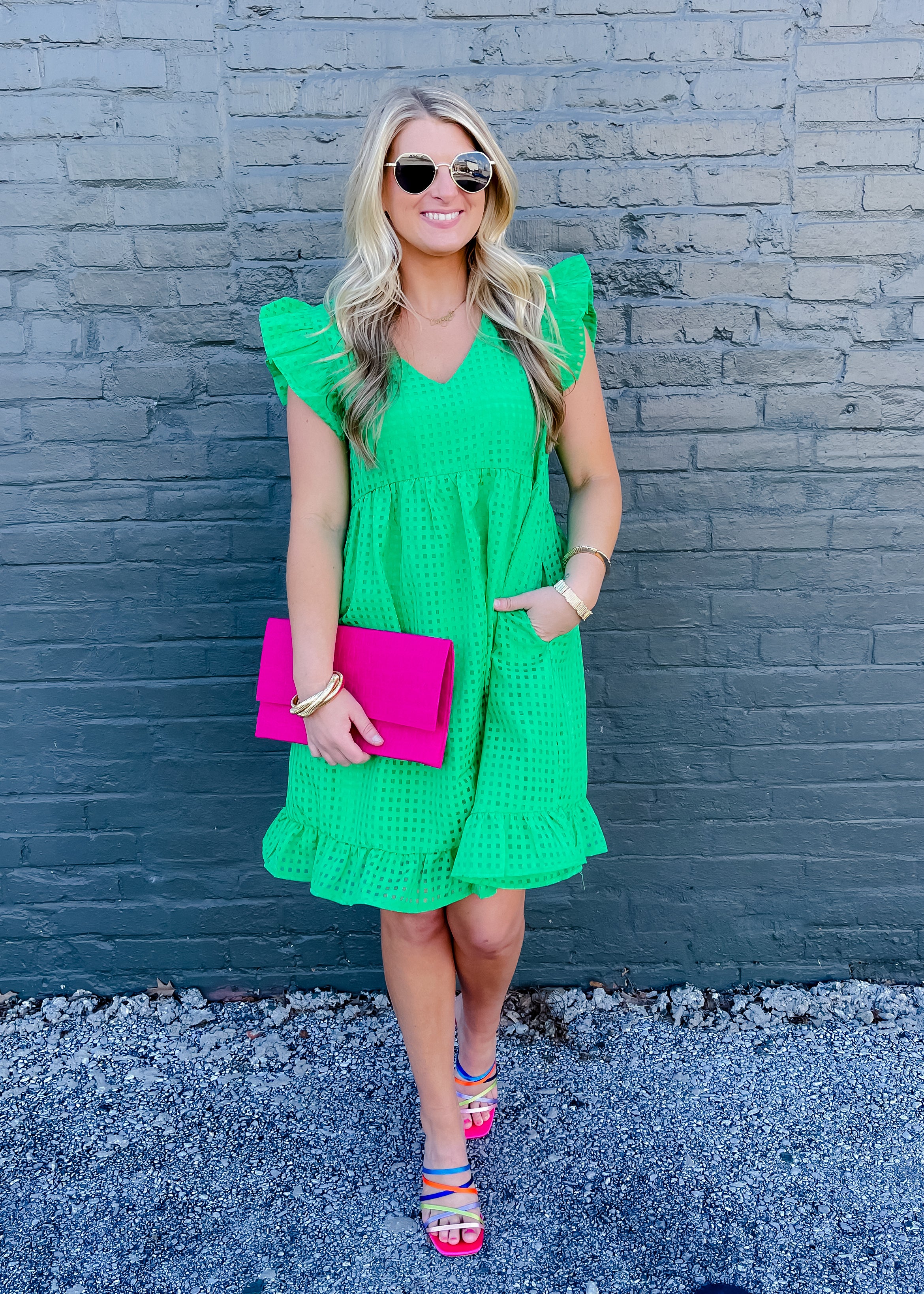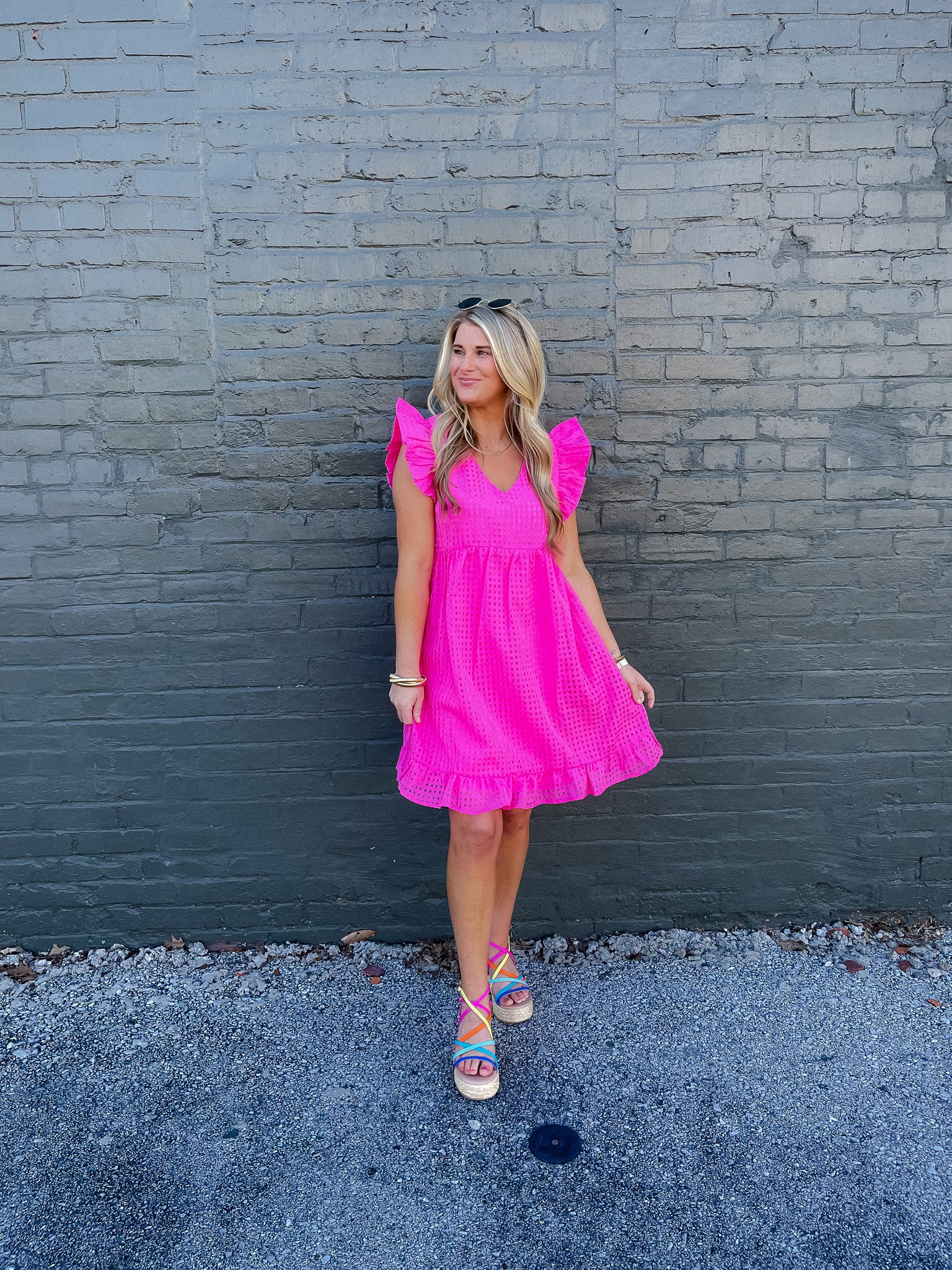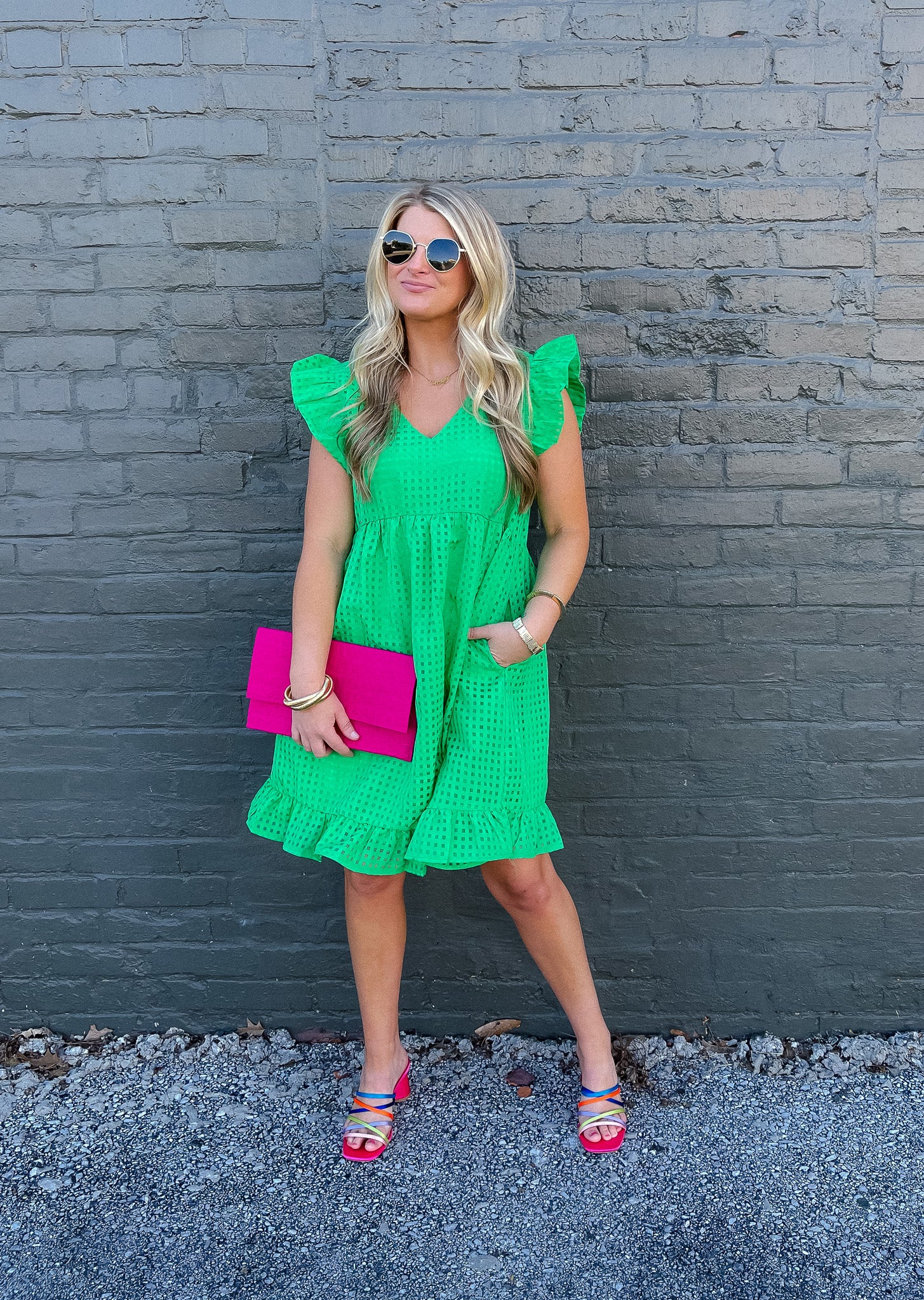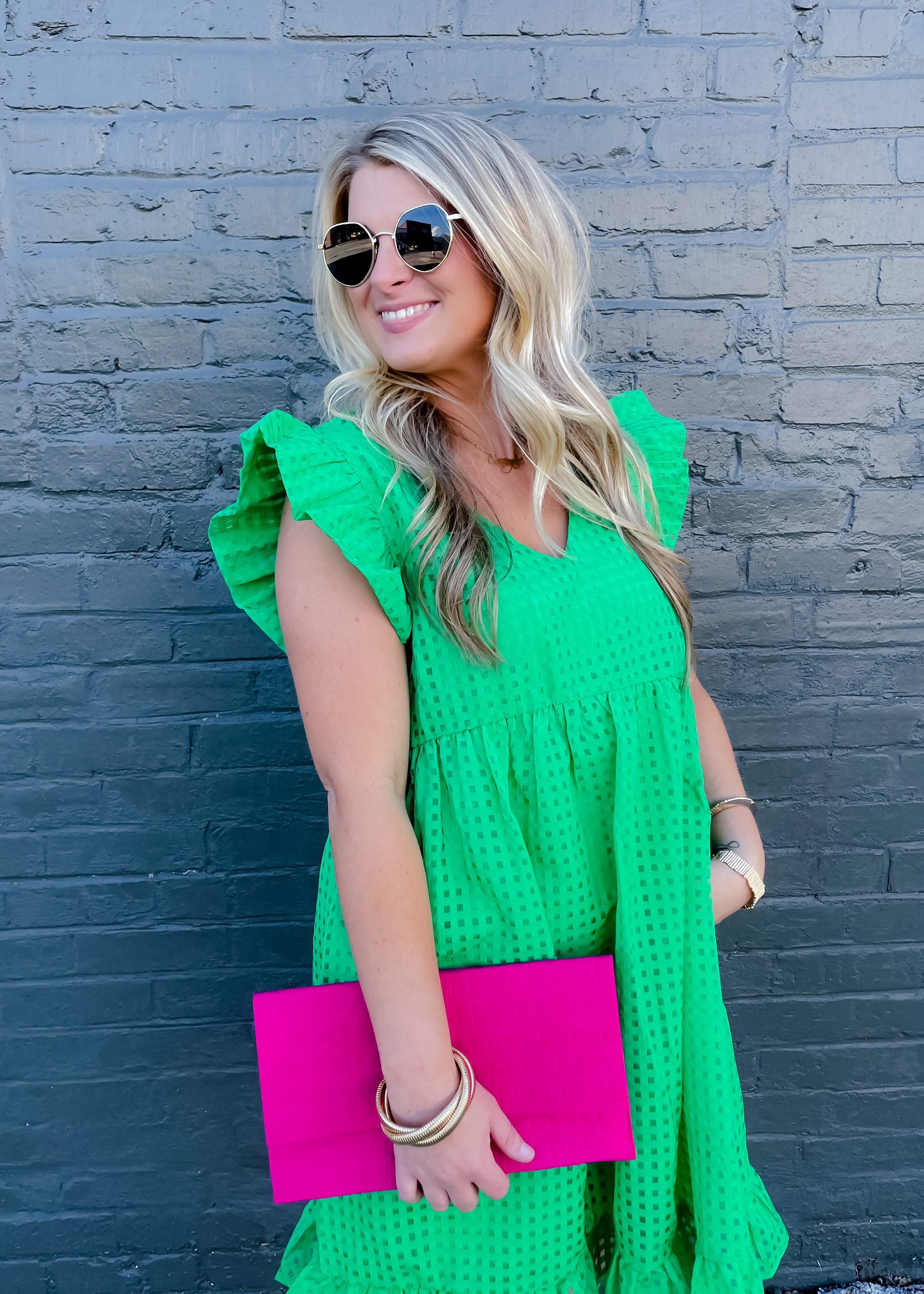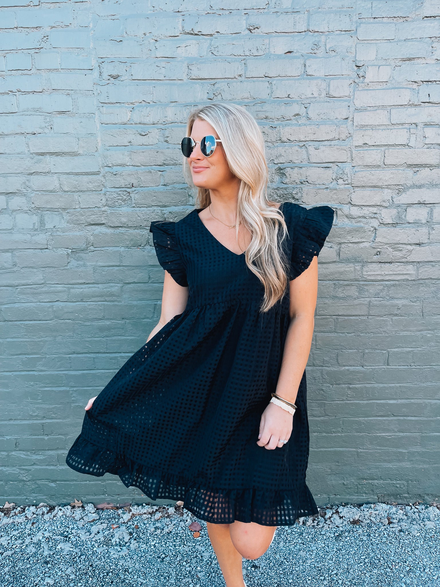 Introducing the No Greater Feeling Dress - a must-have for fashion lovers! This dress features a textured-check design with a v-neck back, frilled cap sleeves, and a ruffled hemline. It also comes with convenient pockets and is lined for a comfortable fit. Available in black, hot pink, and kelly green, this lightweight dress is perfect for any occasion. Experience the joy of wearing this versatile and stylish piece.