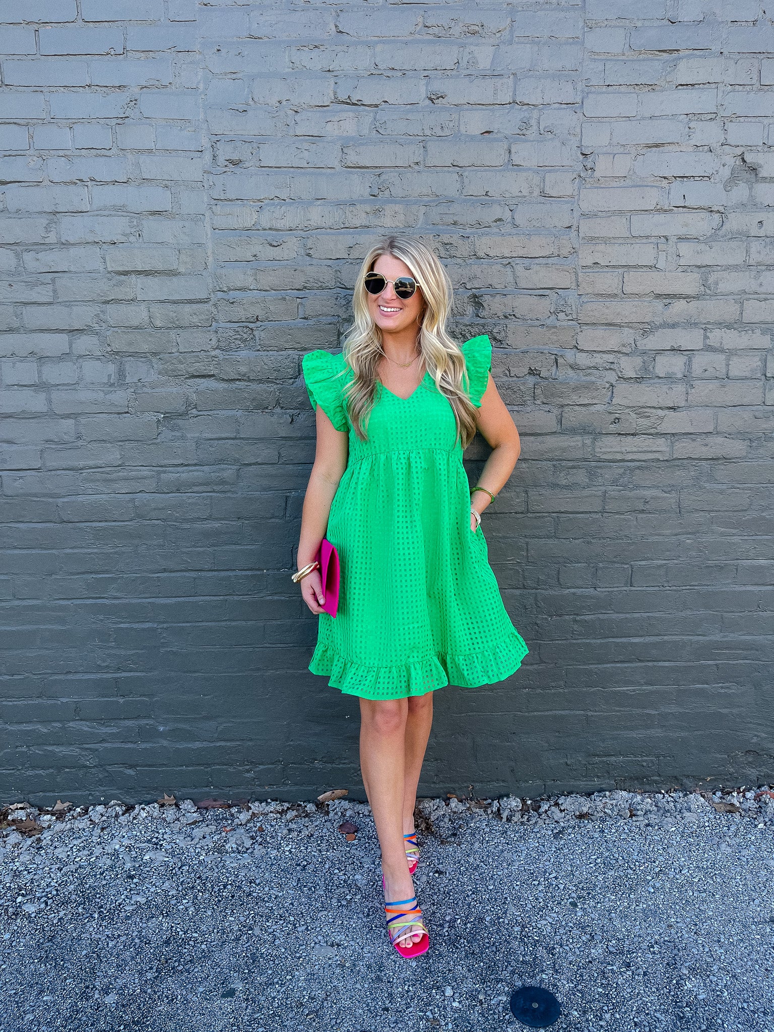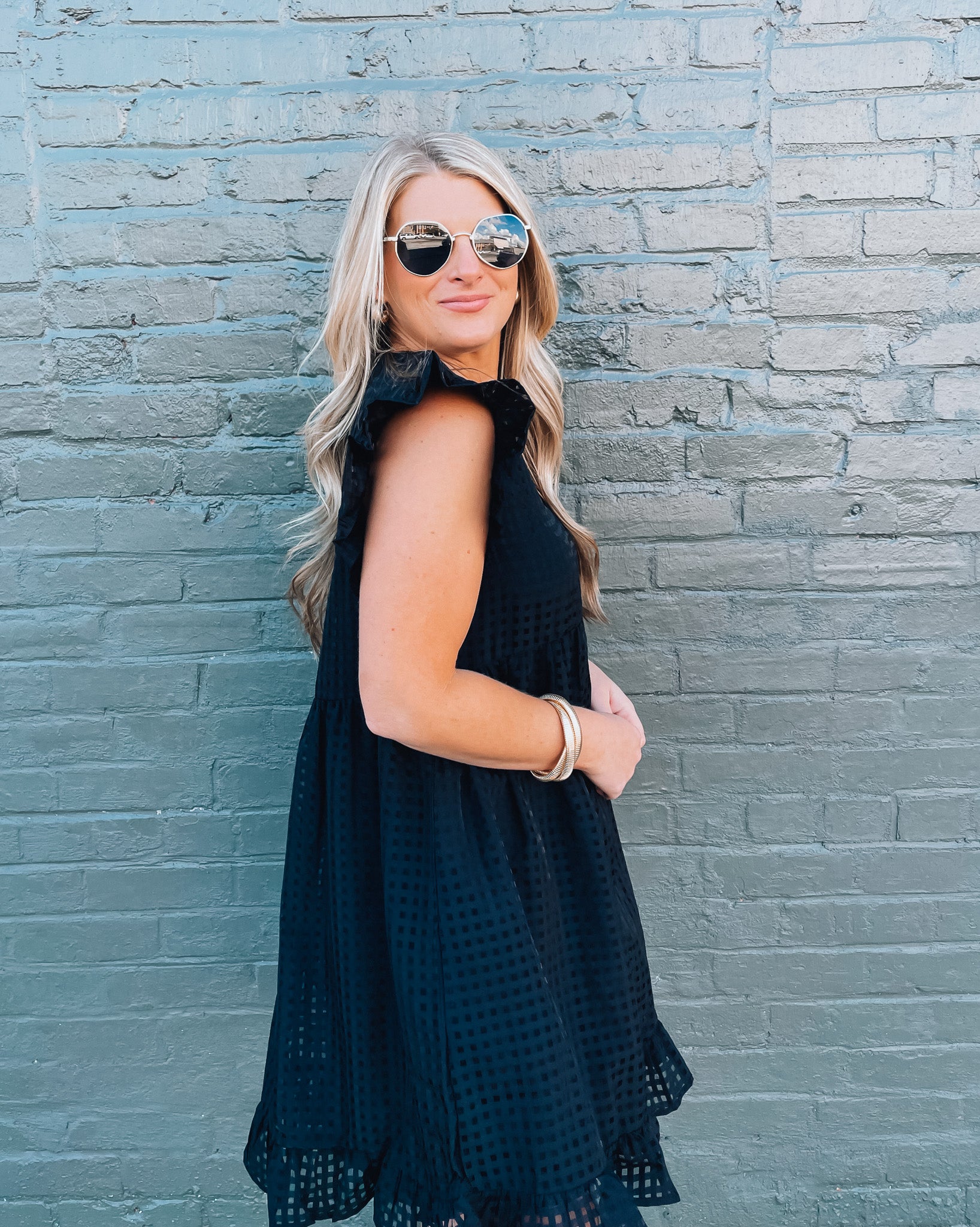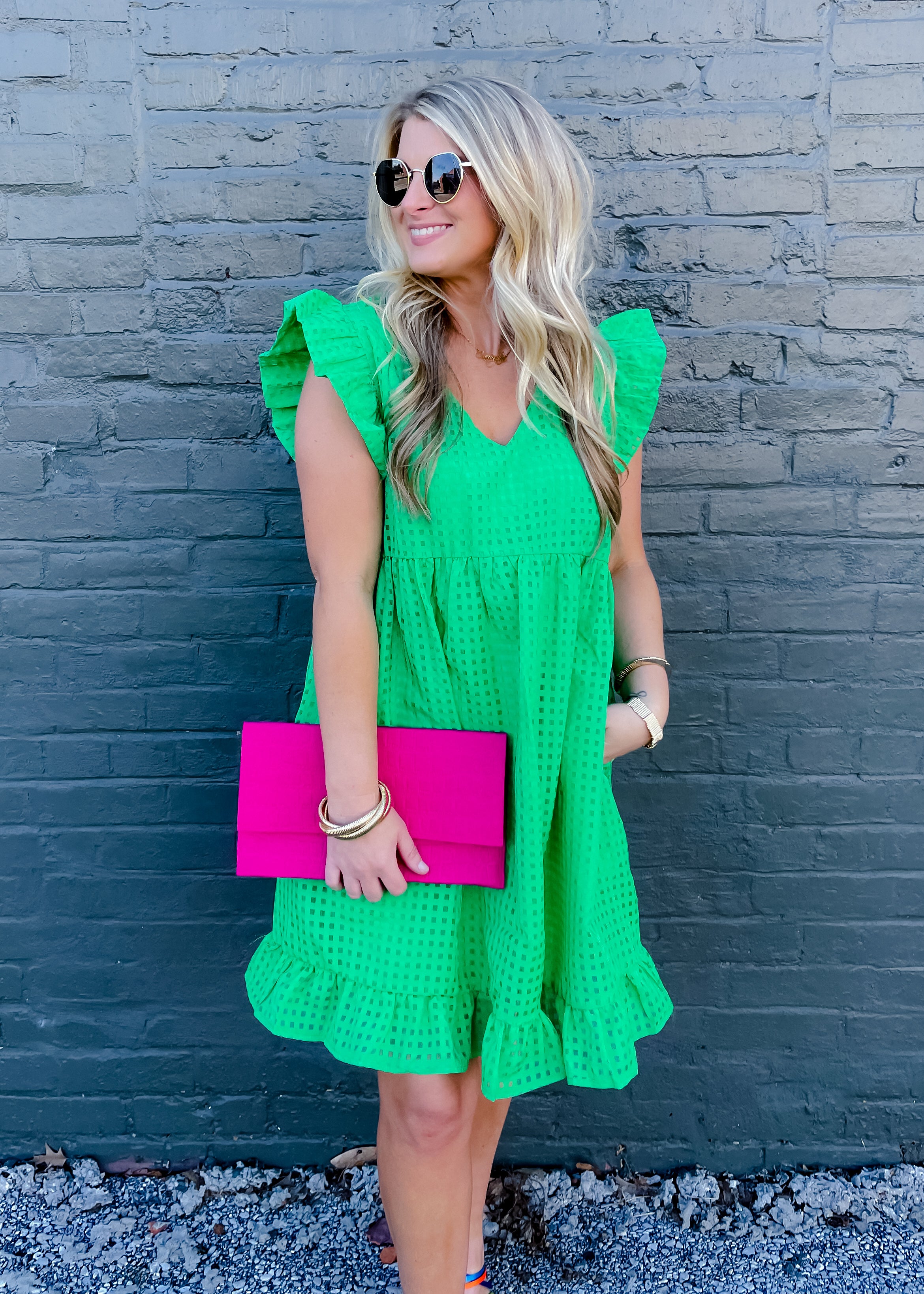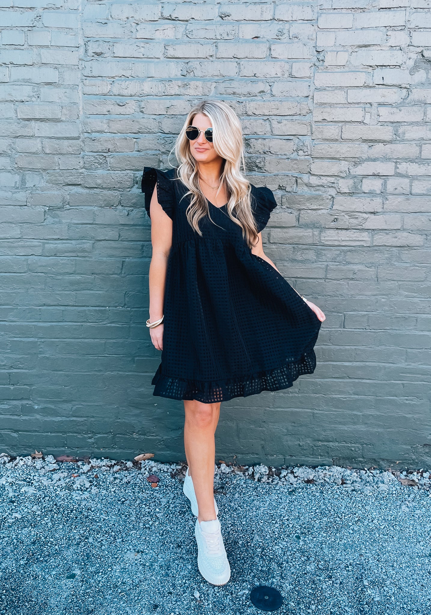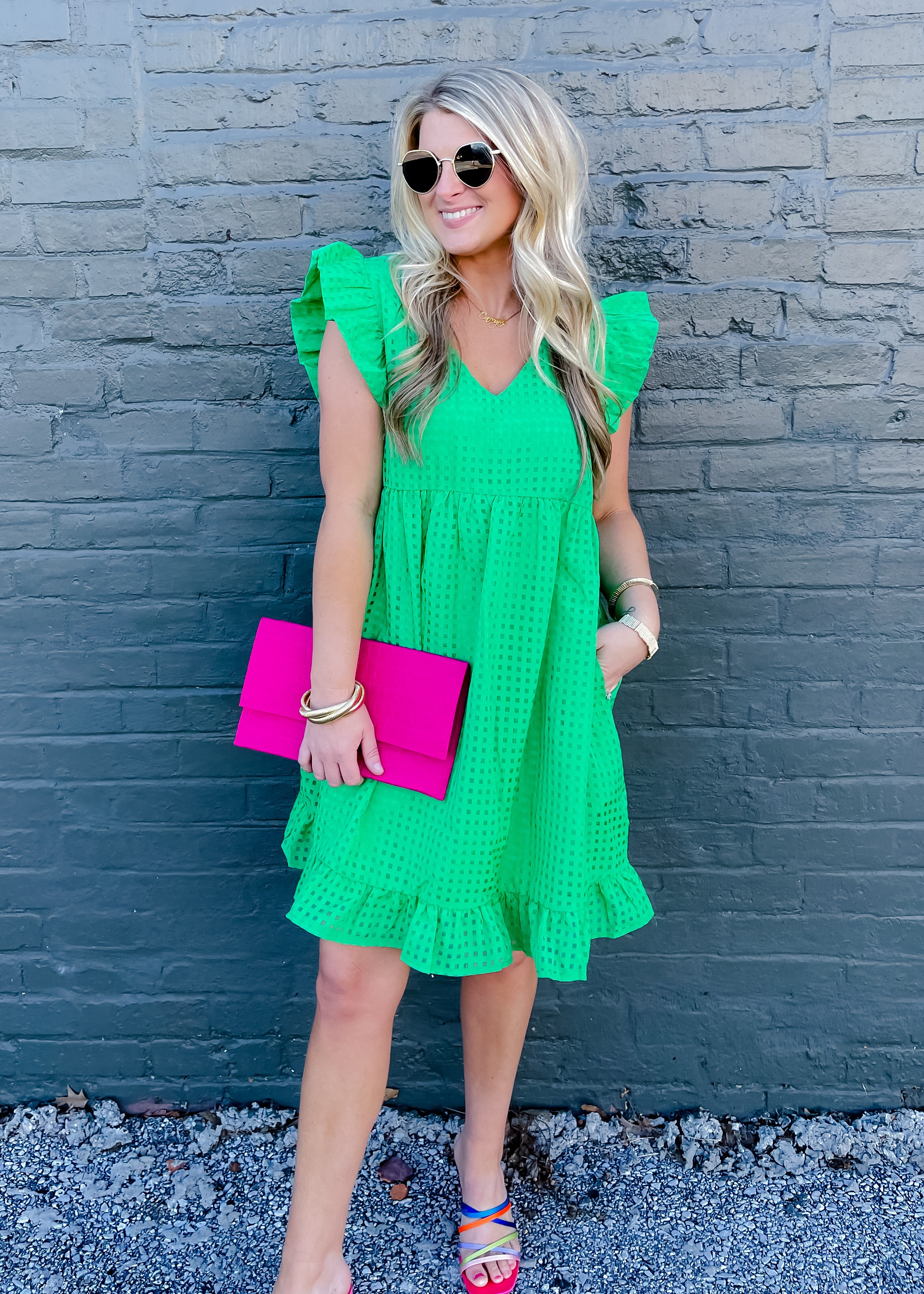 Introducing the No Greater Feeling Dress - a must-have for fashion lovers! This dress features a textured-check design with a v-neck back, frilled cap sleeves, and a ruffled hemline. It also comes with convenient pockets and is lined for a comfortable fit. Available in black, hot pink, and kelly green, this lightweight dress is perfect for any occasion. Experience the joy of wearing this versatile and stylish piece.