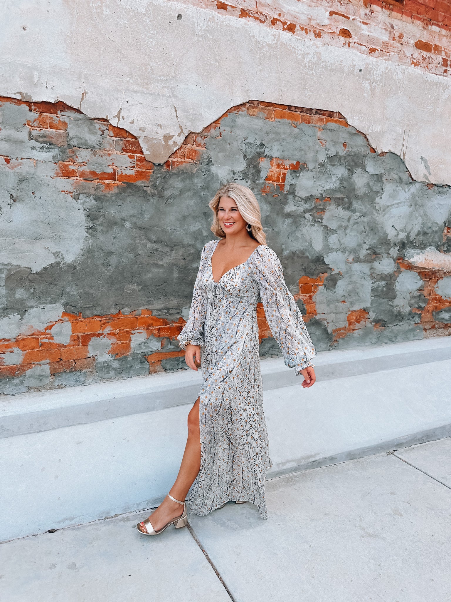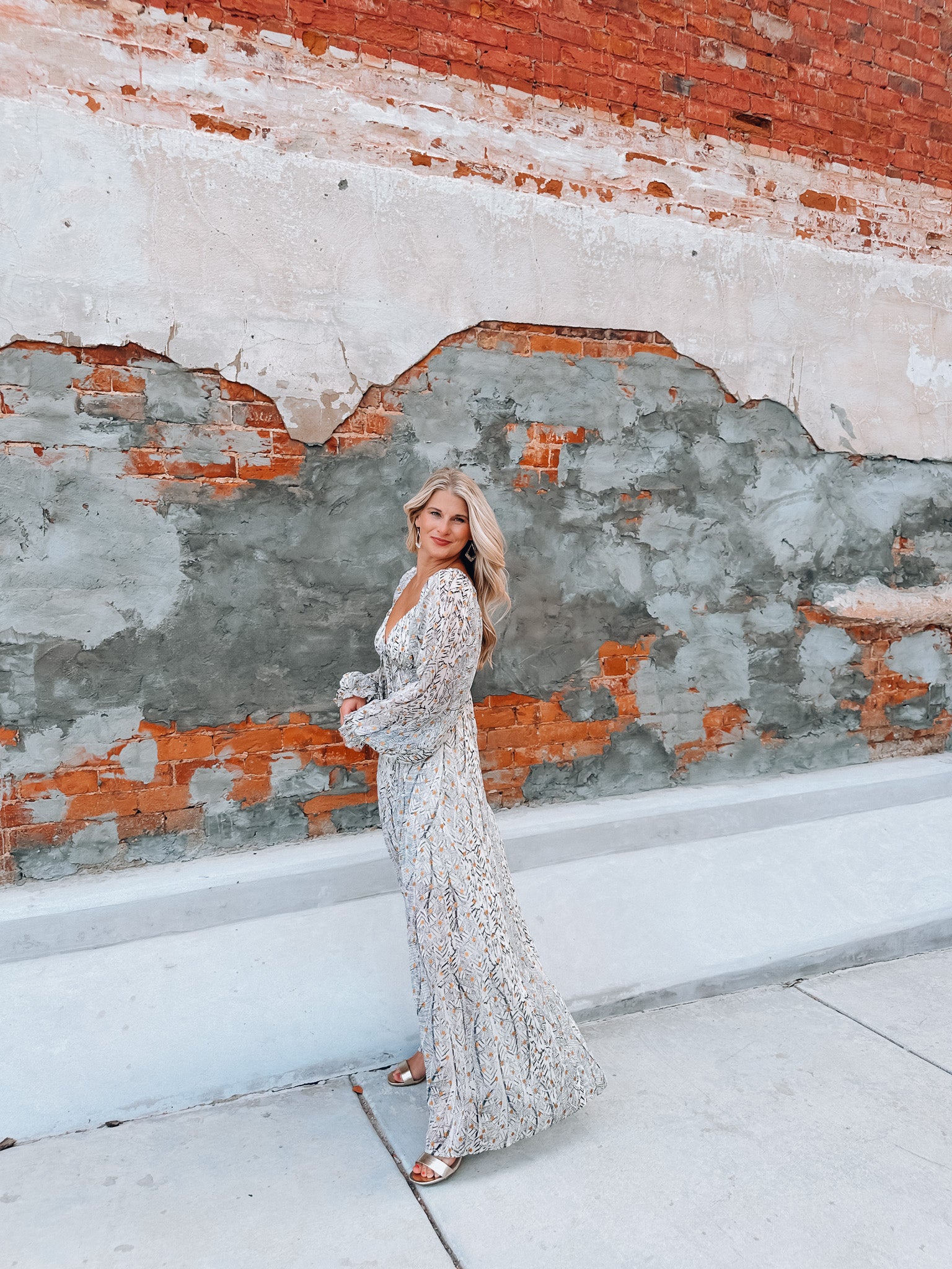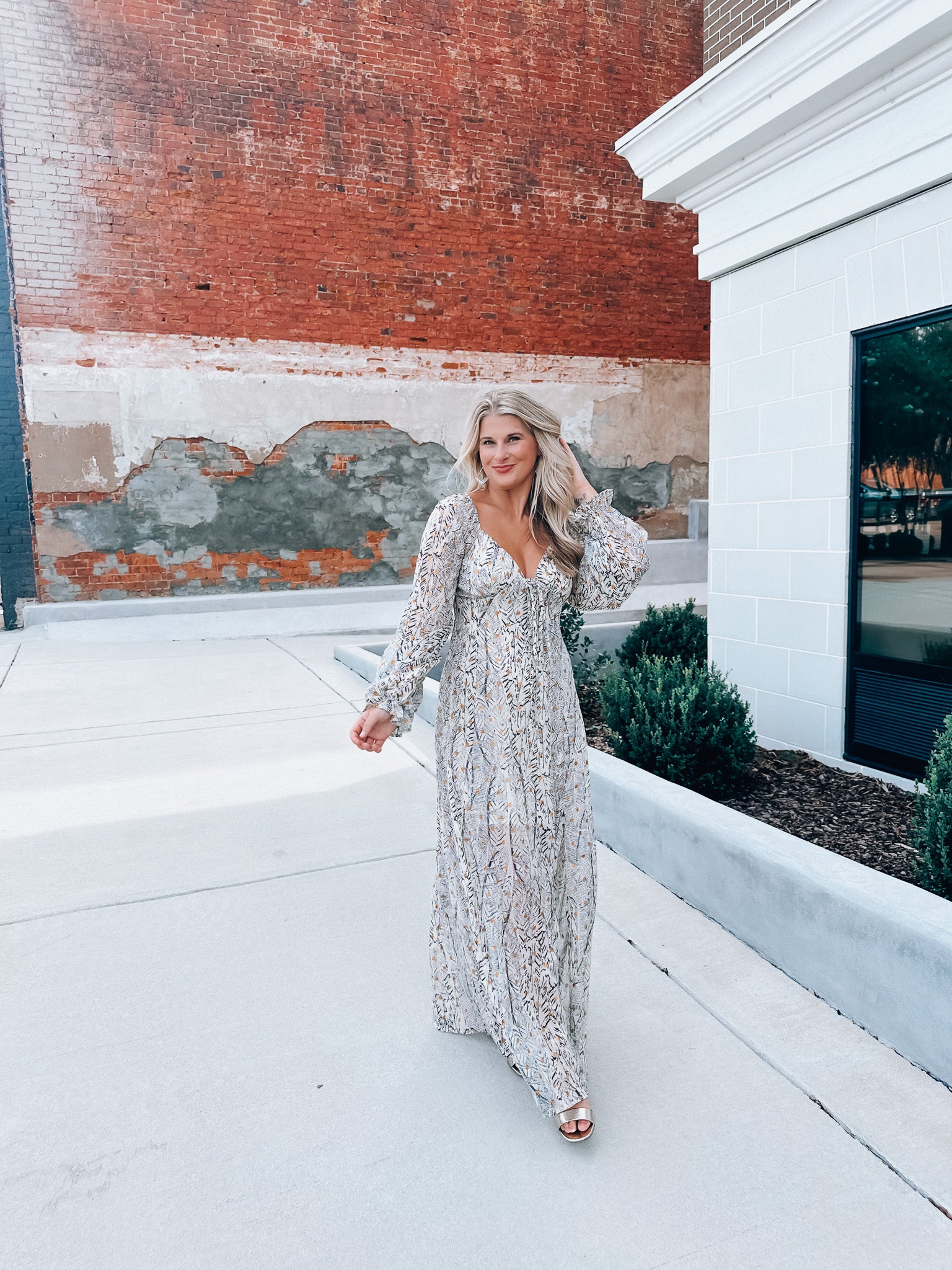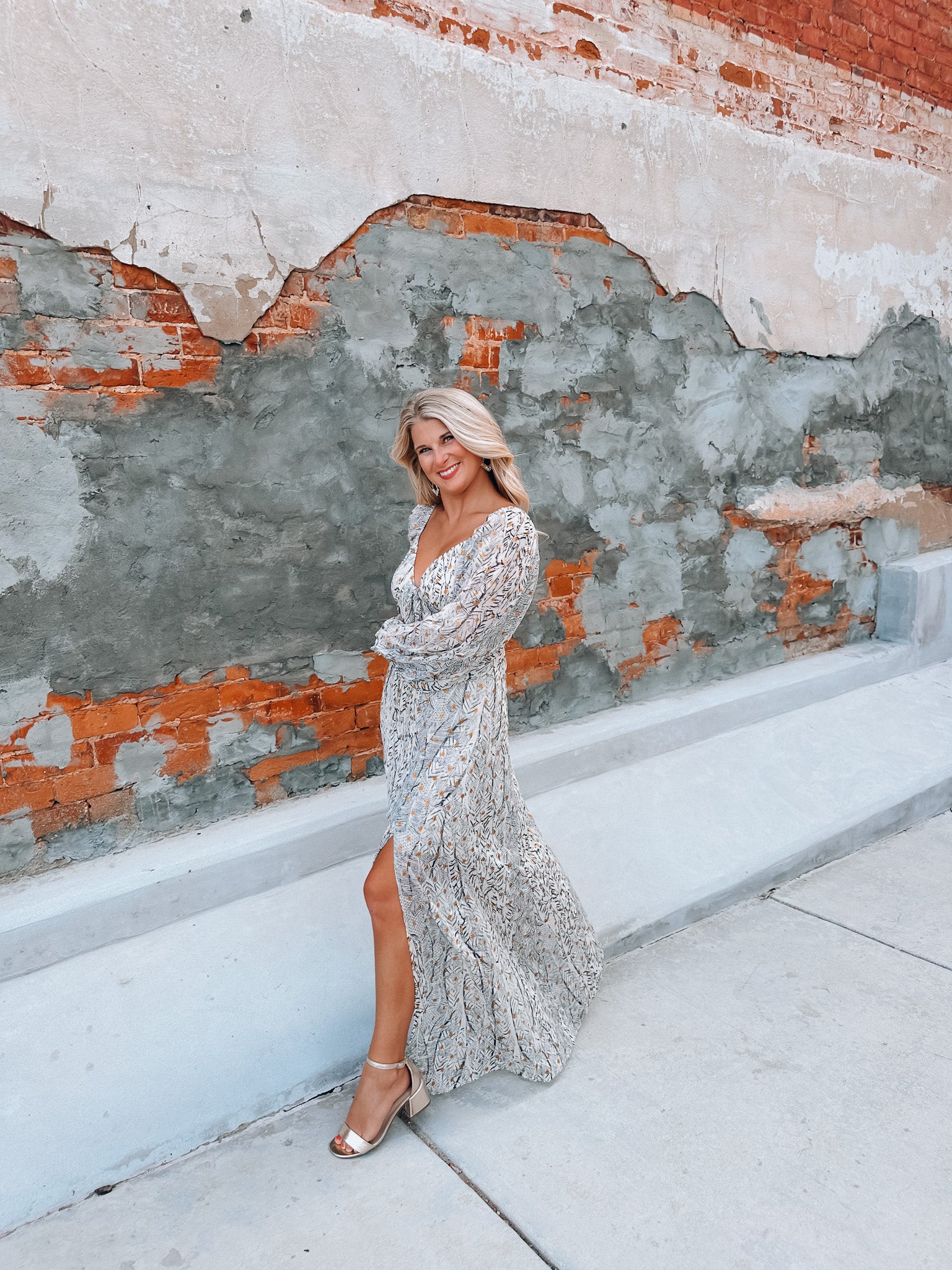 Experience elegance and luxury in our No One Better Maxi Dress! This stunning dress features a sweetheart halter tie, long sleeves with beige and black detailing, and gold embellishments. The dress is long sleeve, lined for comfort and has a sexy side slit. Perfect for any special occasion.