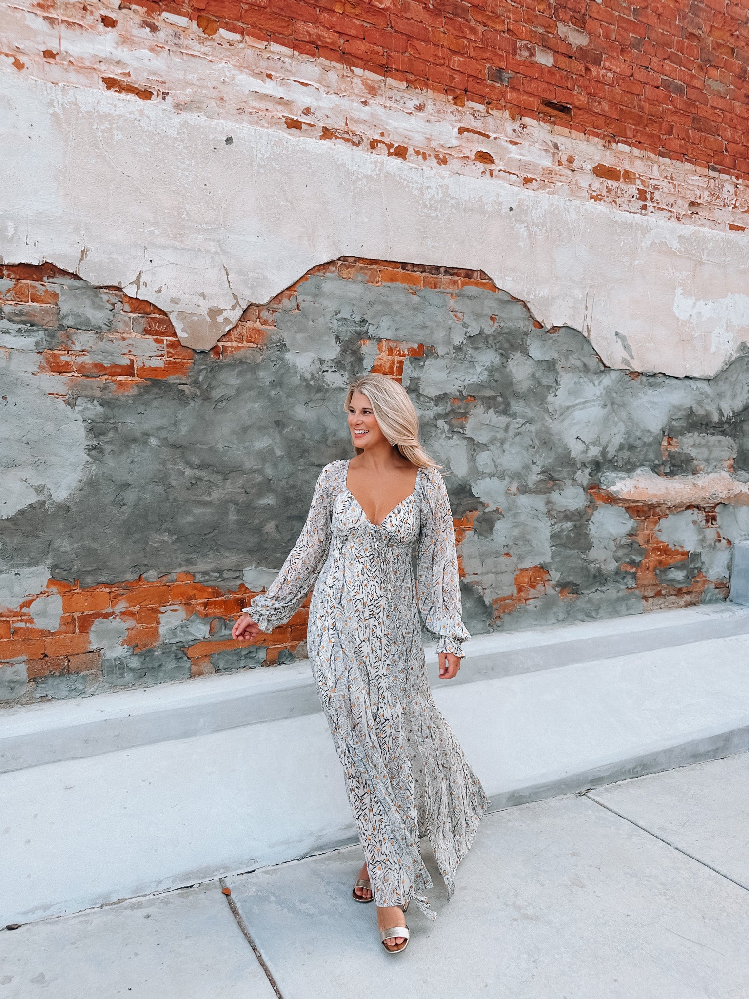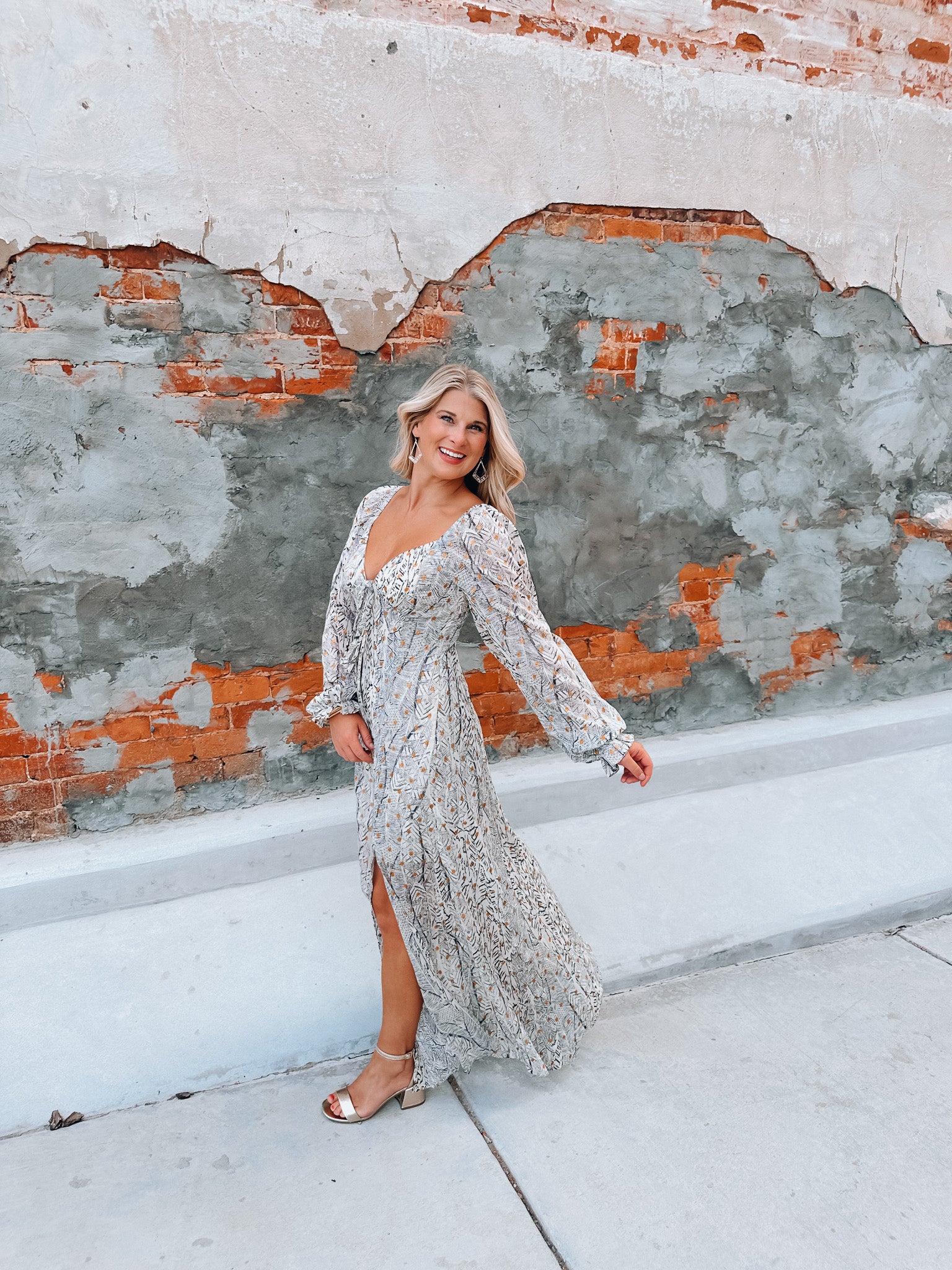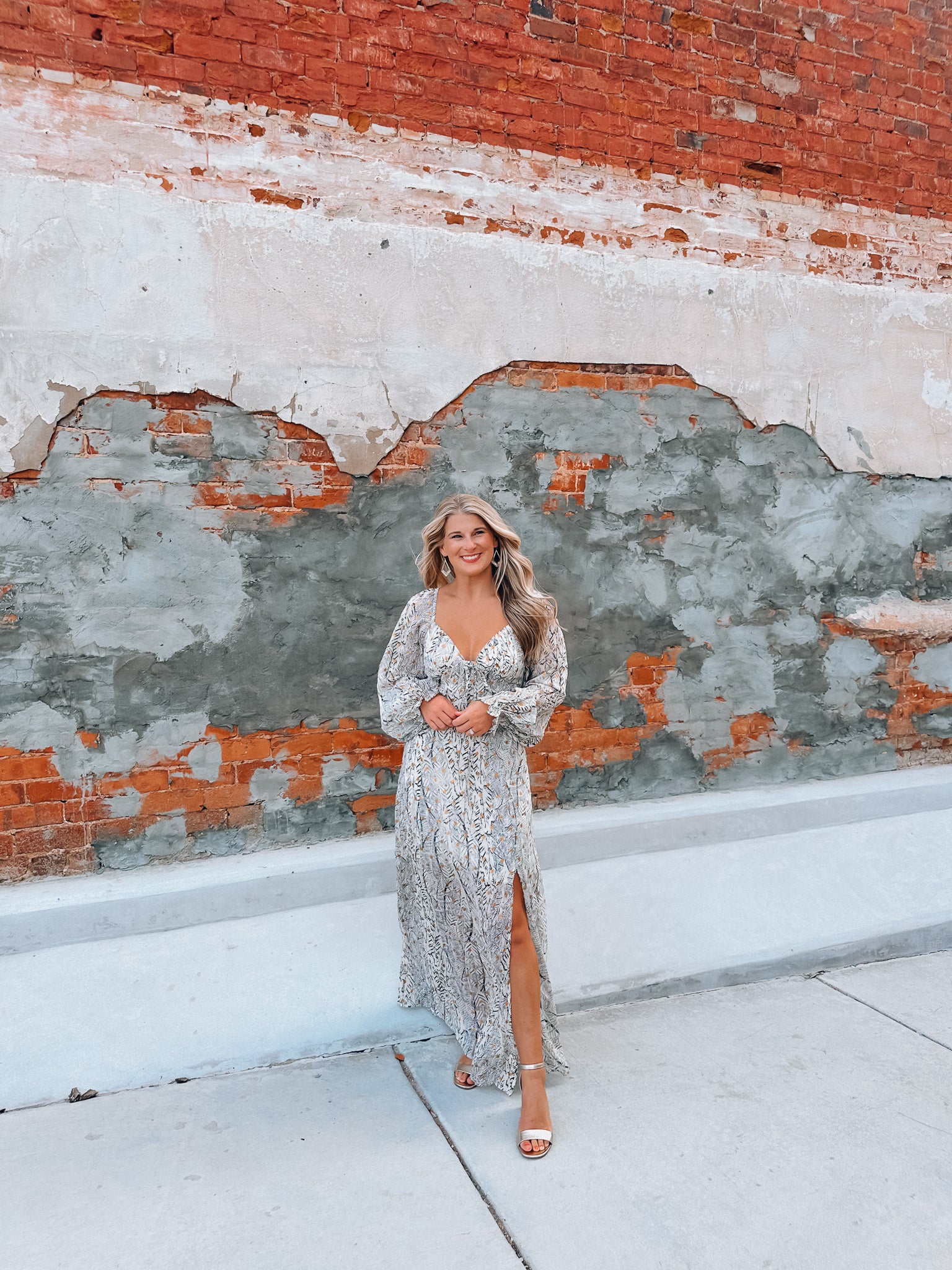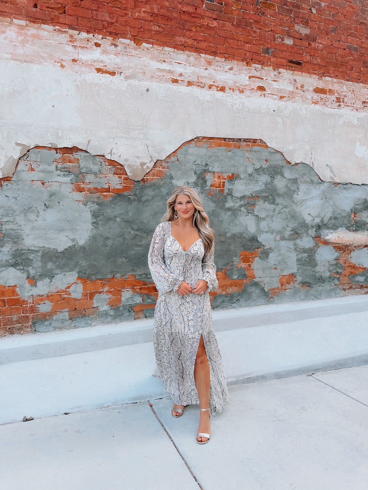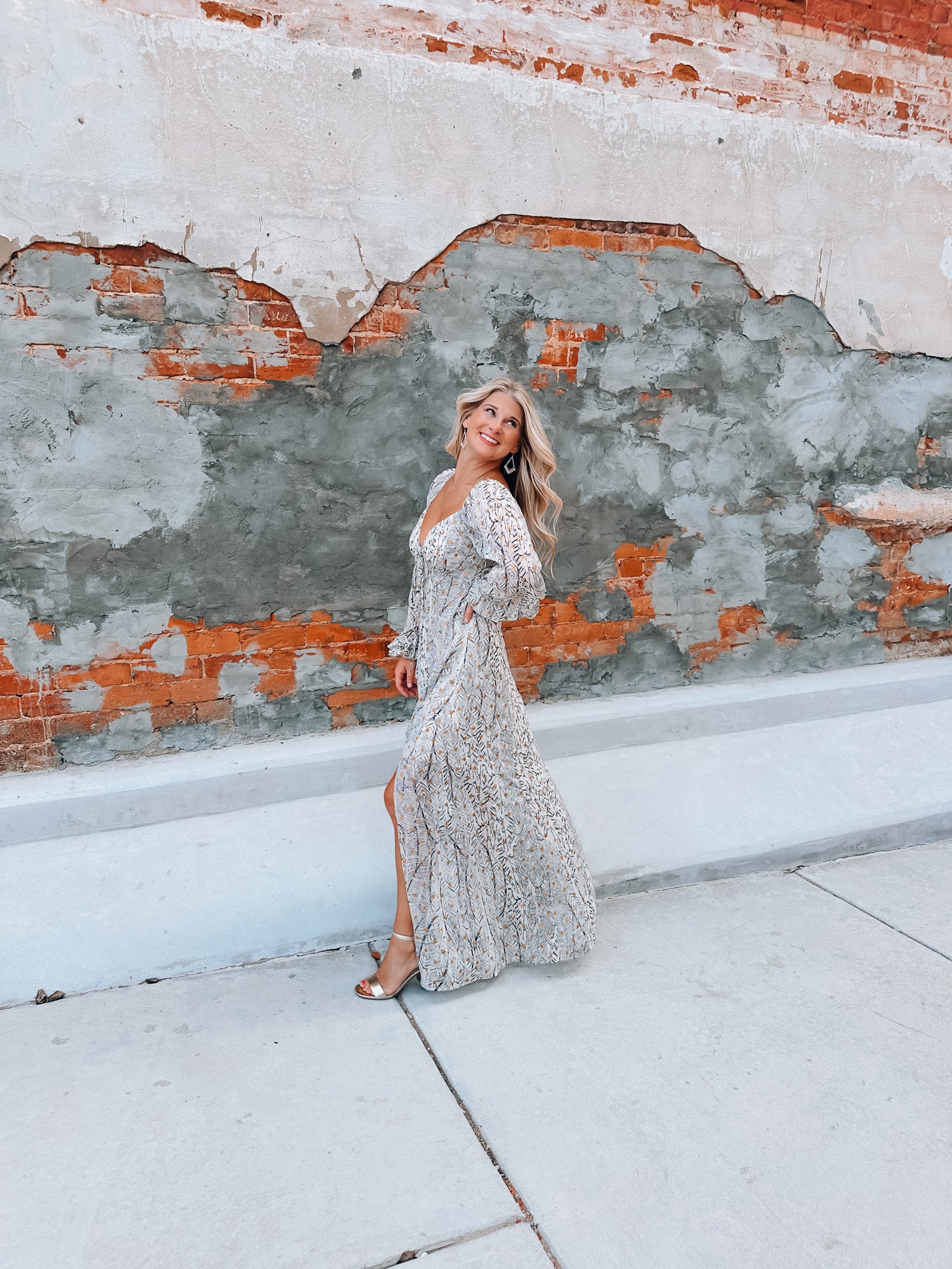 Experience elegance and luxury in our No One Better Maxi Dress! This stunning dress features a sweetheart halter tie, long sleeves with beige and black detailing, and gold embellishments. The dress is long sleeve, lined for comfort and has a sexy side slit. Perfect for any special occasion.