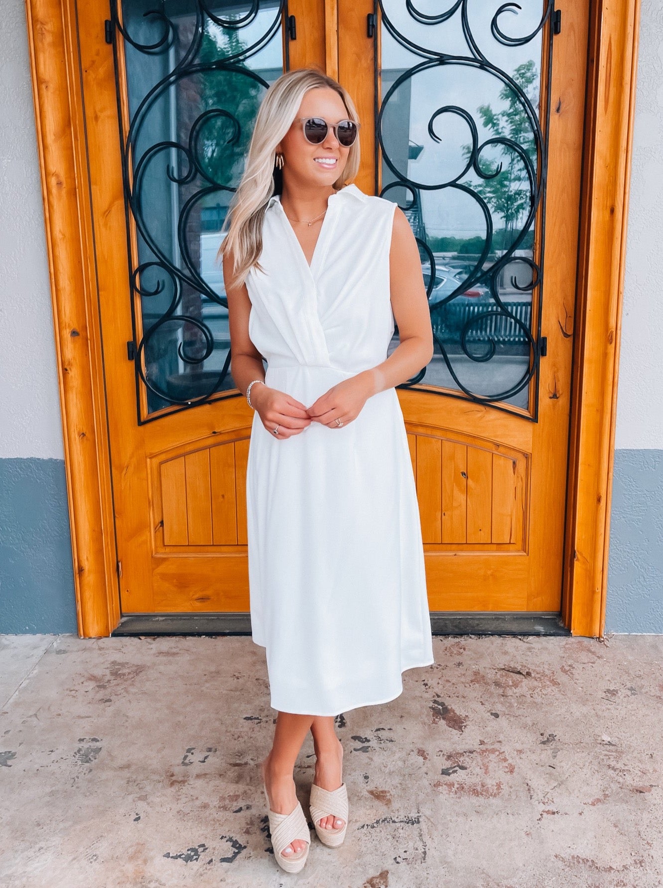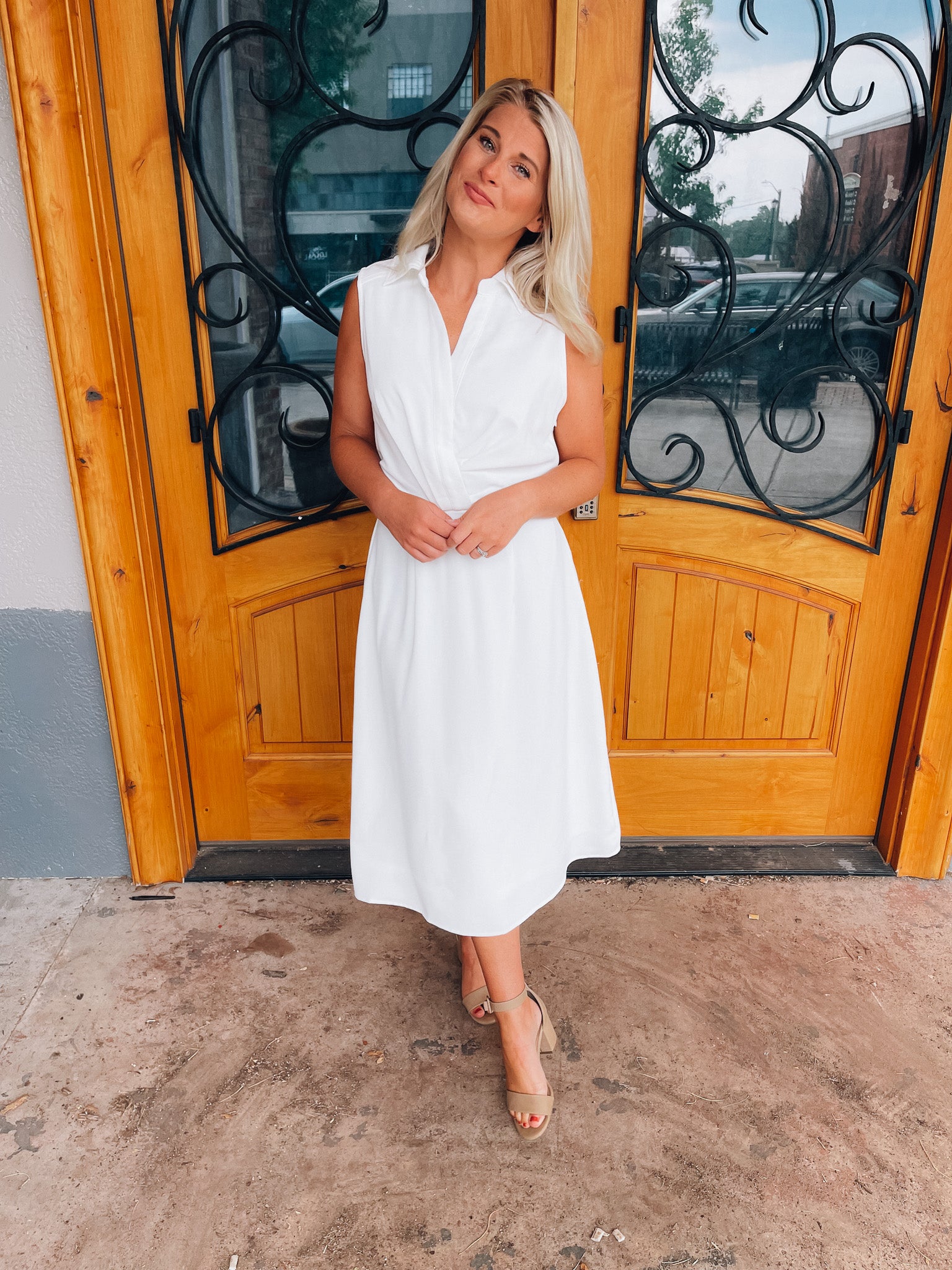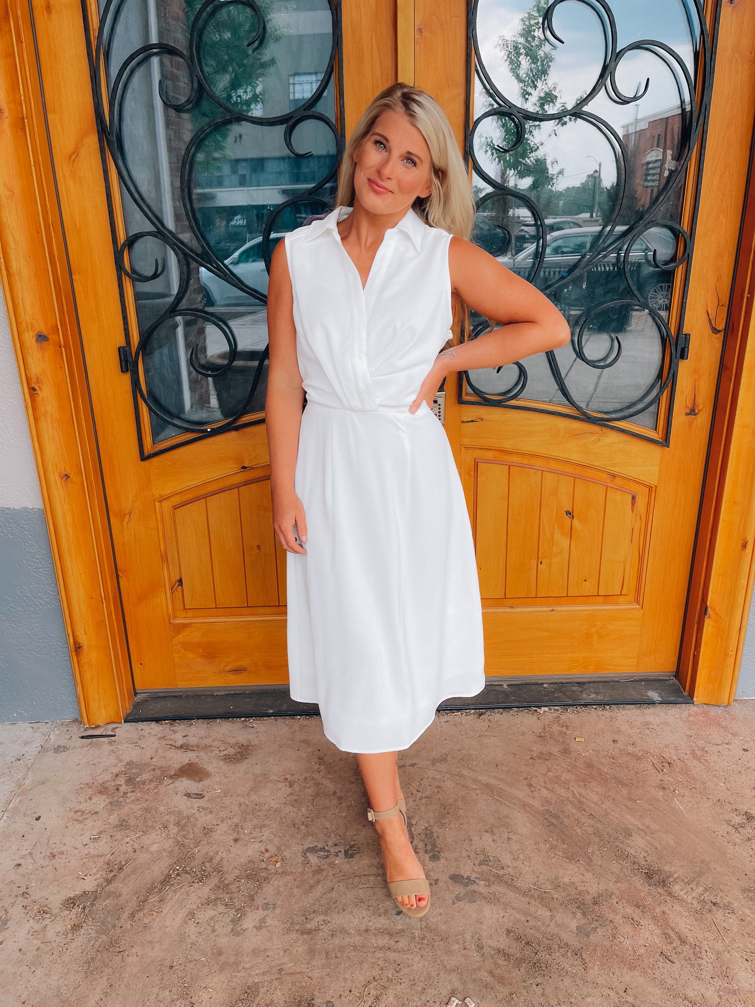 Look no further than the Peaceful Love Midi Dress for the perfect bridal outfit! With its sleek white construction, sleeveless design, V-neckline, and elastic waist band, this collared midi dress is a fan favorite. Make it yours and make 'em swoon!