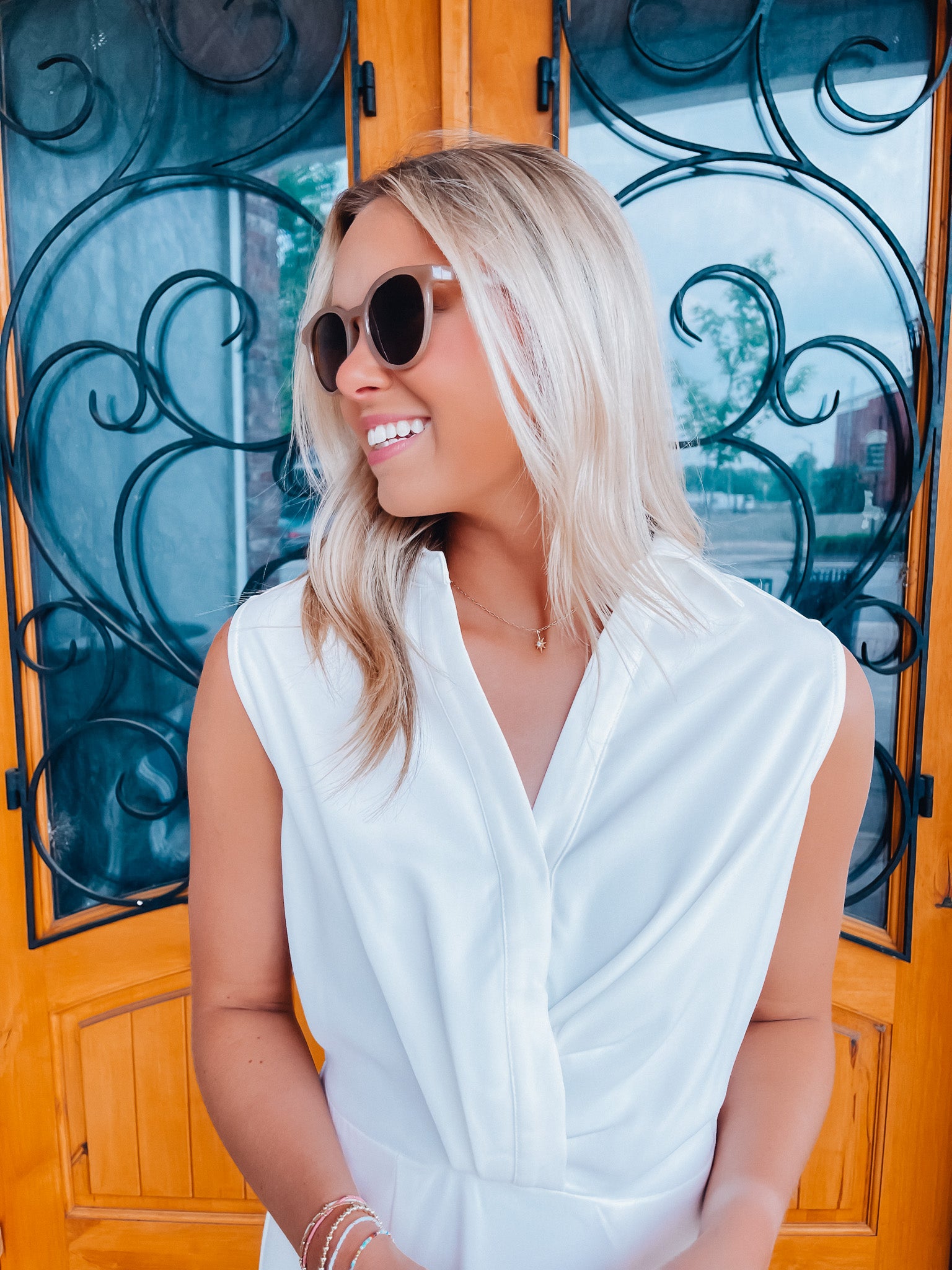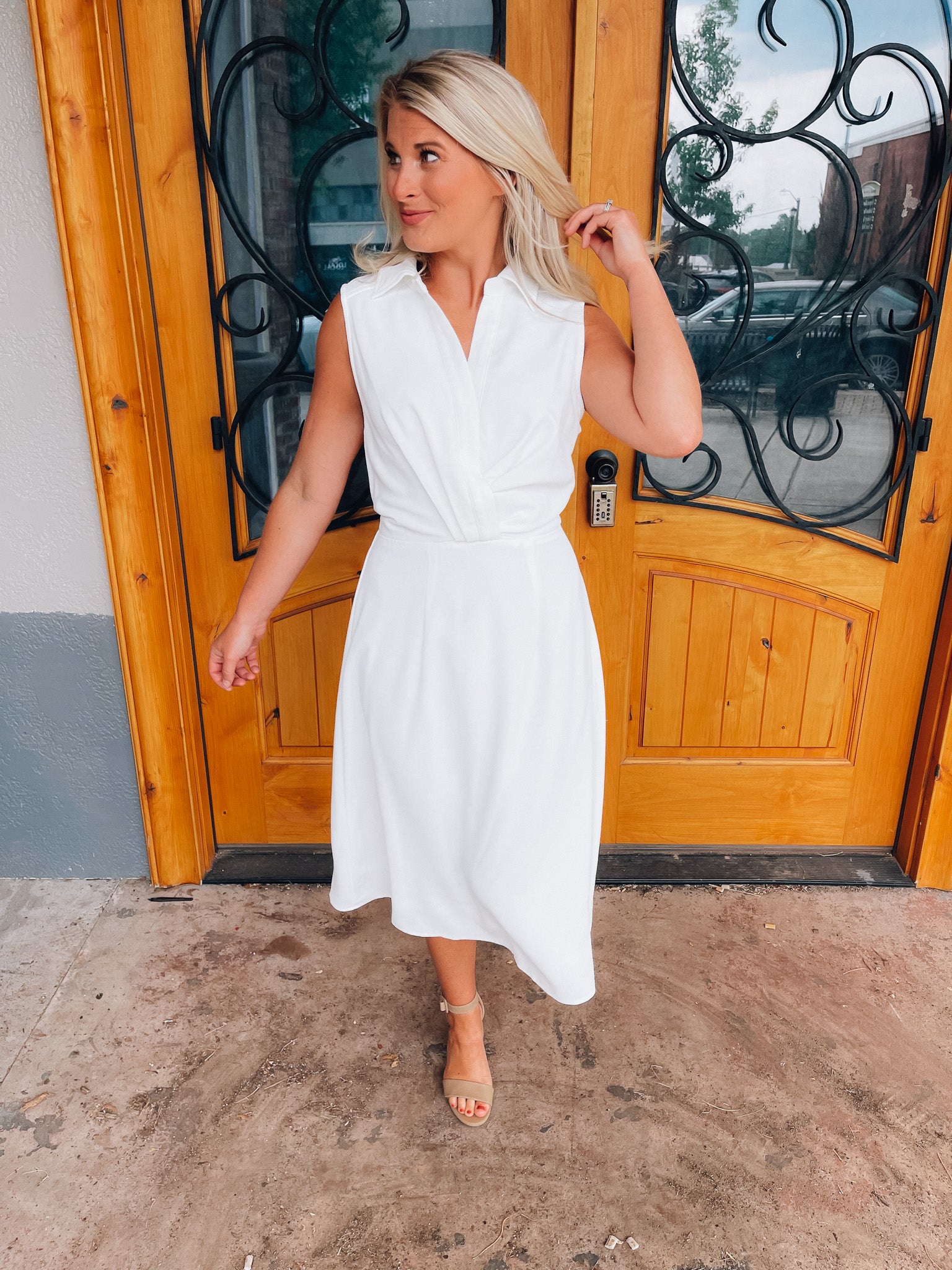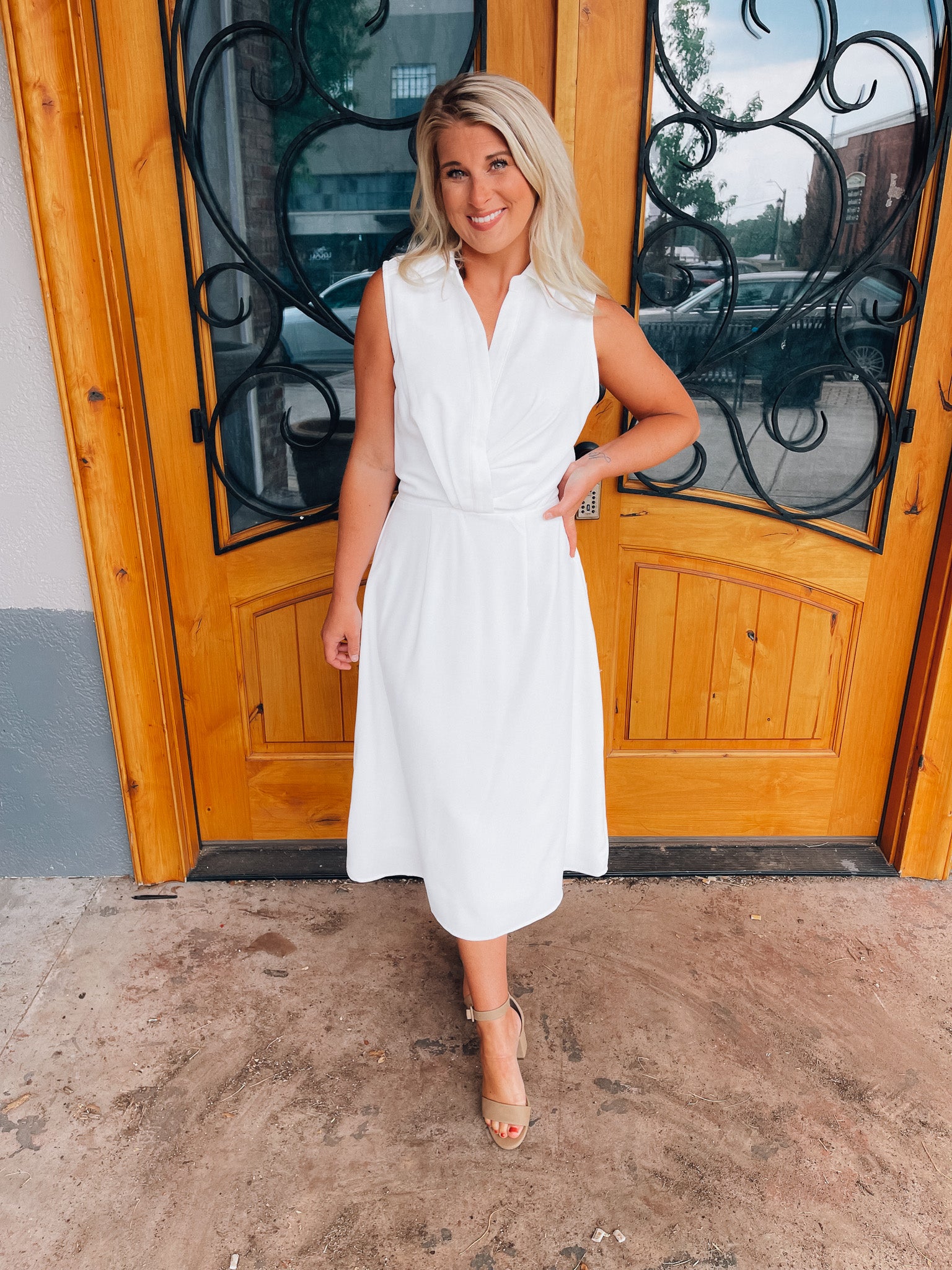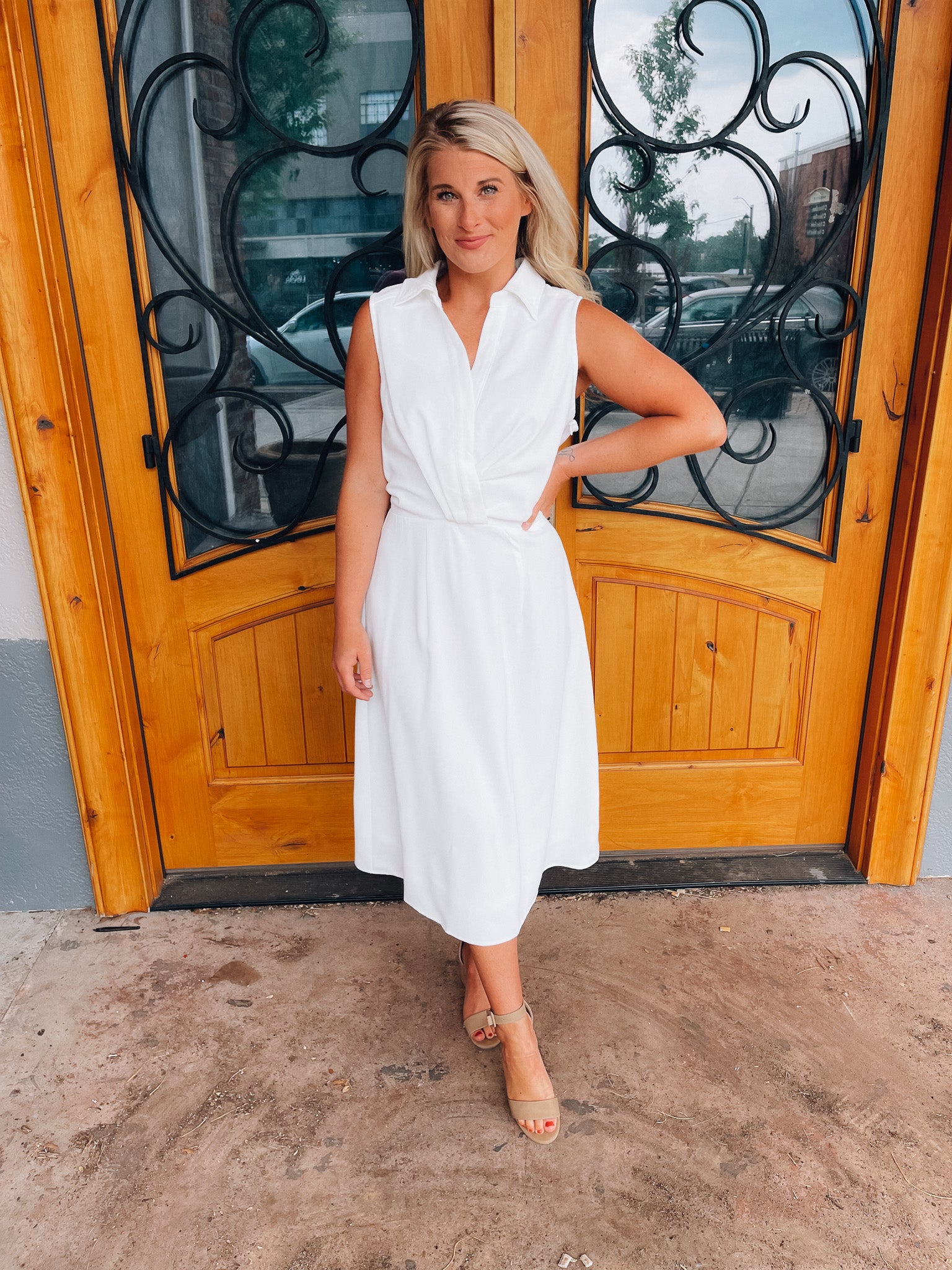 Look no further than the Peaceful Love Midi Dress for the perfect bridal outfit! With its sleek white construction, sleeveless design, V-neckline, and elastic waist band, this collared midi dress is a fan favorite. Make it yours and make 'em swoon!