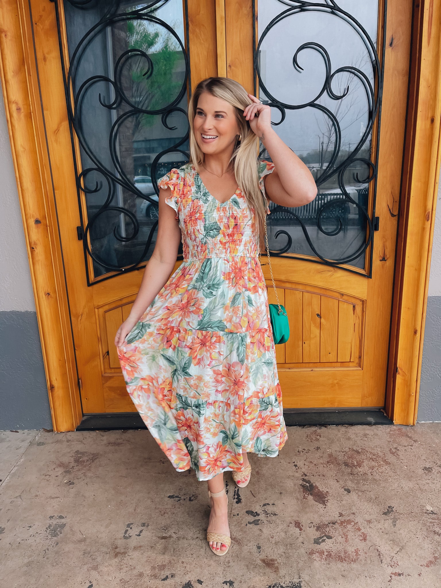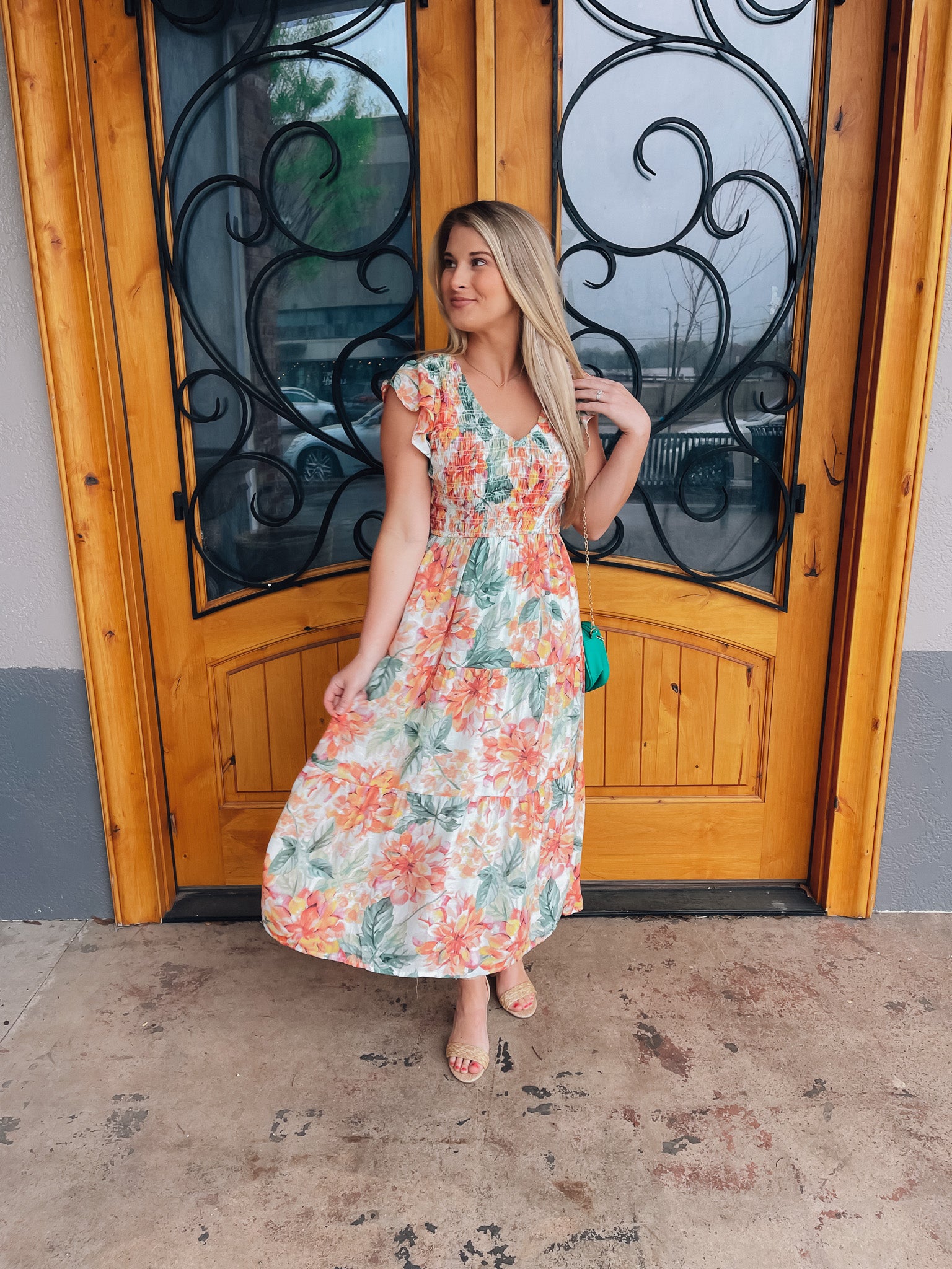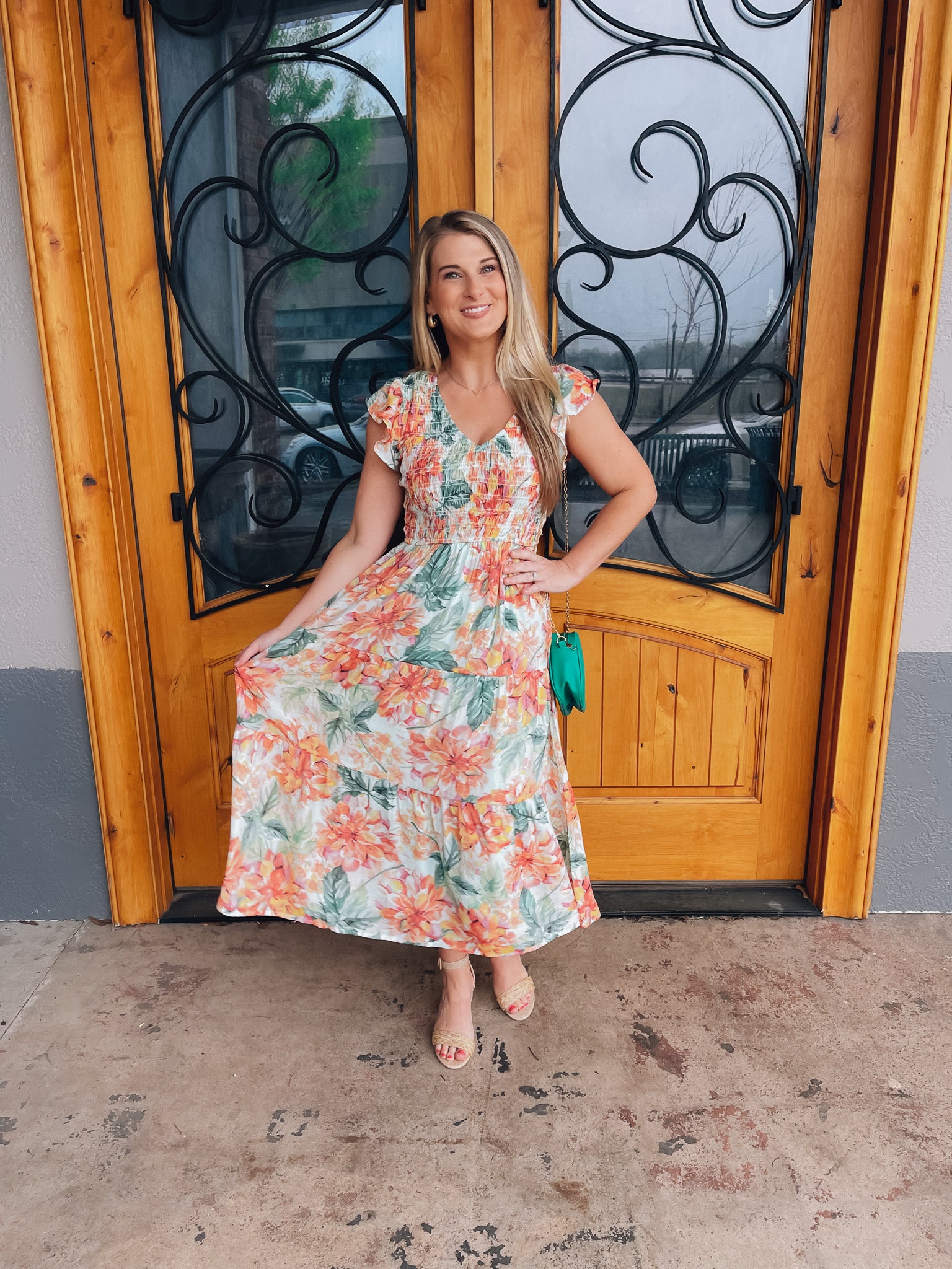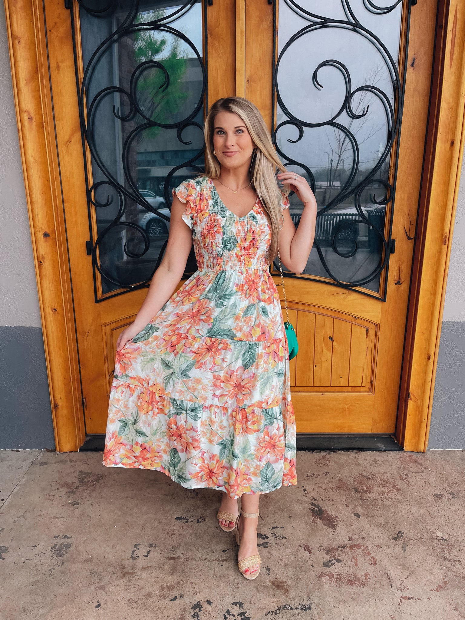 Indulge in the perfect springtime look with our Perfect Bouquet Midi Dress. The smocked v neck and beautiful floral print with mint background make this midi dress a must-have for any occasion. Embrace the feminine and elegant feel of this dress and turn heads wherever you go!