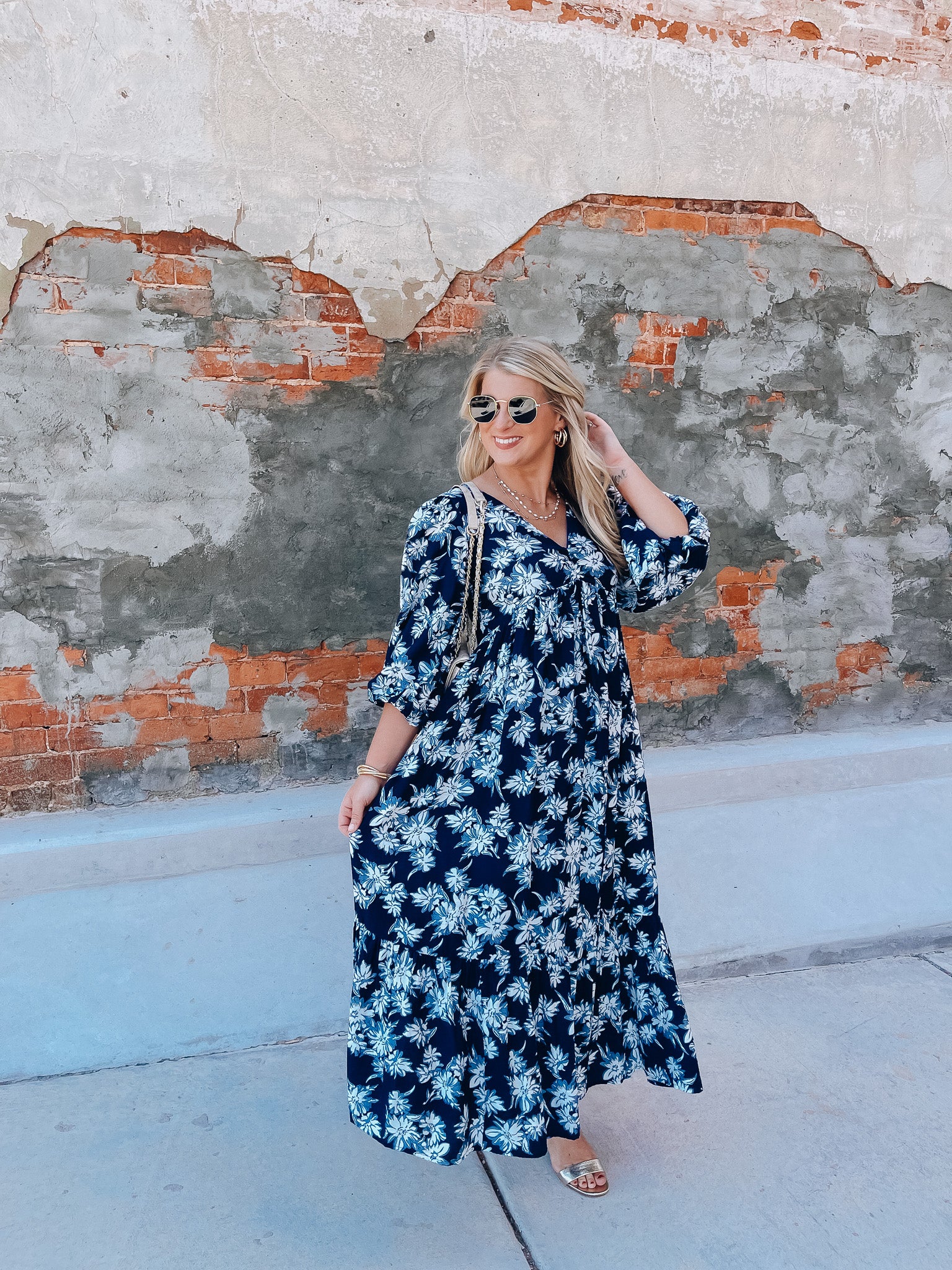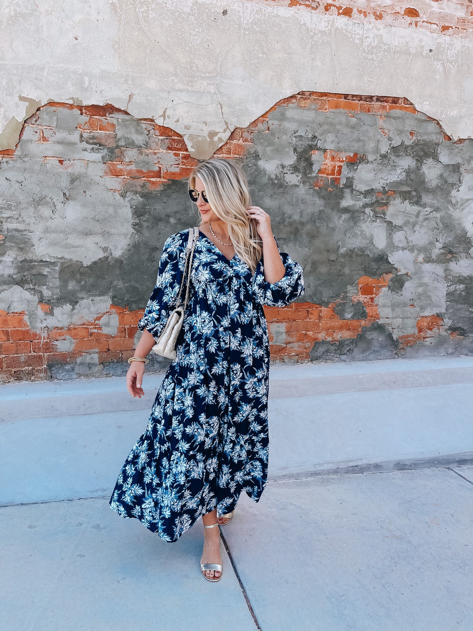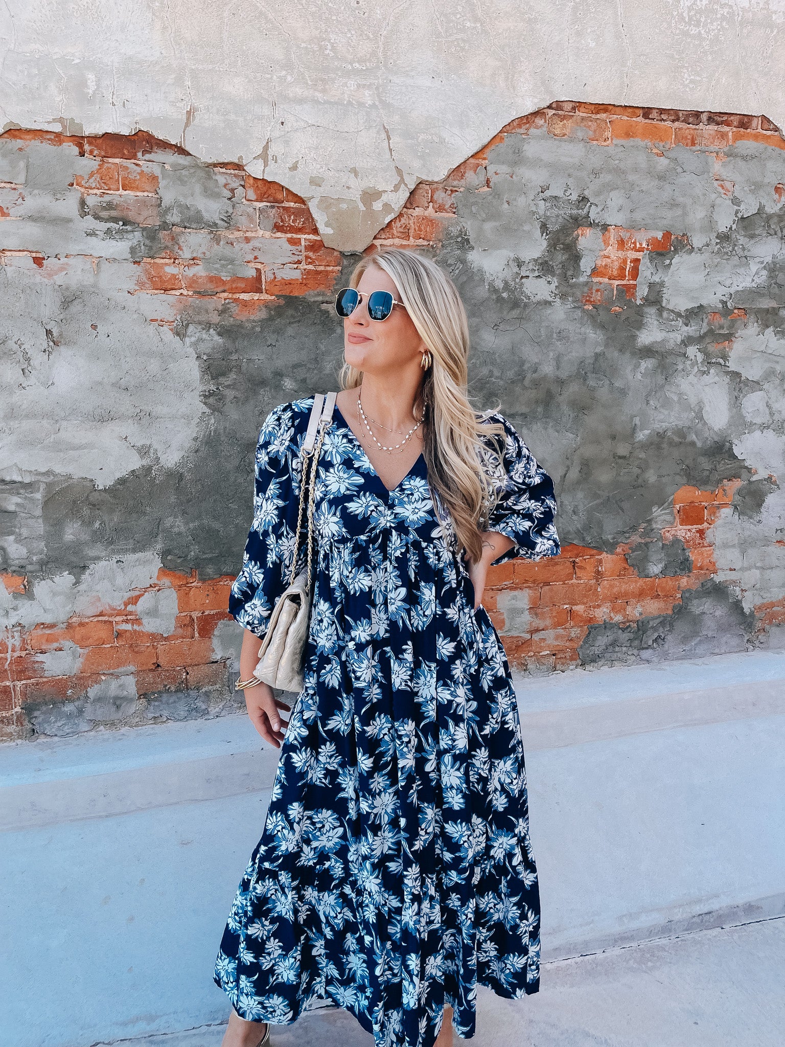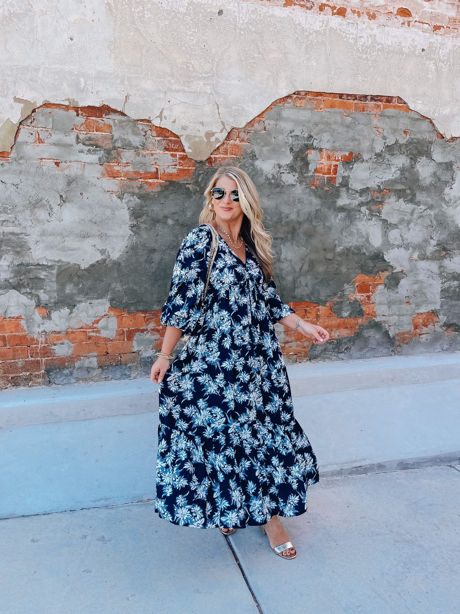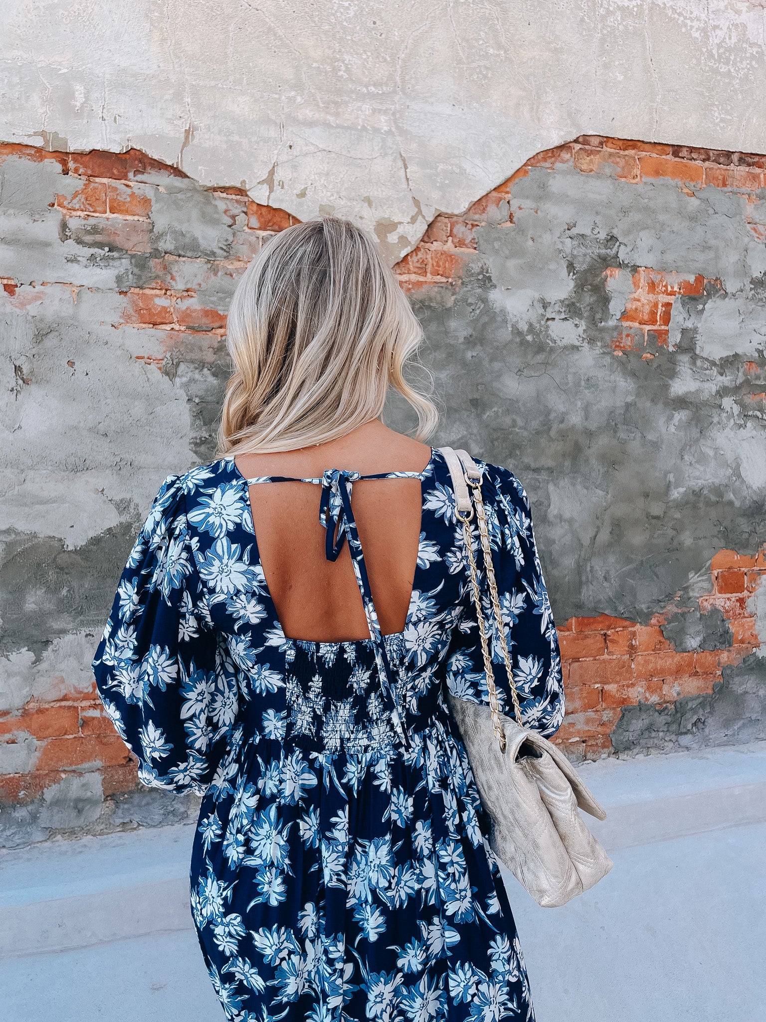 Embrace the charm of this midi dress! Featuring a v-neck, smocked back, and tie detail, this floral dress exudes effortless elegance. With navy, white, and blue floral details, it's perfect for any occasion. Its long sleeves add a touch of sophistication while keeping you comfortable.