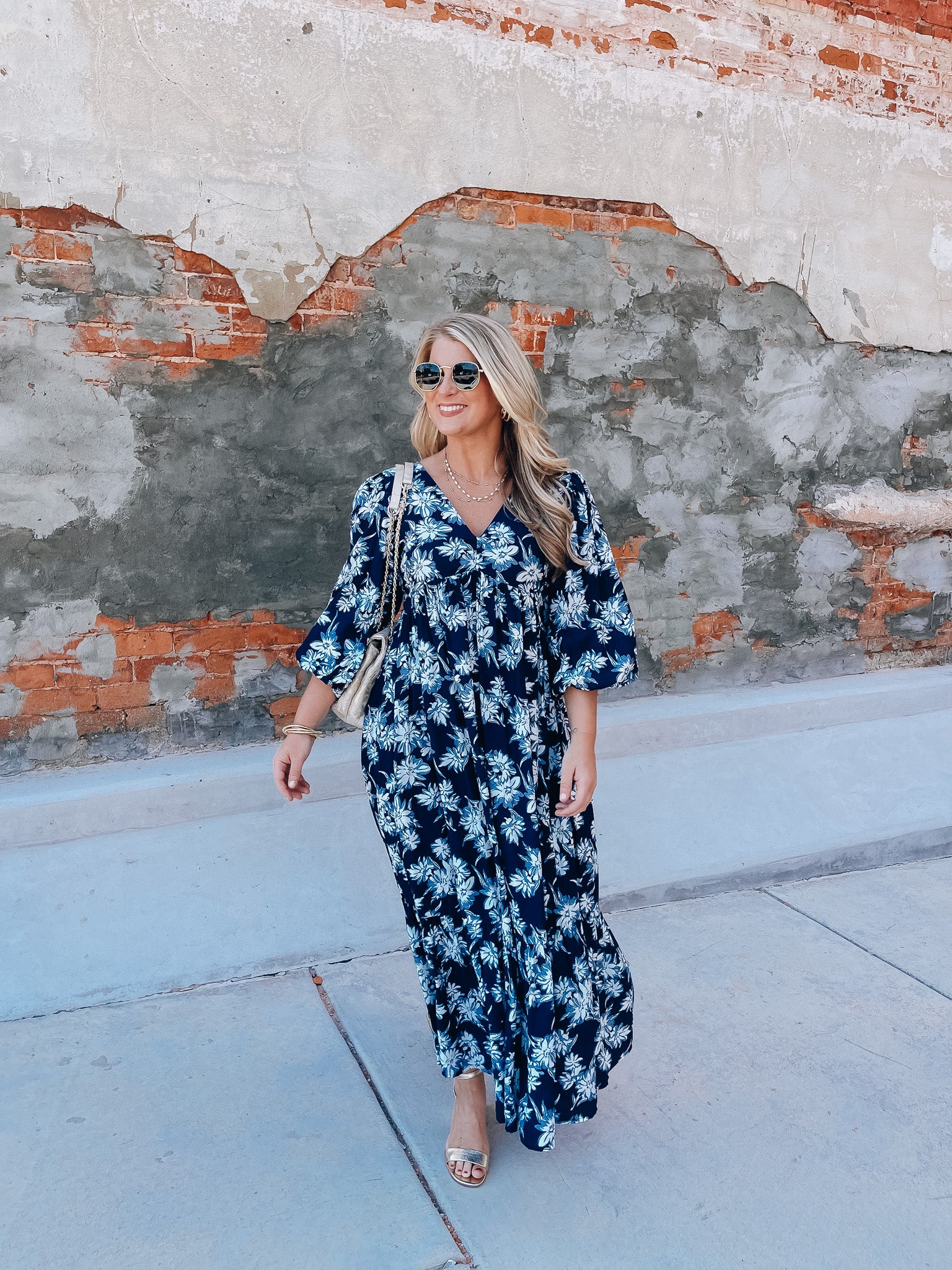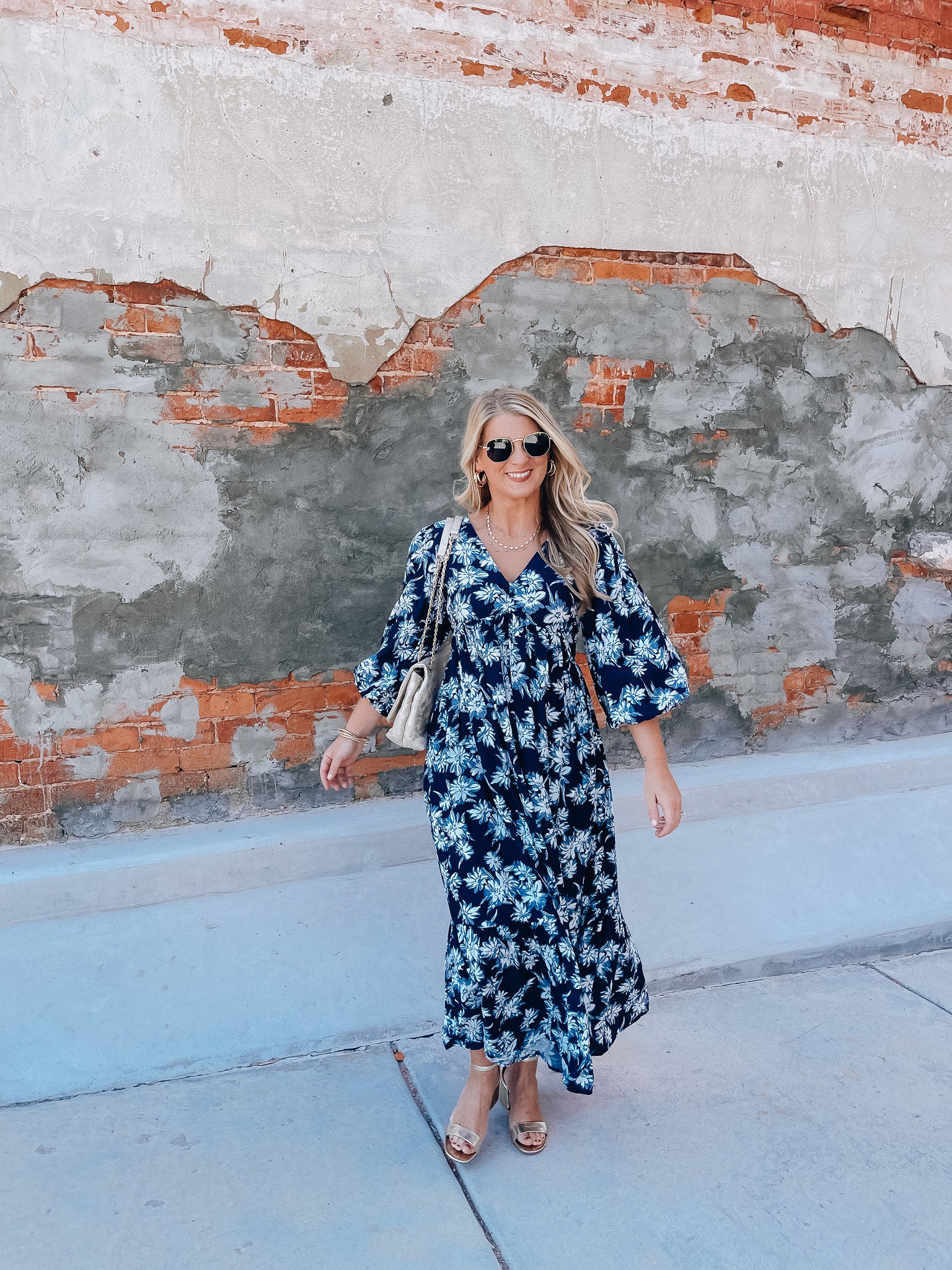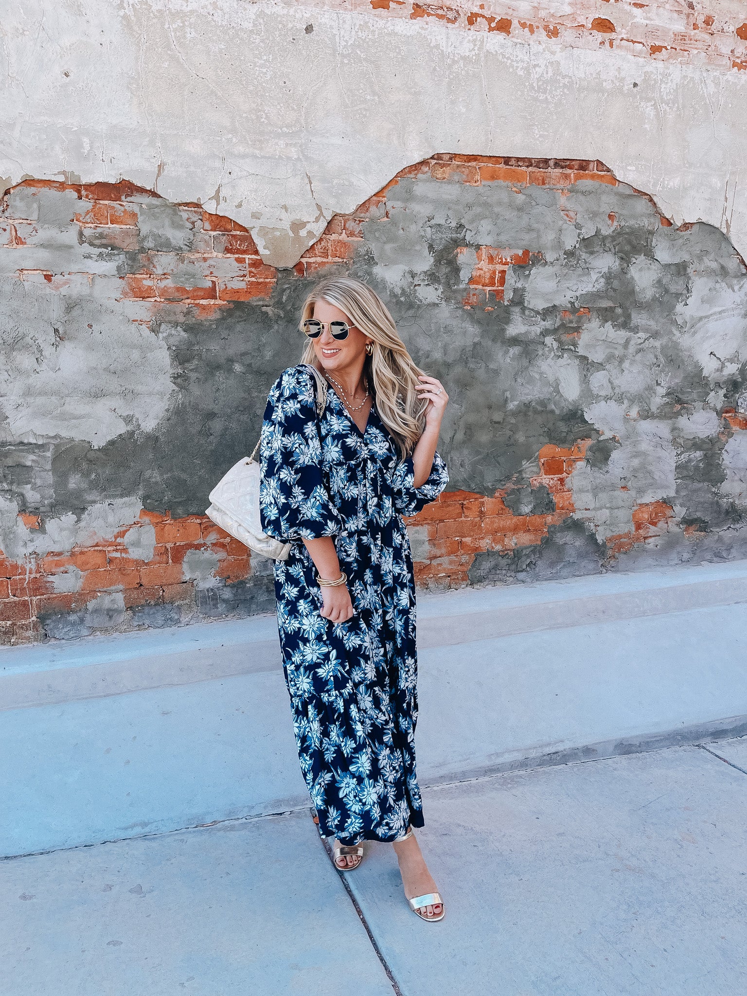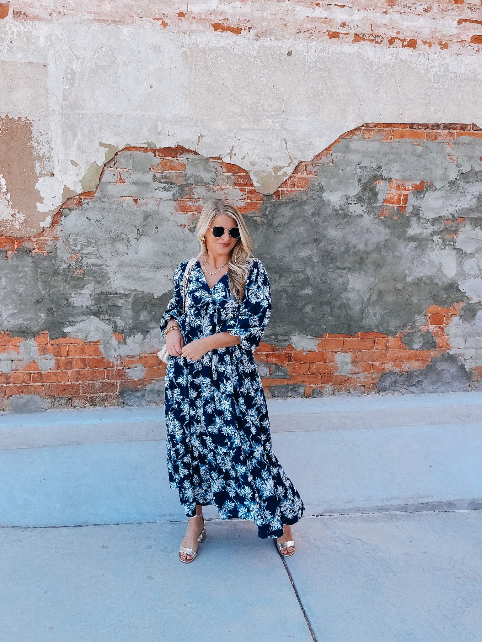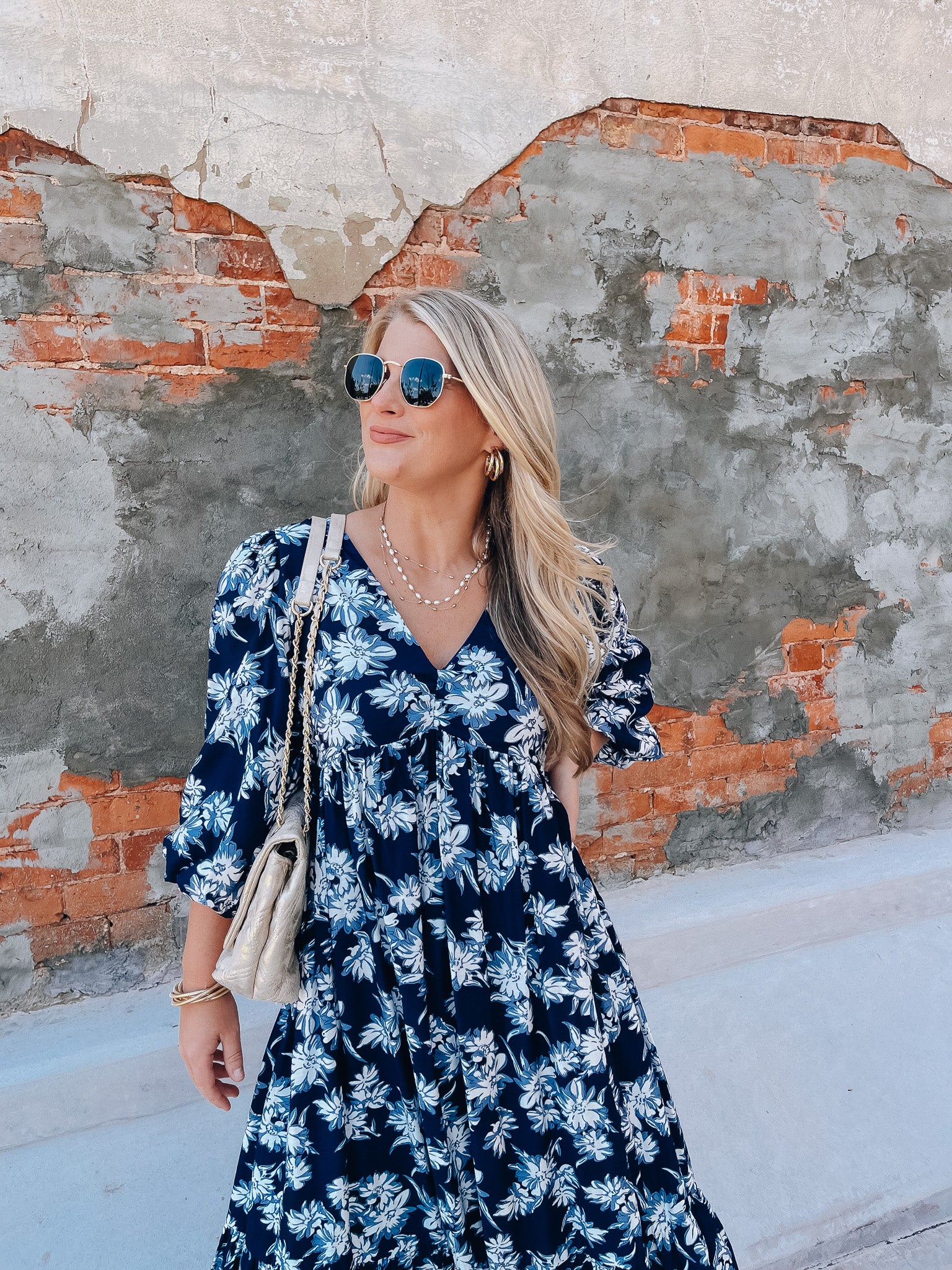 Embrace the charm of this midi dress! Featuring a v-neck, smocked back, and tie detail, this floral dress exudes effortless elegance. With navy, white, and blue floral details, it's perfect for any occasion. Its long sleeves add a touch of sophistication while keeping you comfortable.