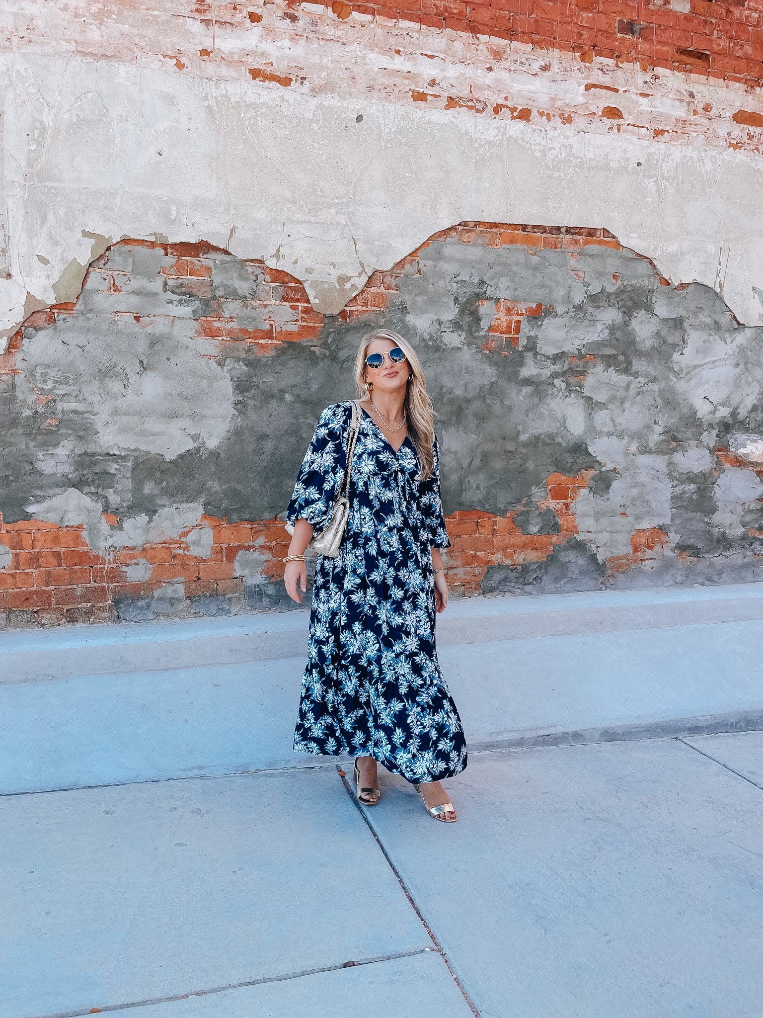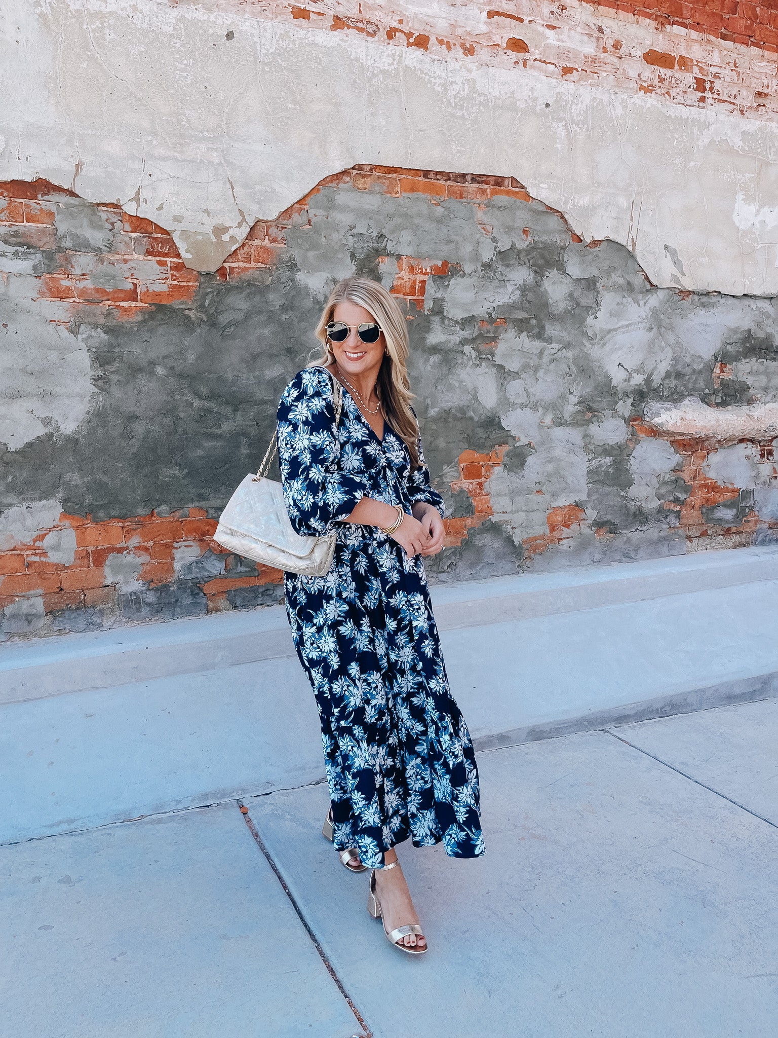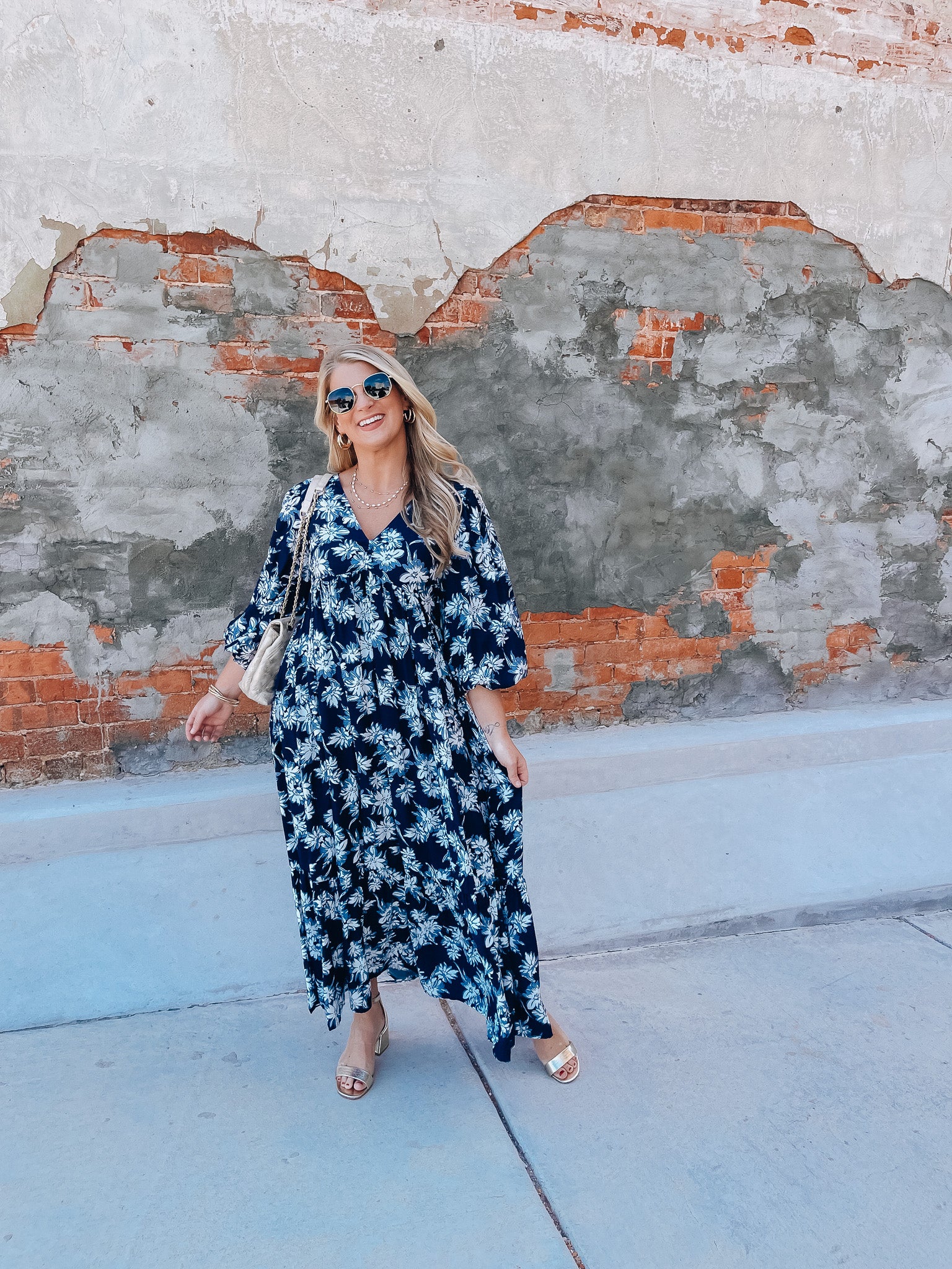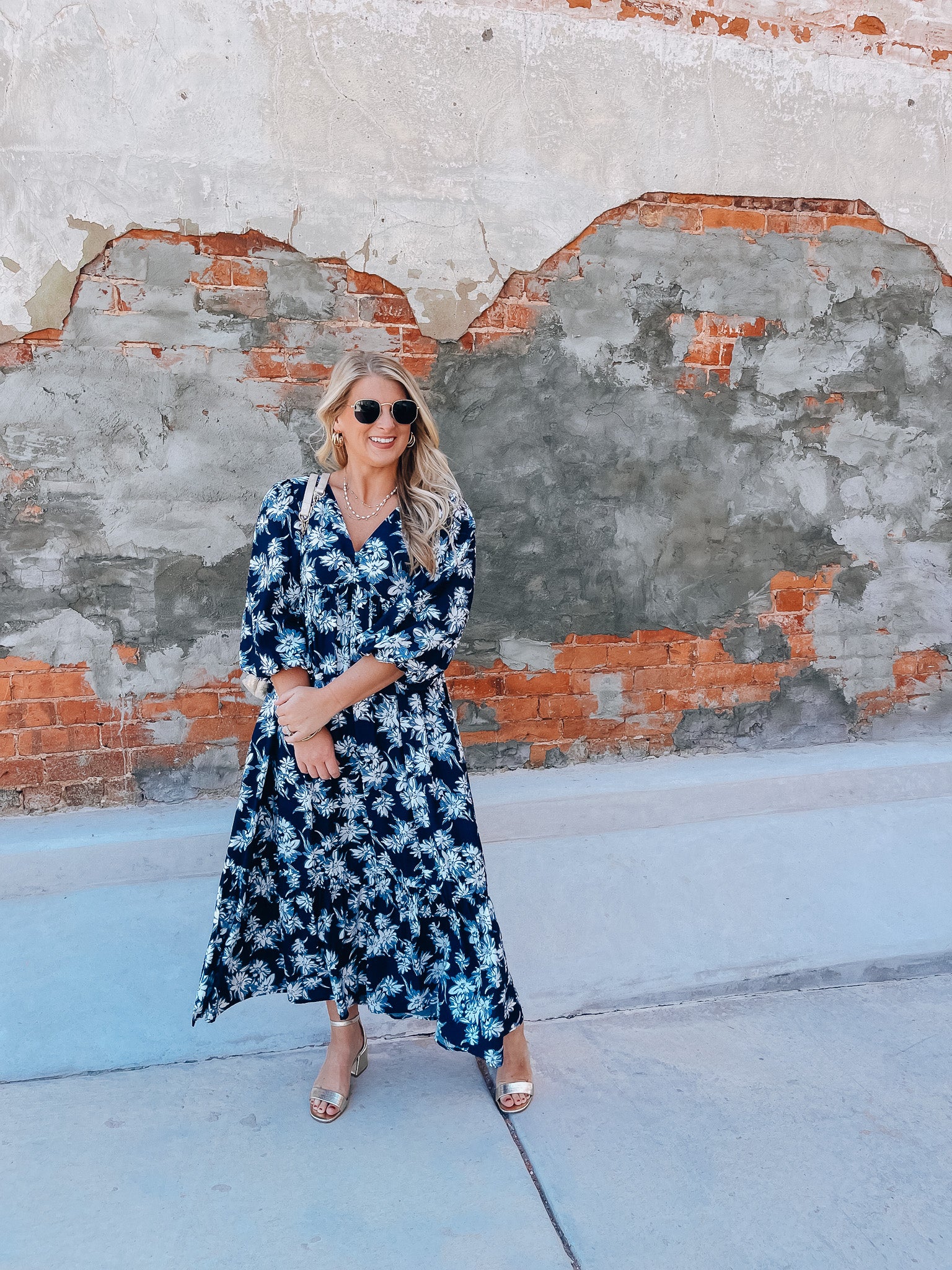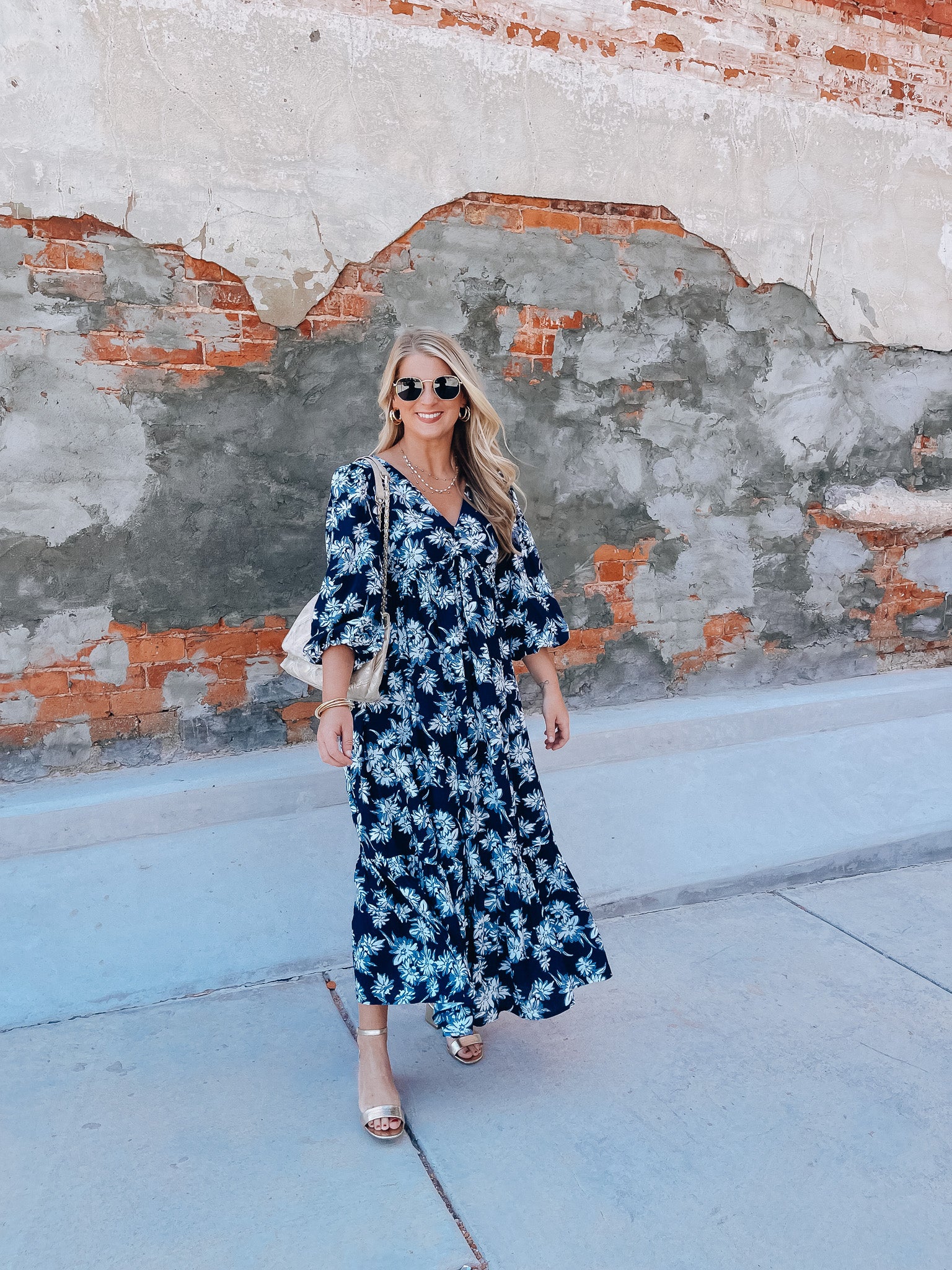 Embrace the charm of this midi dress! Featuring a v-neck, smocked back, and tie detail, this floral dress exudes effortless elegance. With navy, white, and blue floral details, it's perfect for any occasion. Its long sleeves add a touch of sophistication while keeping you comfortable.