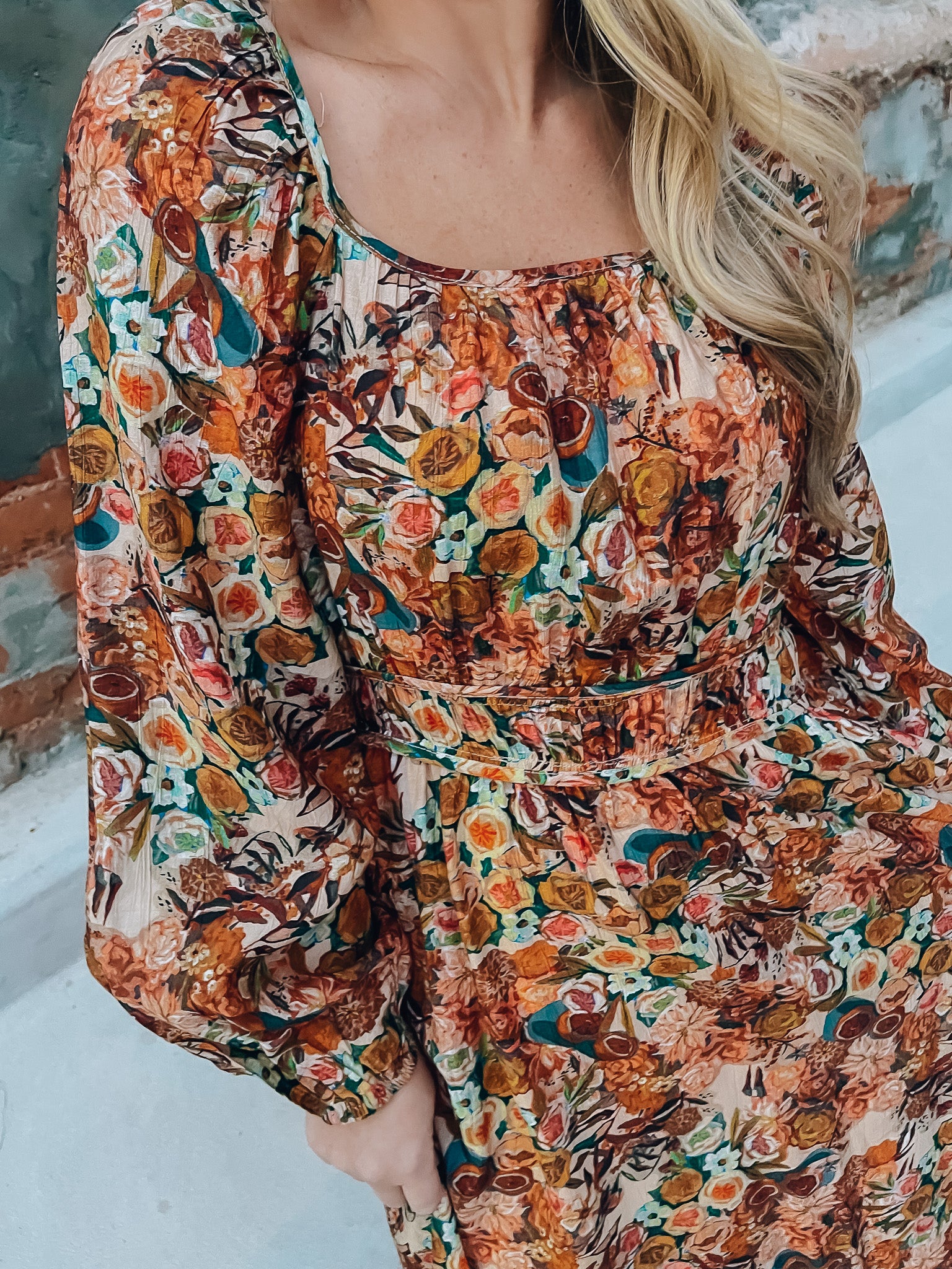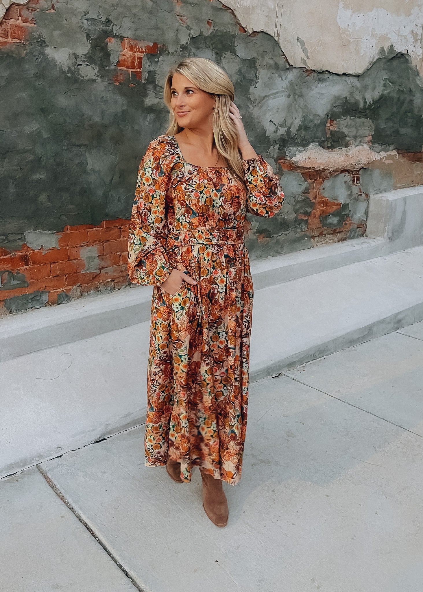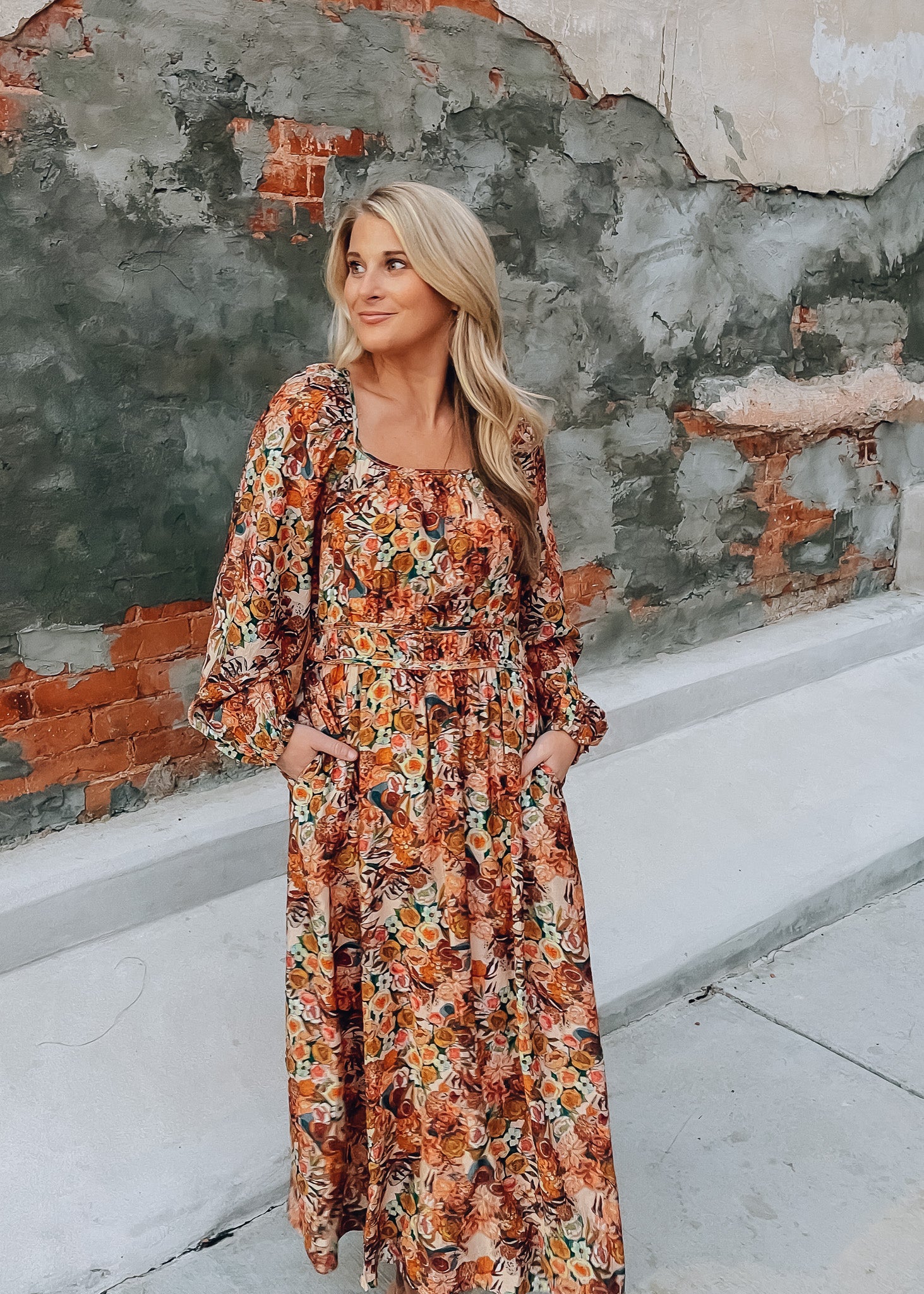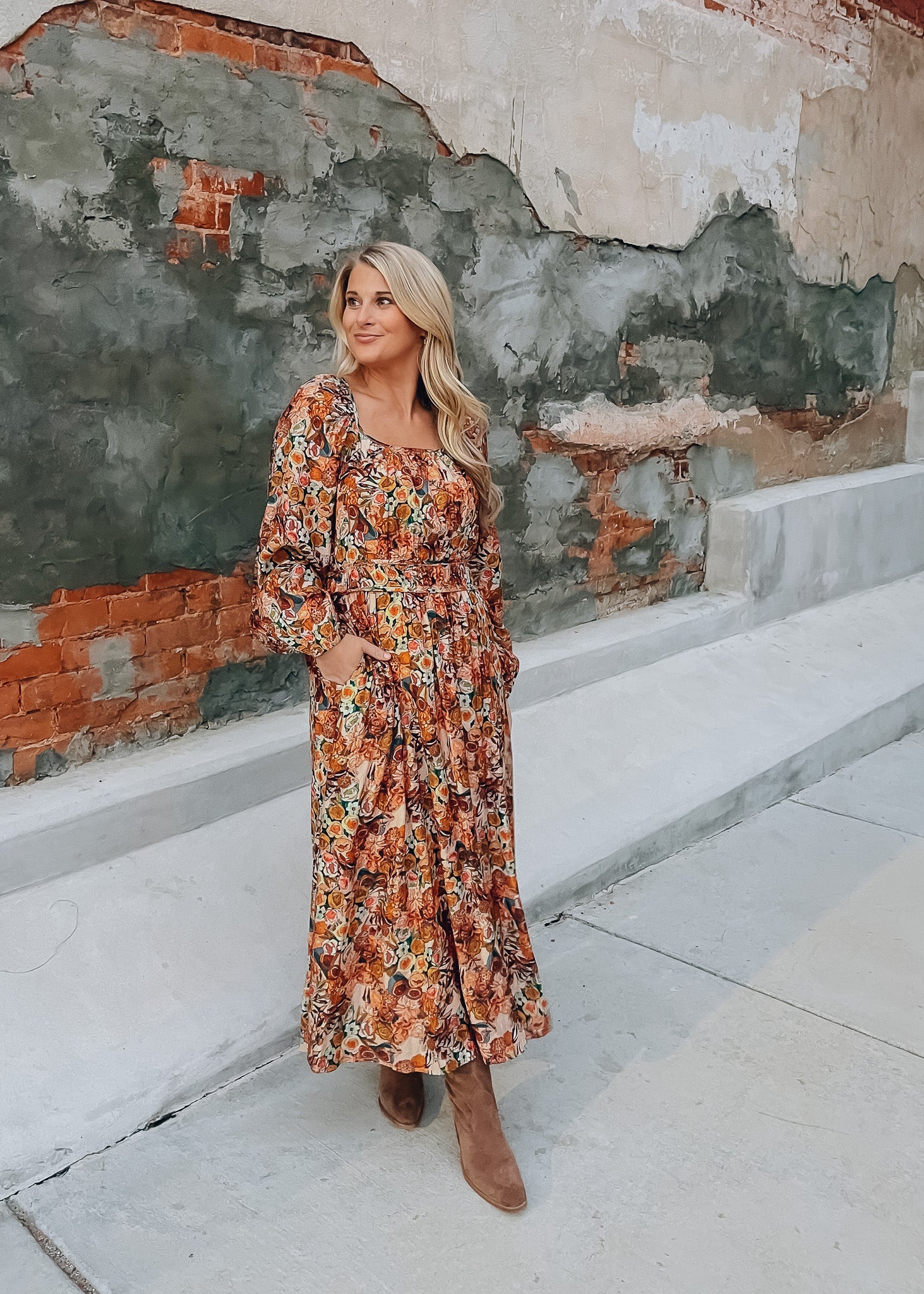 Be the epitome of elegance and style with our Radiant Blossoms Maxi Dress. The beautiful floral and fruit design on a taupe background, adorned with shades of green, yellow, blue, and pink, will make you stand out from the crowd. With a square neck, long sleeves, and pockets, stay comfortable and chic all day long.