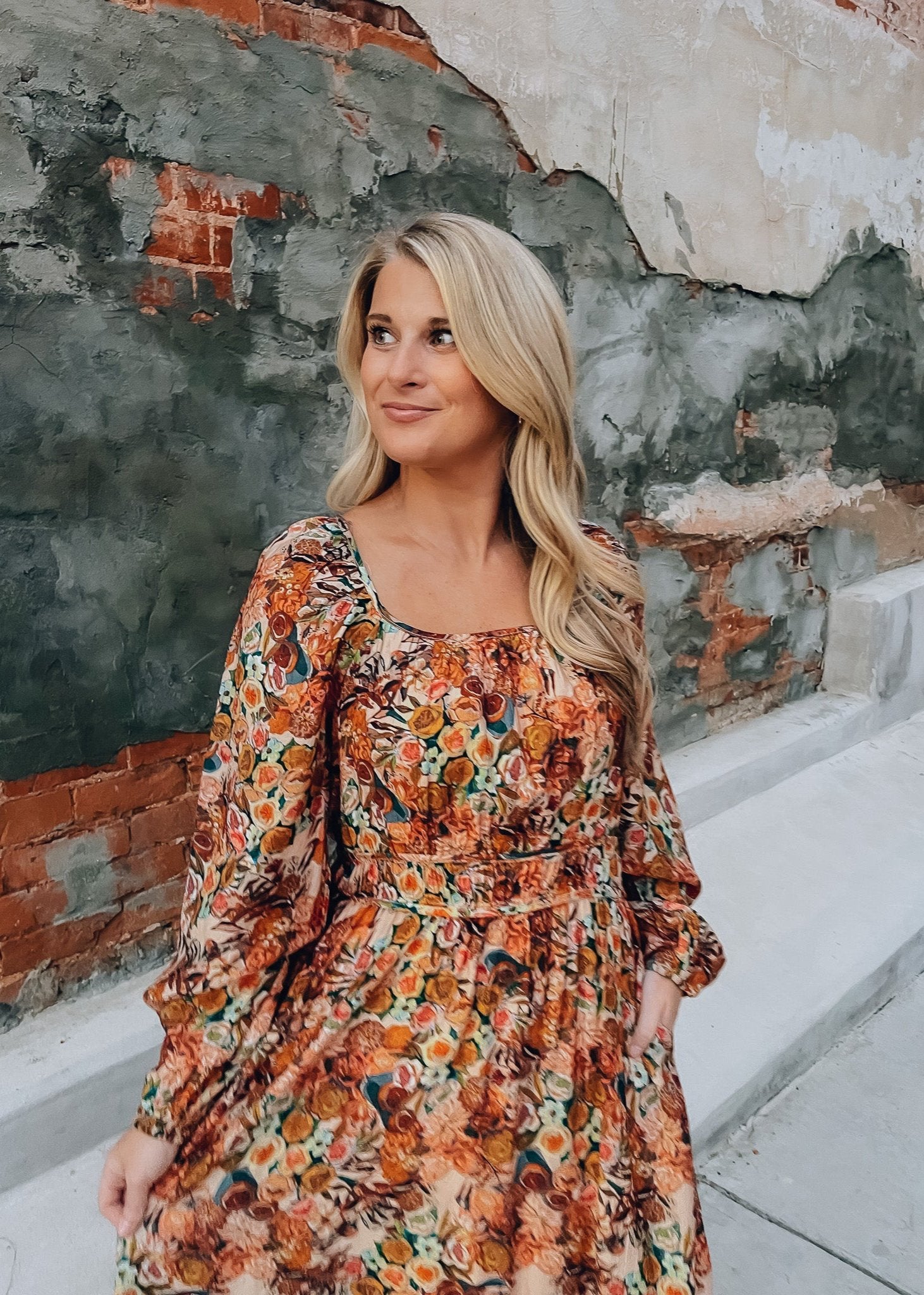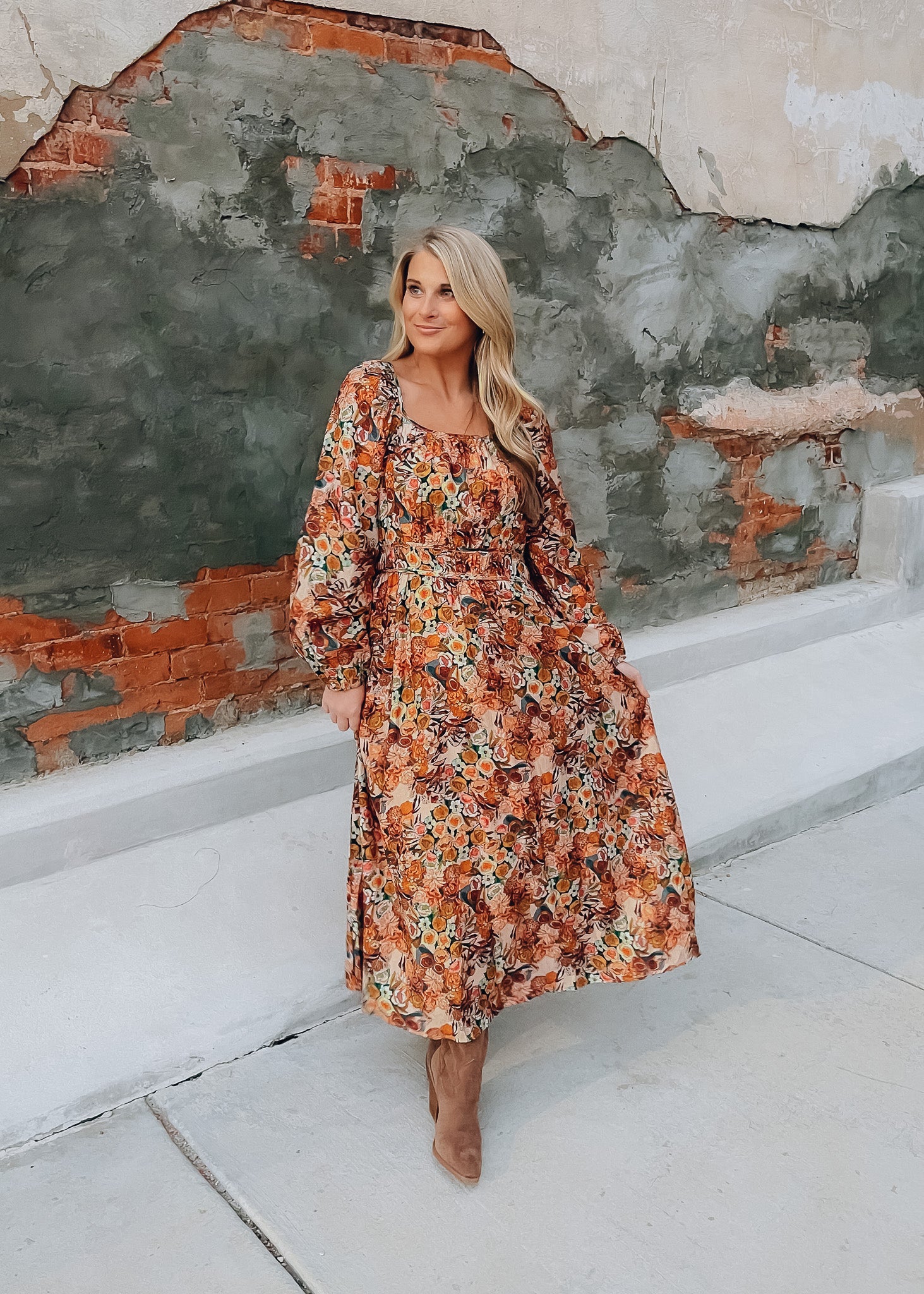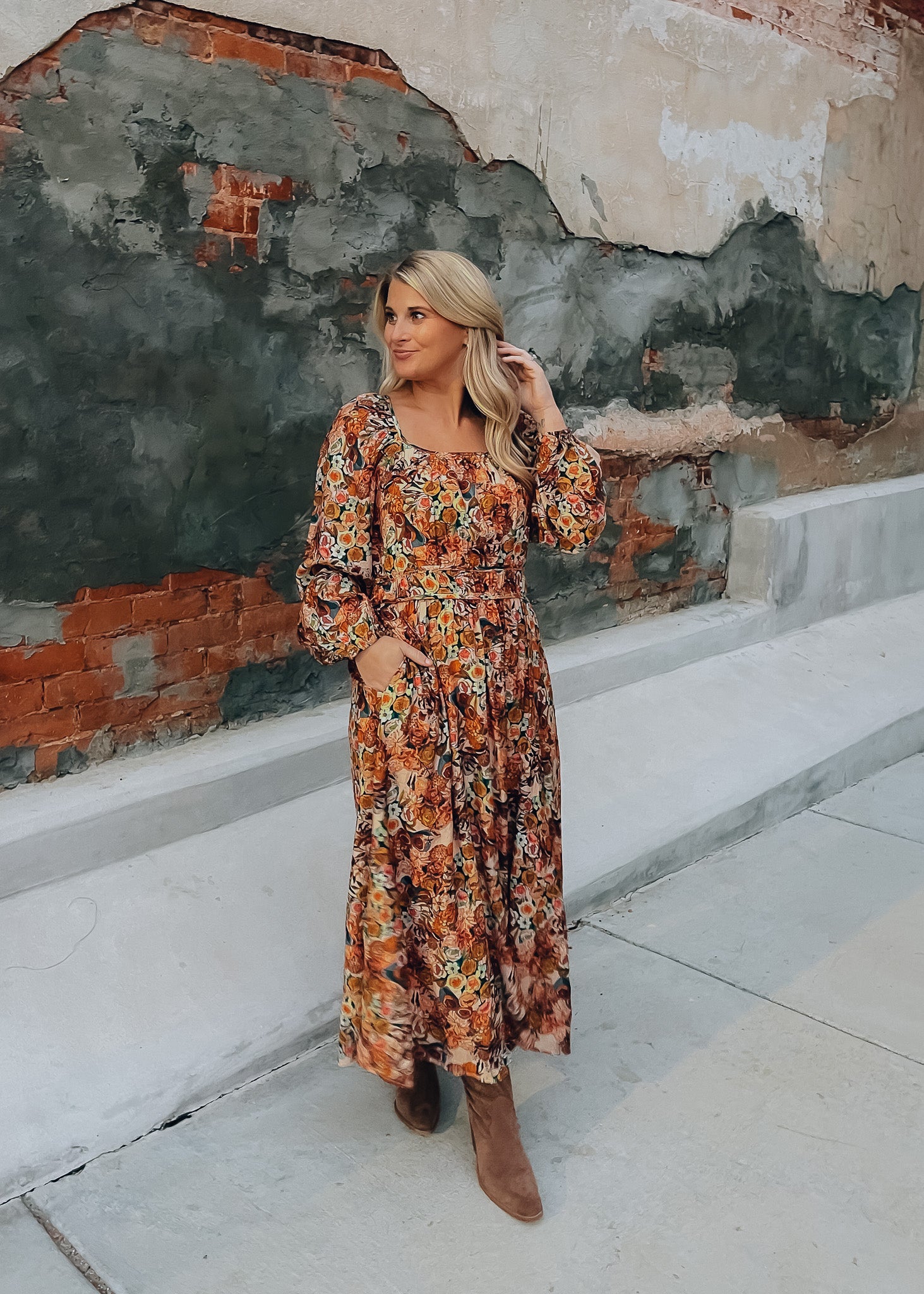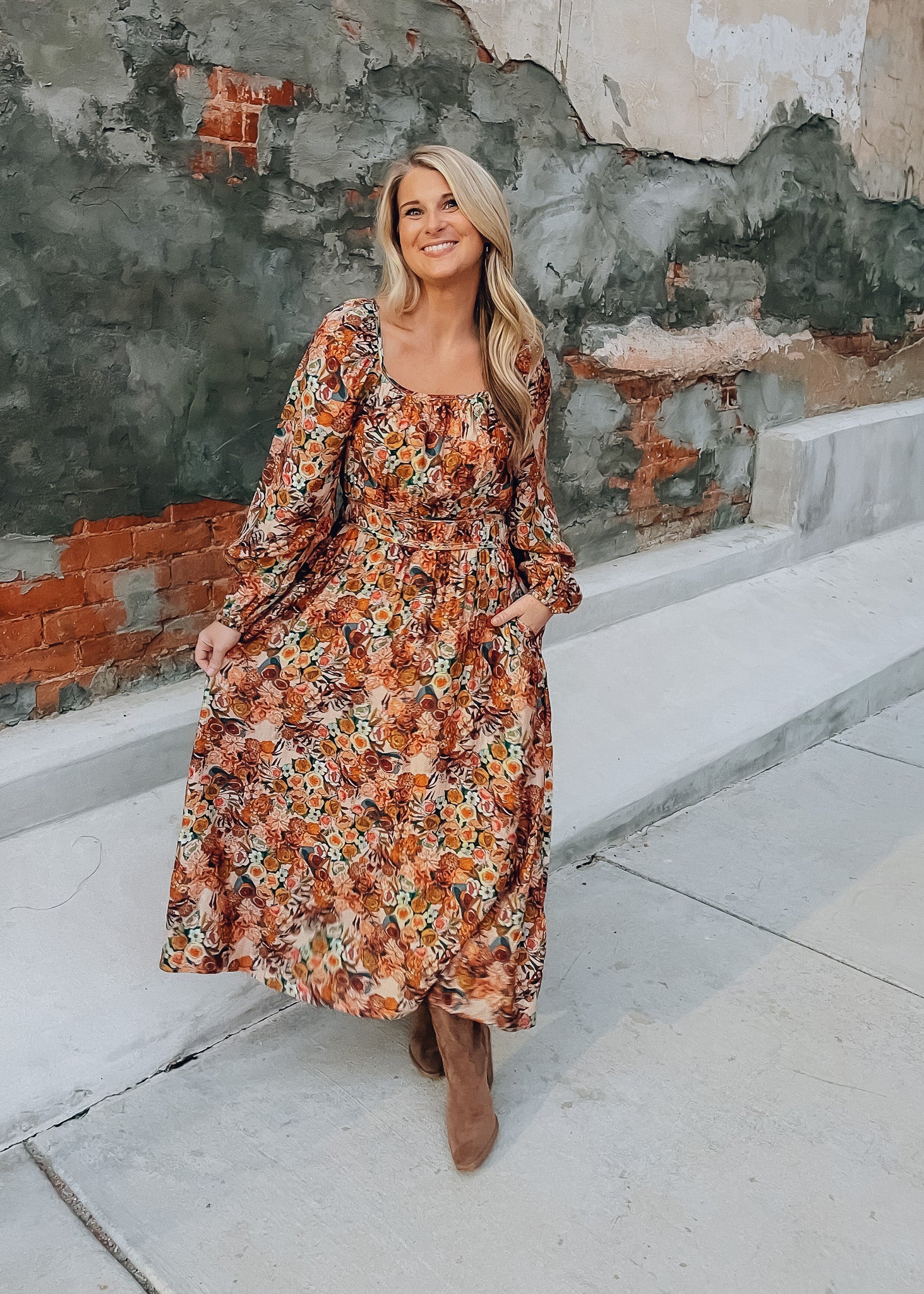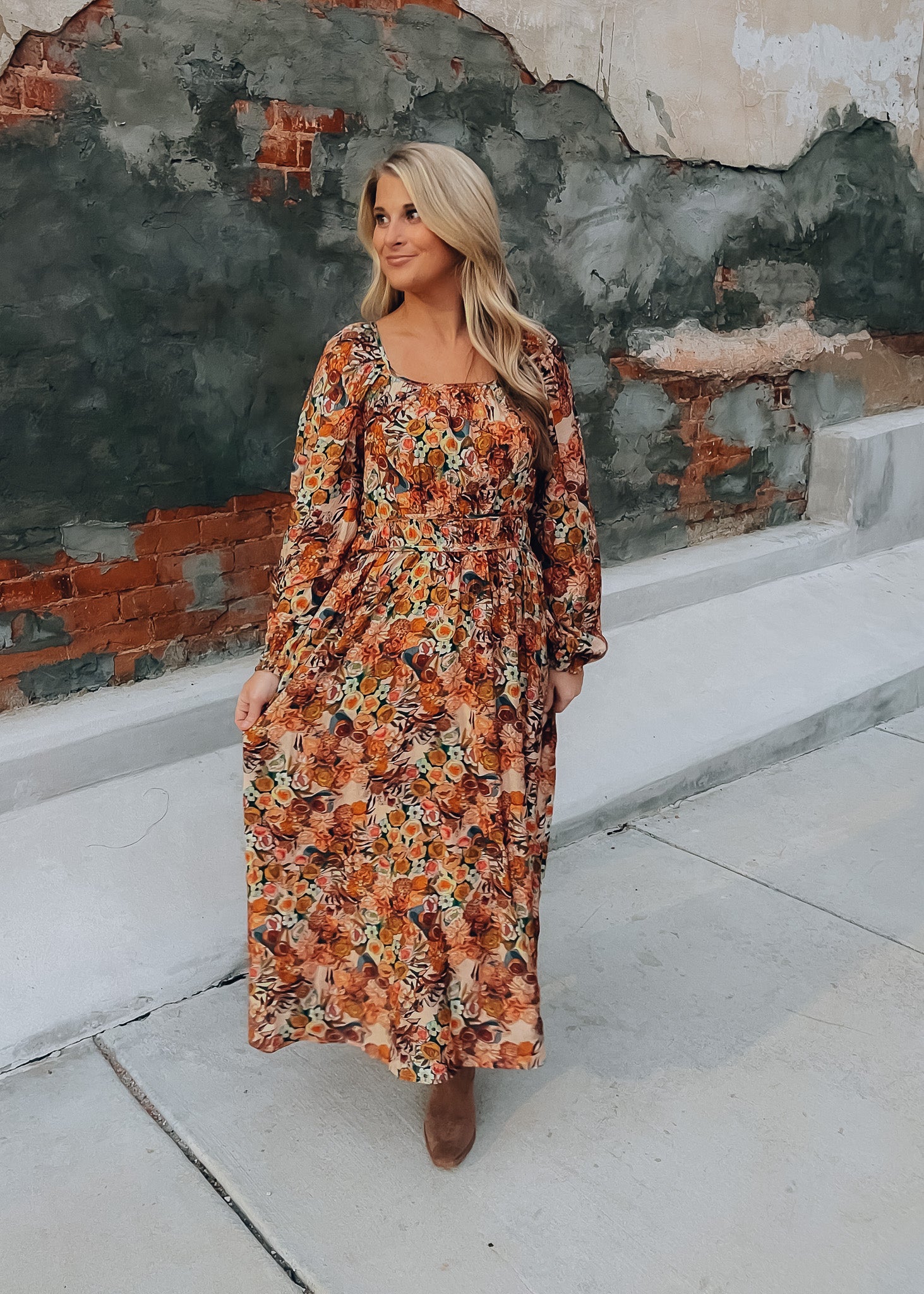 Be the epitome of elegance and style with our Radiant Blossoms Maxi Dress. The beautiful floral and fruit design on a taupe background, adorned with shades of green, yellow, blue, and pink, will make you stand out from the crowd. With a square neck, long sleeves, and pockets, stay comfortable and chic all day long.