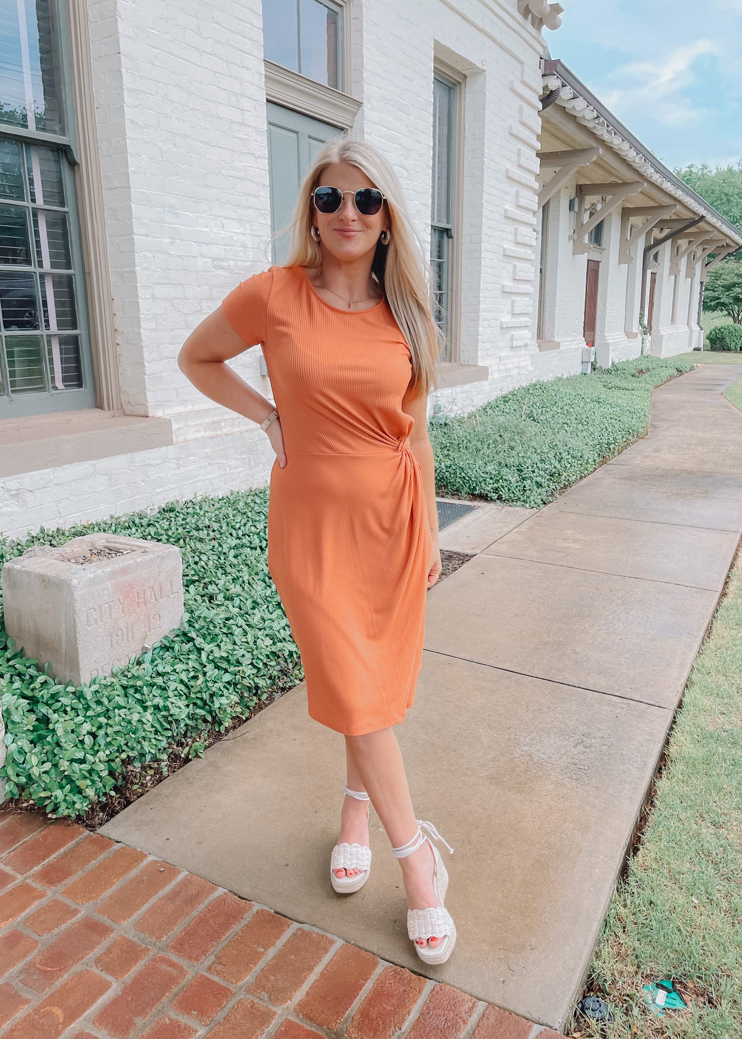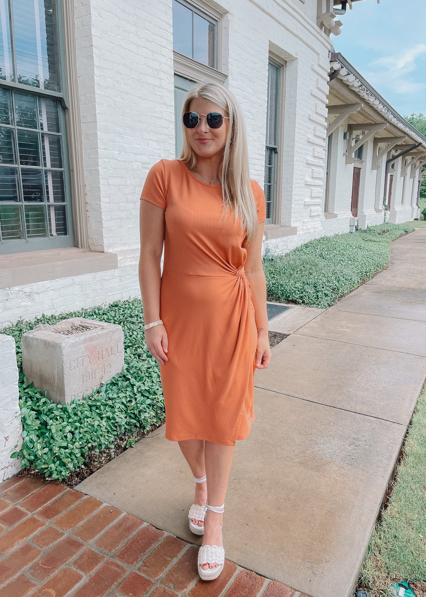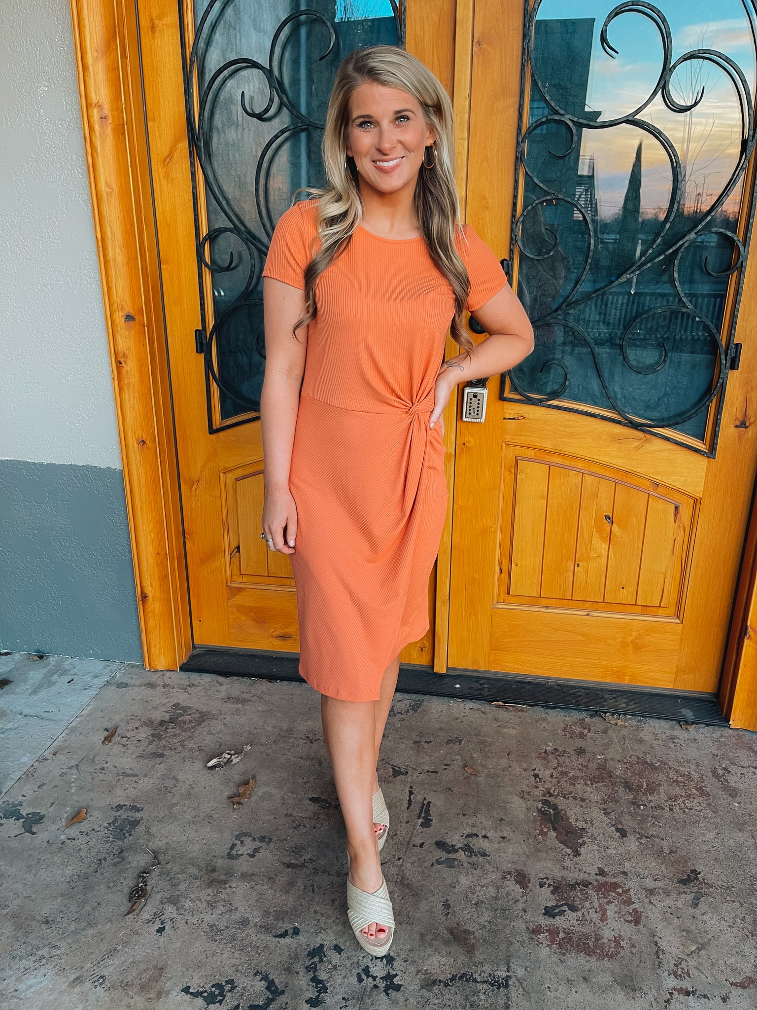 This Relaxed Romance Dress made from soft, ribbed fabric offers a comfortable fit that is both stylish and flattering. The round neckline and short sleeves emphasize the fitted cut, with a twist knot detail at the front for a hint of romantic detail. The soft peach color adds a sweet, subtle touch that make this a versatile look.