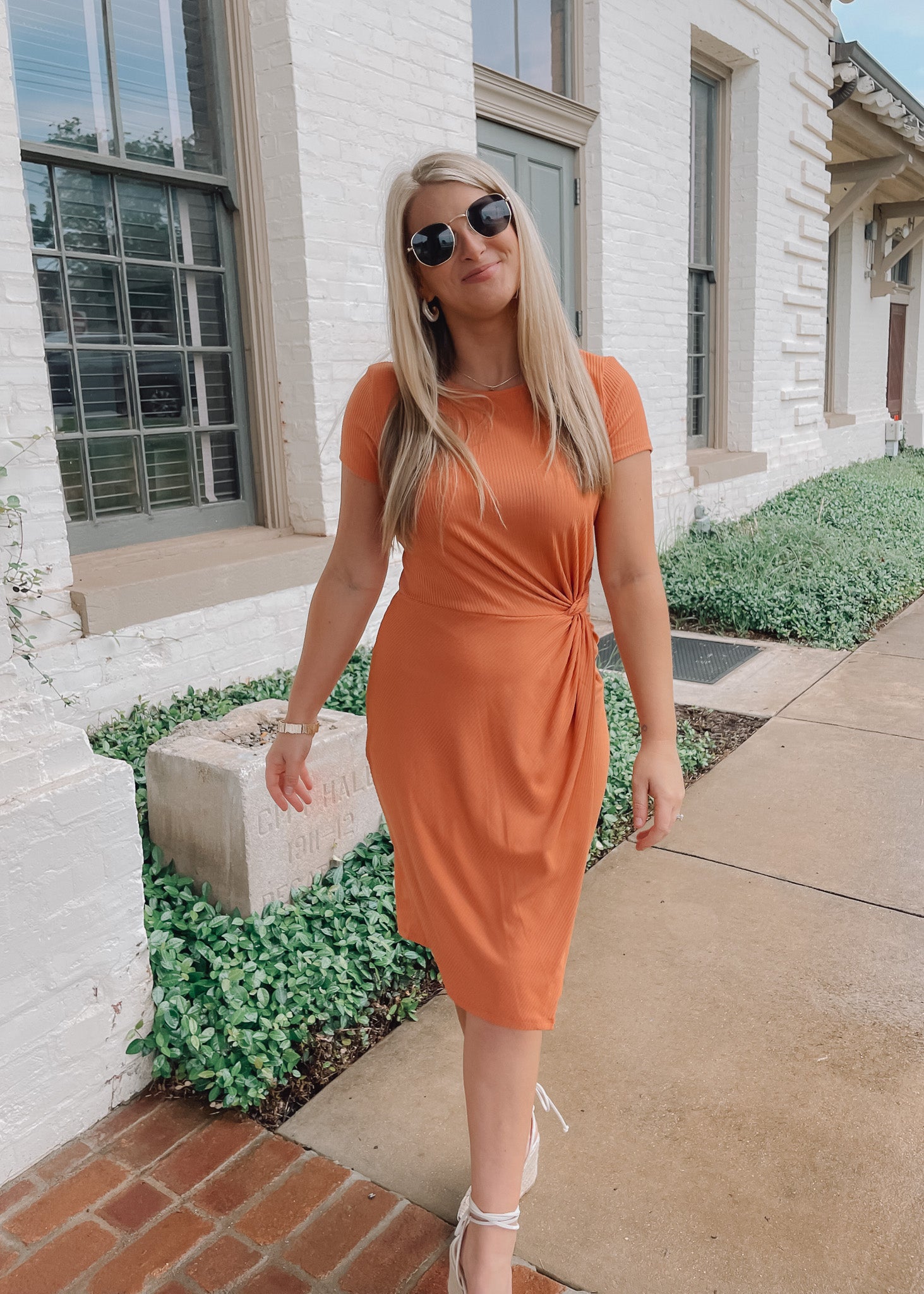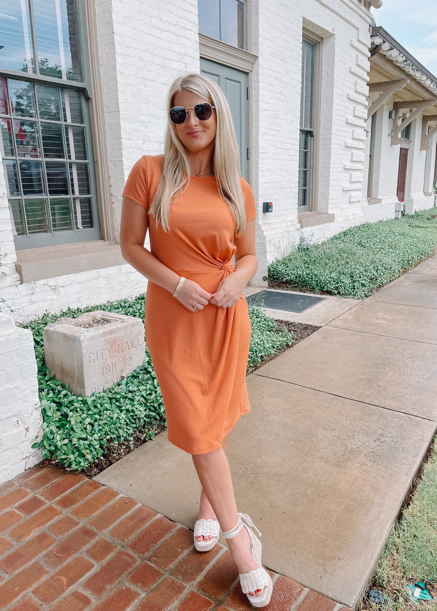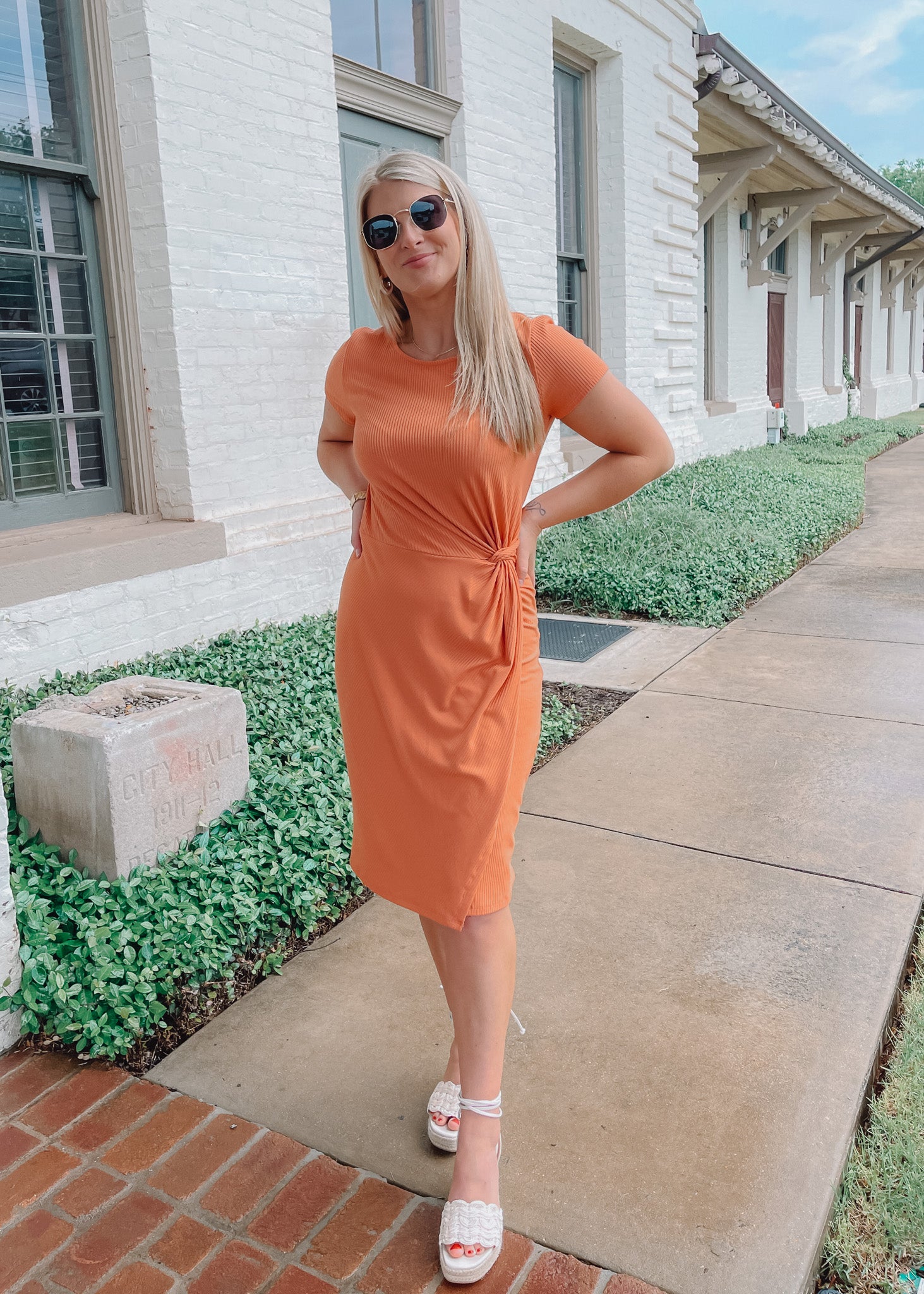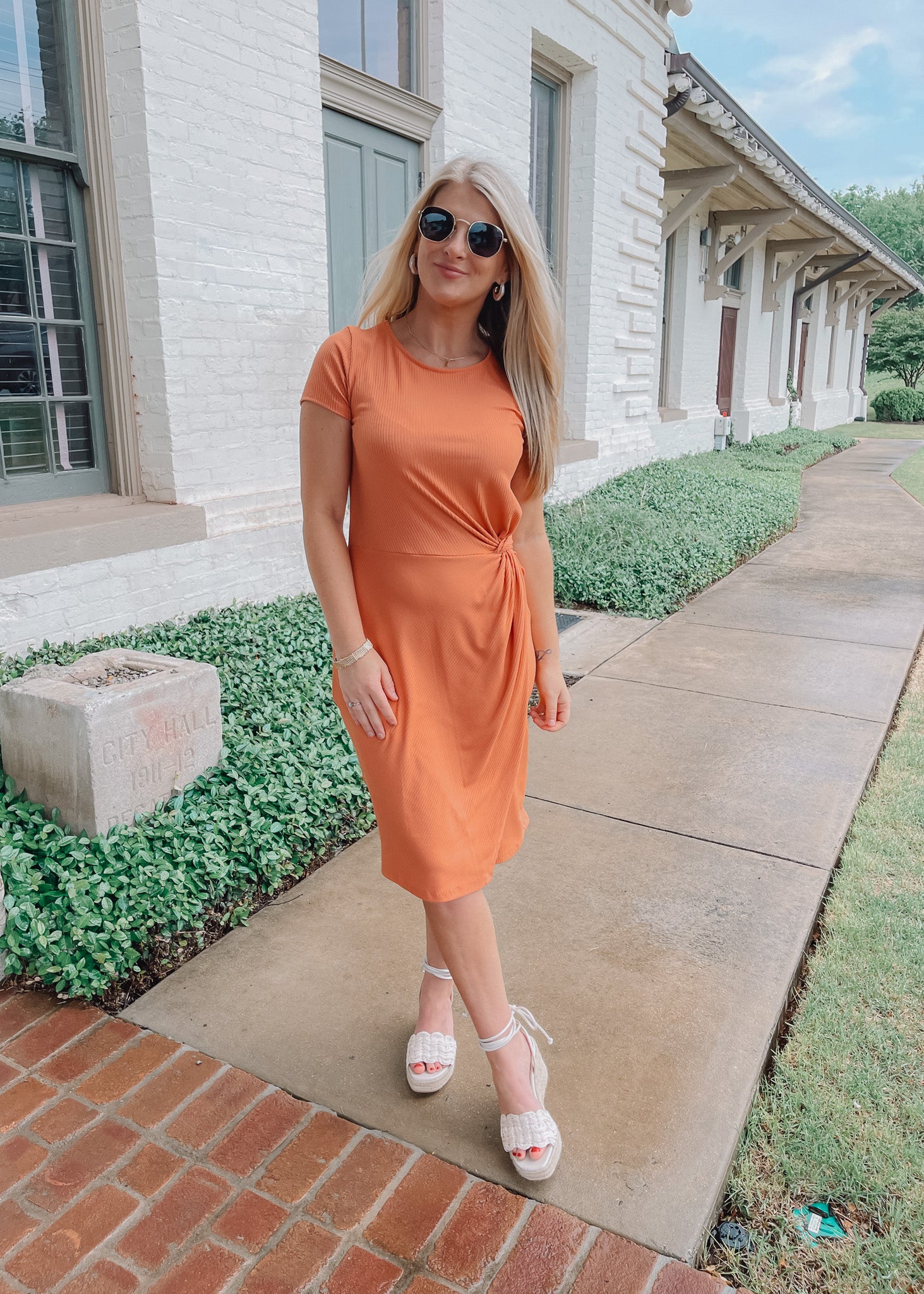 This Relaxed Romance Dress made from soft, ribbed fabric offers a comfortable fit that is both stylish and flattering. The round neckline and short sleeves emphasize the fitted cut, with a twist knot detail at the front for a hint of romantic detail. The soft peach color adds a sweet, subtle touch that make this a versatile look.
