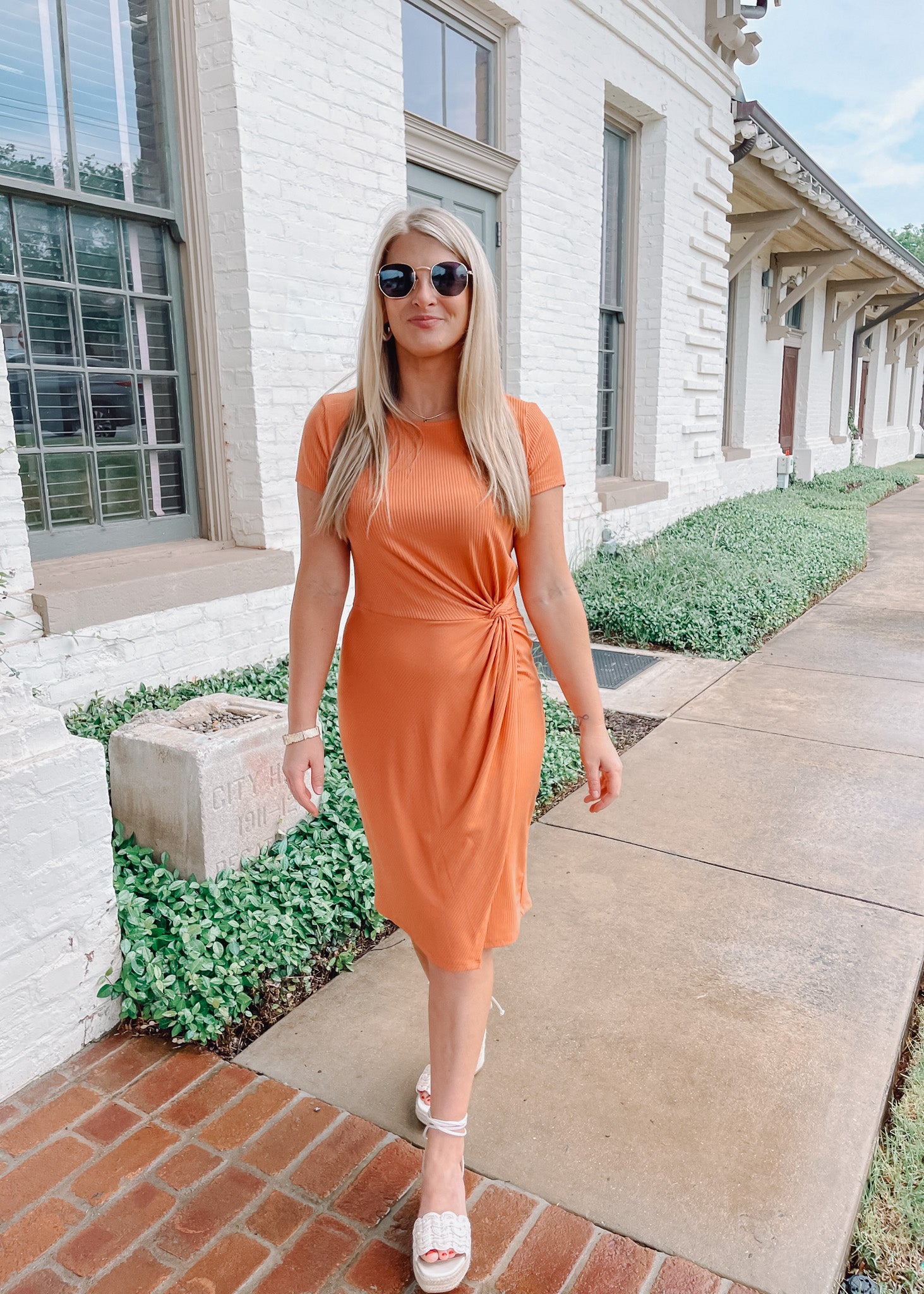 Dress features a sweet peach color, short sleeves, front twist detail, round� neck line, fitted fit and runs true to size!�