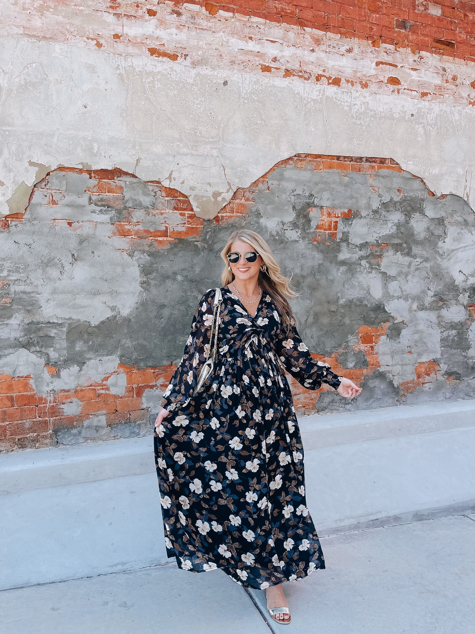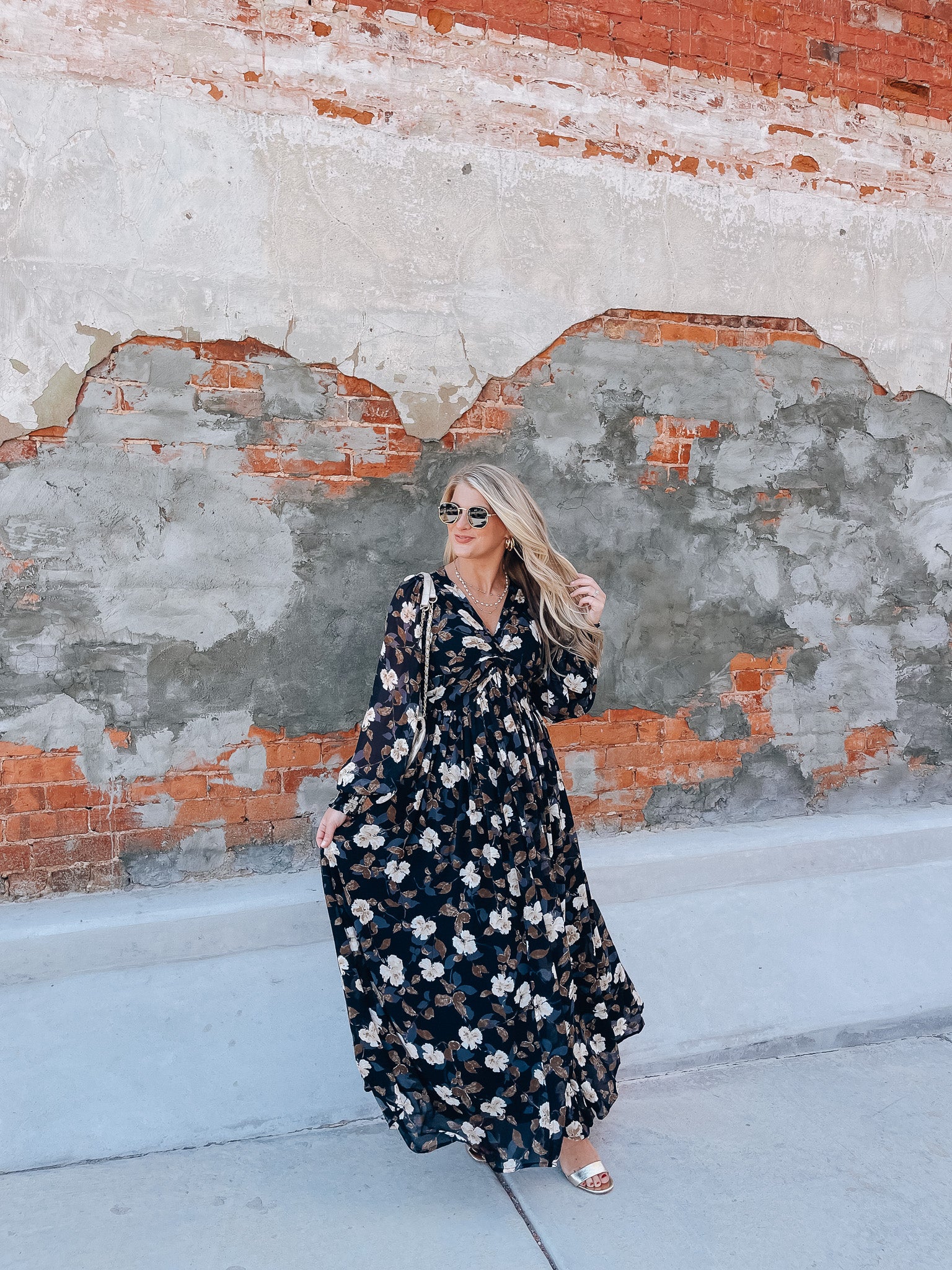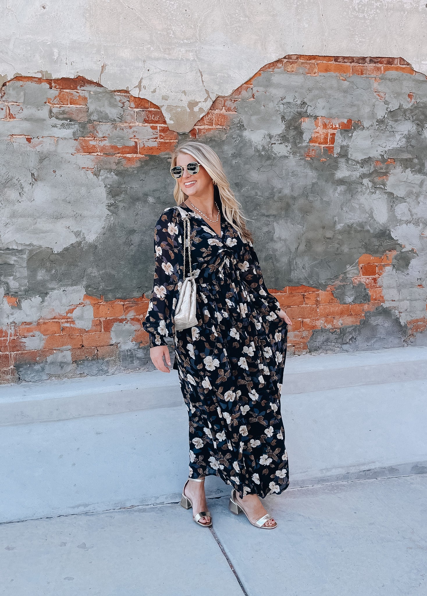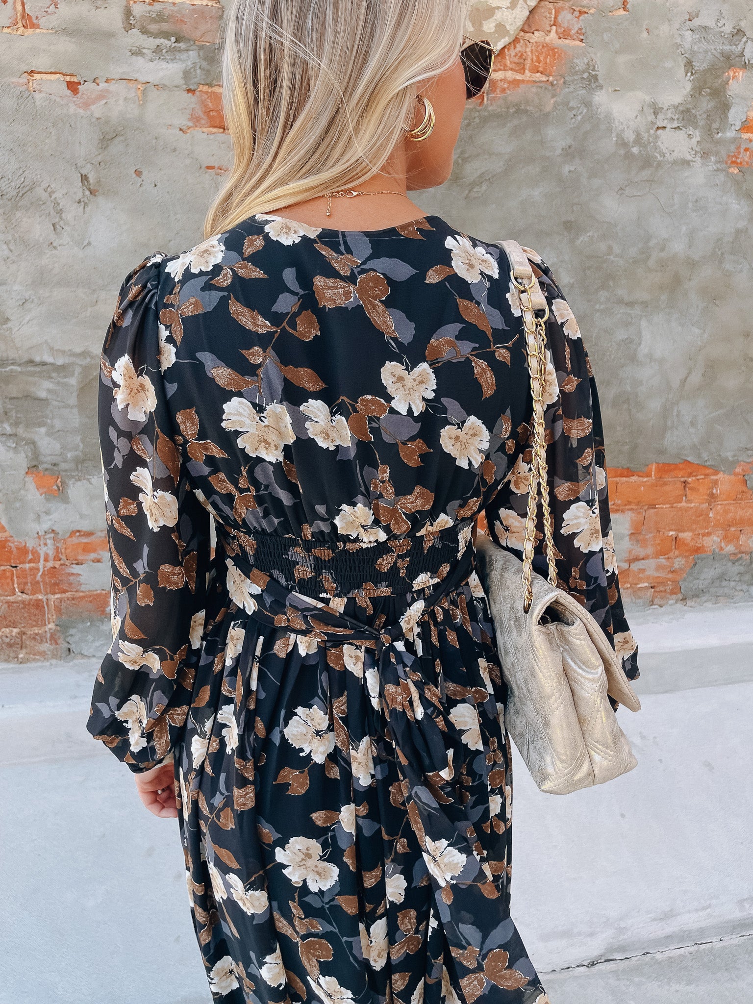 Fall in love with our Searching For Love Maxi Dress! This stunning black floral dress features a flattering twist wrap design and a smocked waistband for the perfect fit. With long sleeves and a beautiful mix of creams, taupes, and navy hues, this maxi dress is a must-have for any special occasion. Make a statement and turn heads in this gorgeous floral dress!