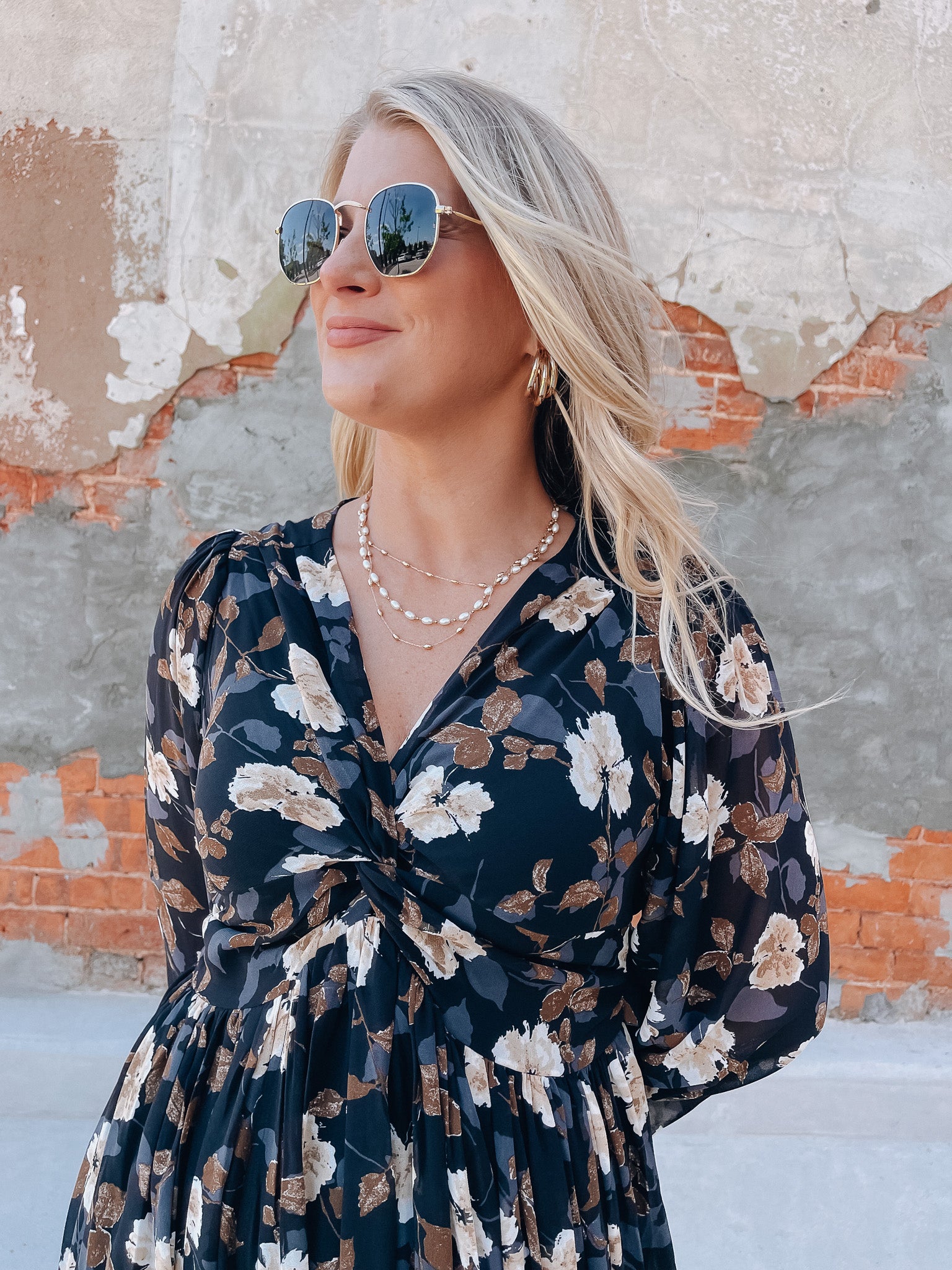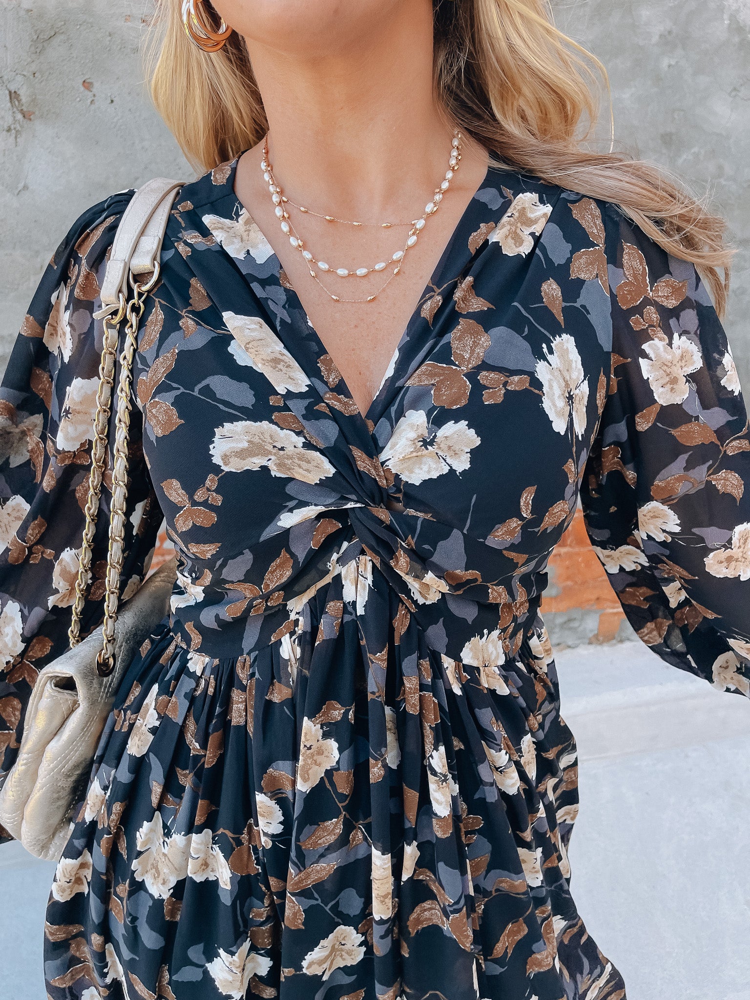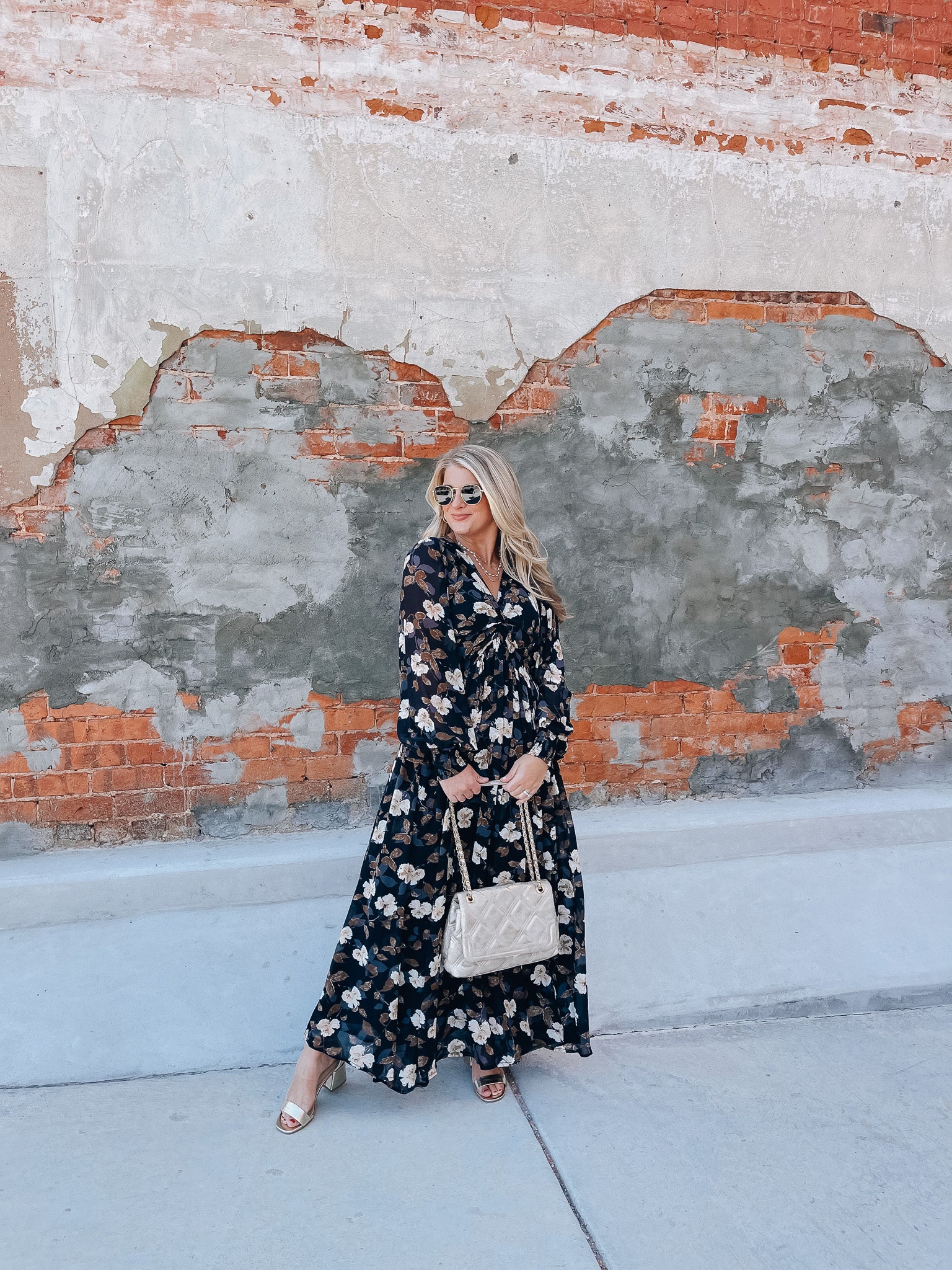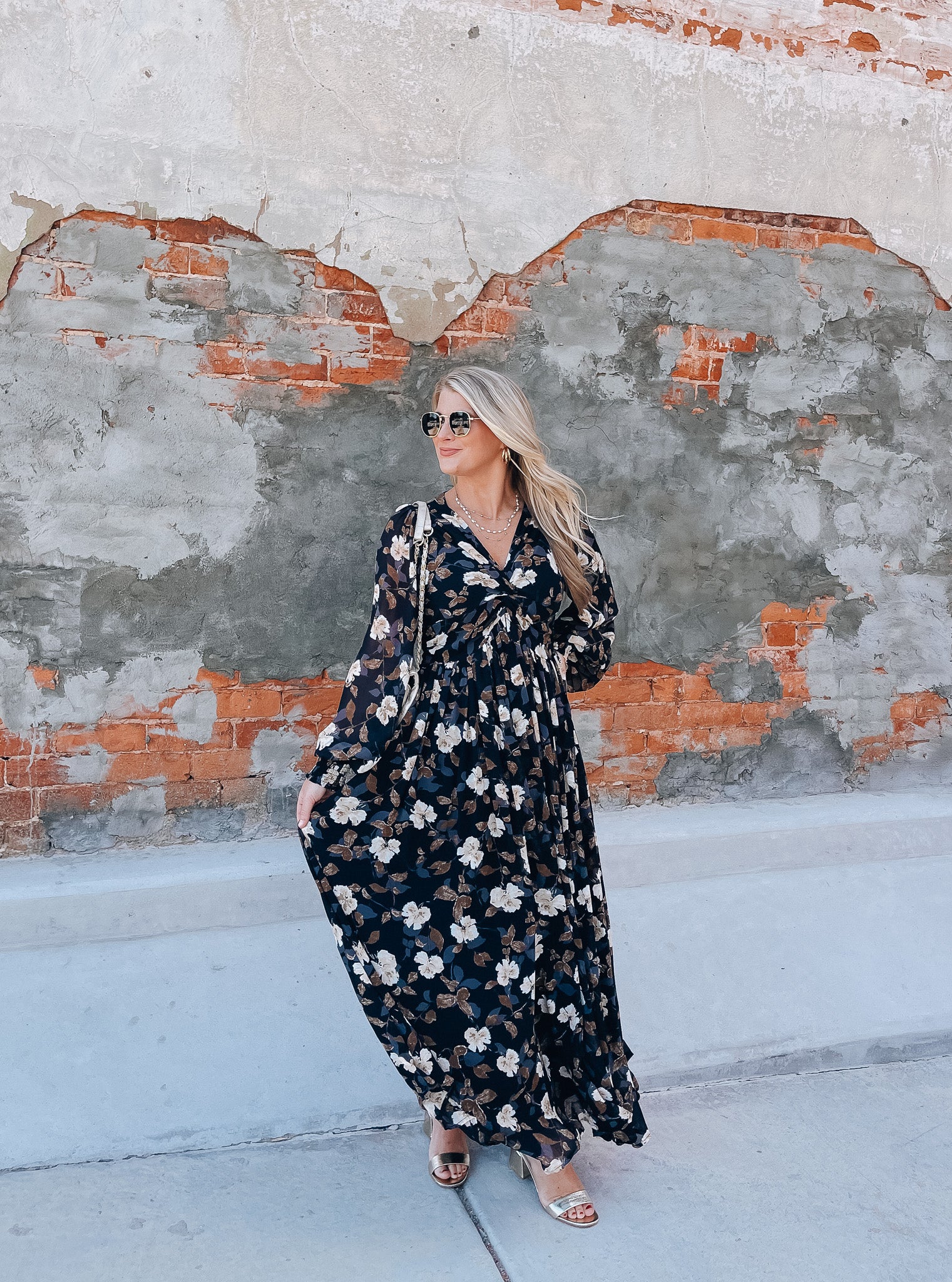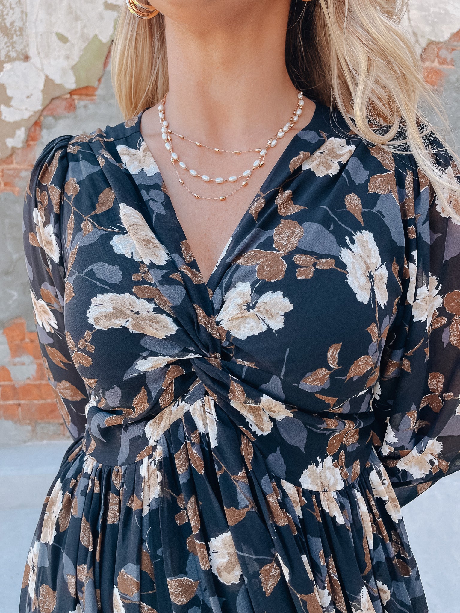 Fall in love with our Searching For Love Maxi Dress! This stunning black floral dress features a flattering twist wrap design and a smocked waistband for the perfect fit. With long sleeves and a beautiful mix of creams, taupes, and navy hues, this maxi dress is a must-have for any special occasion. Make a statement and turn heads in this gorgeous floral dress!