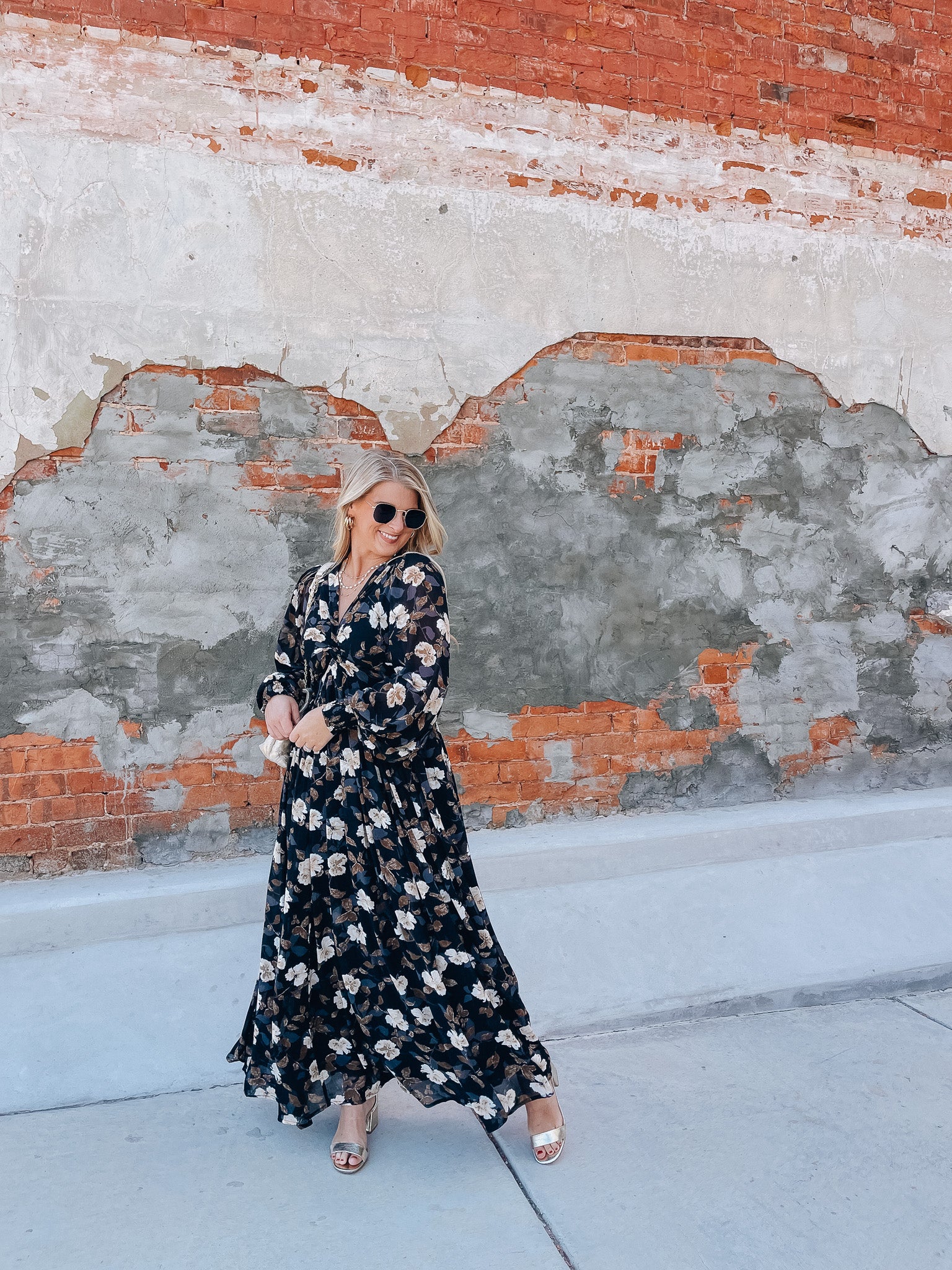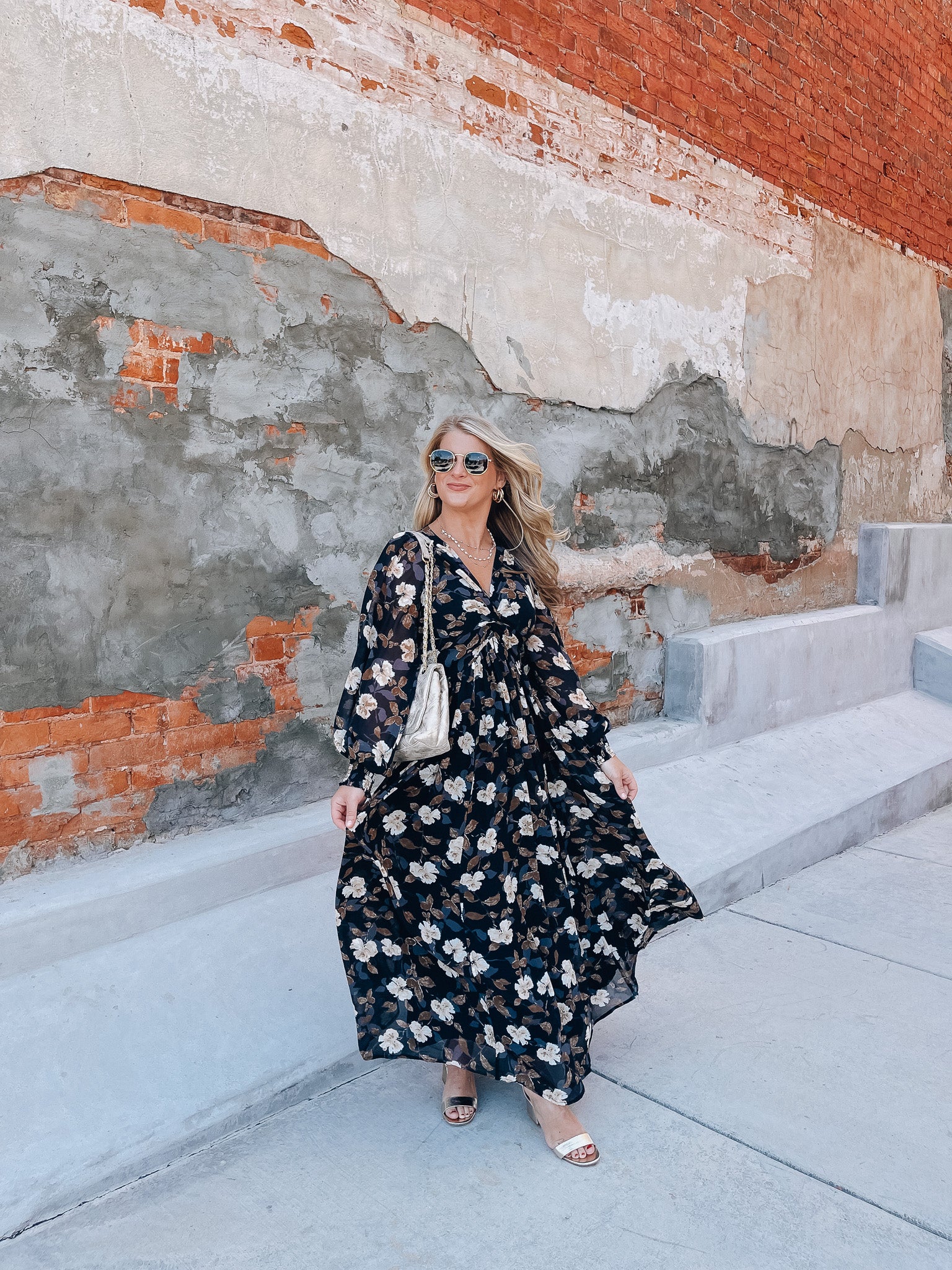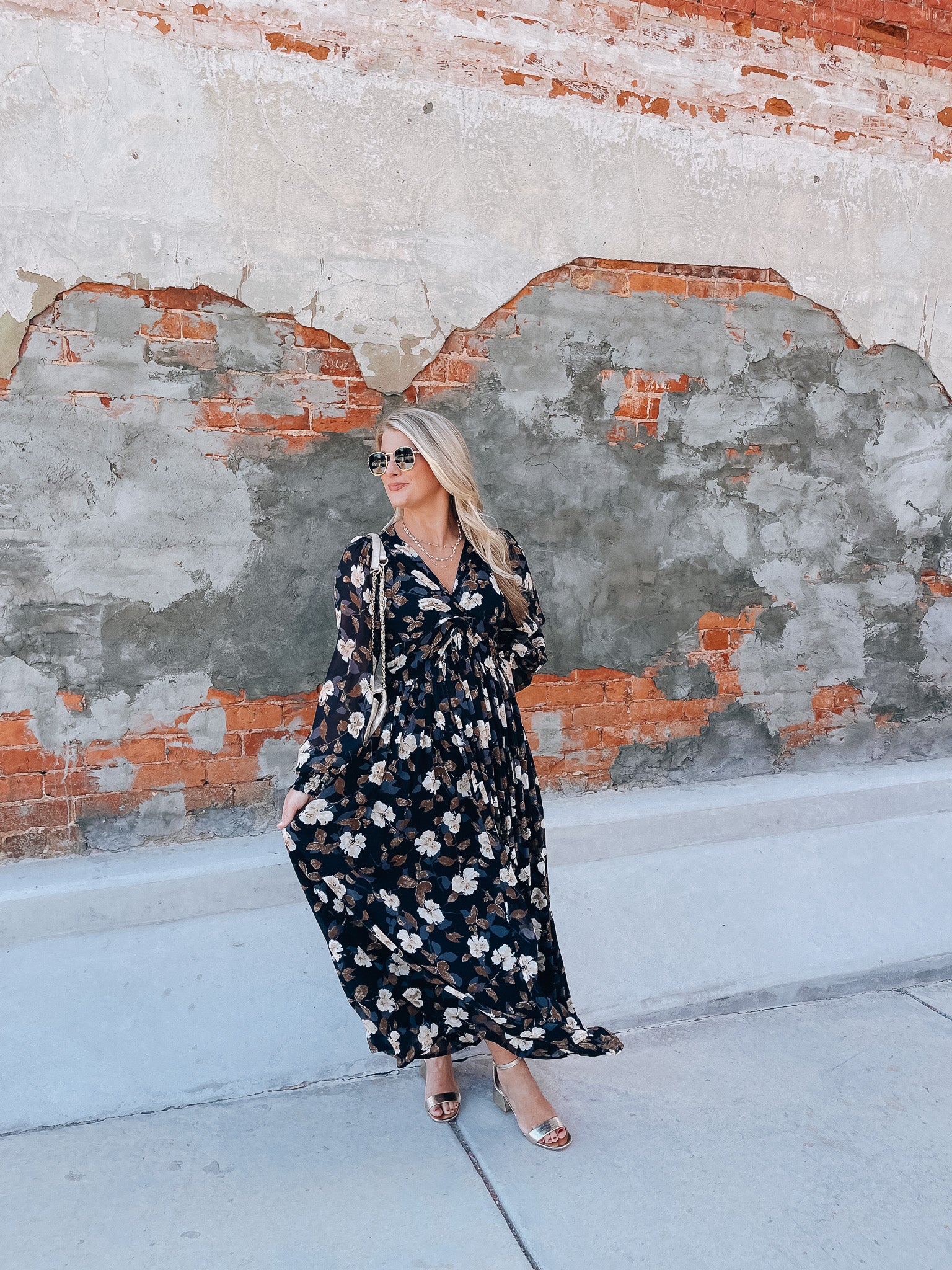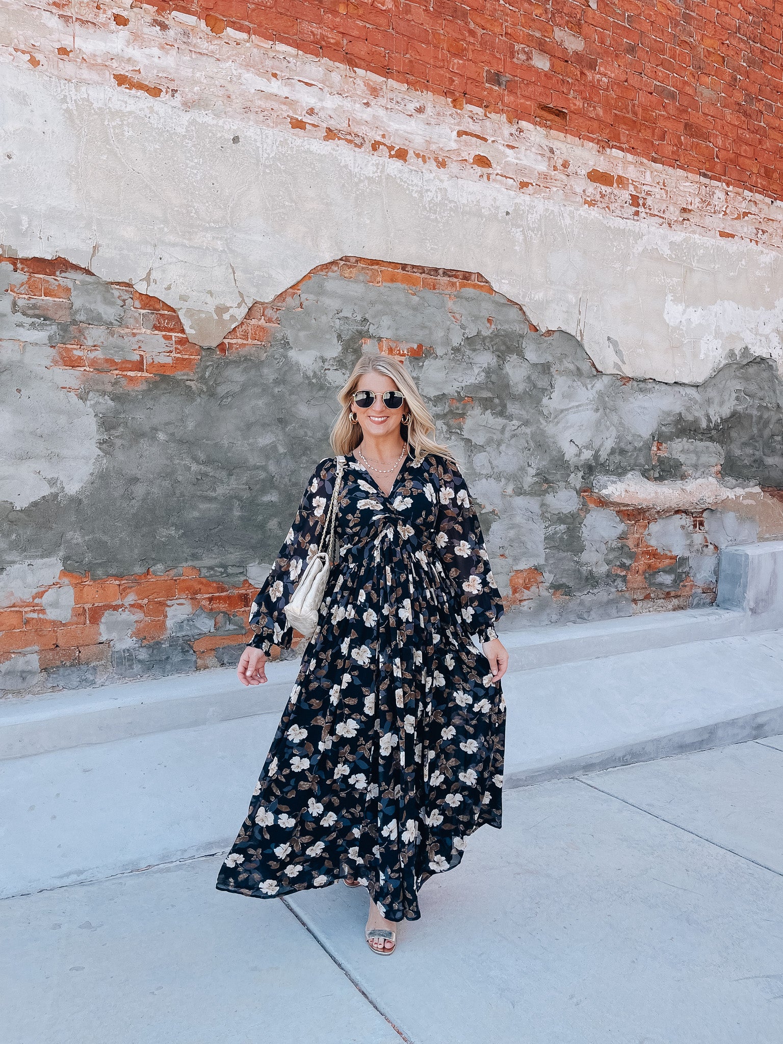 Fall in love with our Searching For Love Maxi Dress! This stunning black floral dress features a flattering twist wrap design and a smocked waistband for the perfect fit. With long sleeves and a beautiful mix of creams, taupes, and navy hues, this maxi dress is a must-have for any special occasion. Make a statement and turn heads in this gorgeous floral dress!