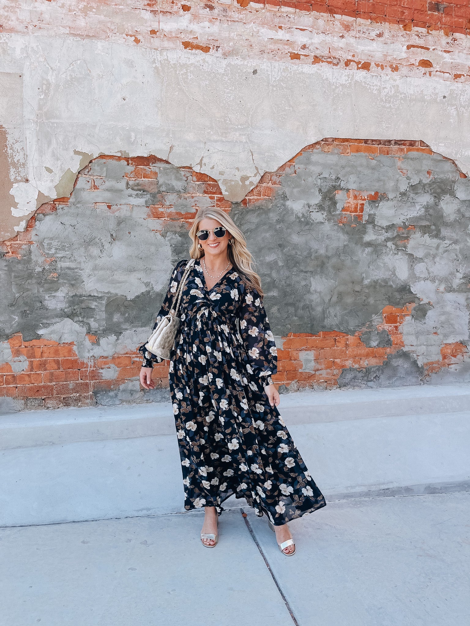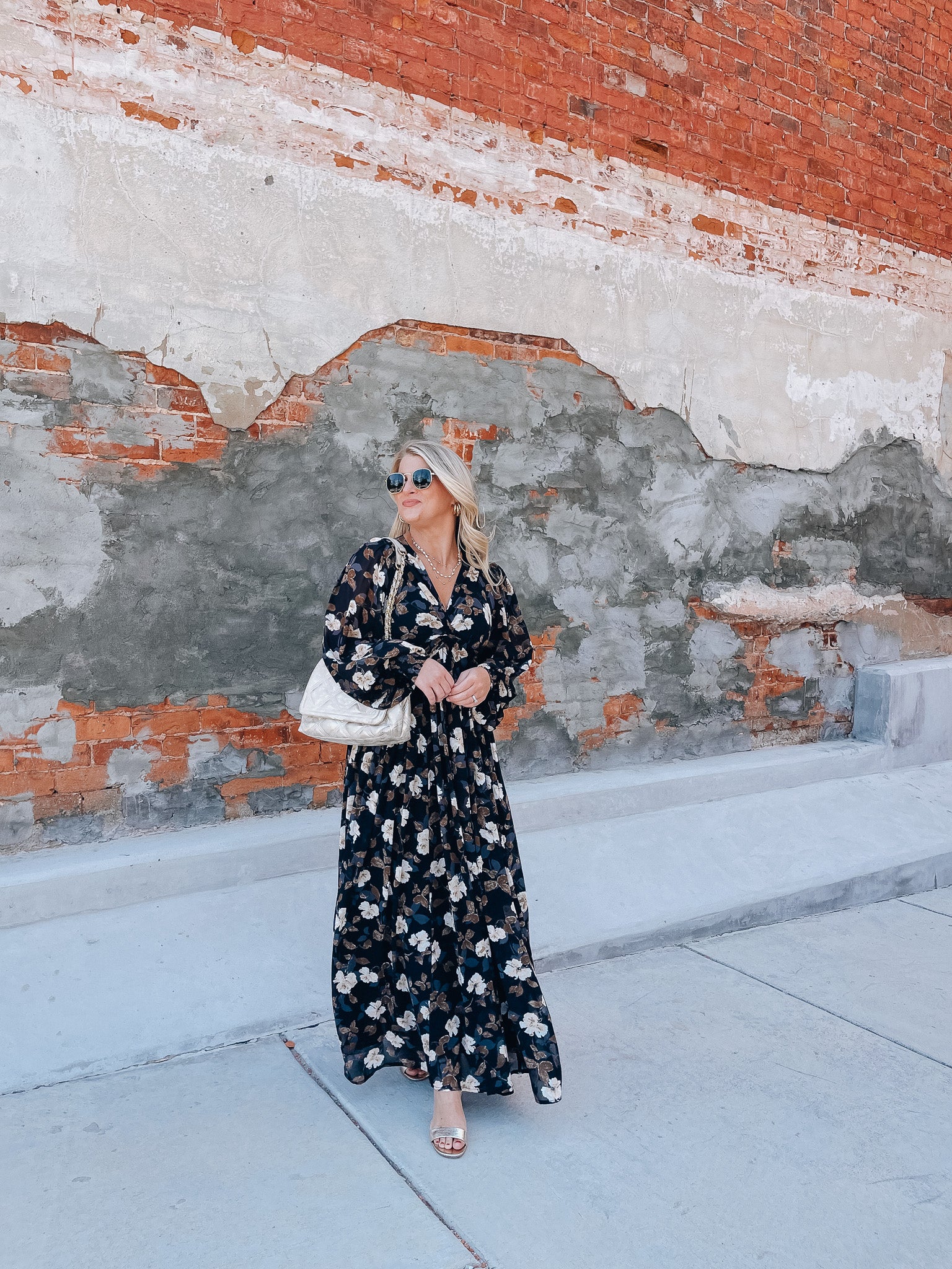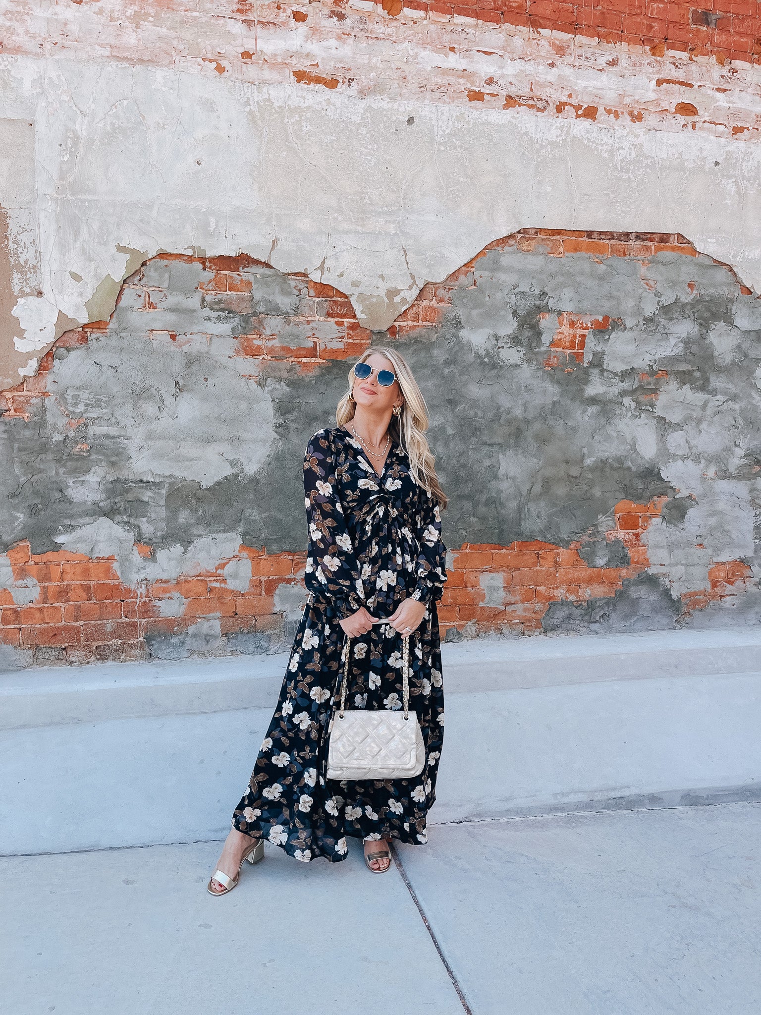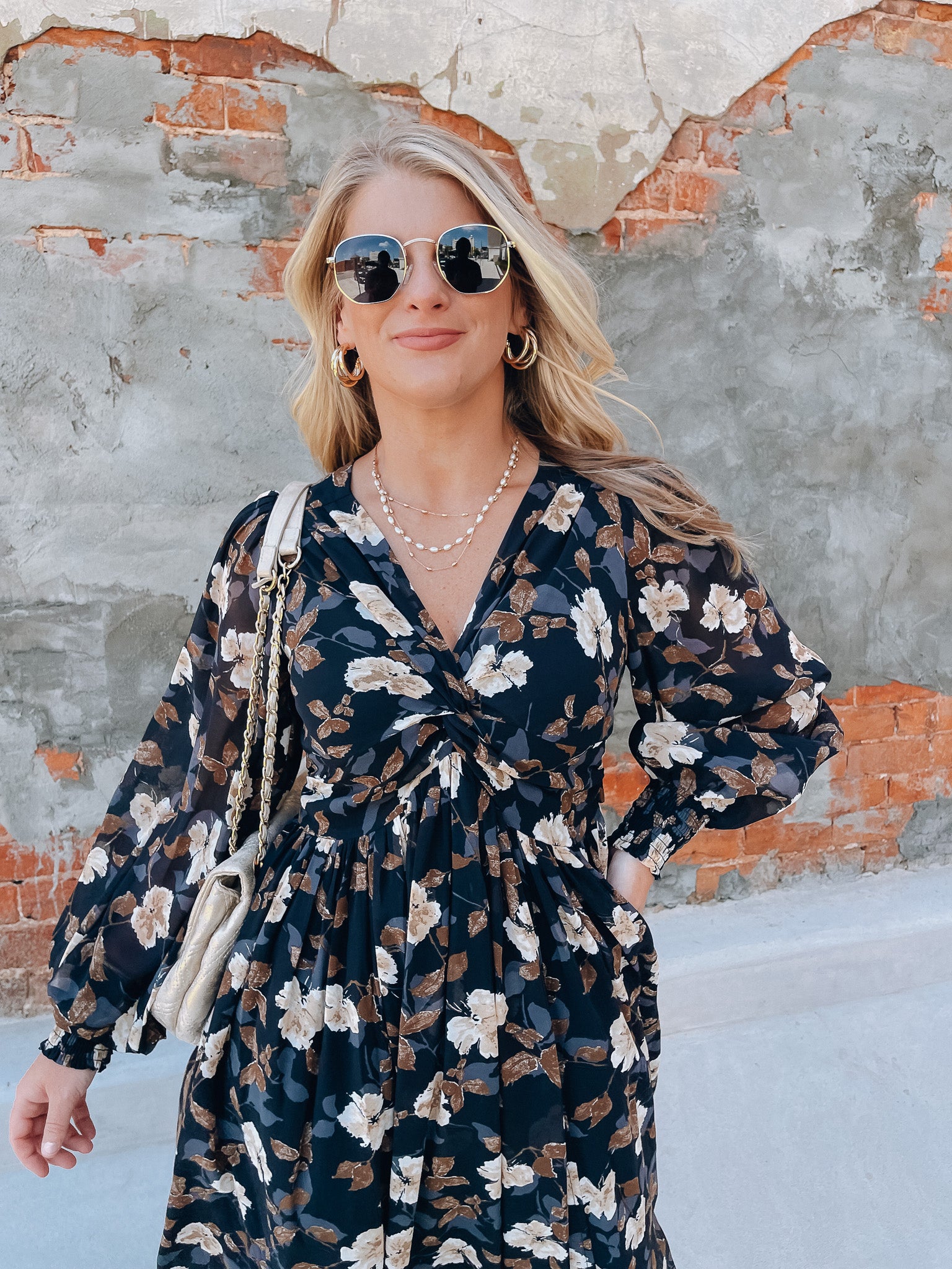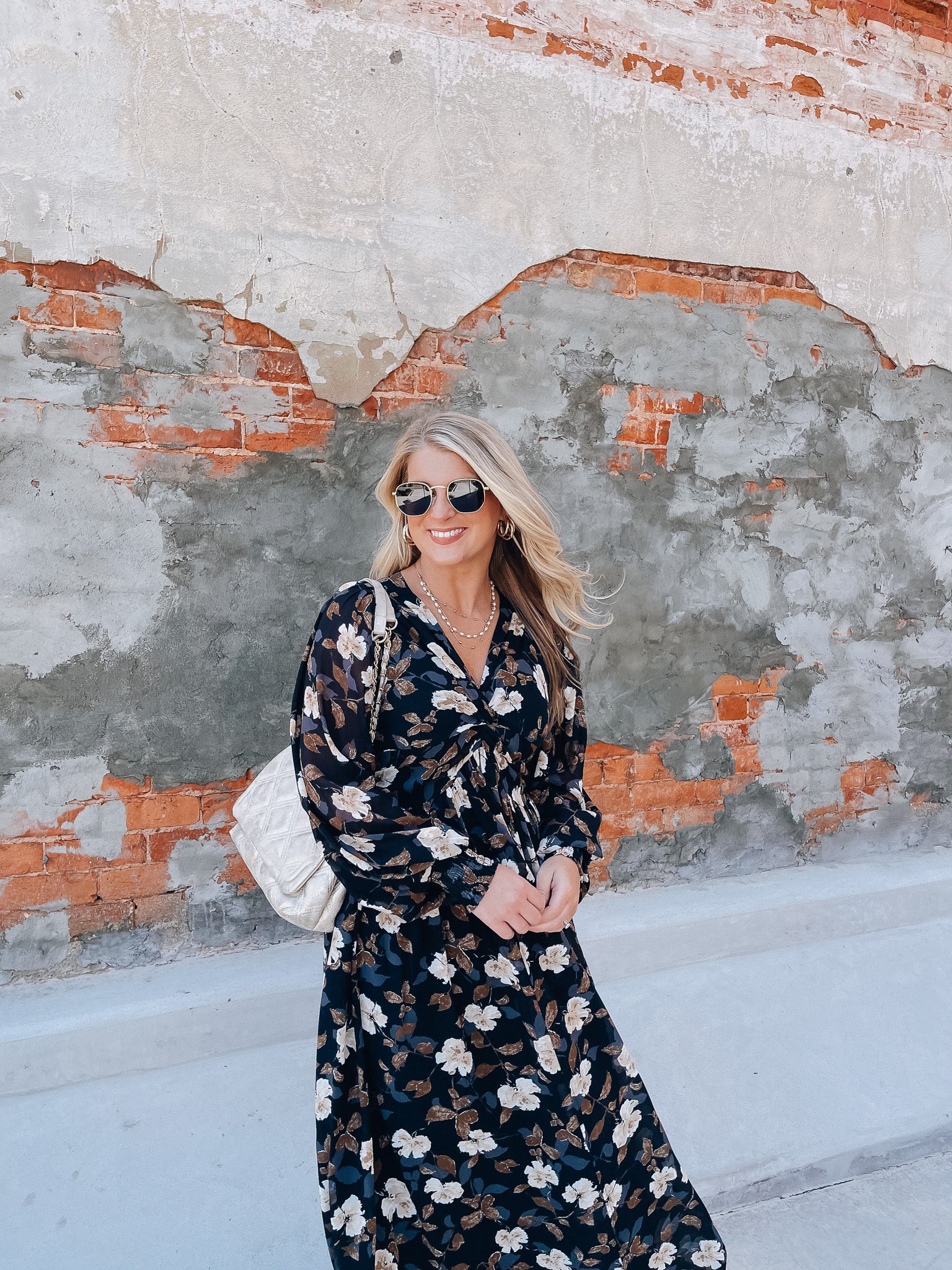 Fall in love with our Searching For Love Maxi Dress! This stunning black floral dress features a flattering twist wrap design and a smocked waistband for the perfect fit. With long sleeves and a beautiful mix of creams, taupes, and navy hues, this maxi dress is a must-have for any special occasion. Make a statement and turn heads in this gorgeous floral dress!
