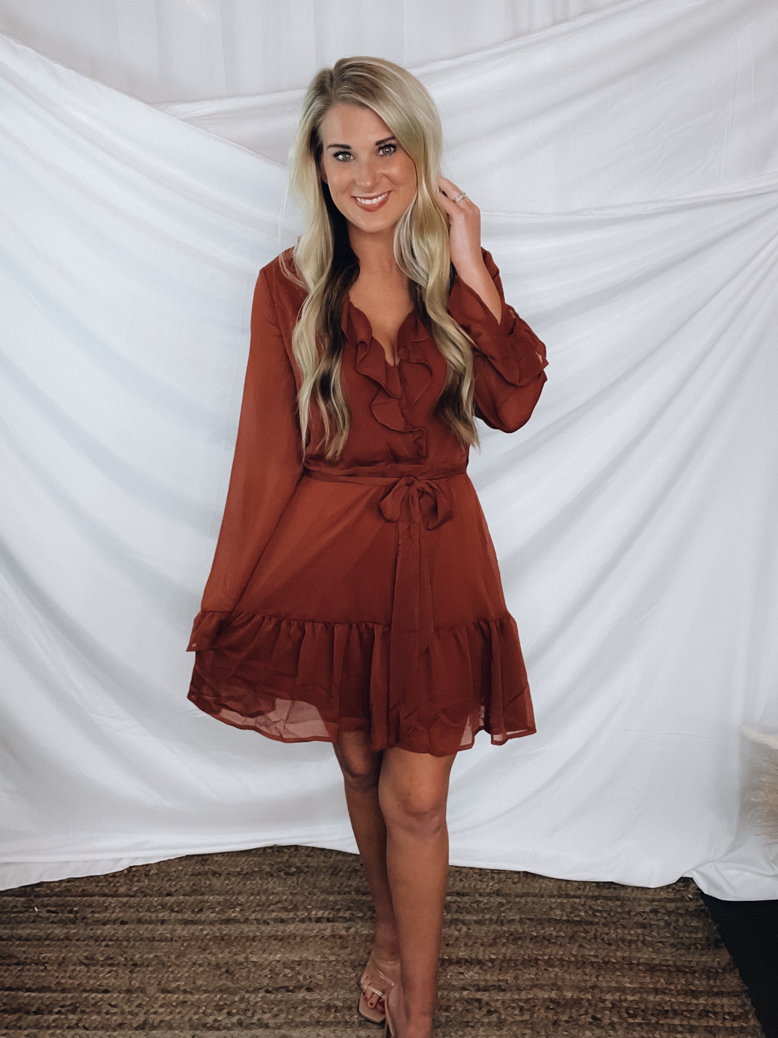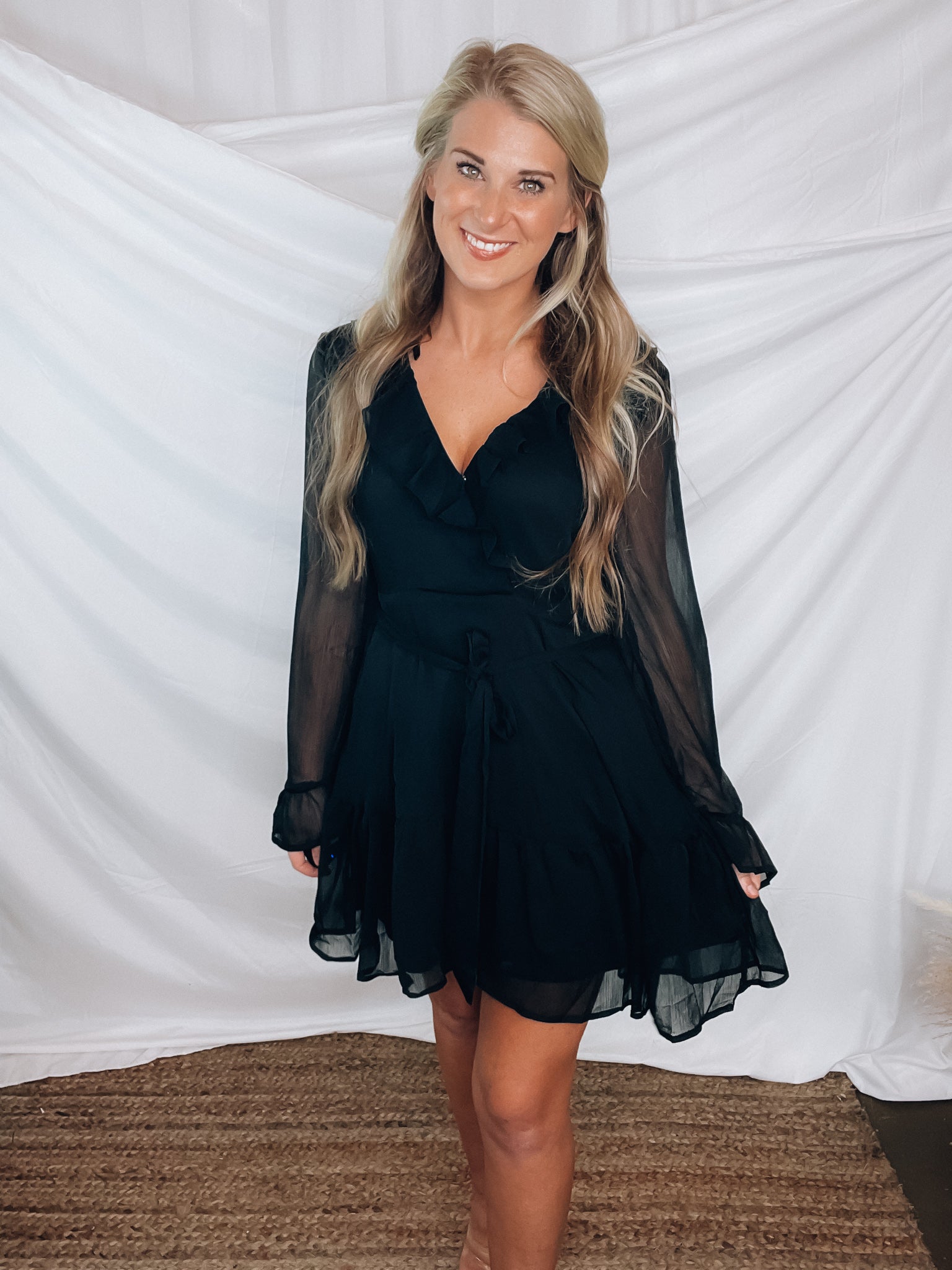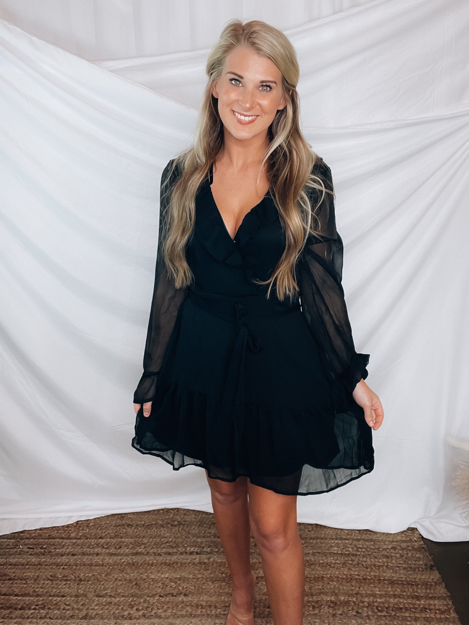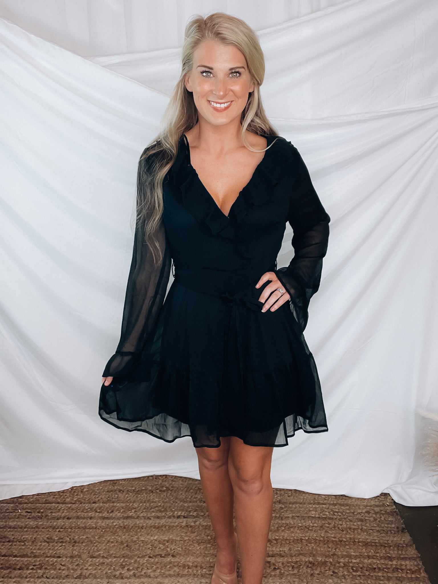 Dress features a mini length, long thin sleeves, ruffled detail, tie belt, fully lined and runs true to size!�
