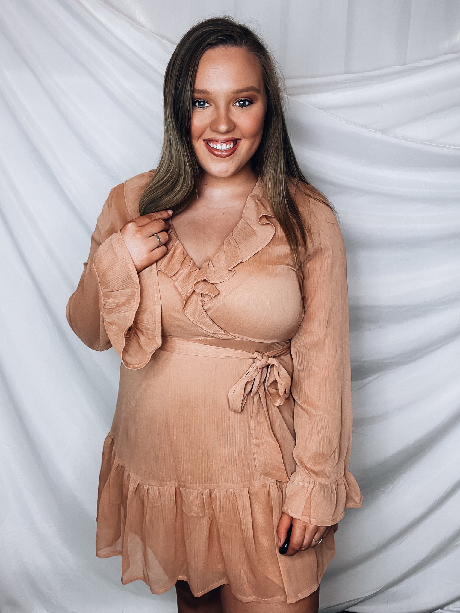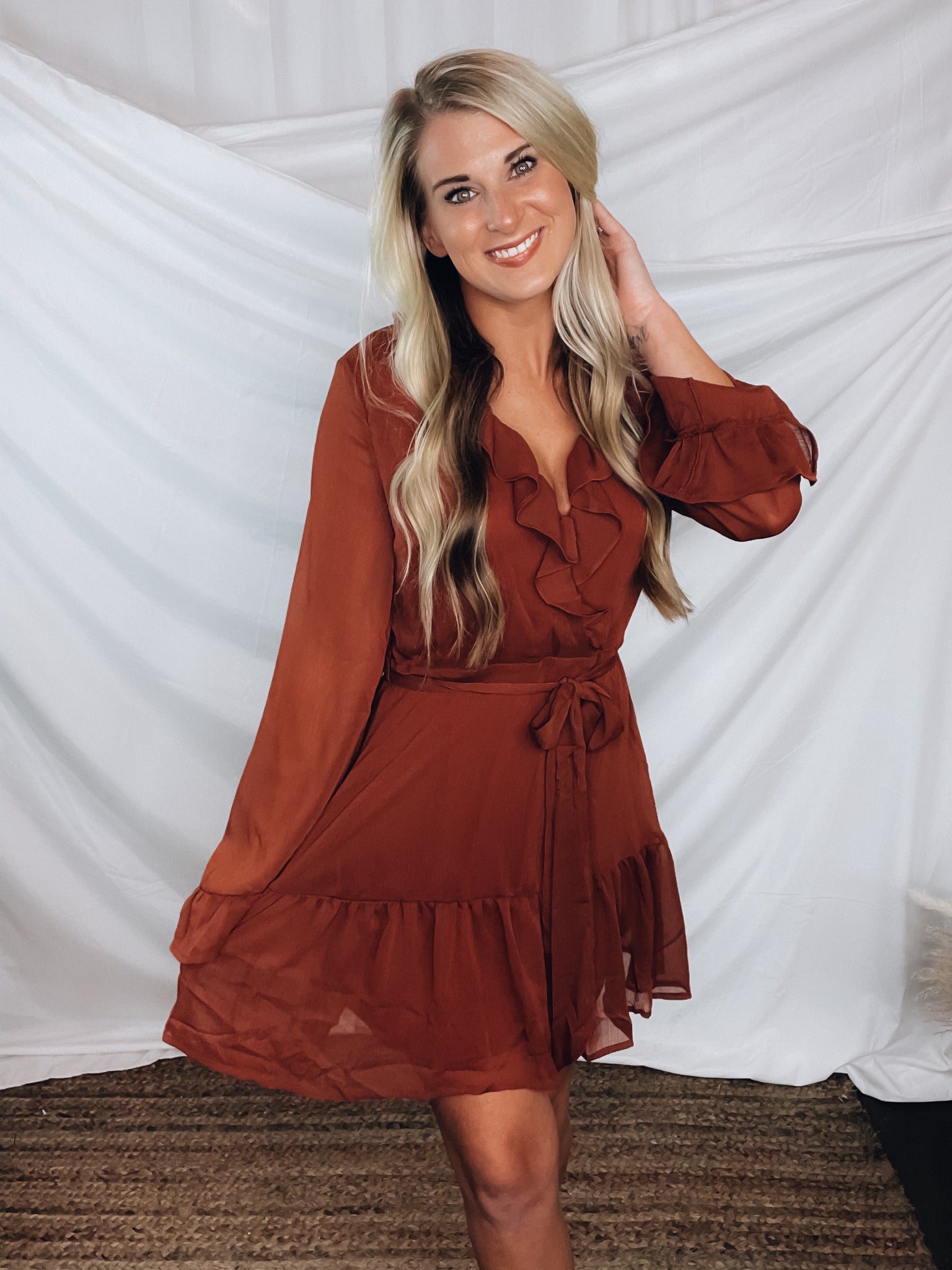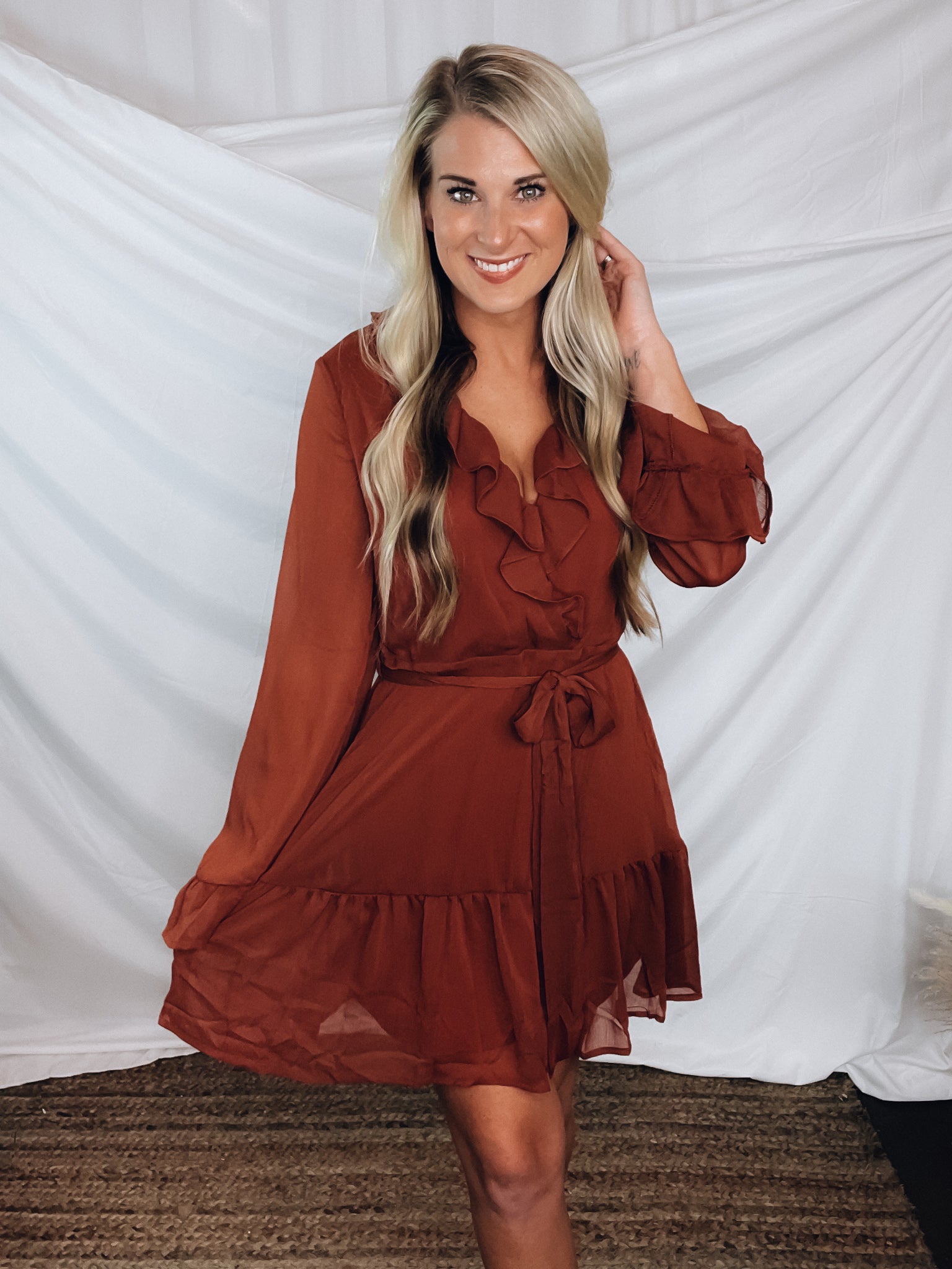 Dress features a mini length, long thin sleeves, ruffled detail, tie belt, fully lined and runs true to size!�