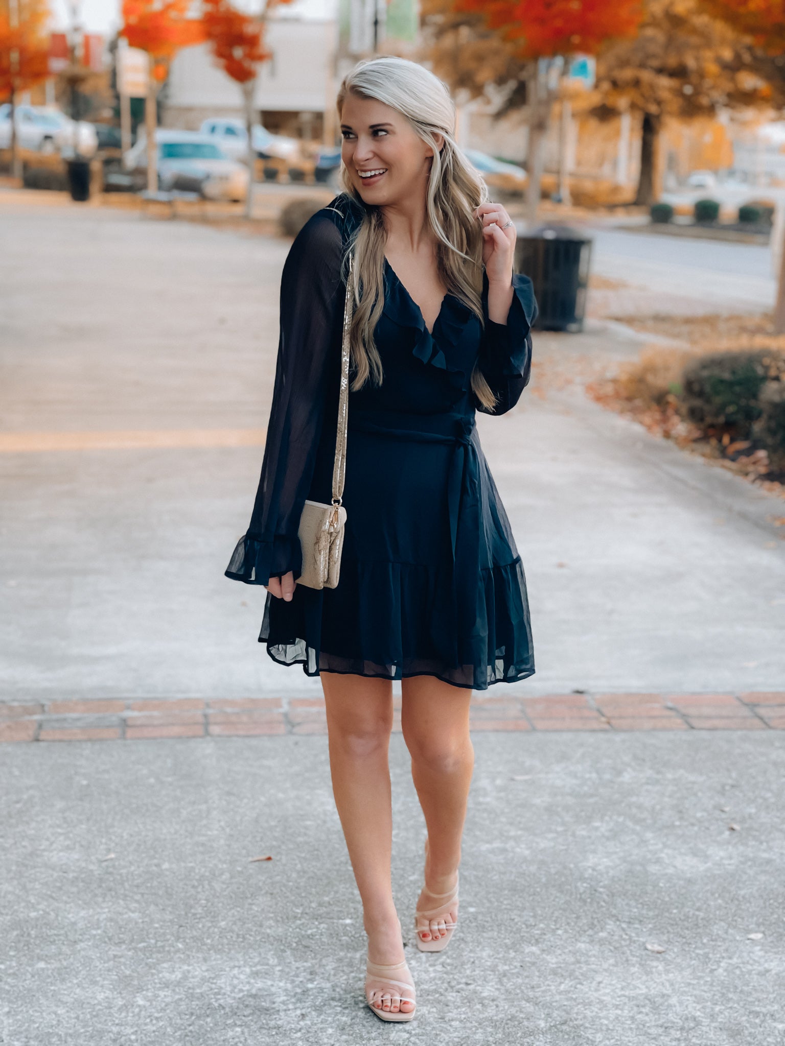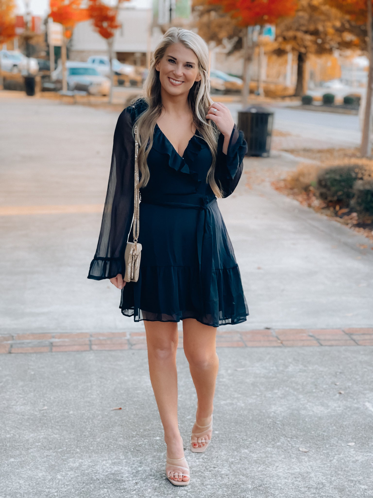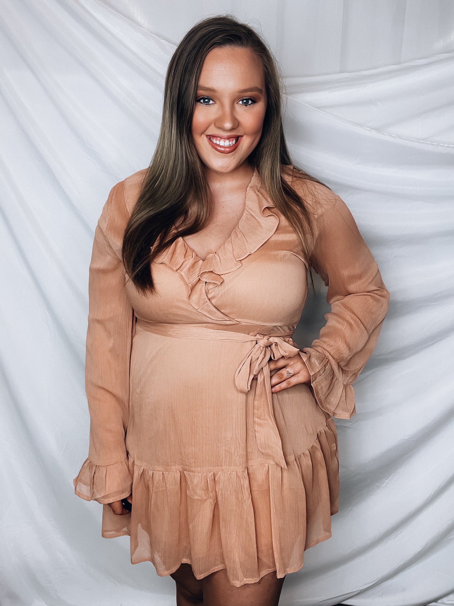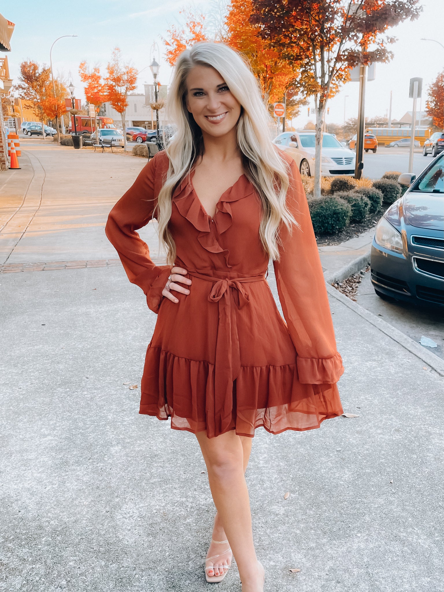 Dress features a mini length, long thin sleeves, ruffled detail, tie belt, fully lined and runs true to size!�