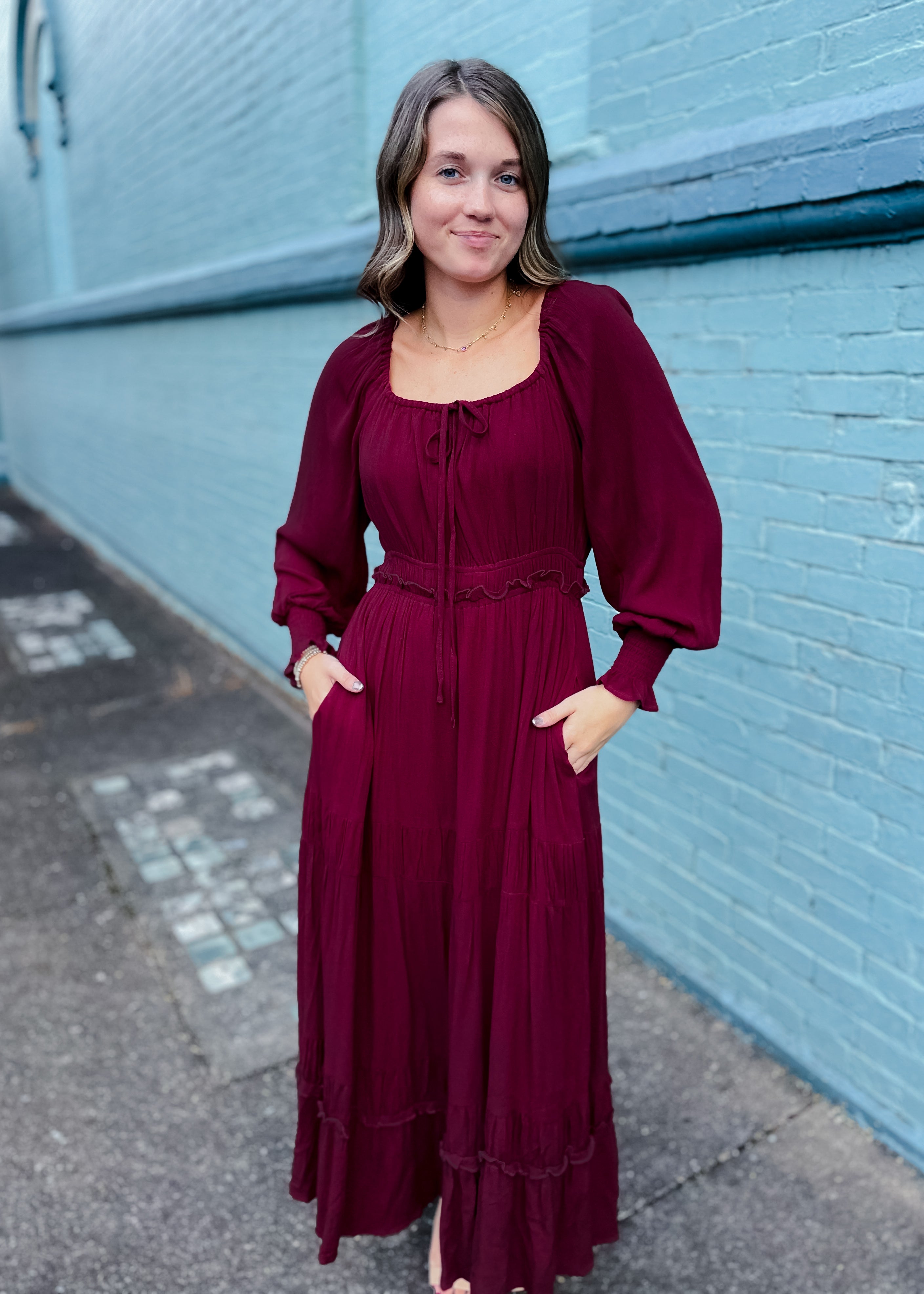 Experience effortless elegance with The Choice is Clear Maxi Dress. This cherry lacquer-colored masterpiece features a gathered square neckline and long sleeves with delicate smocking for a flattering fit. Fully lined and equipped with convenient pockets, it combines style with practicality. The smocked waist accentuates your silhouette, creating a look that��s both comfortable and captivating from day to night. Perfect for any occasion where you want to stand out with grace and ease.
