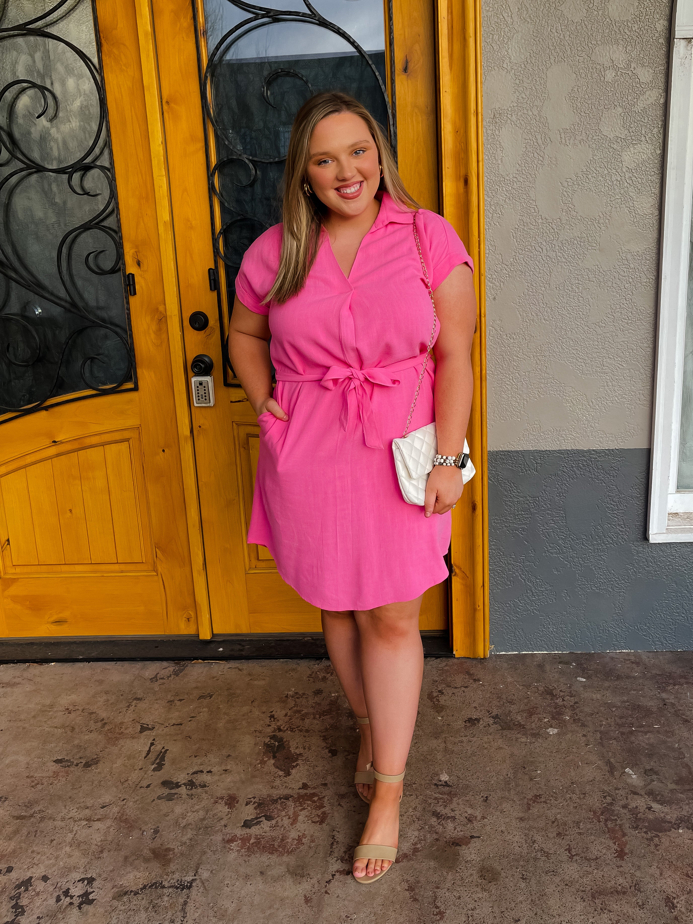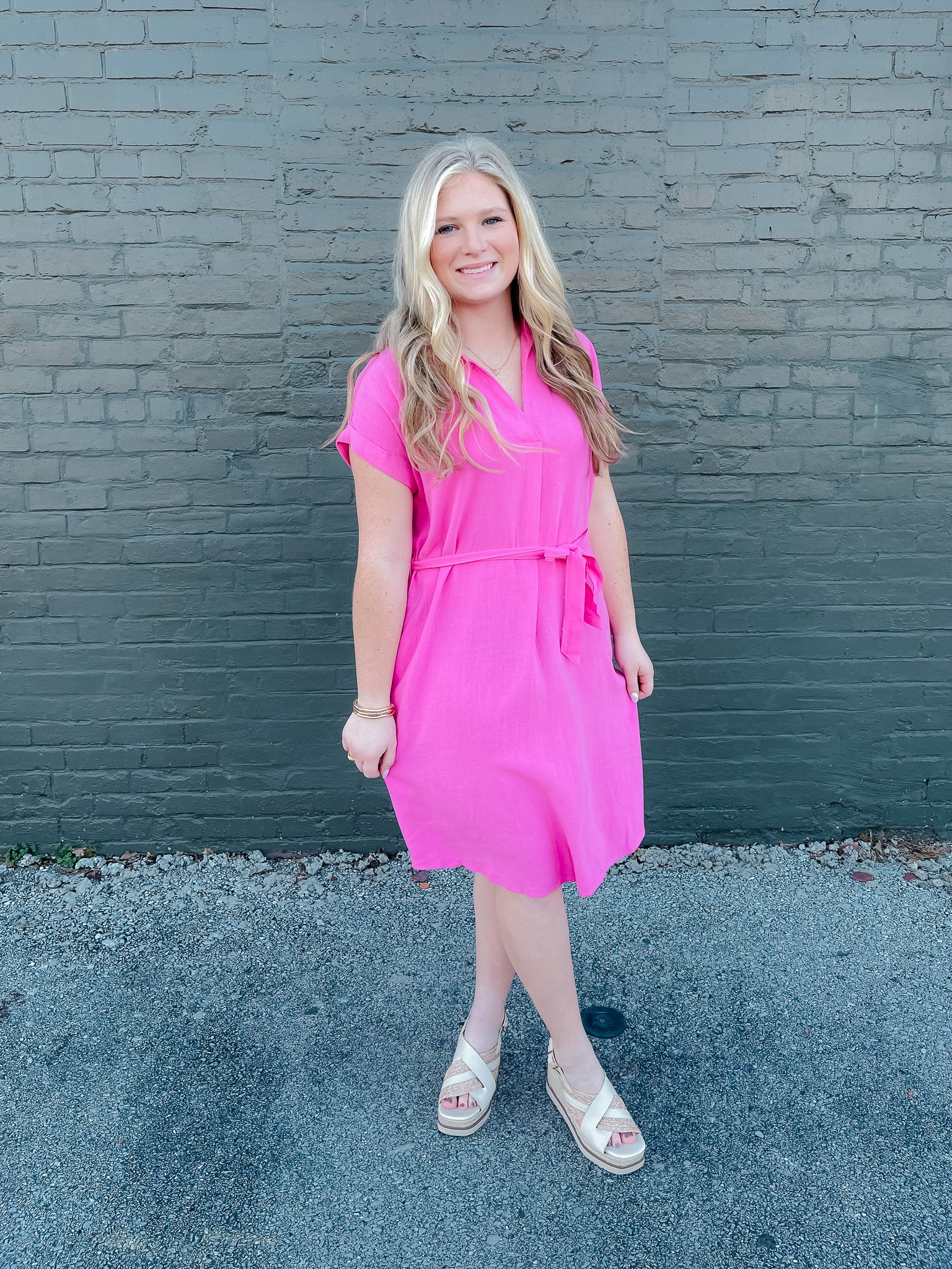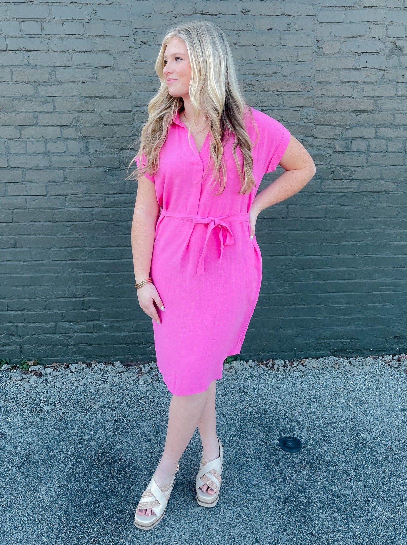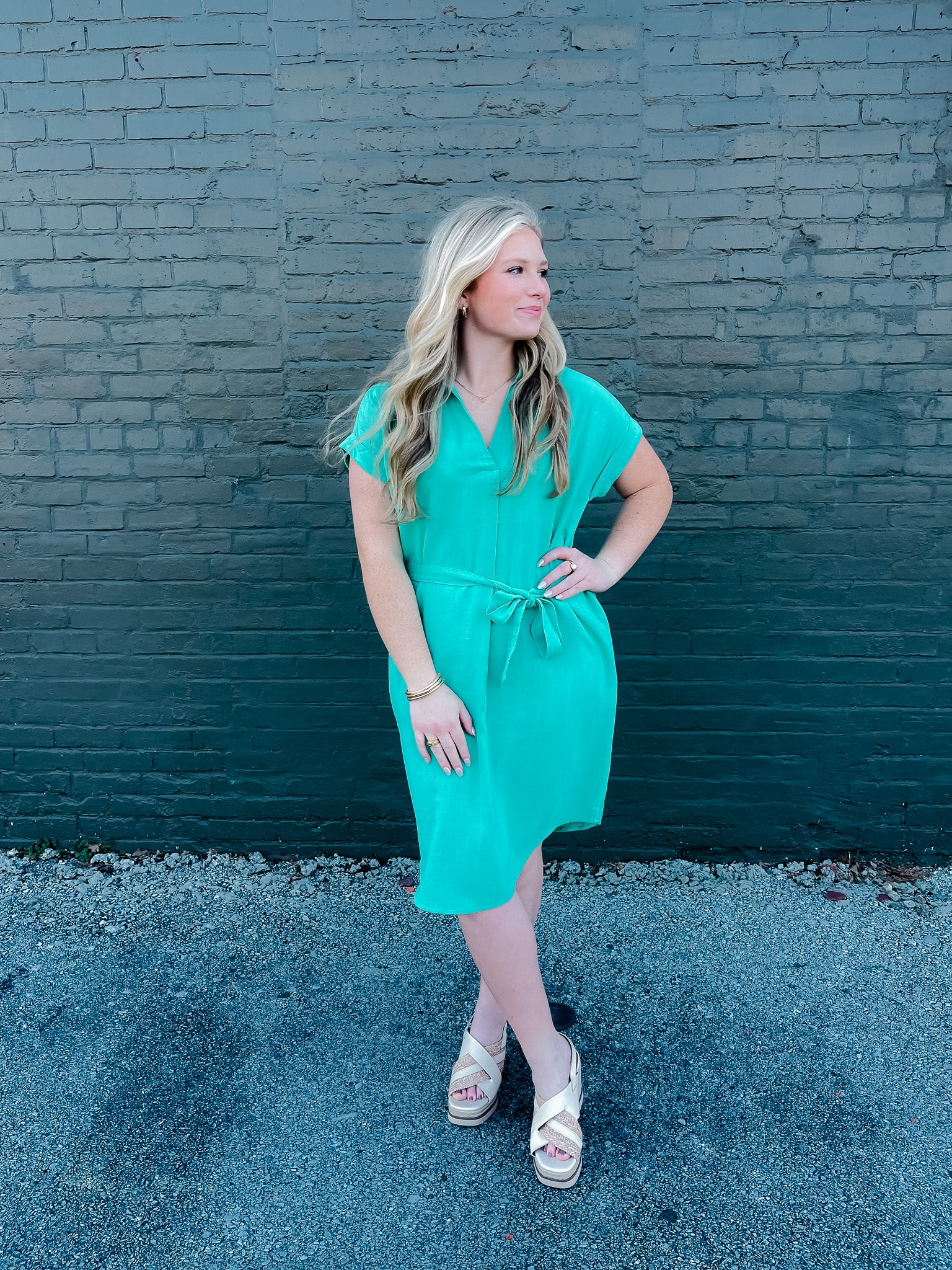 Dress features a solid base color, soft linen material, short sleeves, collar detailing, short dolman sleeves, tie waist detail and runs true to size!