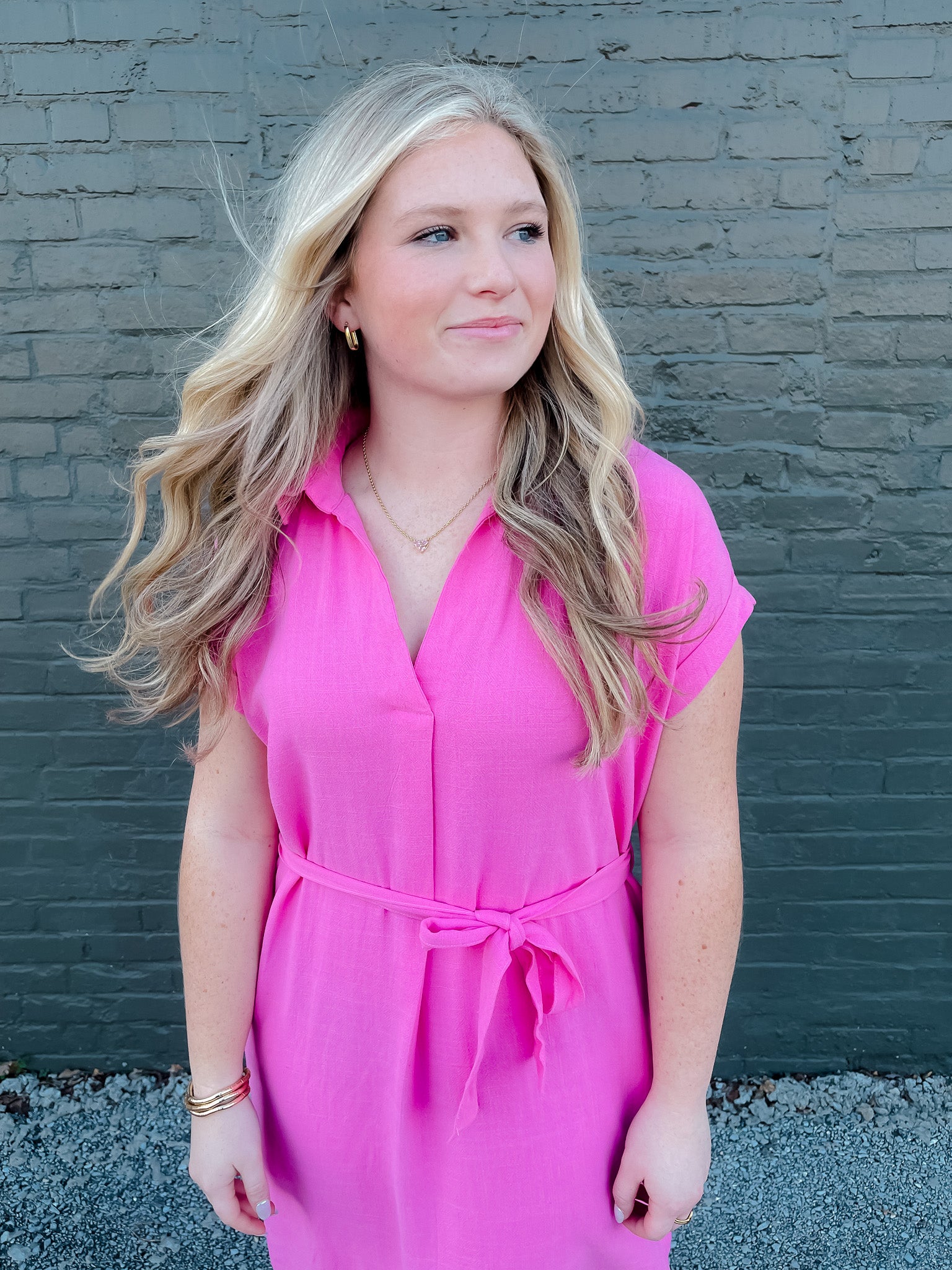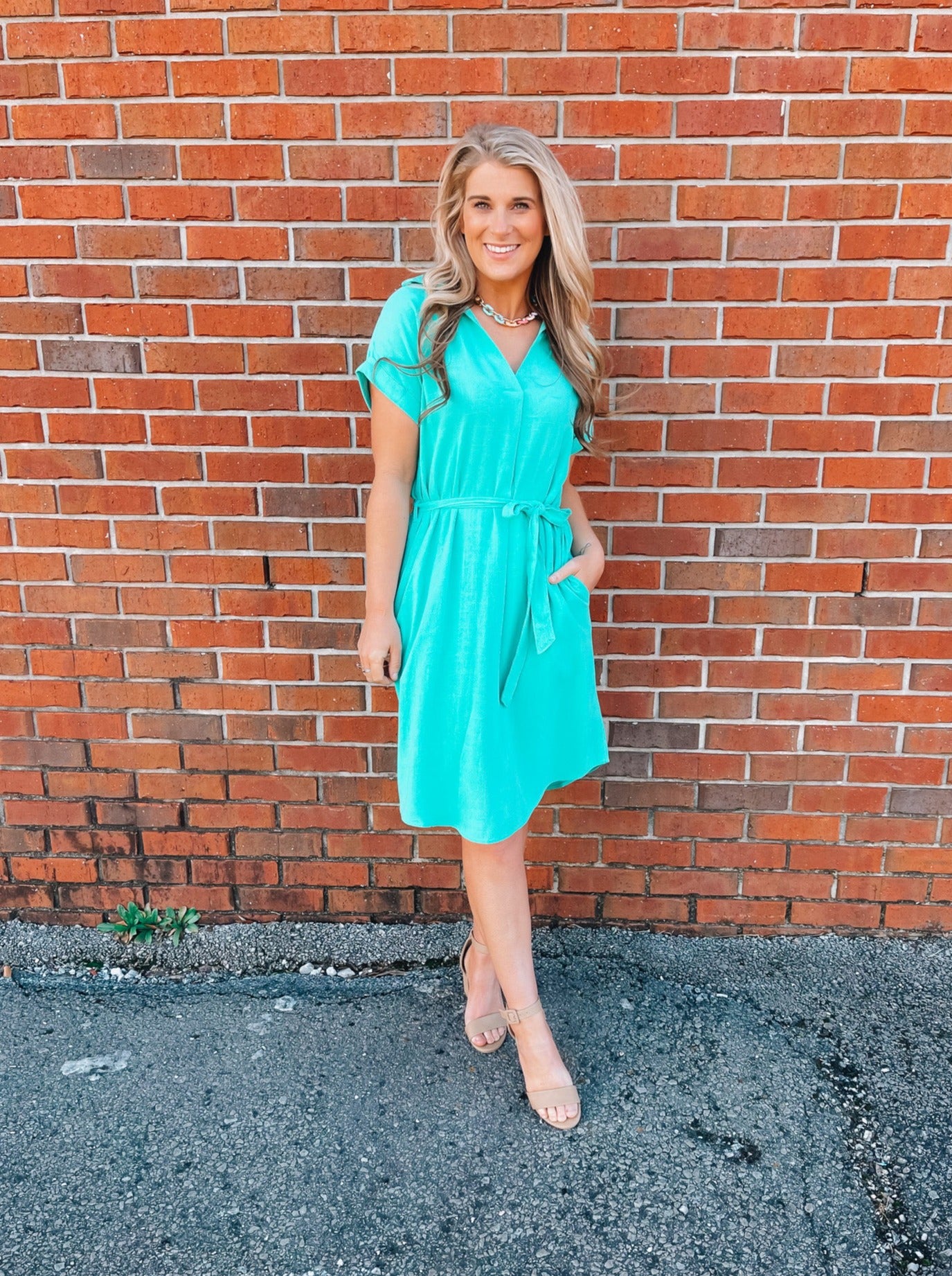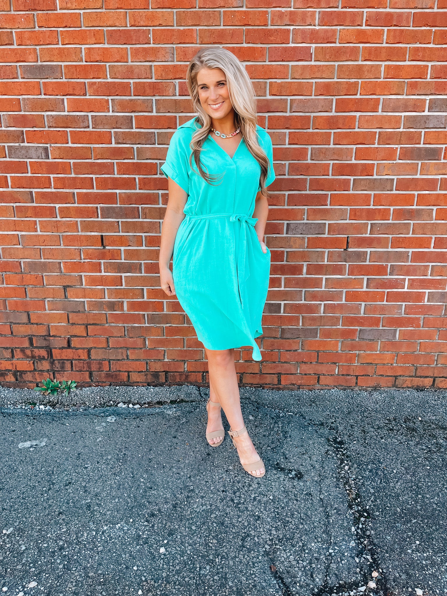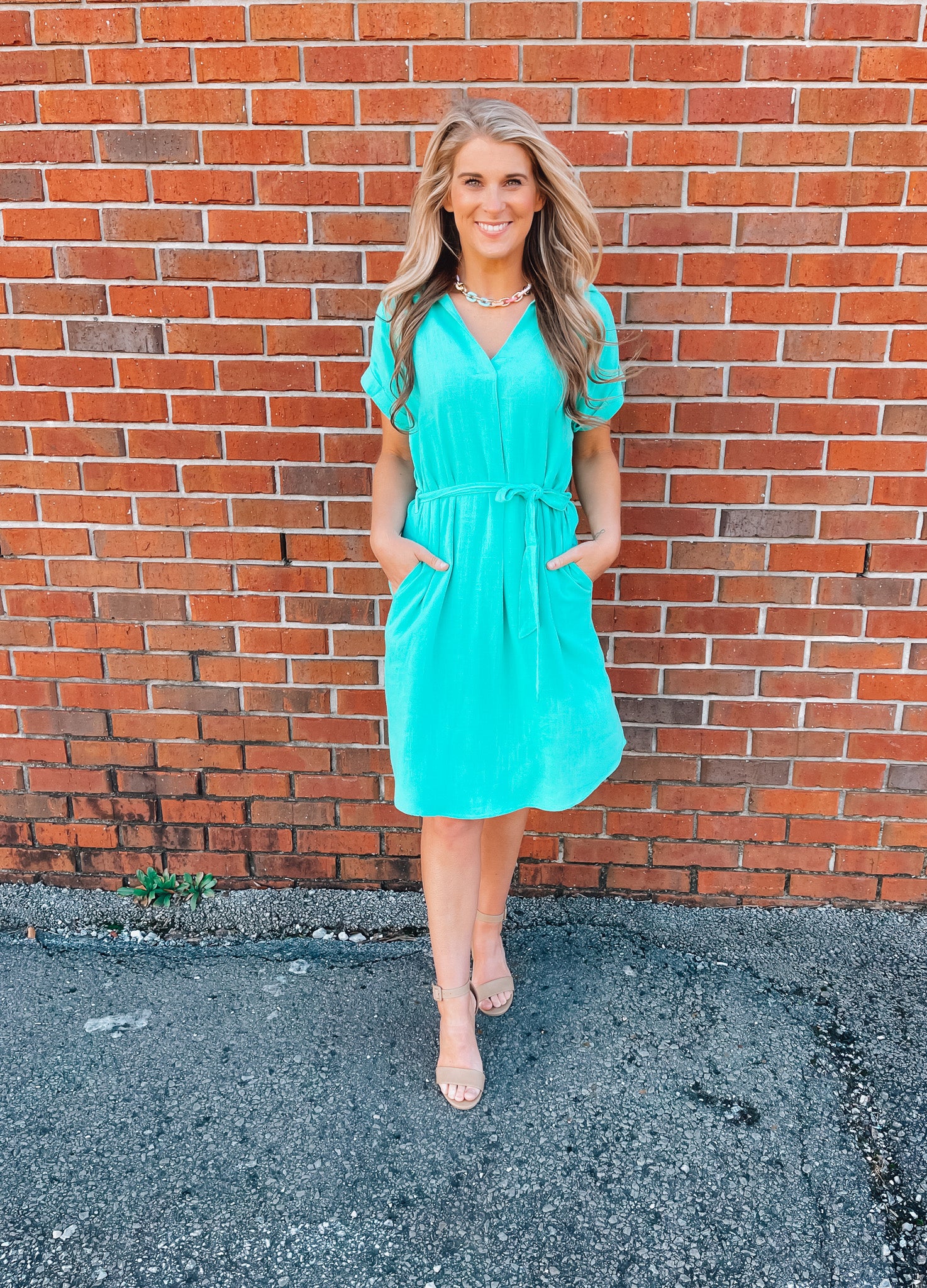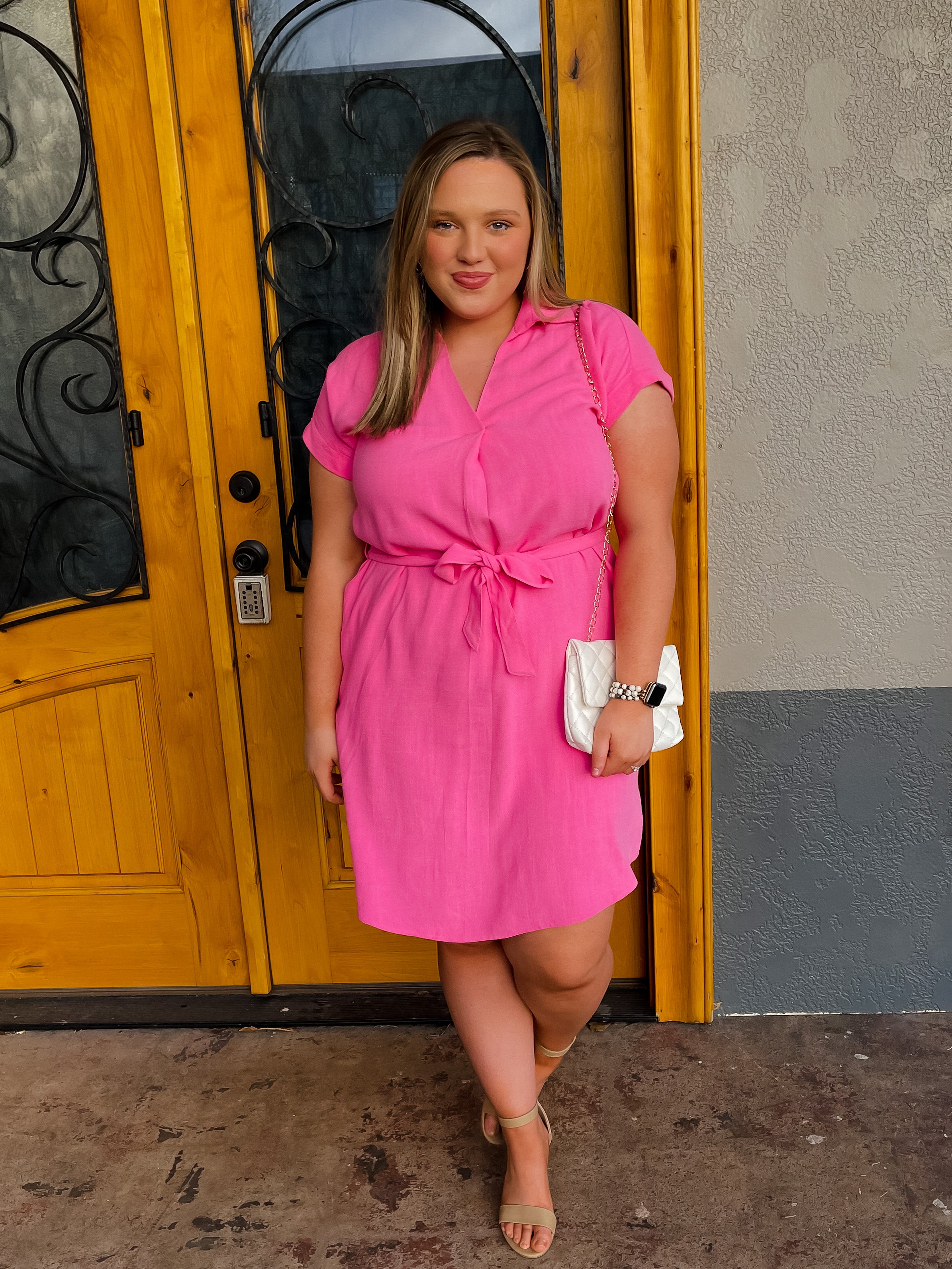 Dress features a solid base color, soft linen material, short sleeves, collar detailing, short dolman sleeves, tie waist detail and runs true to size!