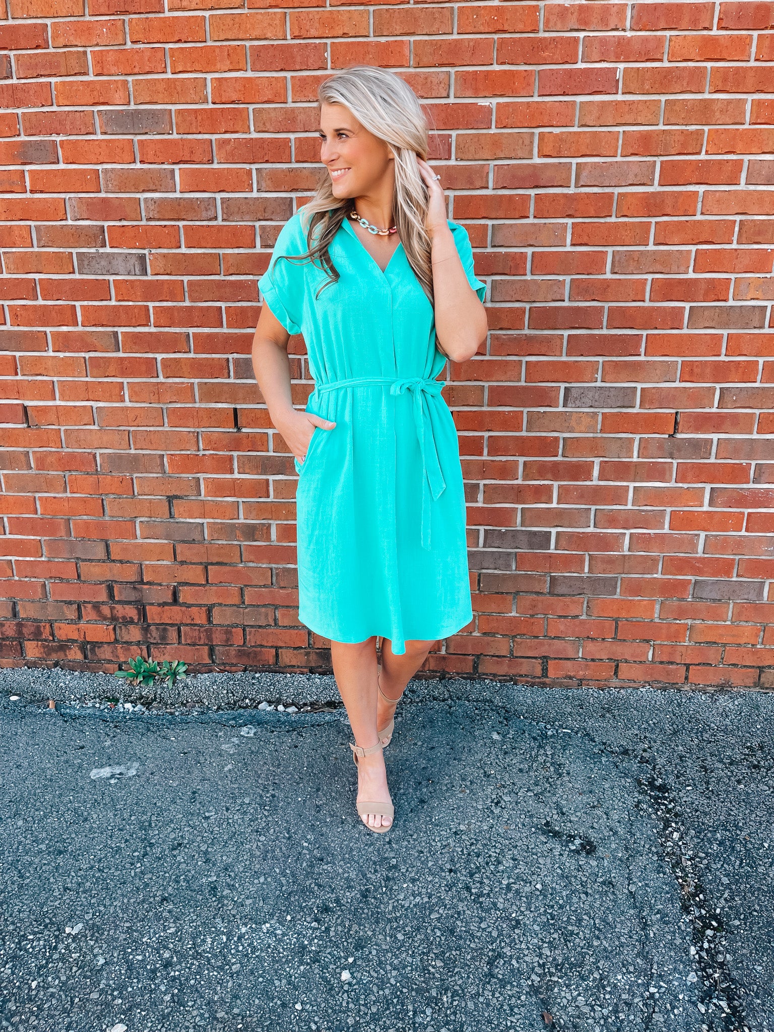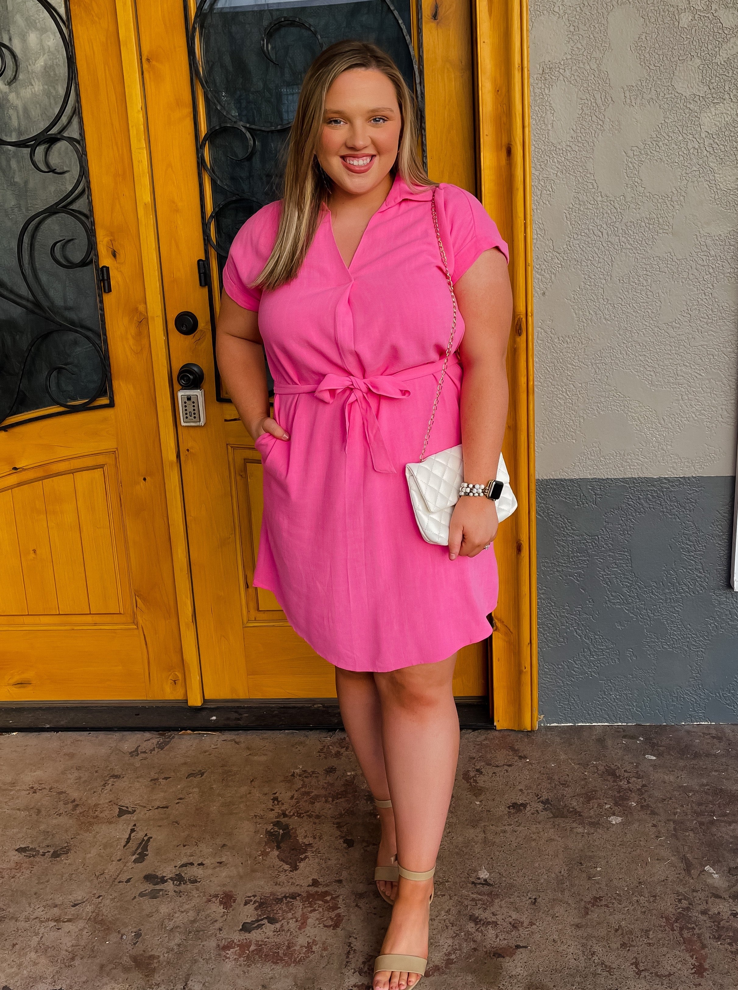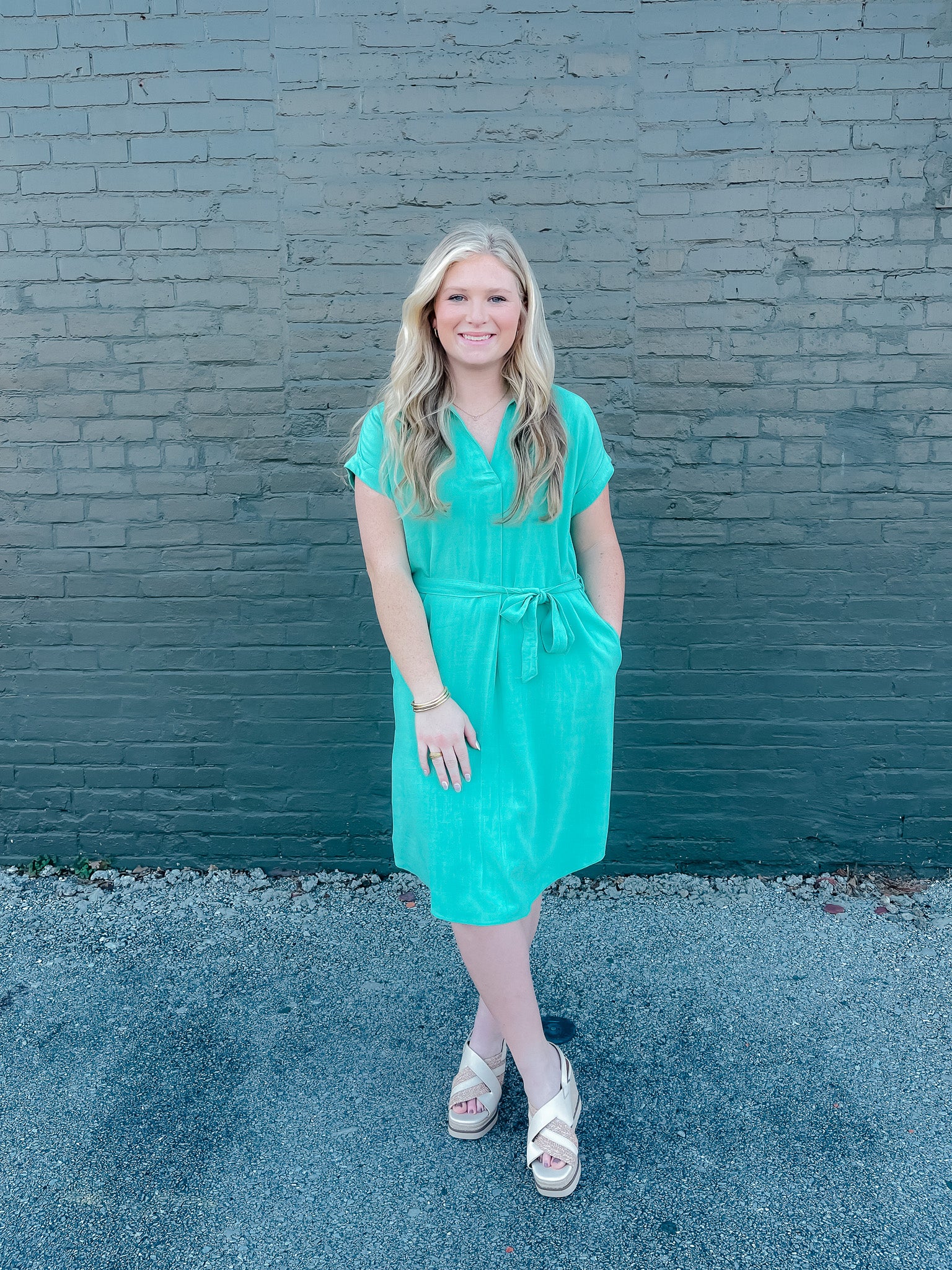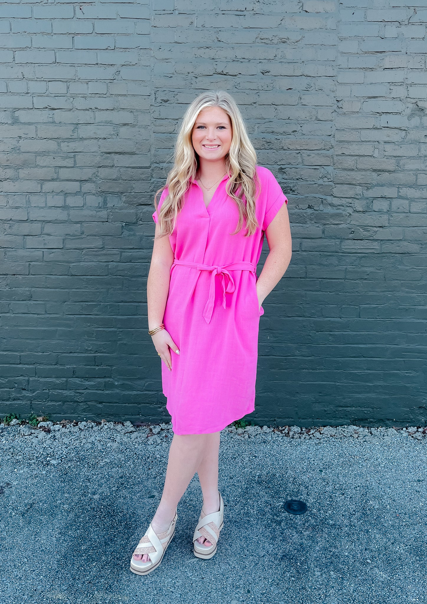 Dress features a solid base color, soft linen material, short sleeves, collar detailing, short dolman sleeves, tie waist detail and runs true to size!