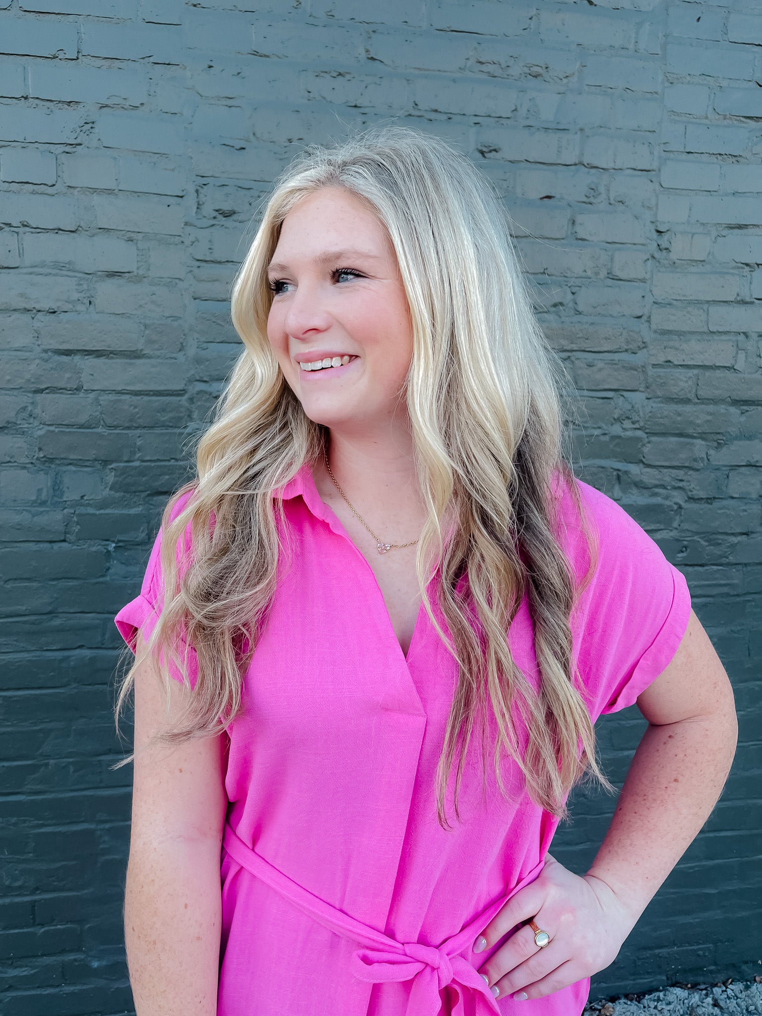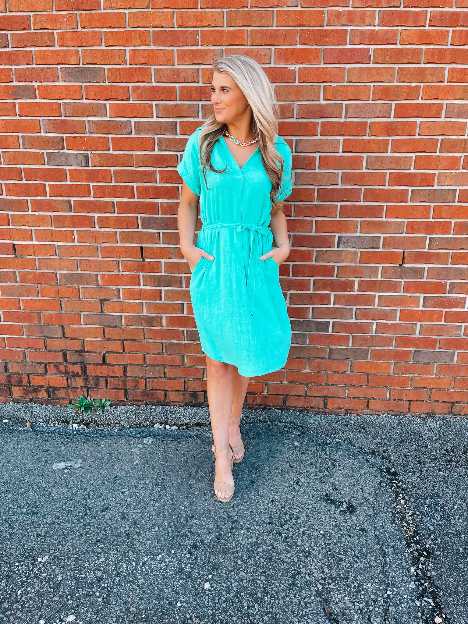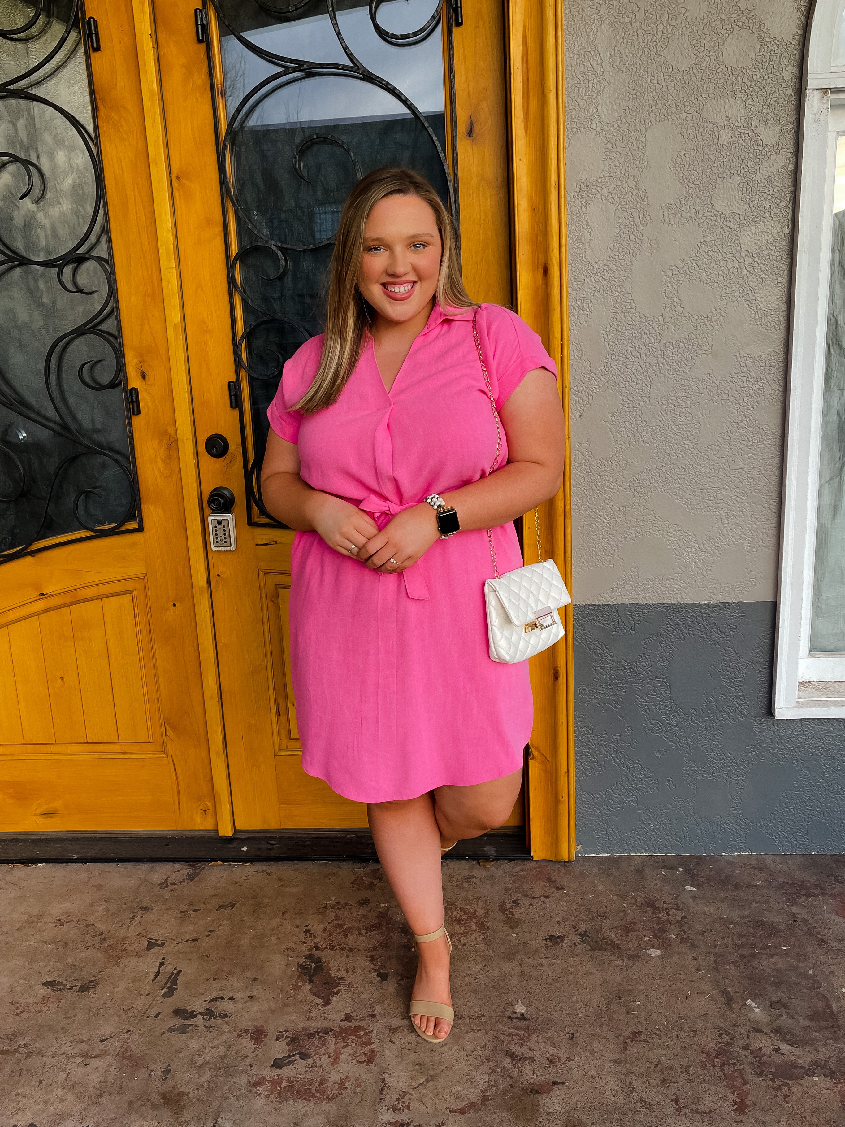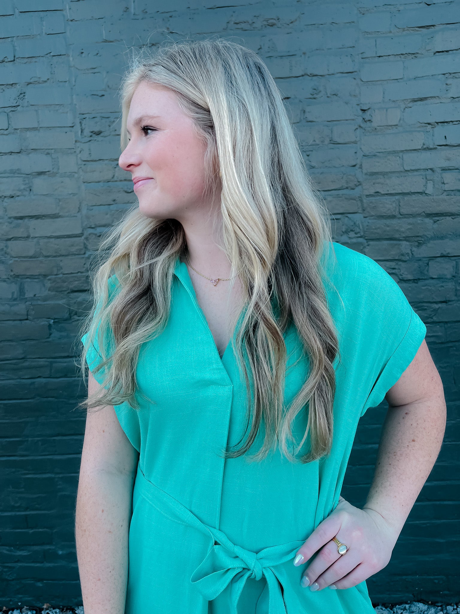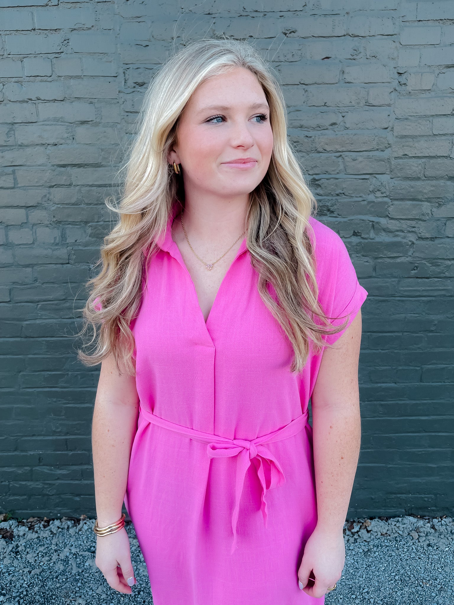 Dress features a solid base color, soft linen material, short sleeves, collar detailing, short dolman sleeves, tie waist detail and runs true to size!