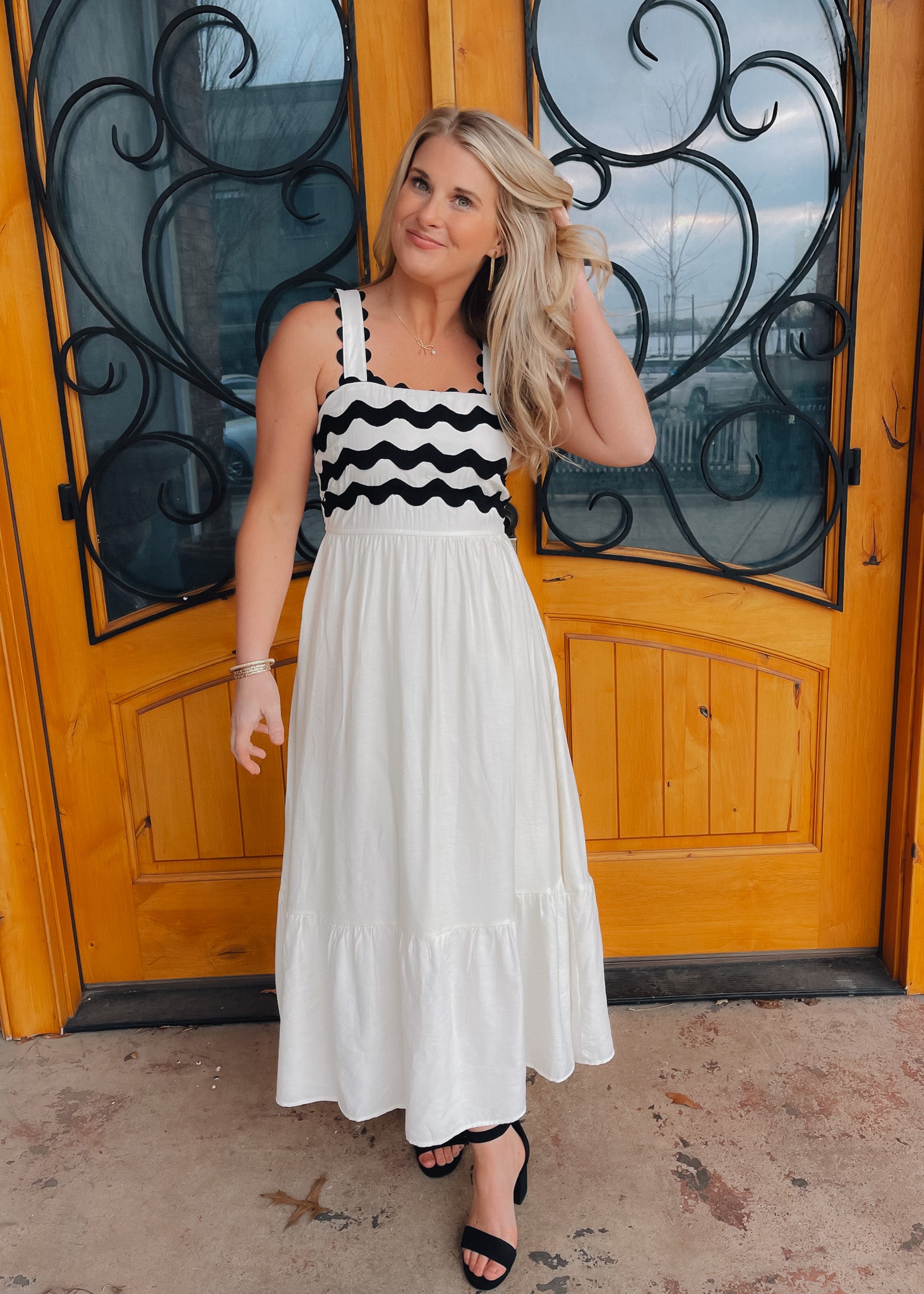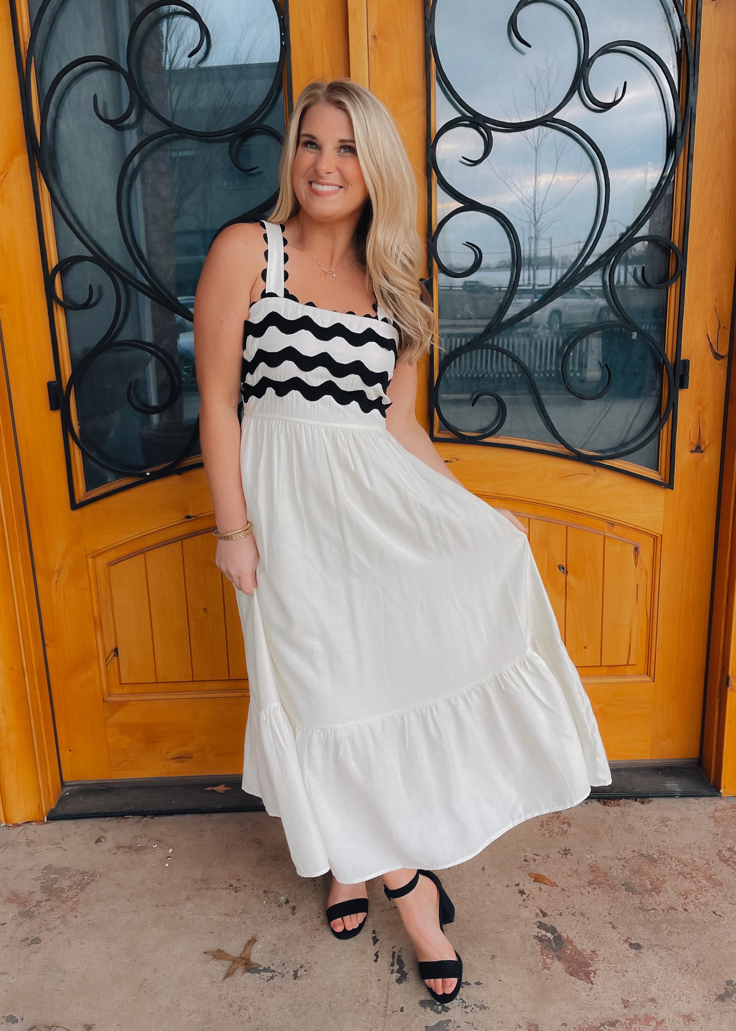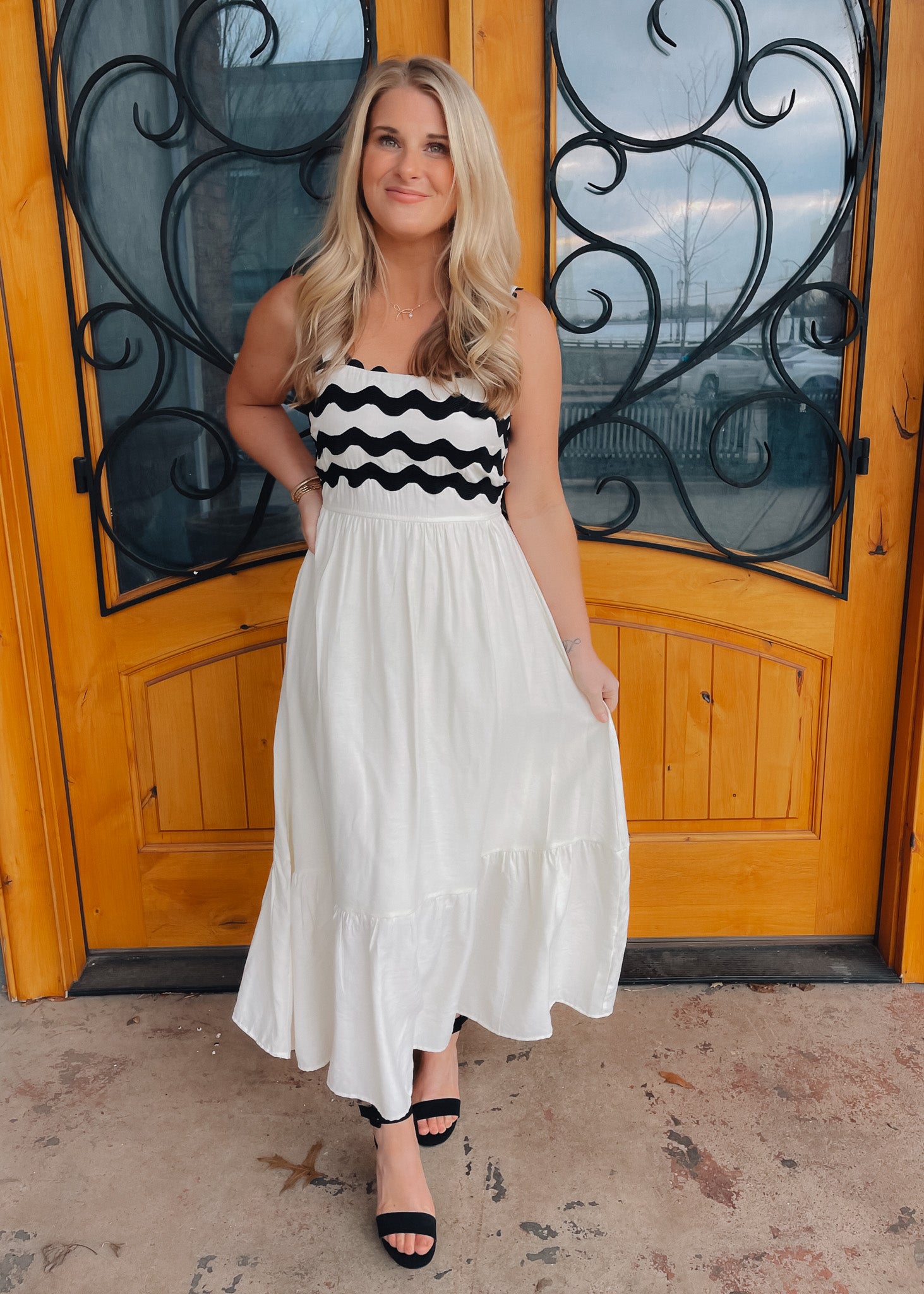 Elegantly chic and timeless, The One I Adore Midi Dress is a cream-colored midi dress with a touch of sophistication. The black trim detail on the top and straps adds a touch of elegance to this stunning piece. Perfect for any occasion, it will be the dress you can't help but fall in love with.