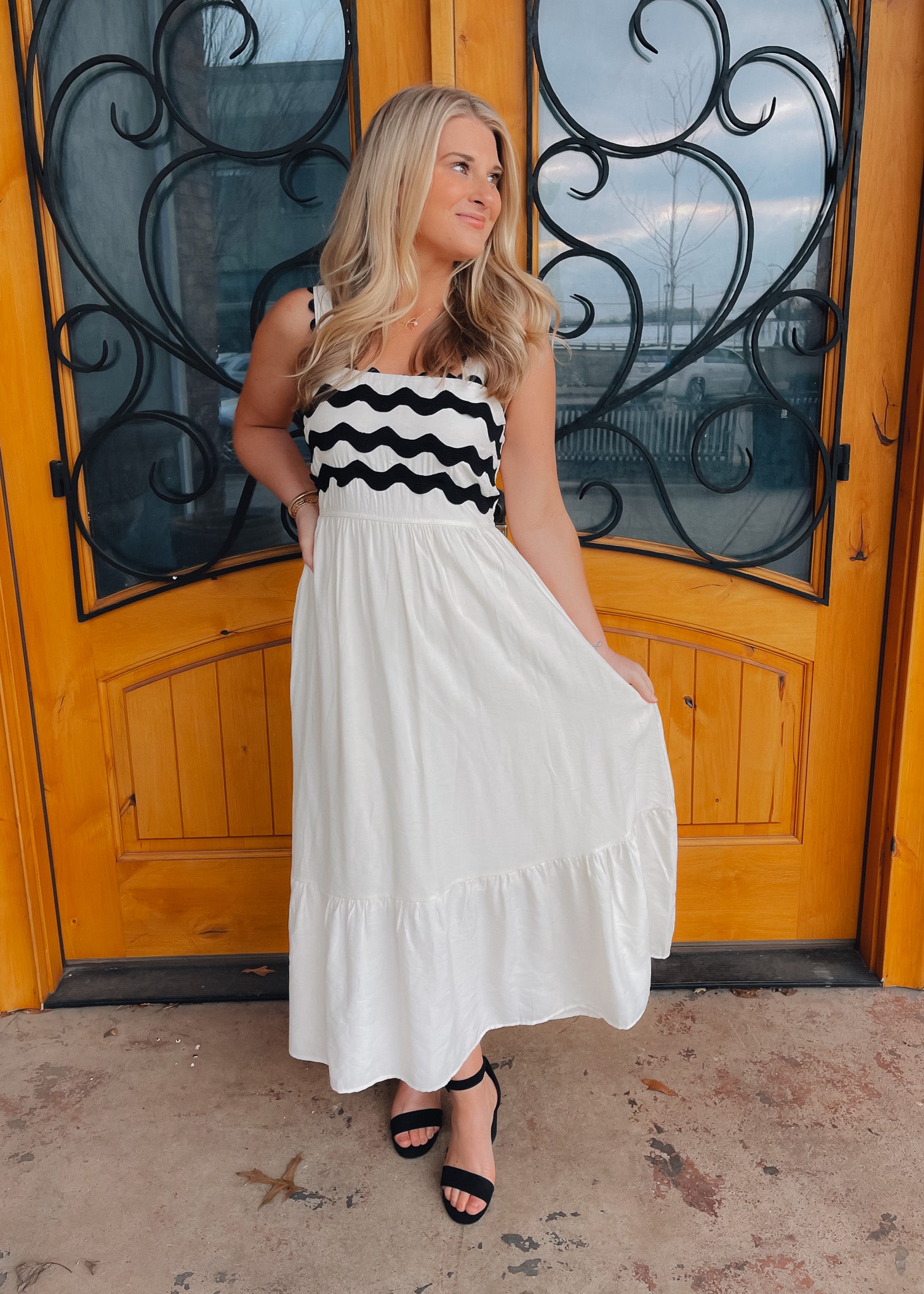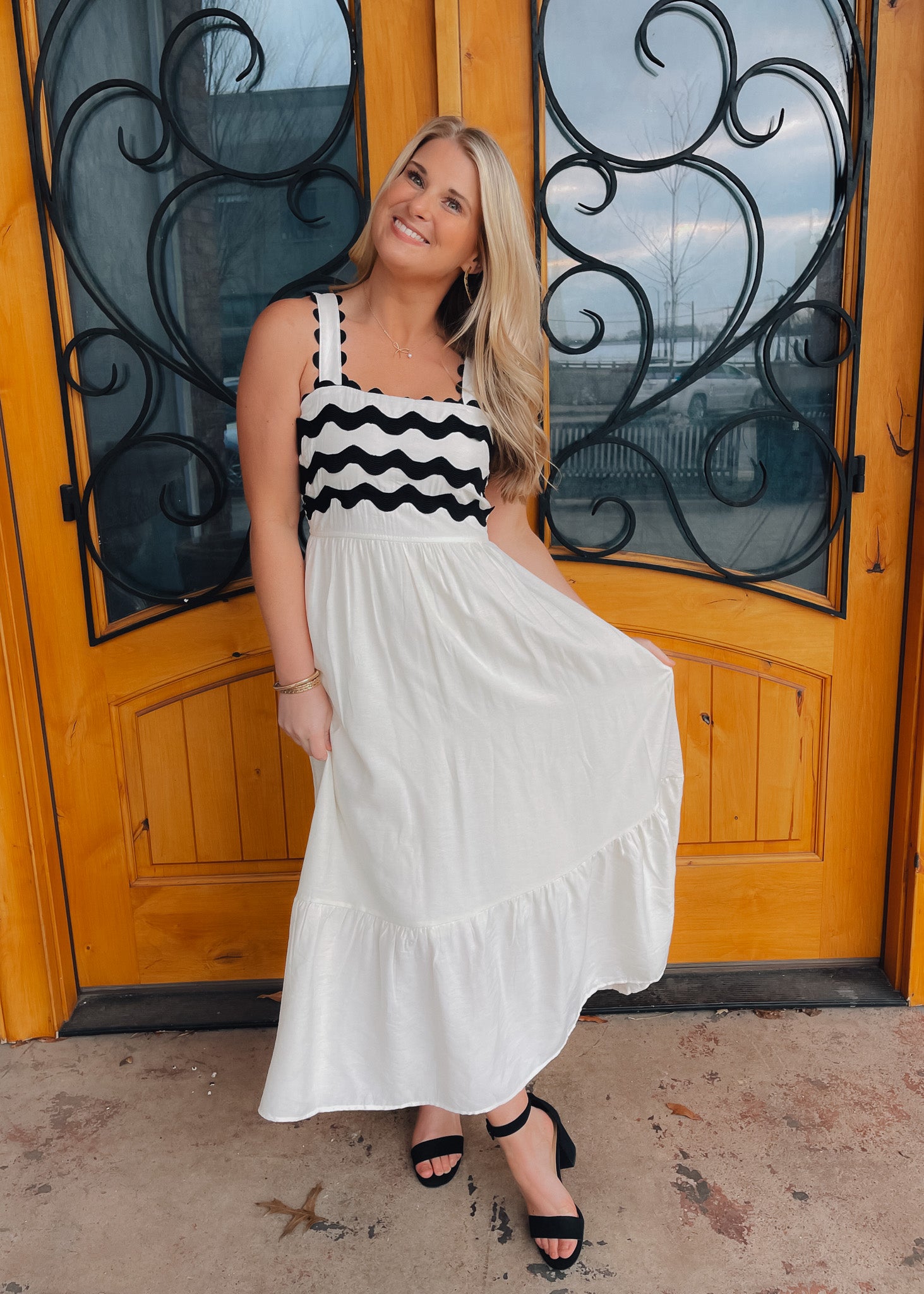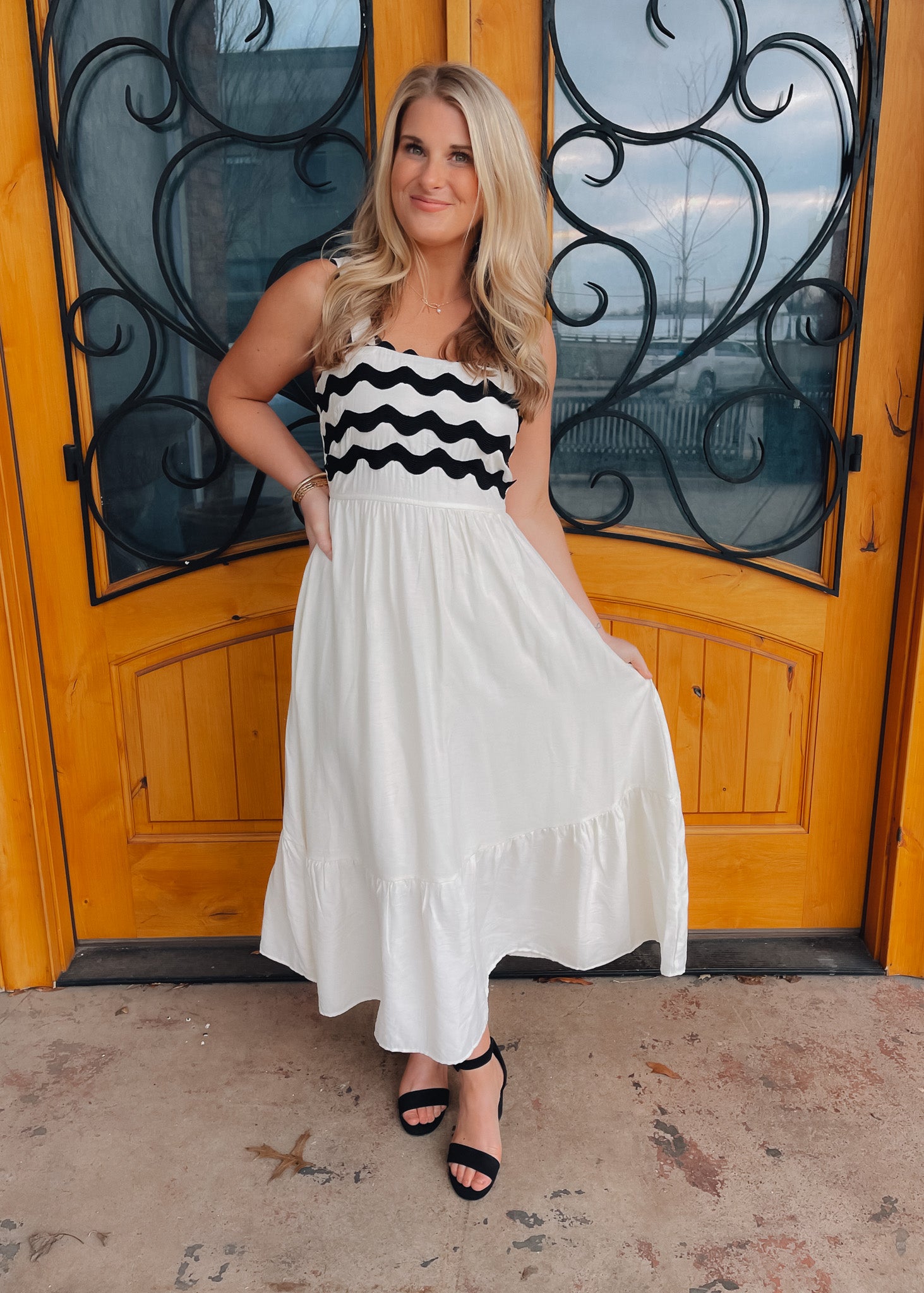 Elegantly chic and timeless, The One I Adore Midi Dress is a cream-colored midi dress with a touch of sophistication. The black trim detail on the top and straps adds a touch of elegance to this stunning piece. Perfect for any occasion, it will be the dress you can't help but fall in love with.