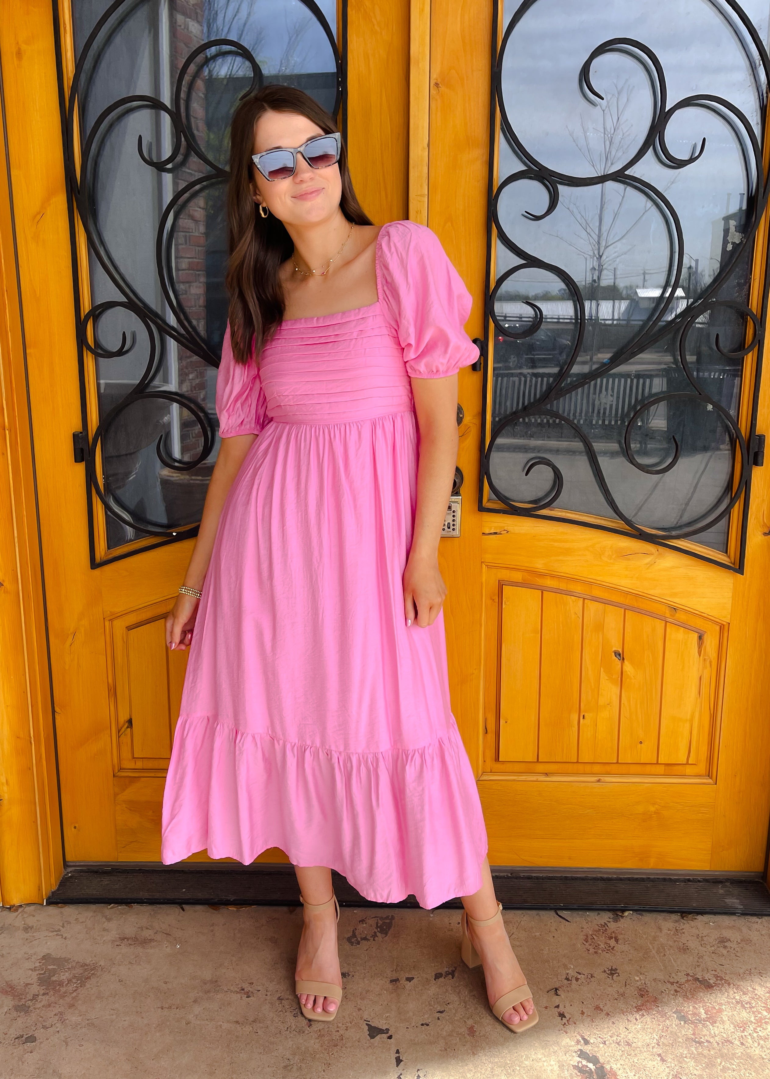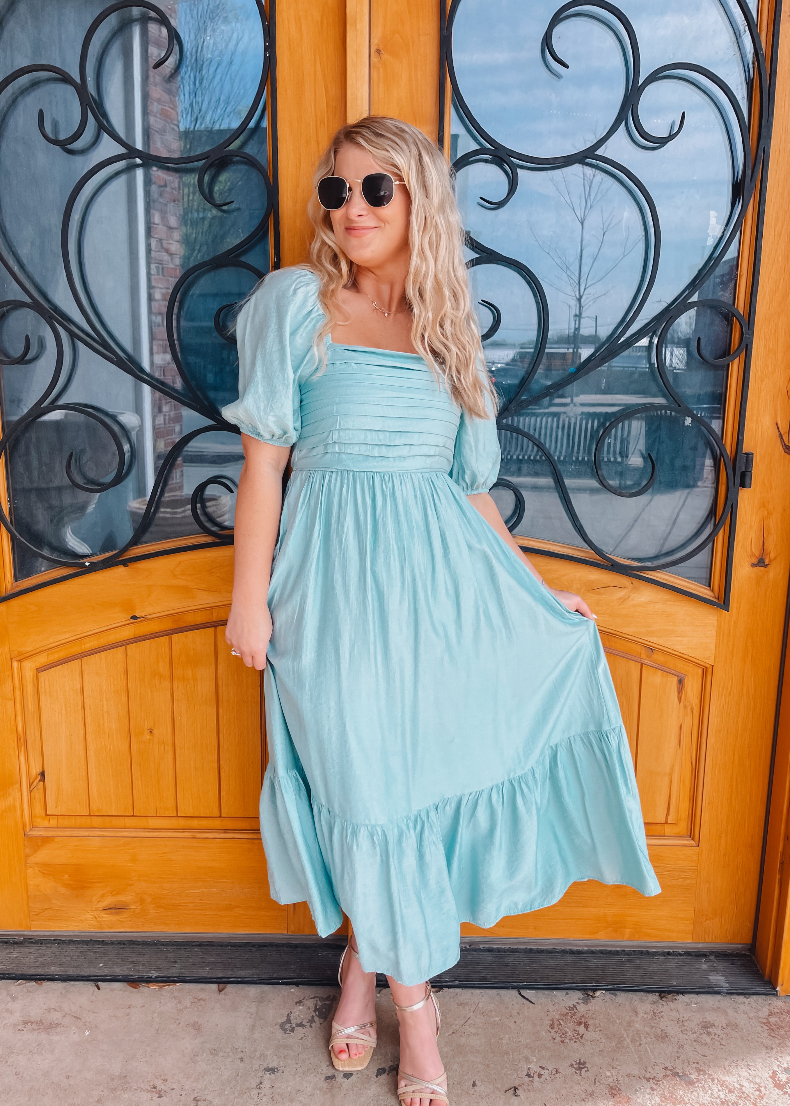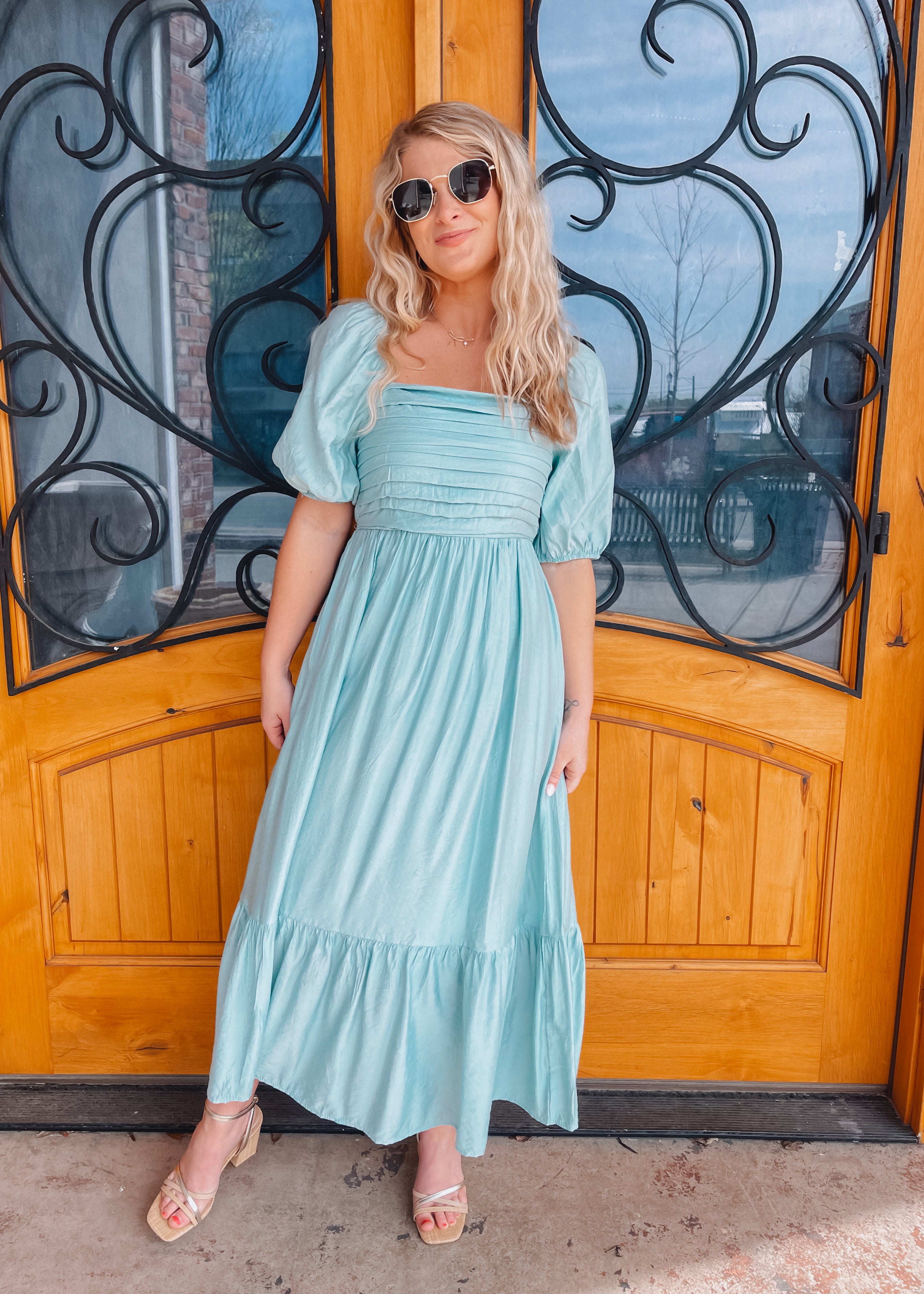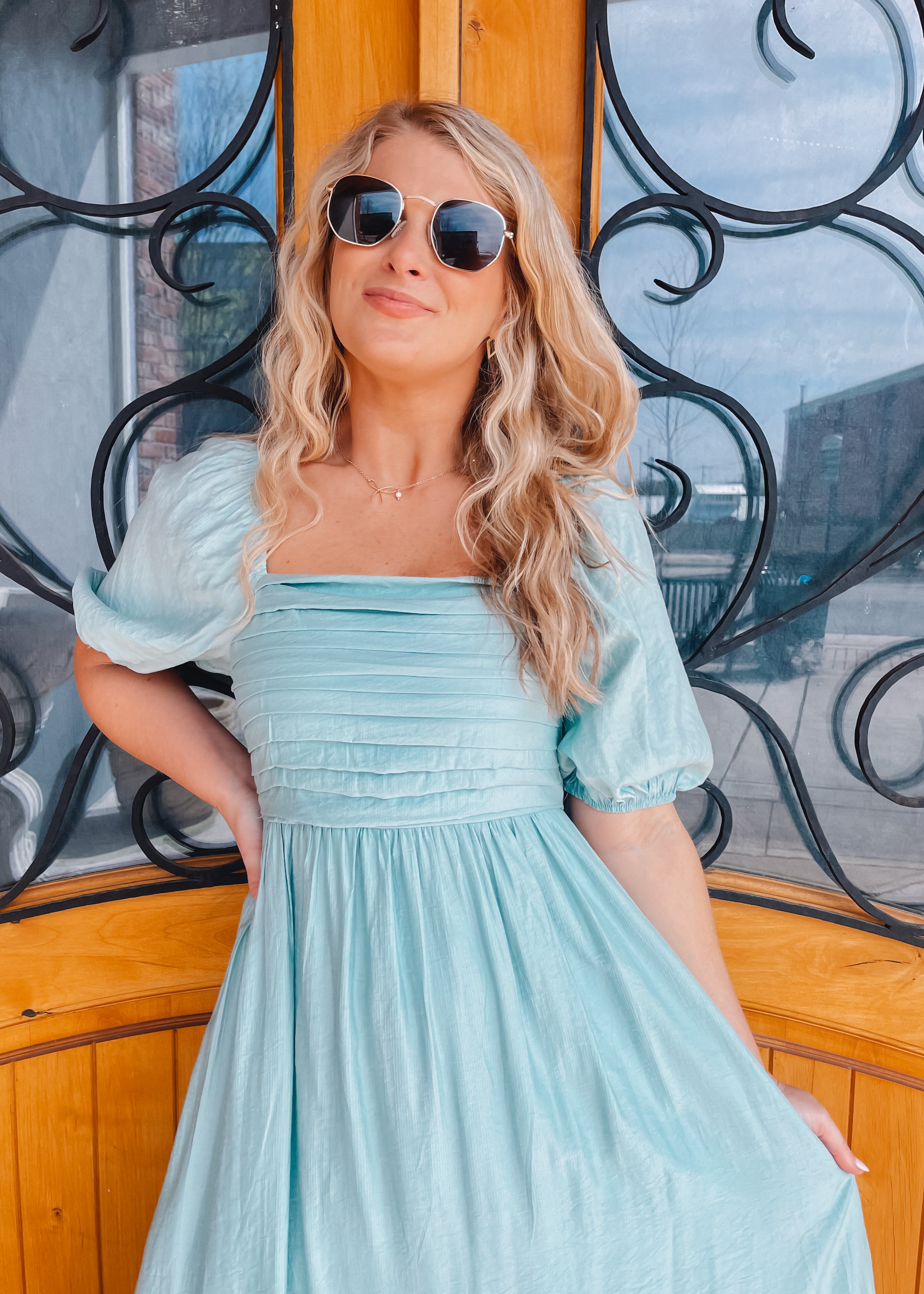 Be the only reason for all eyes on you in The Only Reason Midi Dress. With its mint and pink pleated empire waist, puff sleeves, and playful midi length, this dress is the perfect mix of flirty and stylish. So go ahead, make a statement and let this dress do the talking (and flirting!) for you!