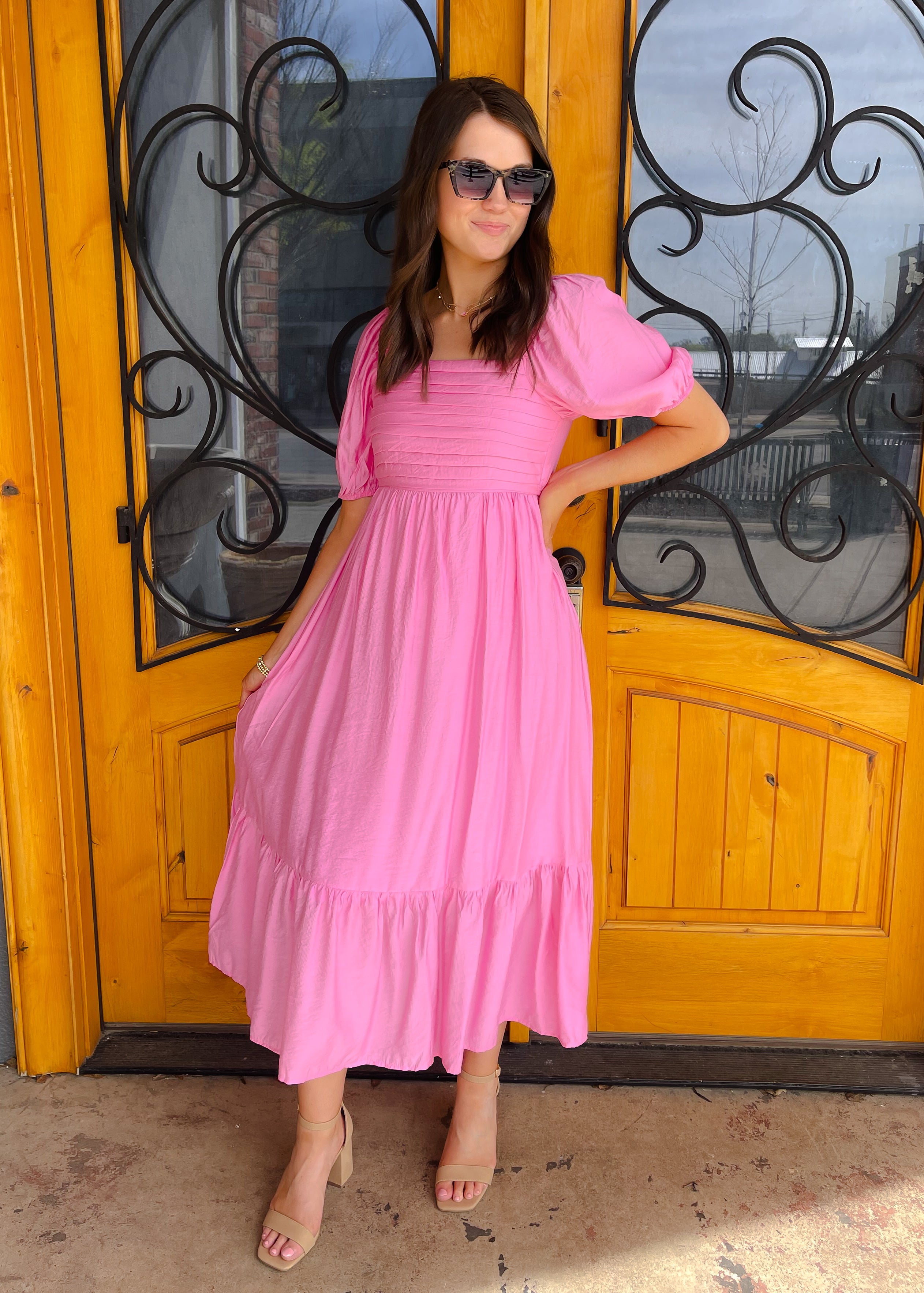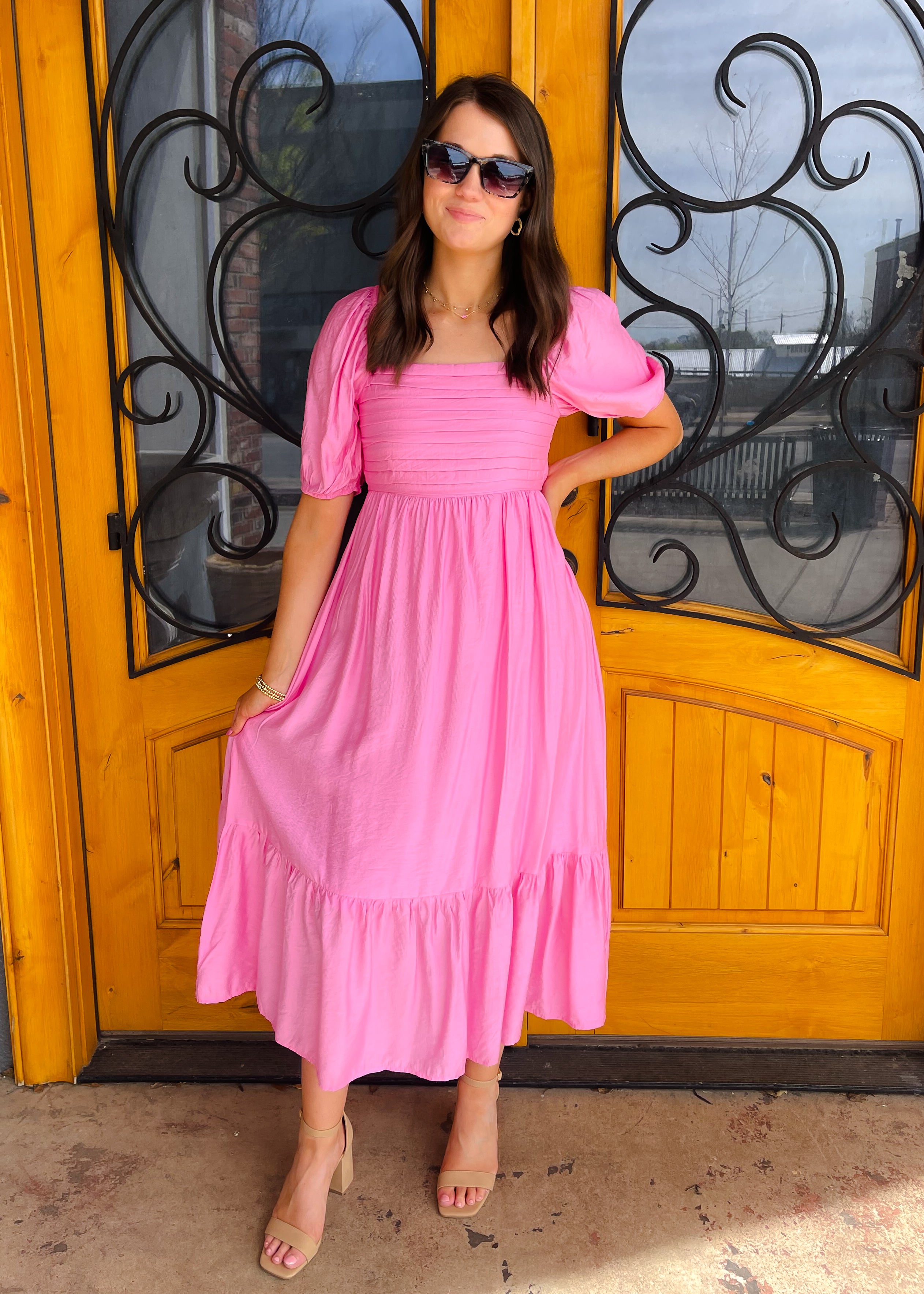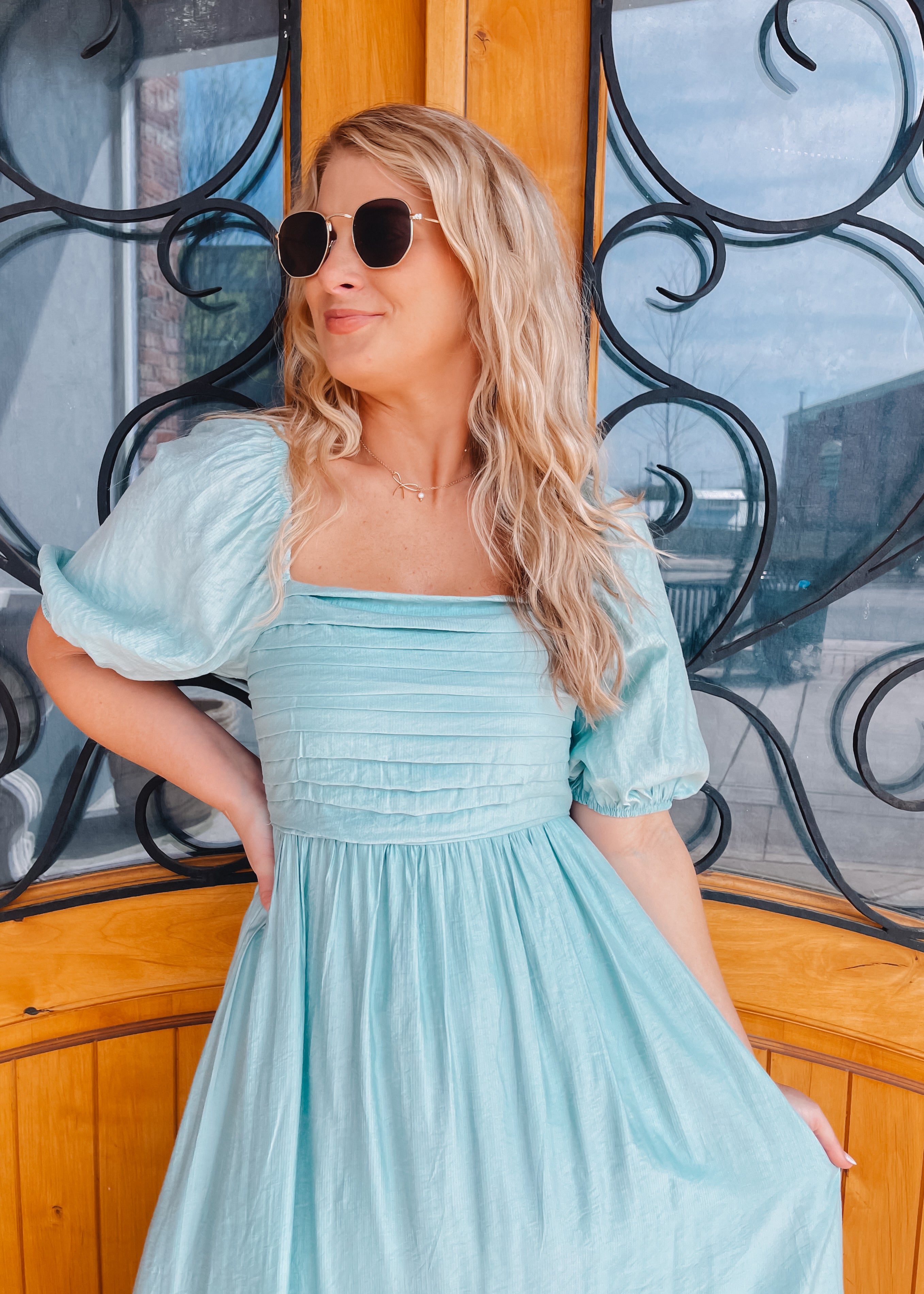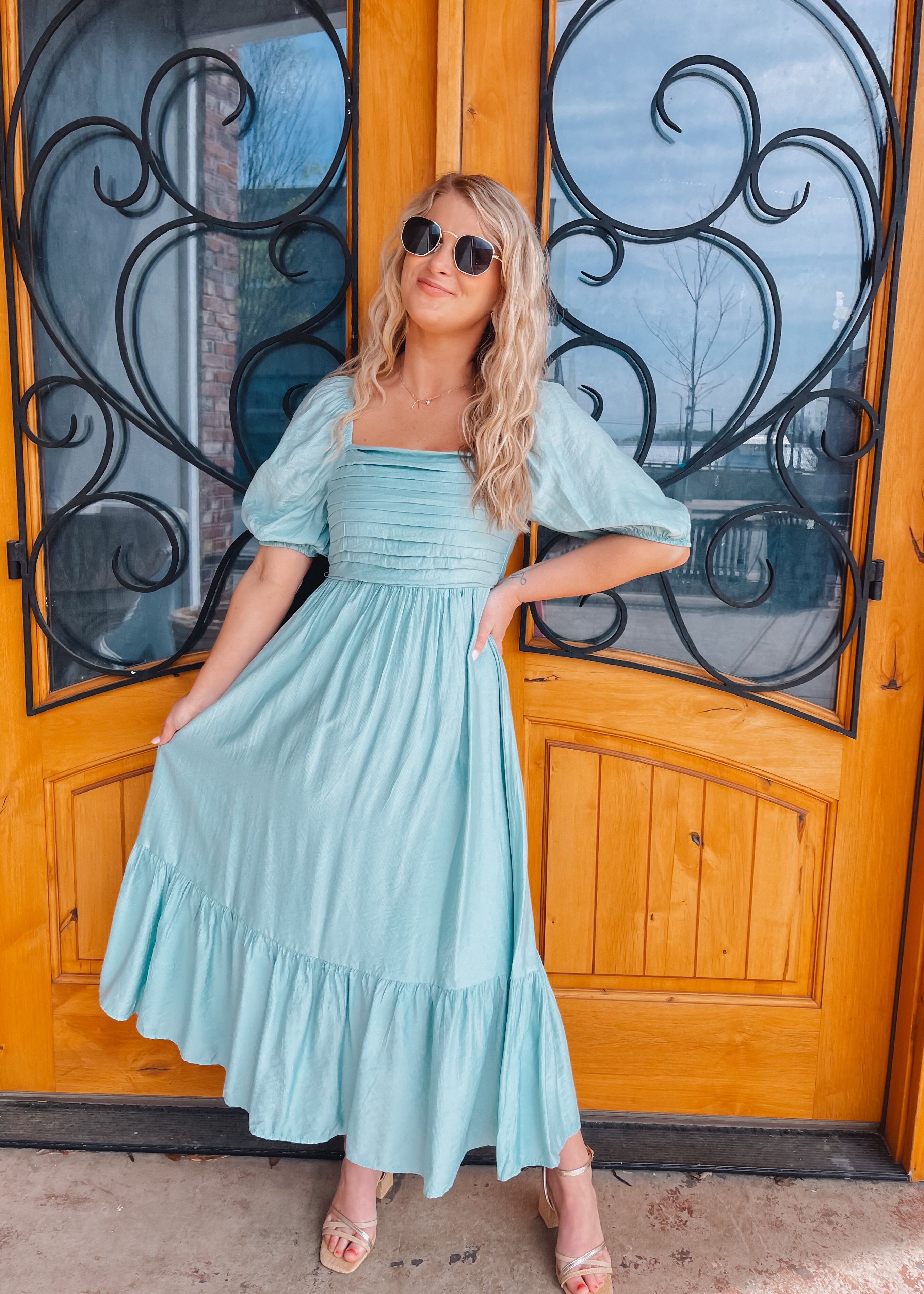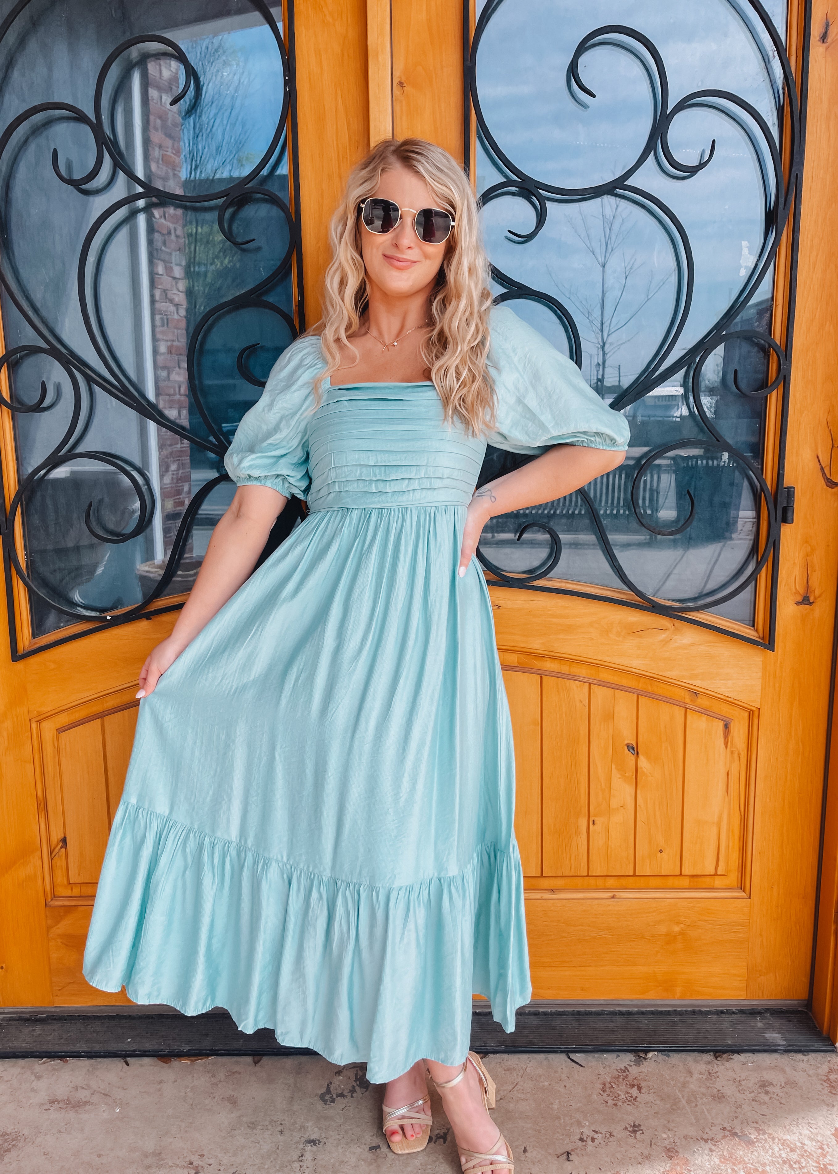 Be the only reason for all eyes on you in The Only Reason Midi Dress. With its mint and pink pleated empire waist, puff sleeves, and playful midi length, this dress is the perfect mix of flirty and stylish. So go ahead, make a statement and let this dress do the talking (and flirting!) for you!