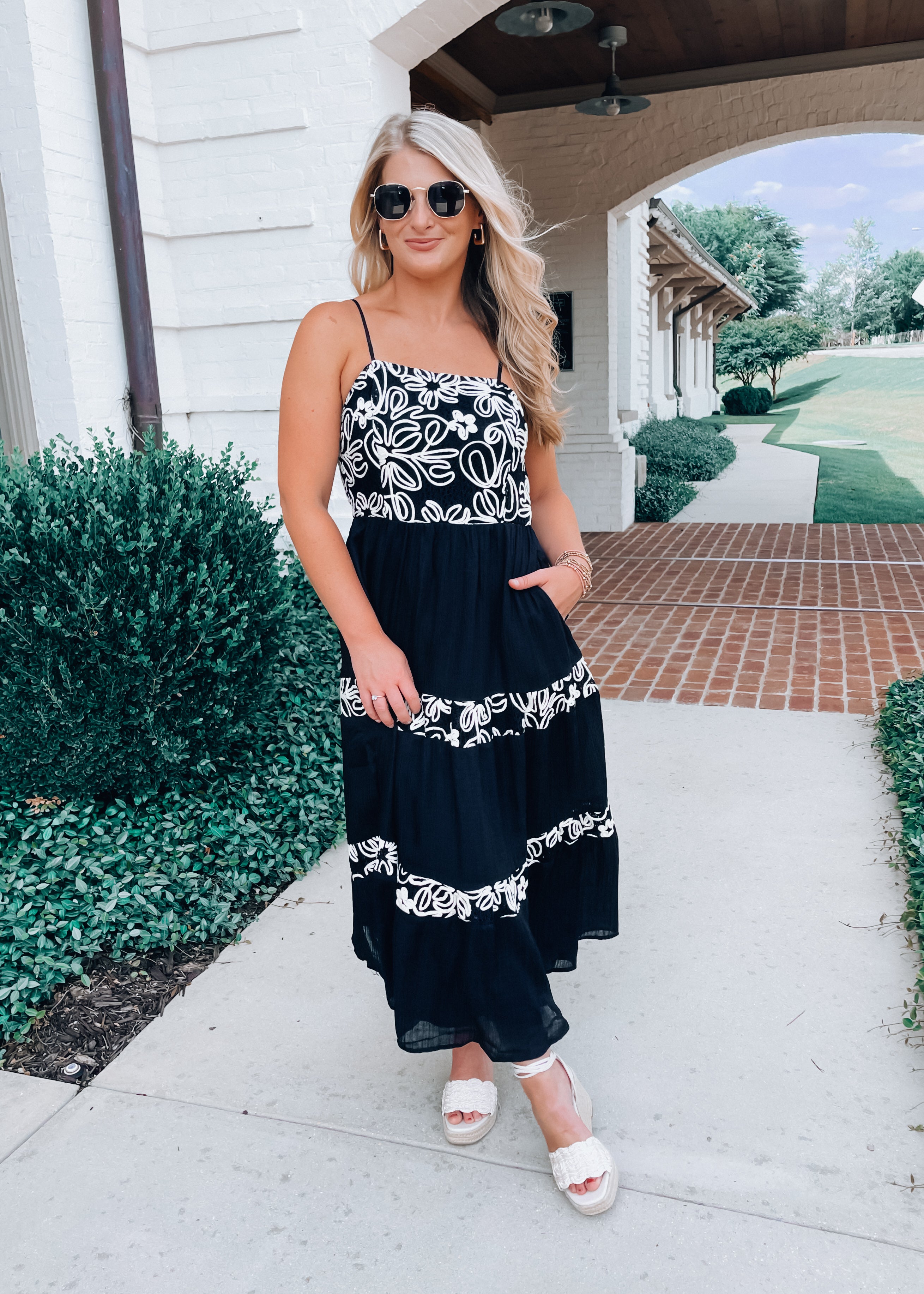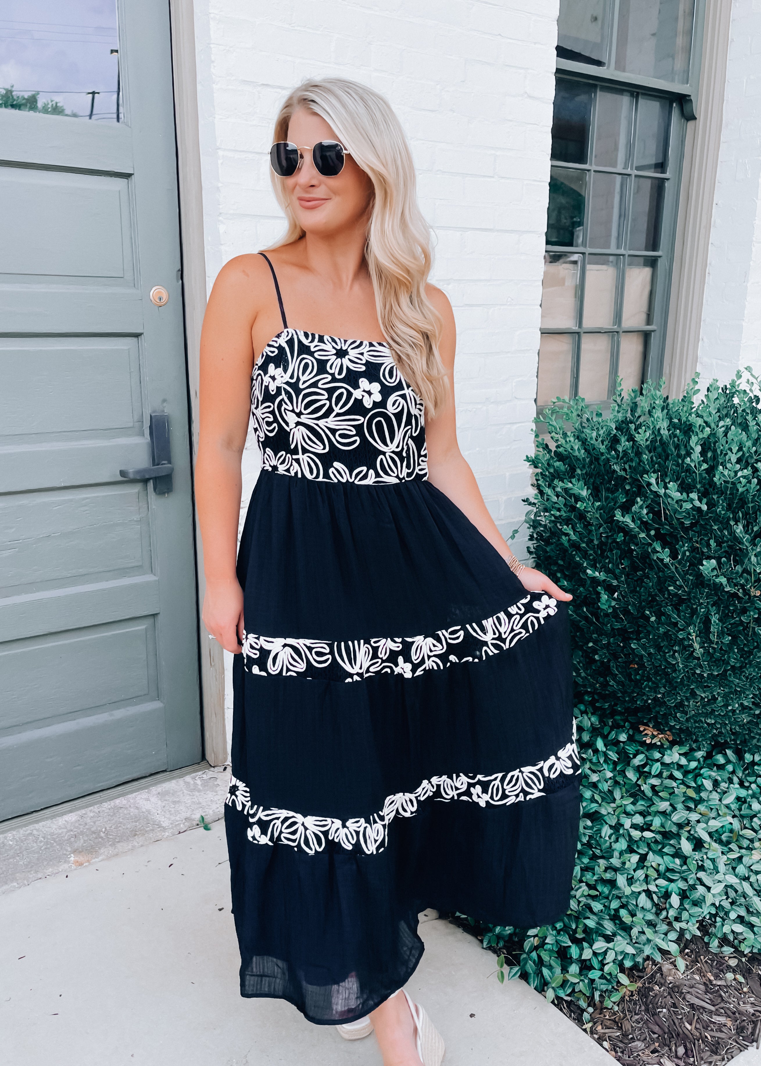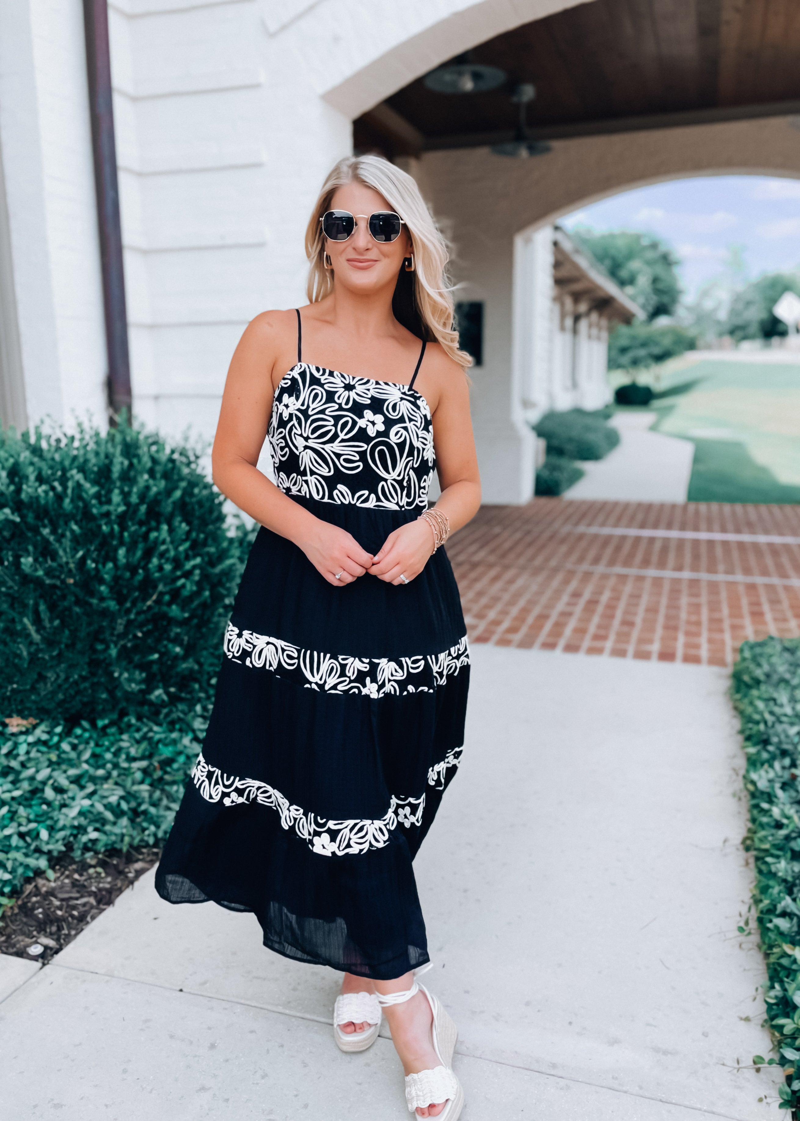 Elevate your wardrobe with our stunning black midi dress, beautifully adorned with delicate white floral stitching. The adjustable straps ensure a perfect fit for any body type, allowing you to customize your comfort and style. This versatile piece transitions effortlessly from day to evening, making it an essential addition to your collection. Don't miss the opportunity to make this elegant statement piece yours today.