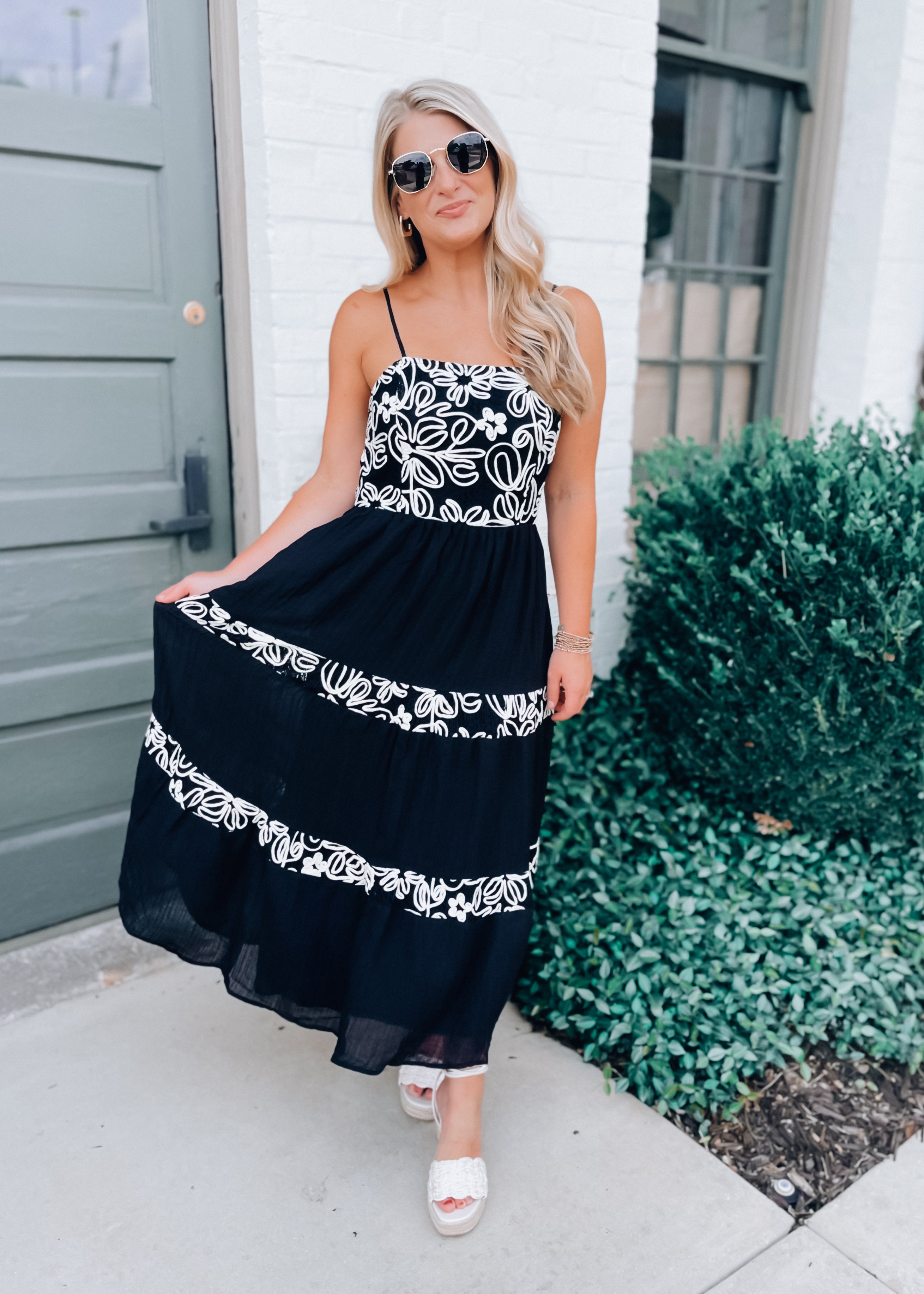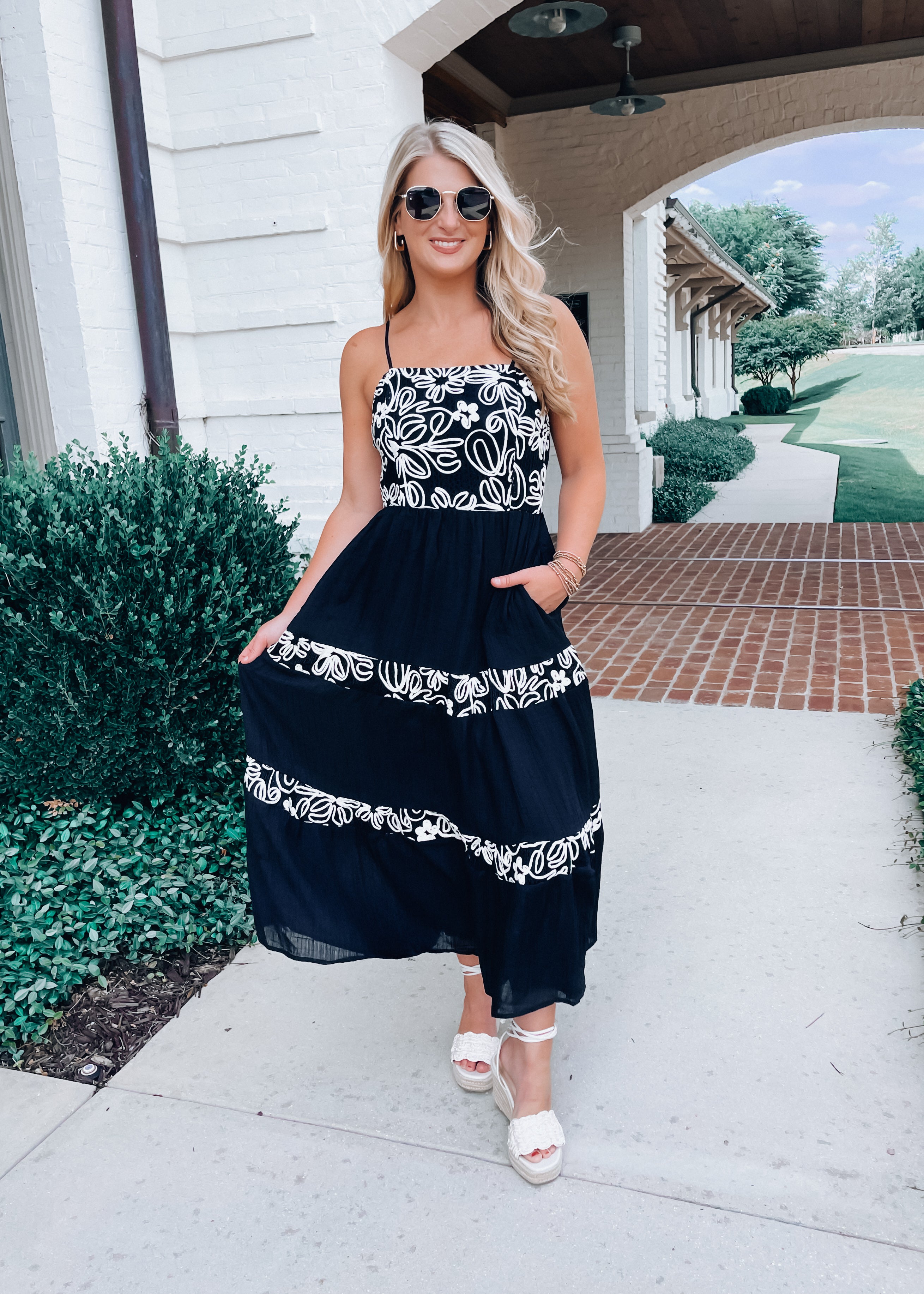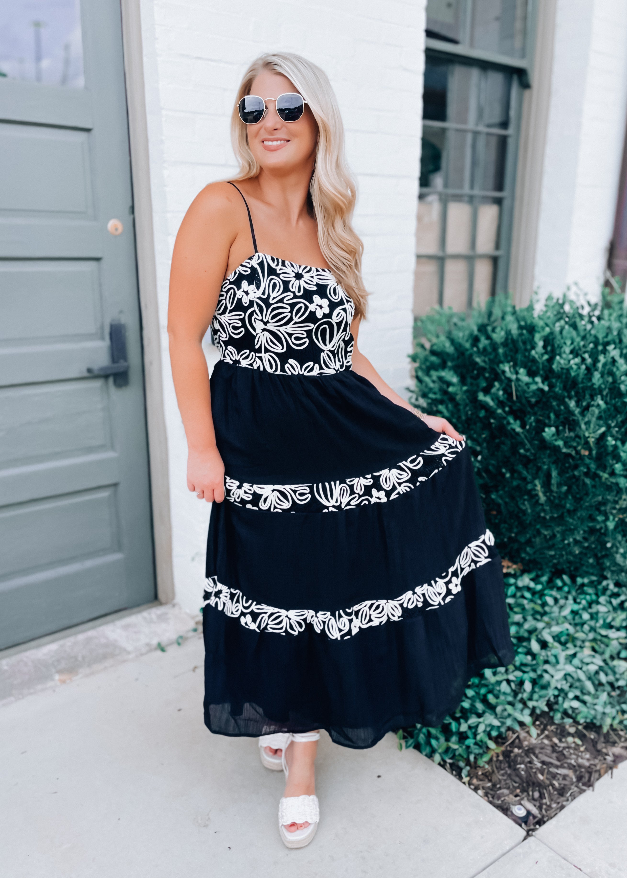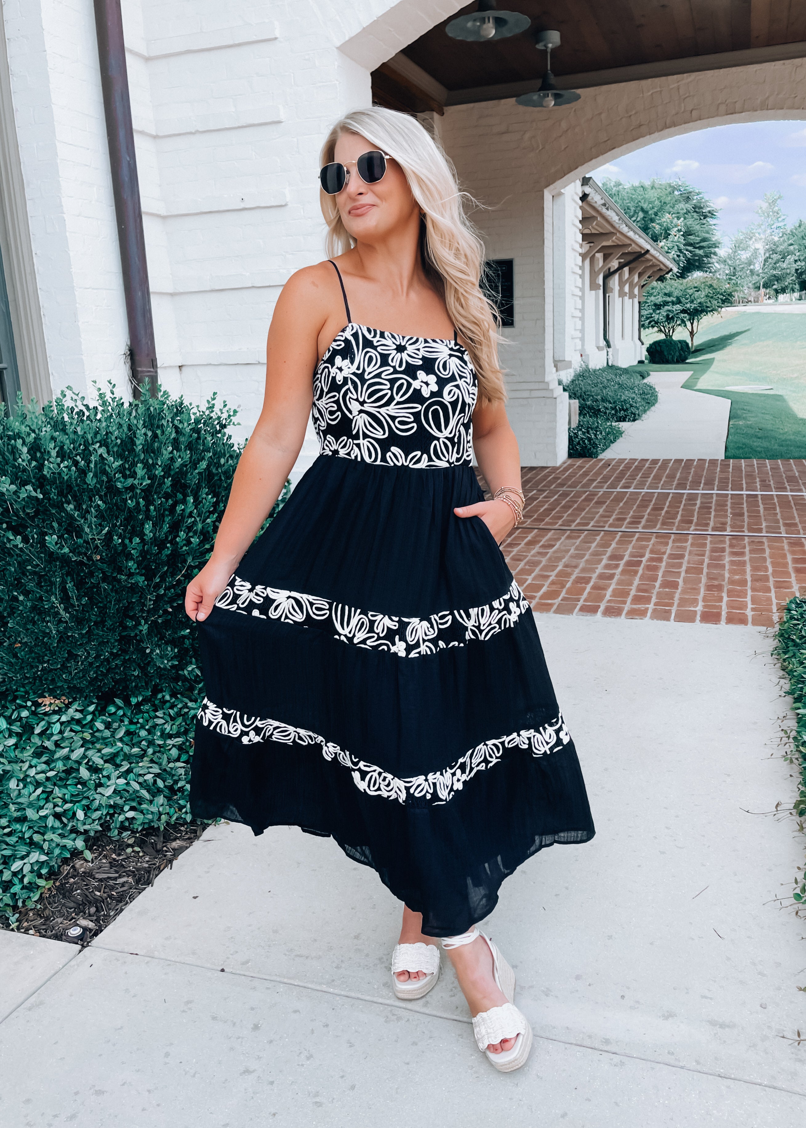 Elevate your wardrobe with our stunning black midi dress, beautifully adorned with delicate white floral stitching. The adjustable straps ensure a perfect fit for any body type, allowing you to customize your comfort and style. This versatile piece transitions effortlessly from day to evening, making it an essential addition to your collection. Don't miss the opportunity to make this elegant statement piece yours today.