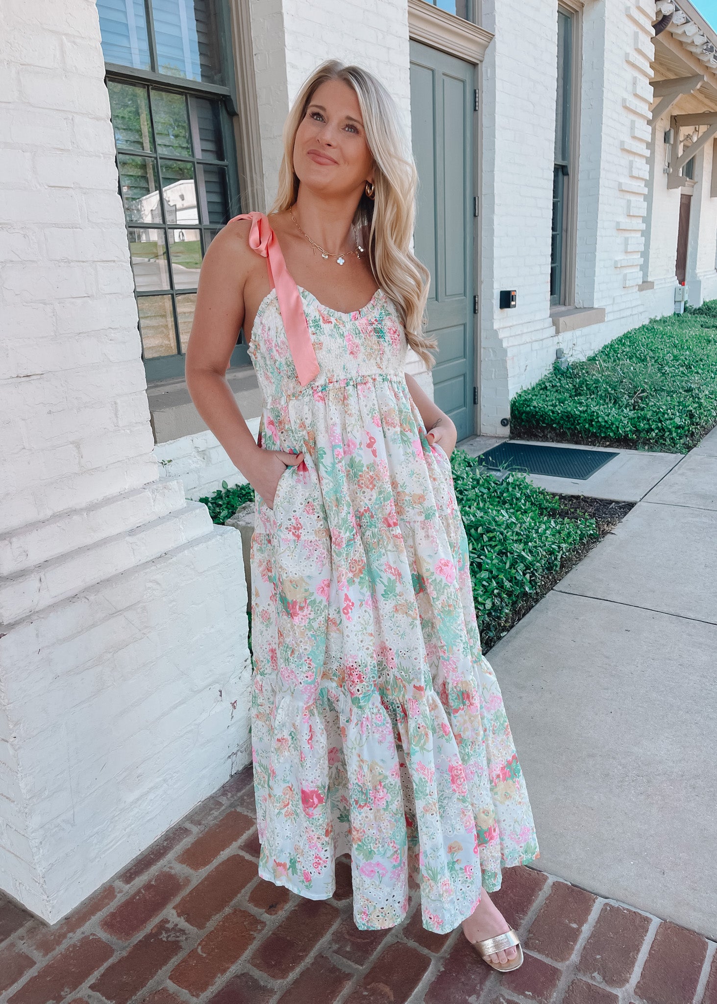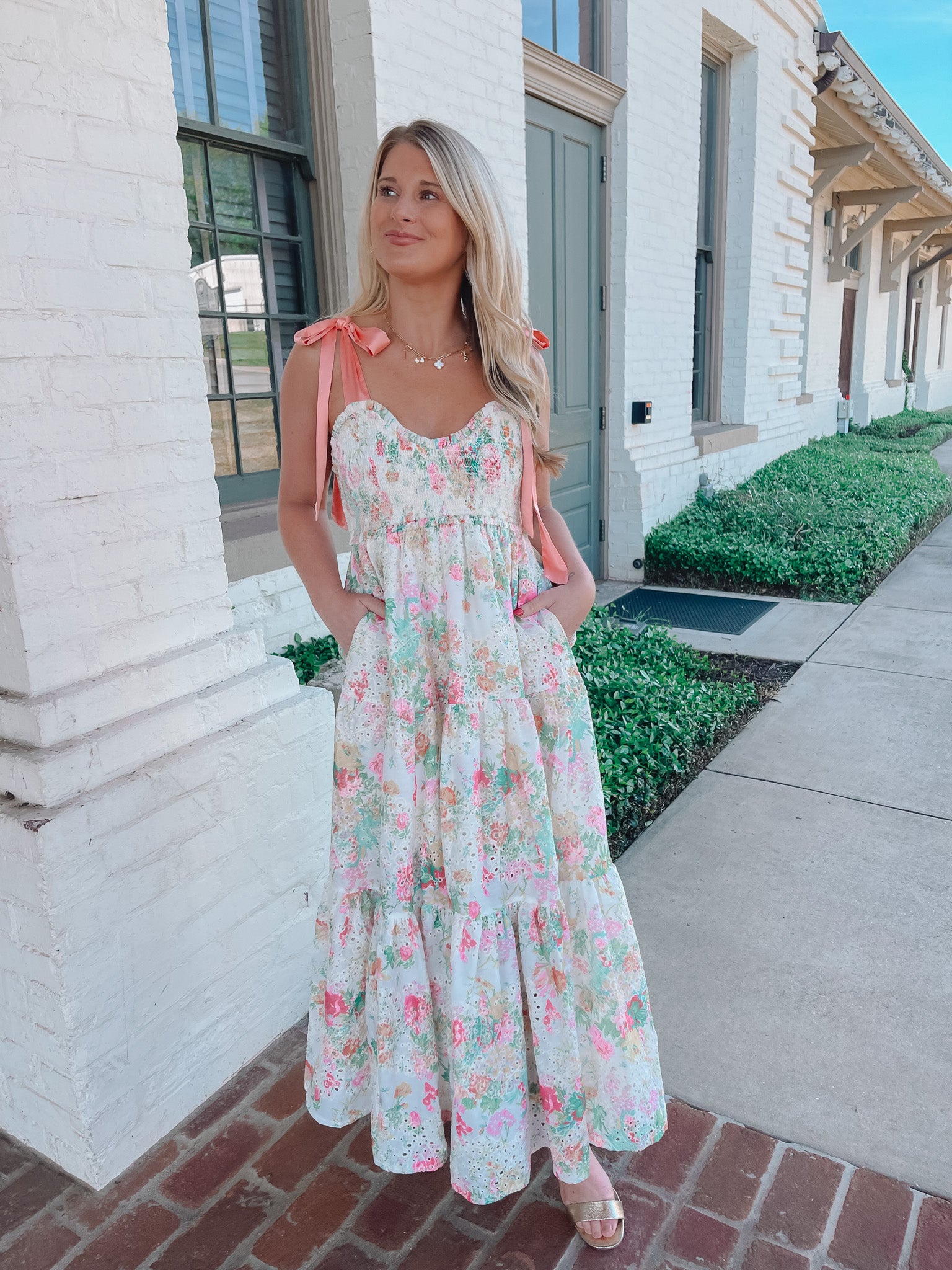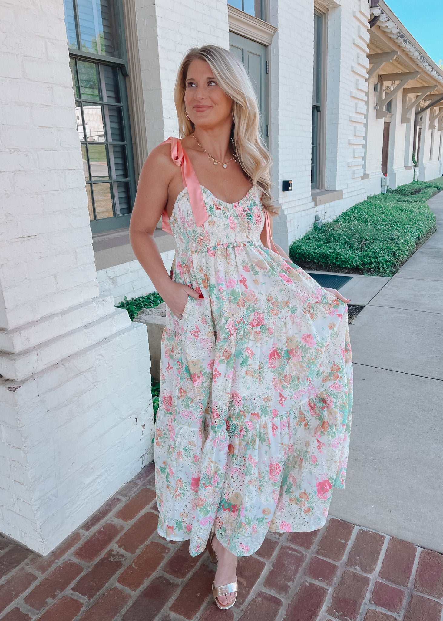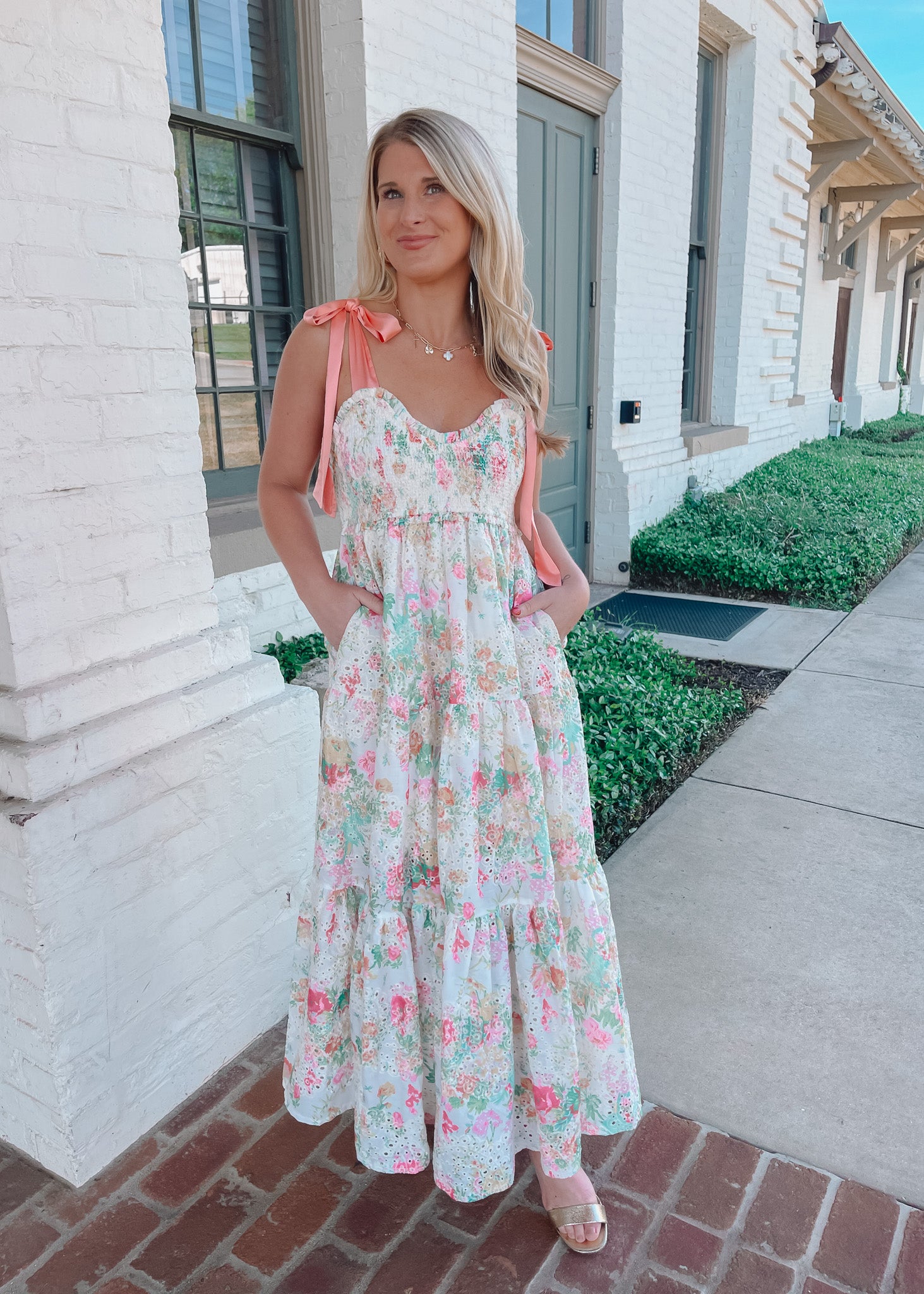 Take a stroll in the garden with this floral eyelet midi sundress! Its pink ribbon adjustable tie straps and tiered design will make you feel cute and comfortable all day long. Plus, with pockets and smocked chest detailing, you'll have everything you need! Perfect for a walk in the park or a picnic with friends. (No green thumbs required!)