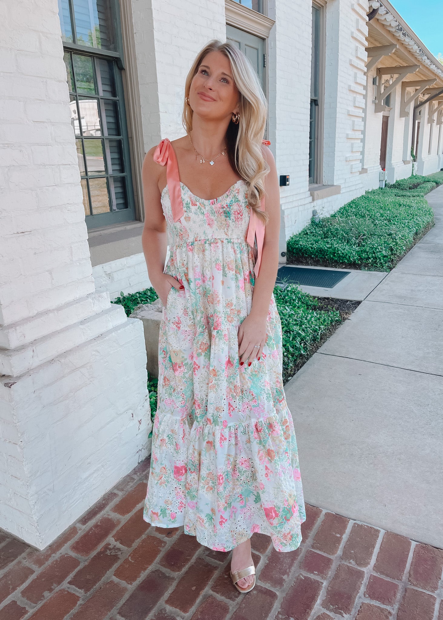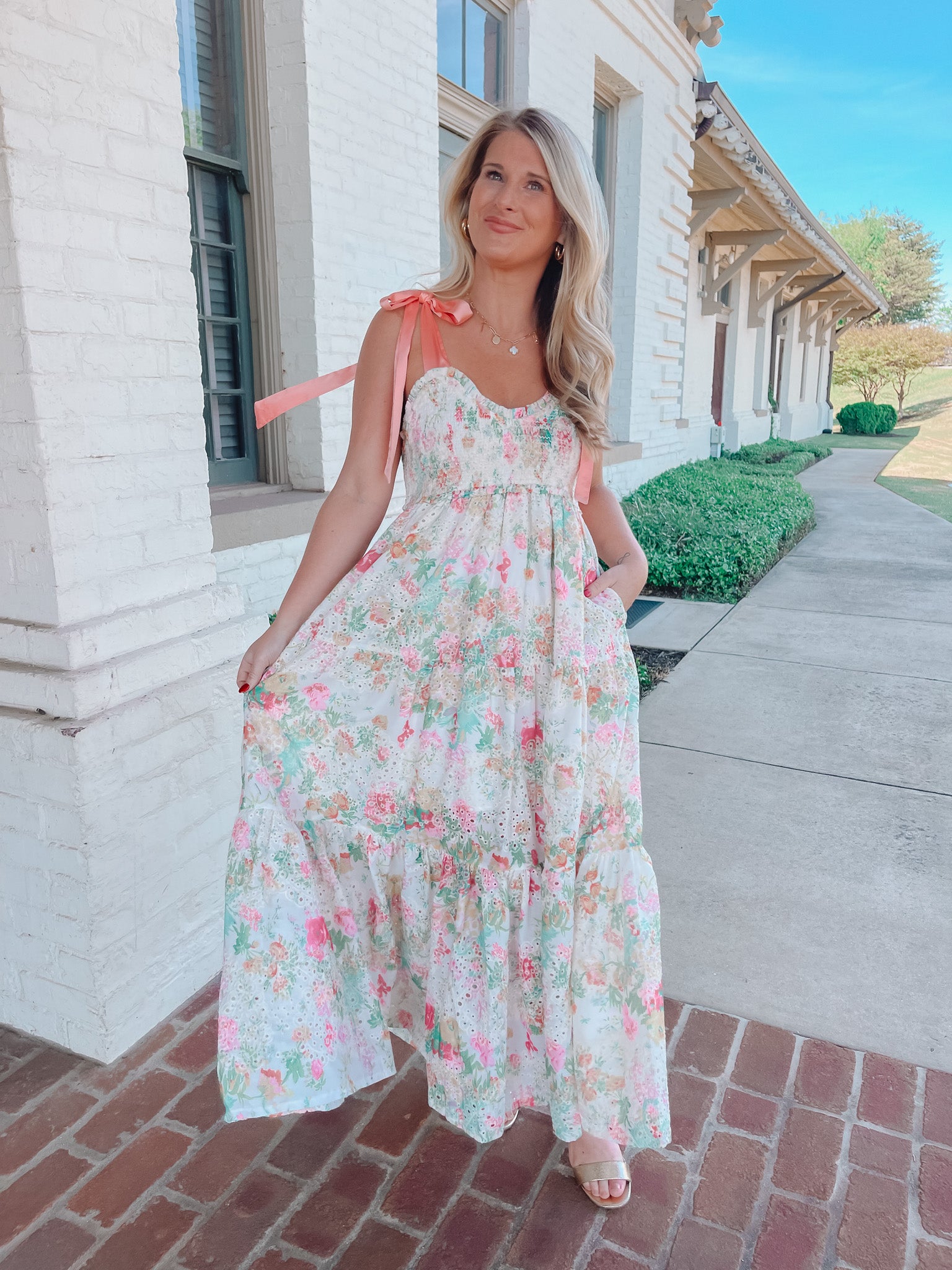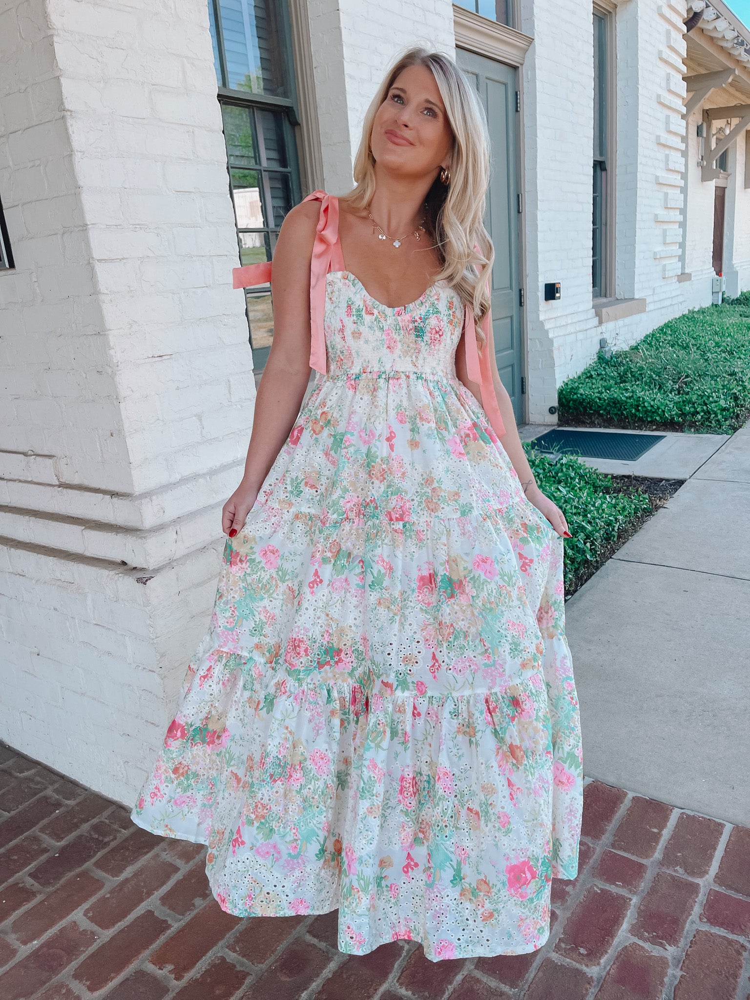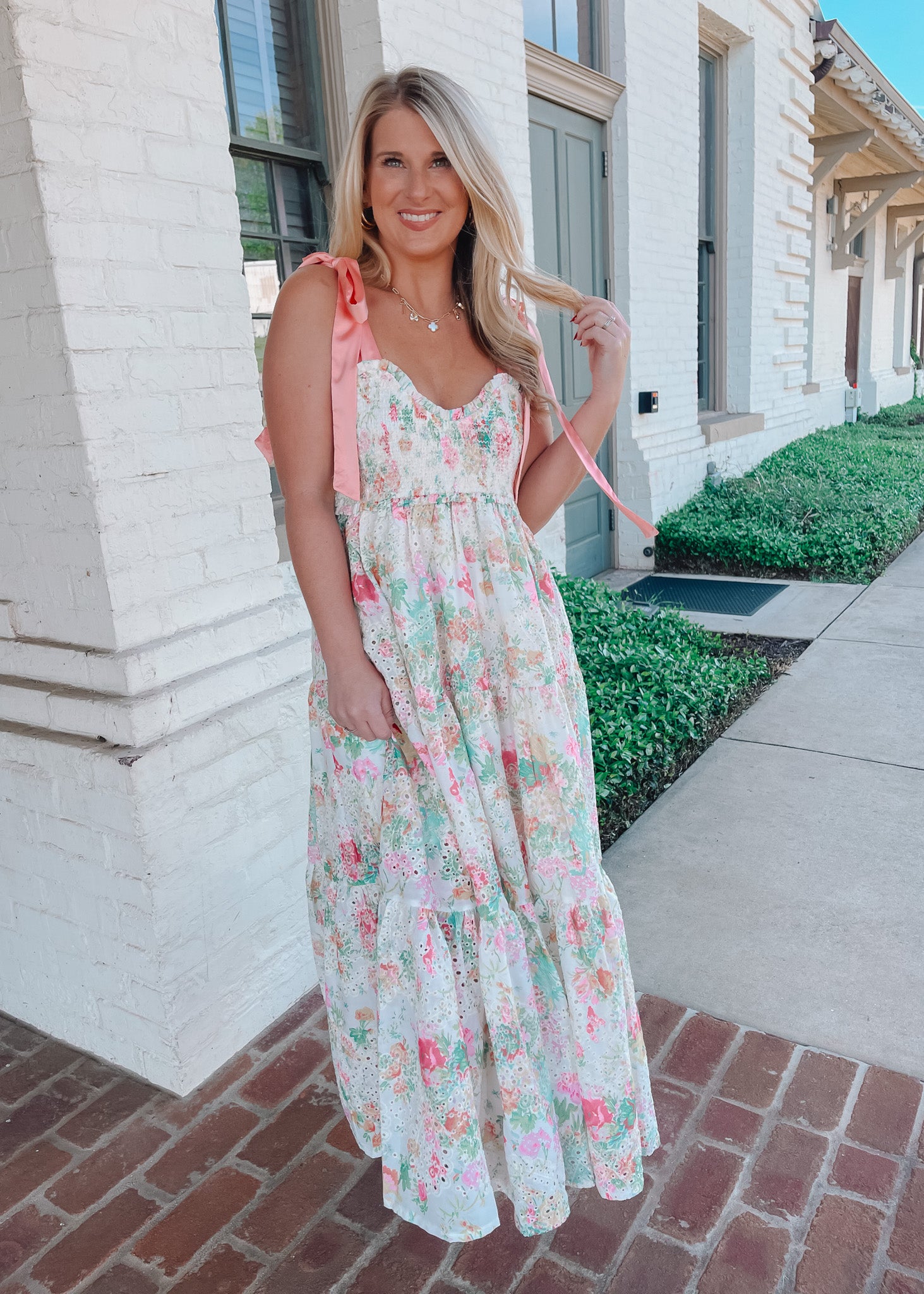 Take a stroll in the garden with this floral eyelet midi sundress! Its pink ribbon adjustable tie straps and tiered design will make you feel cute and comfortable all day long. Plus, with pockets and smocked chest detailing, you'll have everything you need! Perfect for a walk in the park or a picnic with friends. (No green thumbs required!)