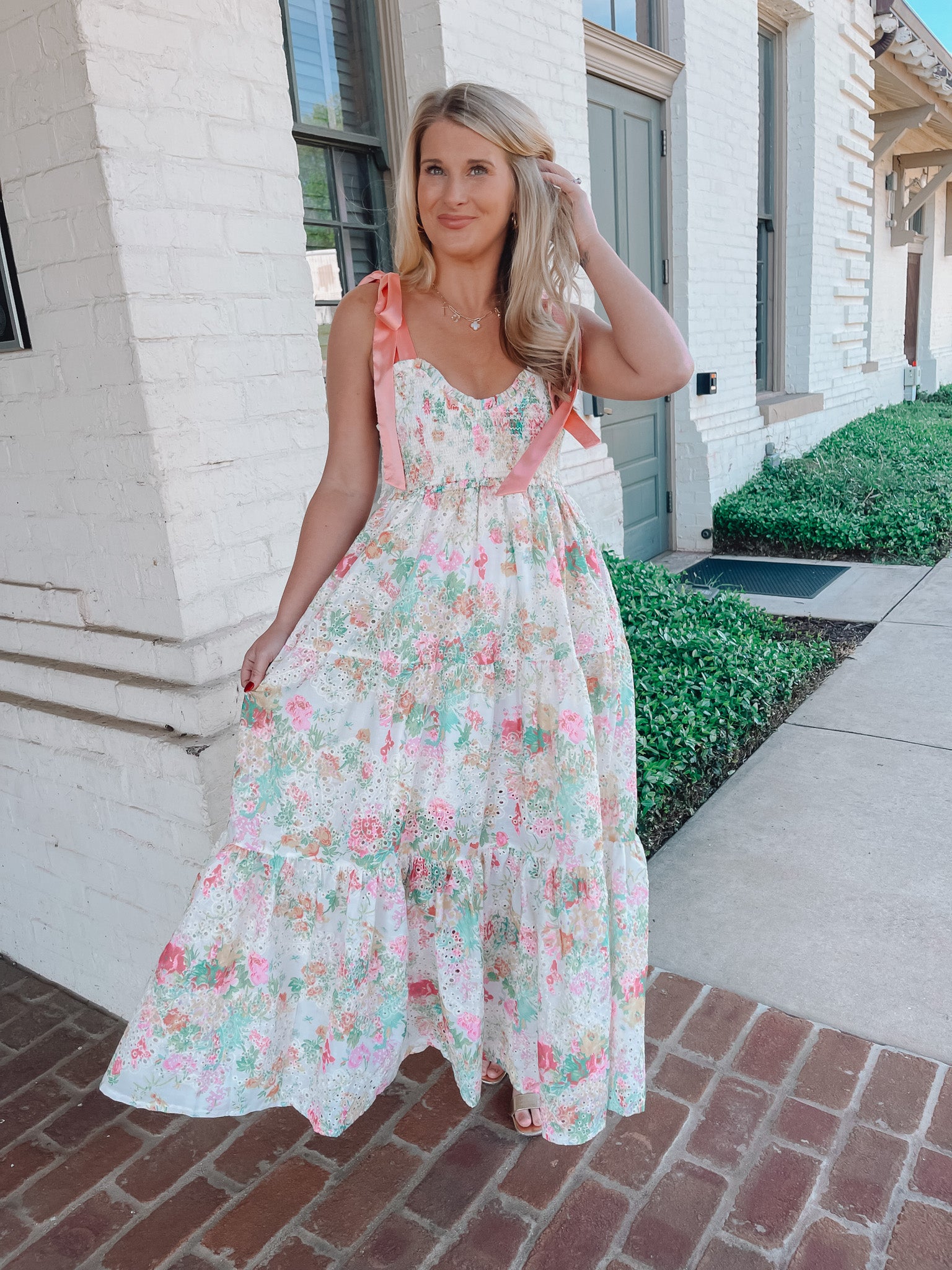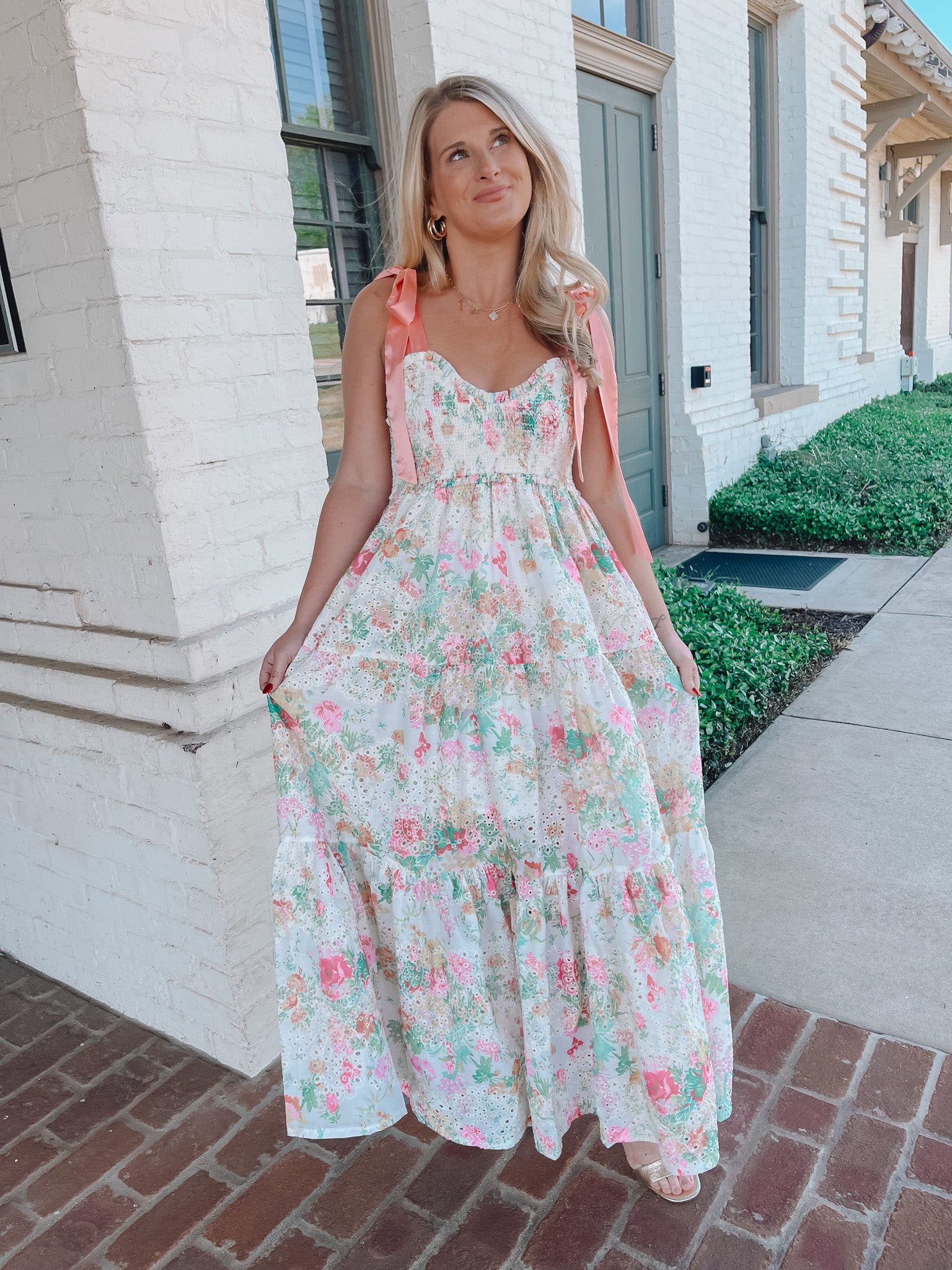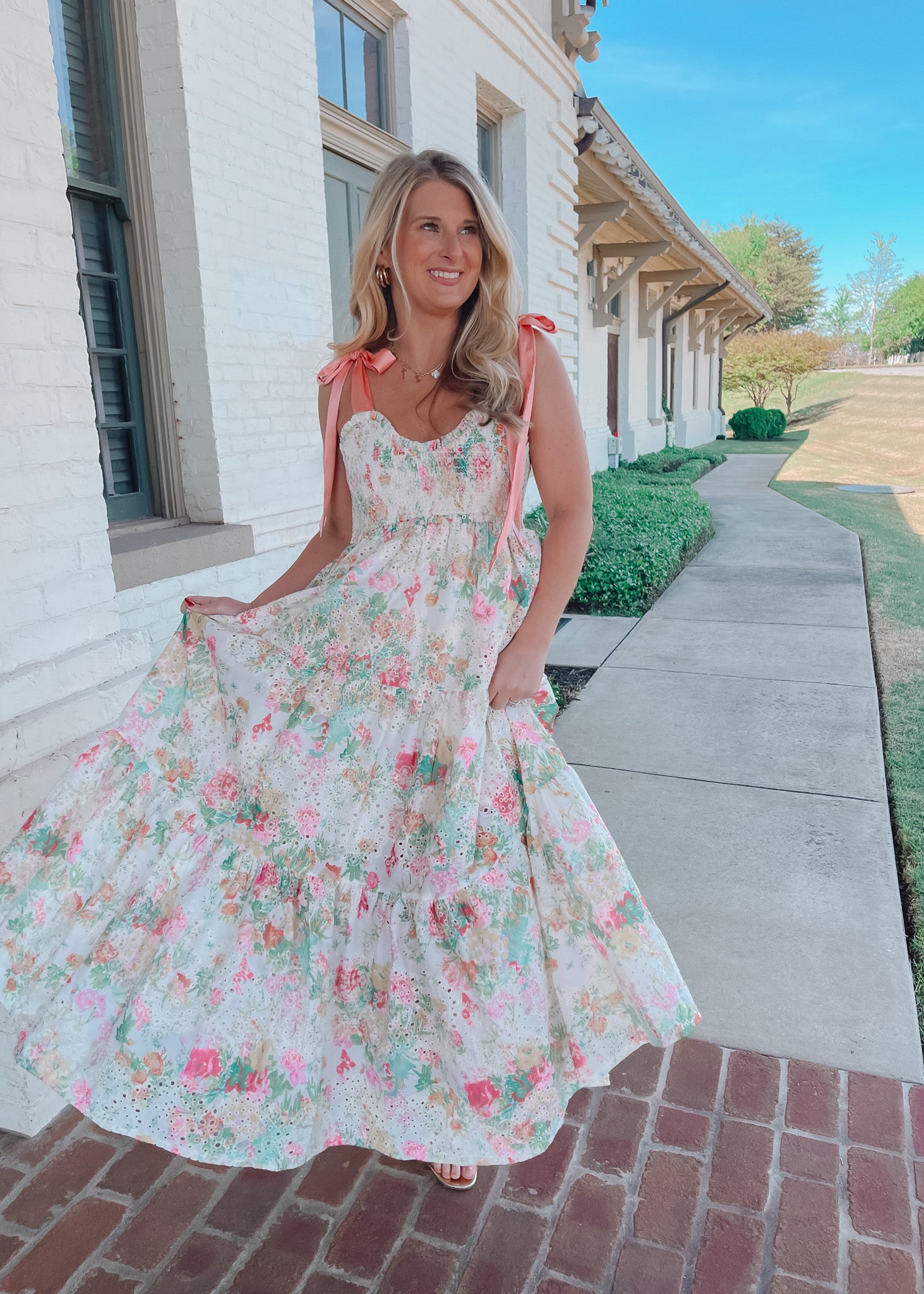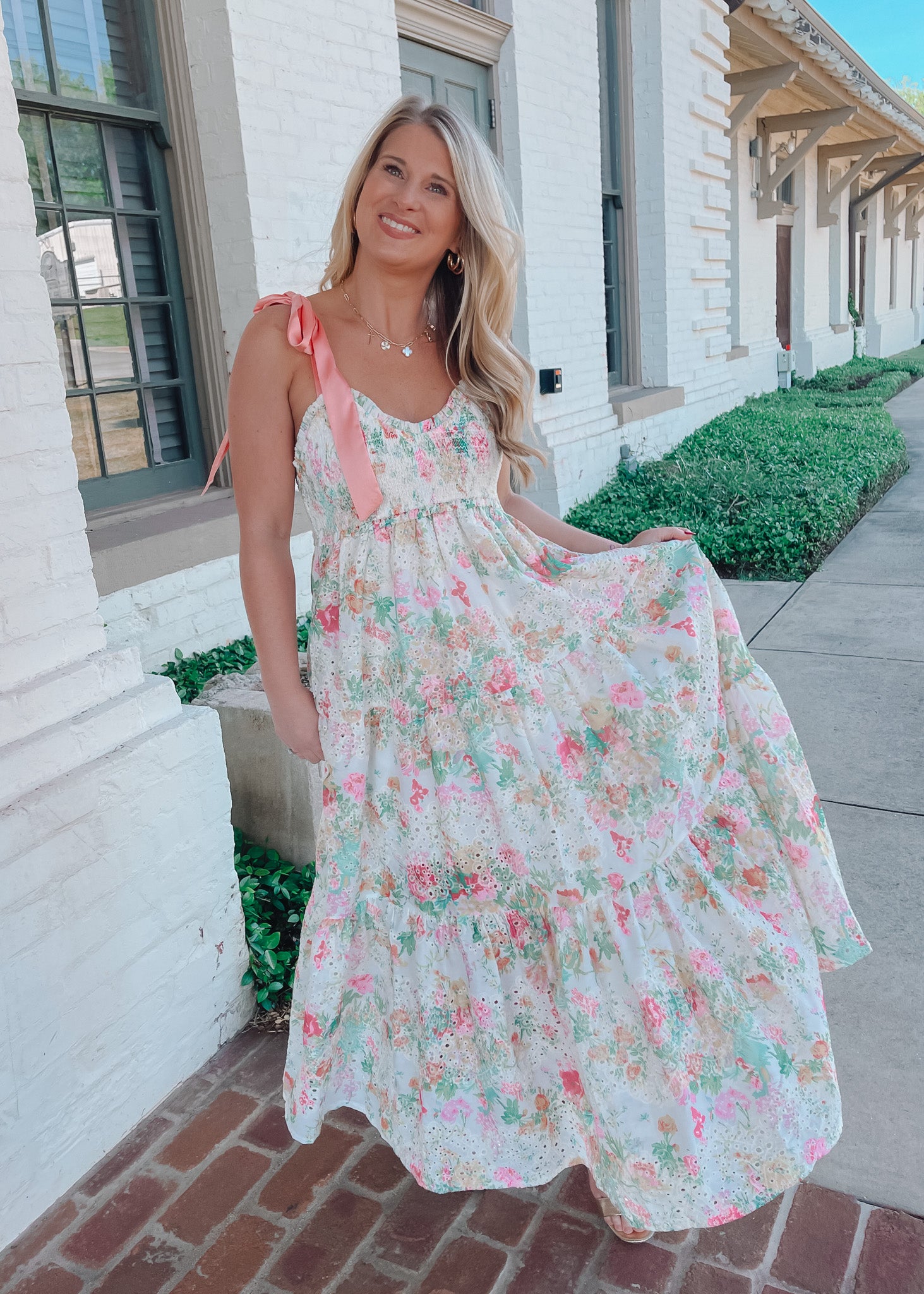 Take a stroll in the garden with this floral eyelet midi sundress! Its pink ribbon adjustable tie straps and tiered design will make you feel cute and comfortable all day long. Plus, with pockets and smocked chest detailing, you'll have everything you need! Perfect for a walk in the park or a picnic with friends. (No green thumbs required!)
