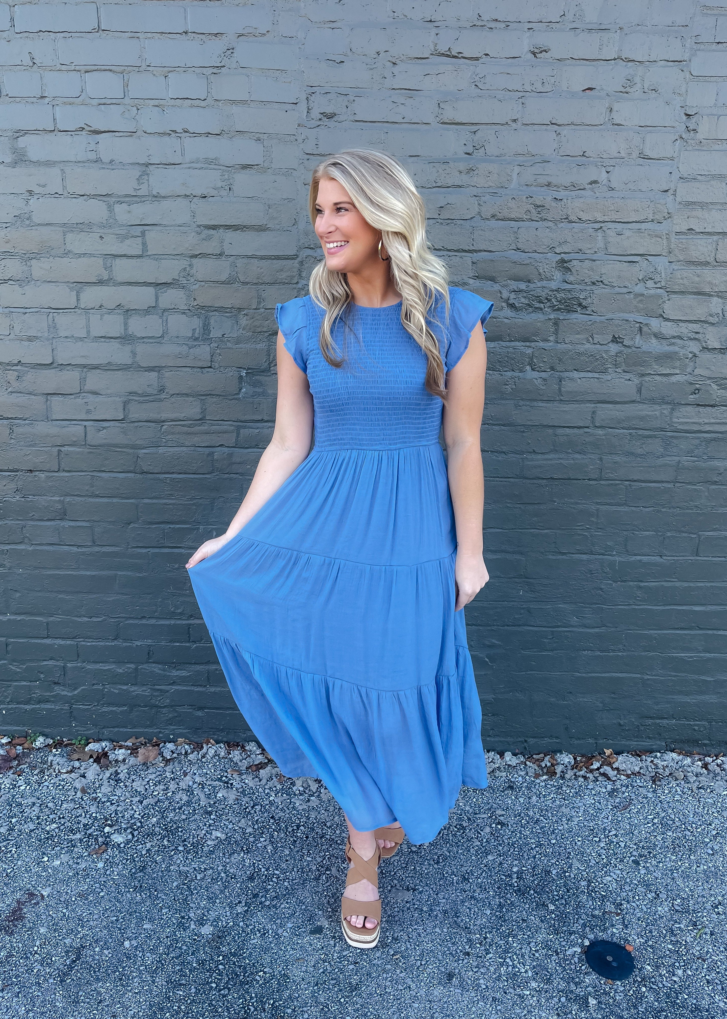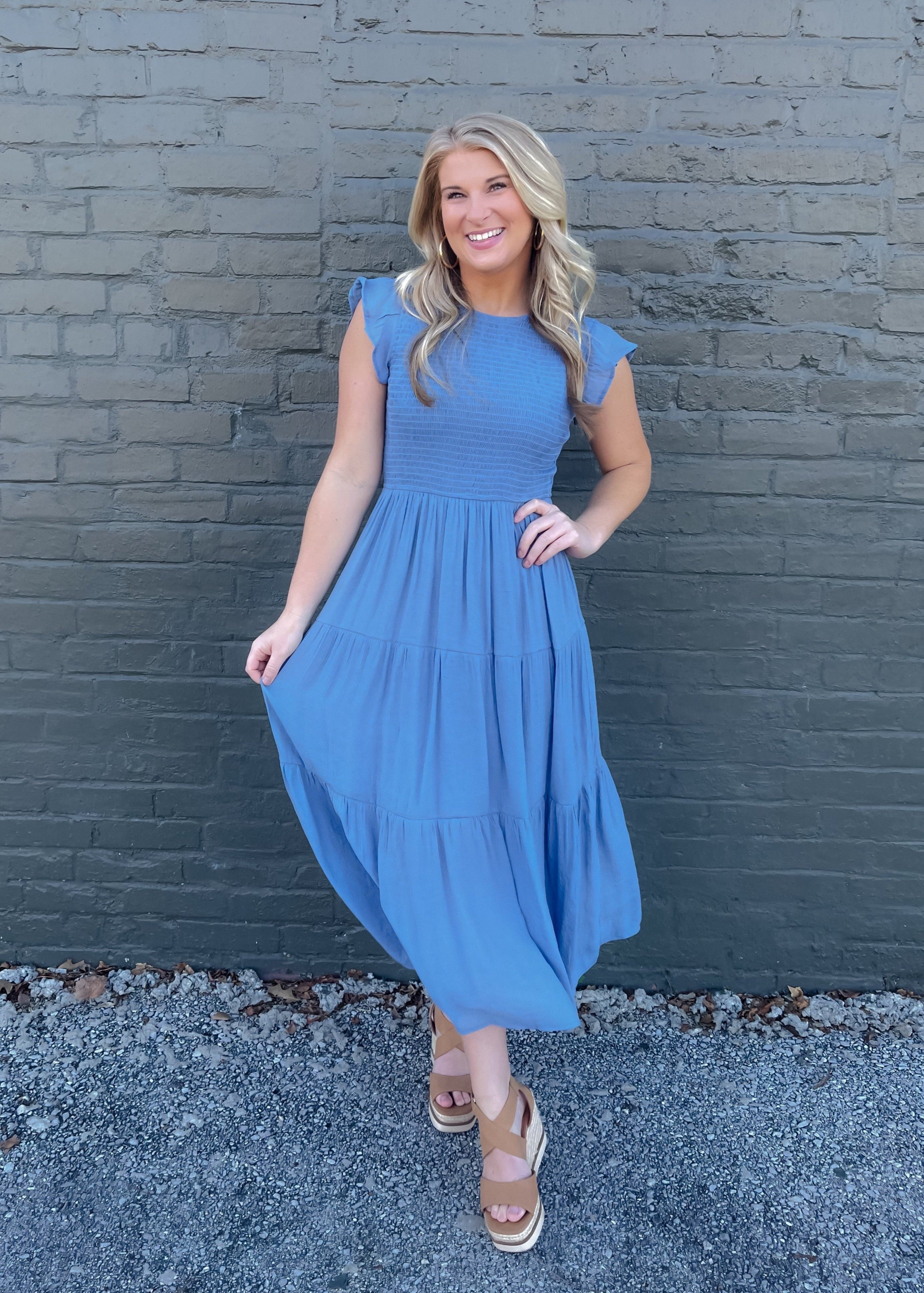 On My Way Chambray Smocked Midi Dress (S-3XL)